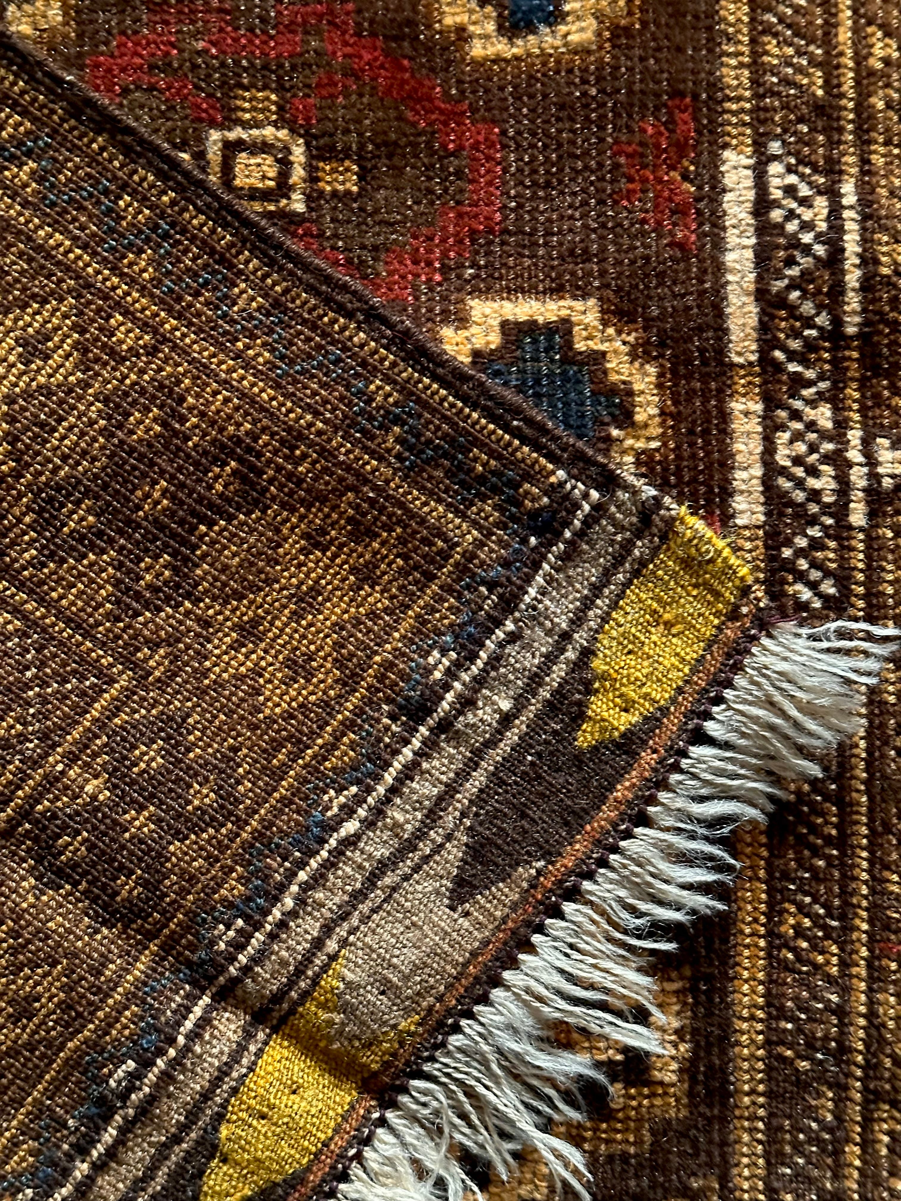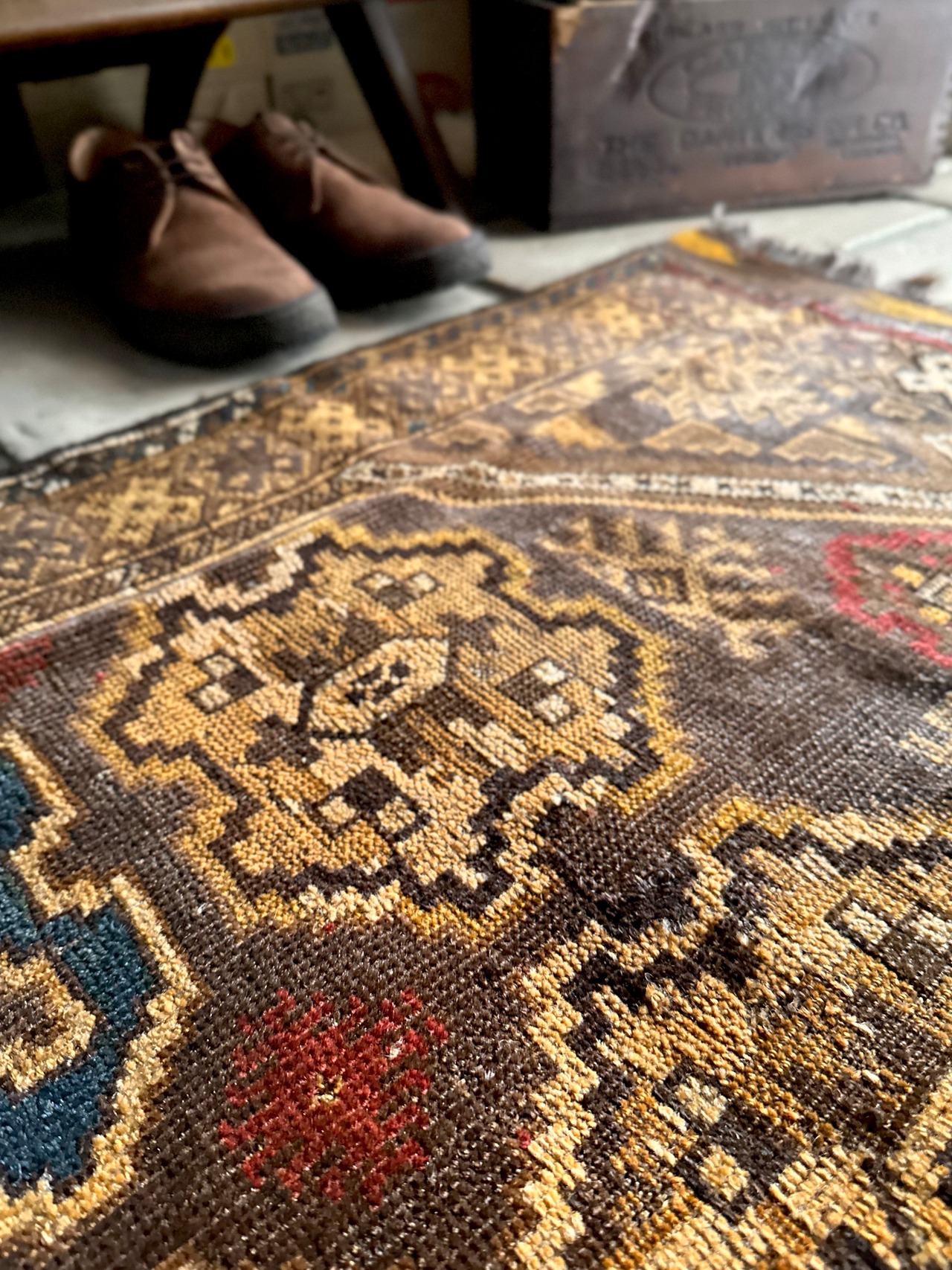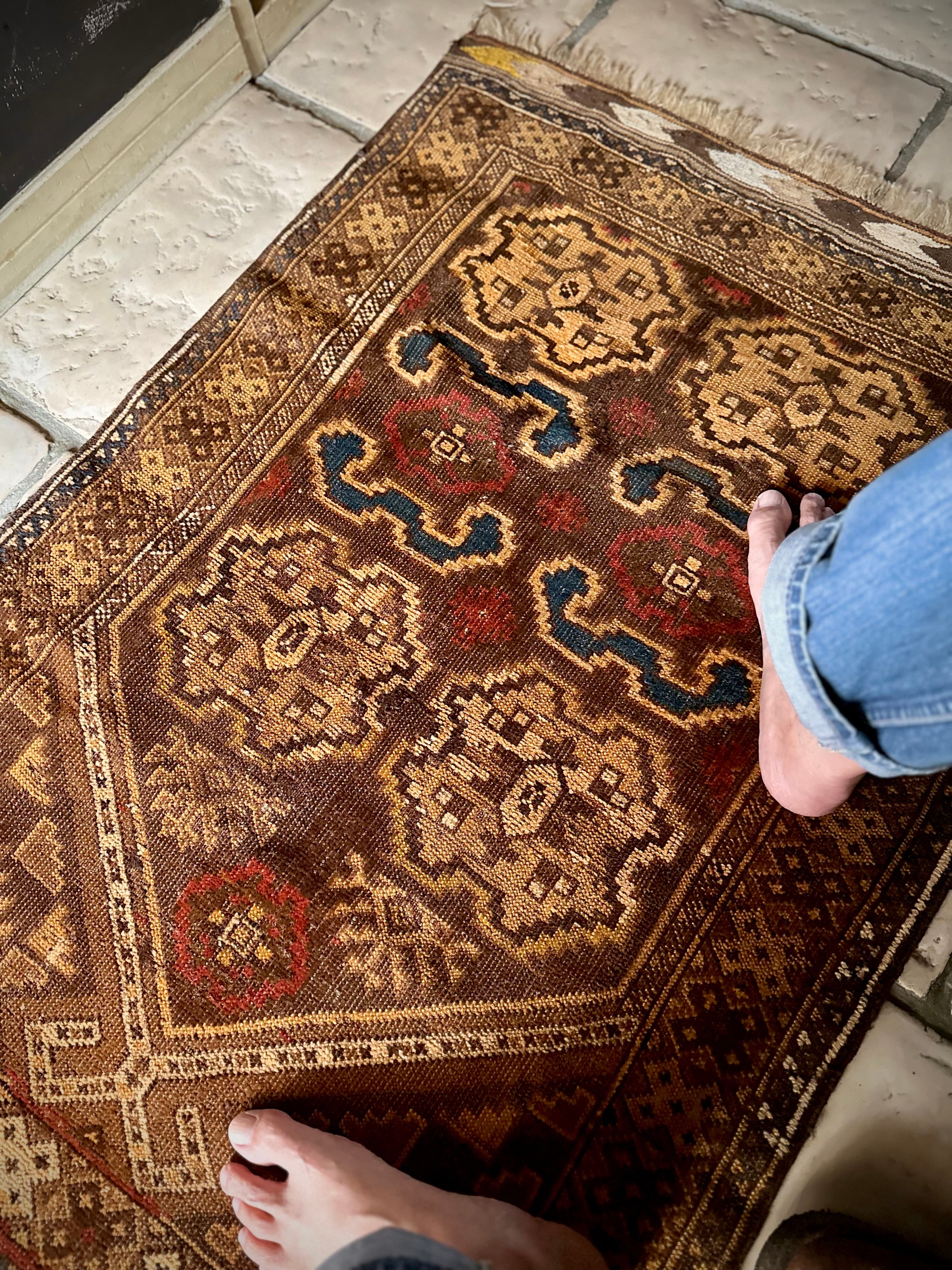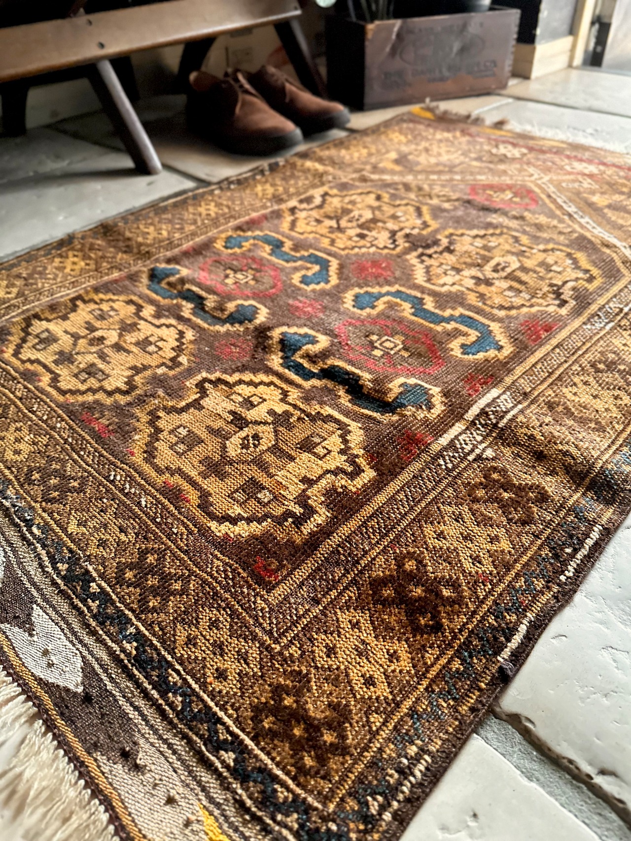 コンディションとしては、おおよそ1世紀という年月を経たアンティークラグらしく、当時のリペアがあり全体的にはかなり薄手でパイルの毛足もほぼありませんが、歴史的なテキスタイルとして壁に飾って眺めるというのが大人な楽しみ方かと、個人的にはアンティーク云々は興味はありませんが、ただ安かったのでピックしてみた次第です。