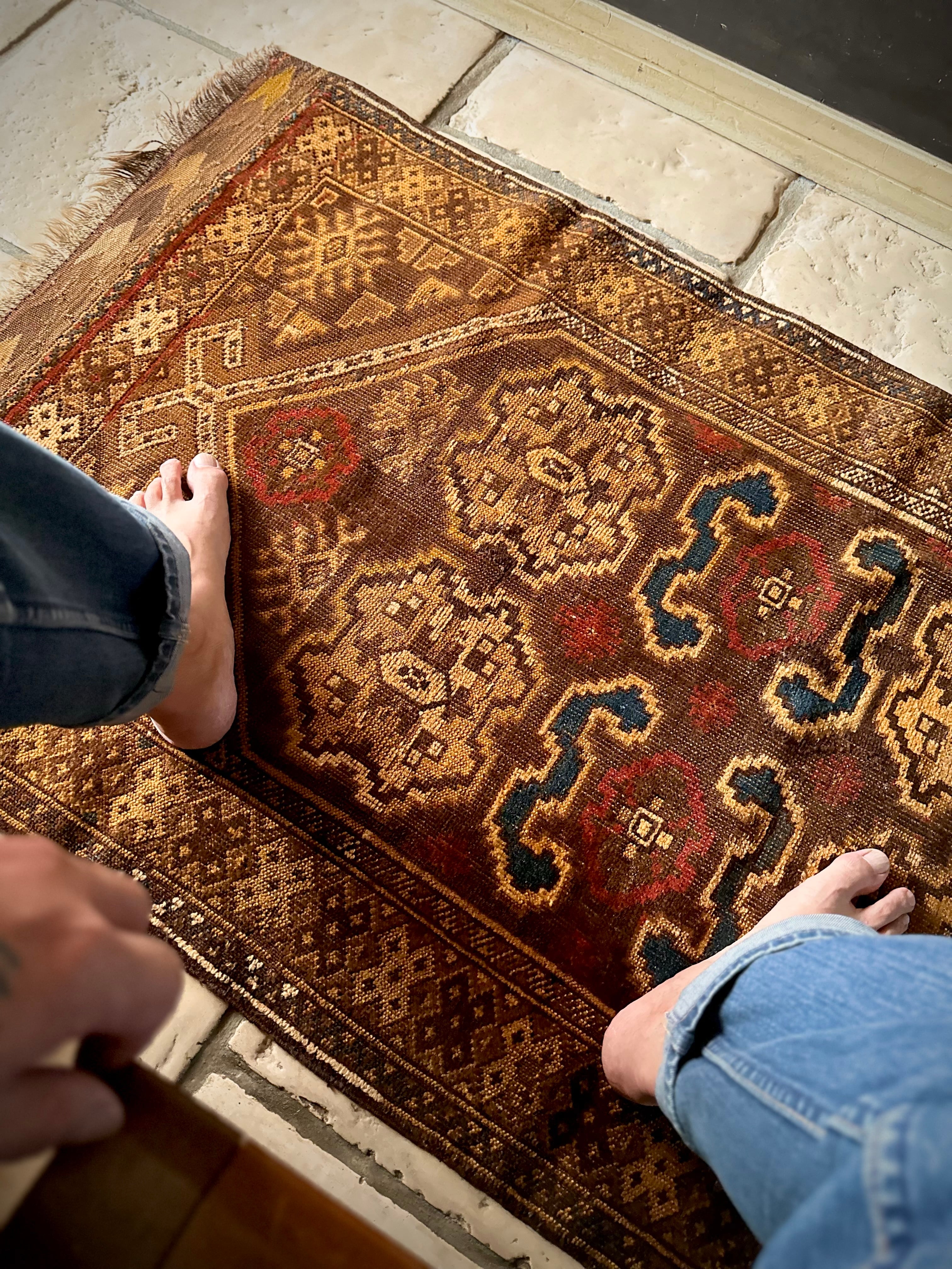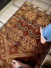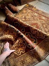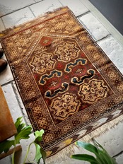 最後にラグそのものに関しては羊毛特有の匂いがあり、採寸は中央付近で計測していますが、手織りならではの歪みによる誤差や水洗いクリーニングによる縮み、また草木染めによる経年劣化の色ムラなどがありますが、それもまたヴィンテージラグの魅力かとご理解ください。