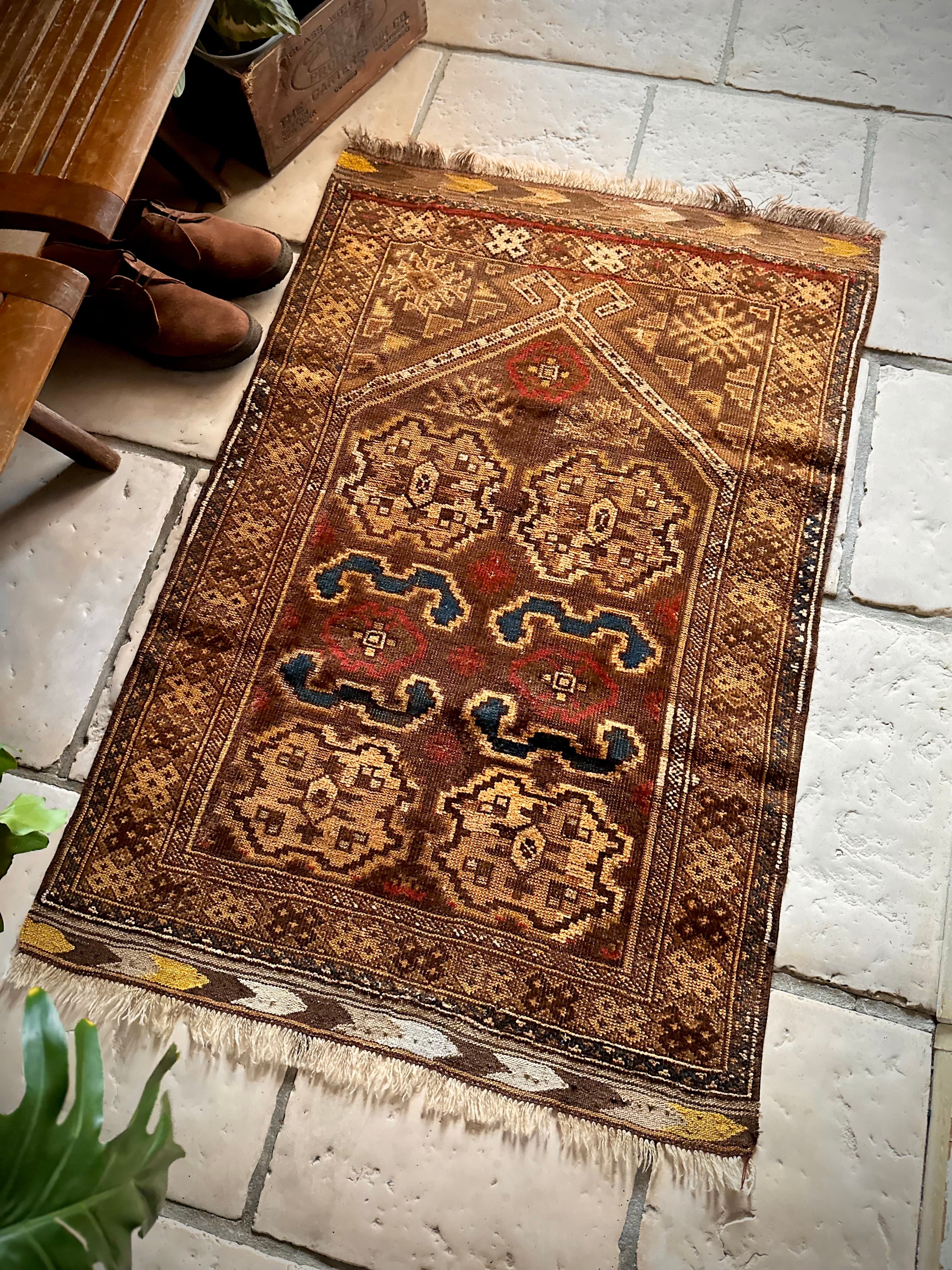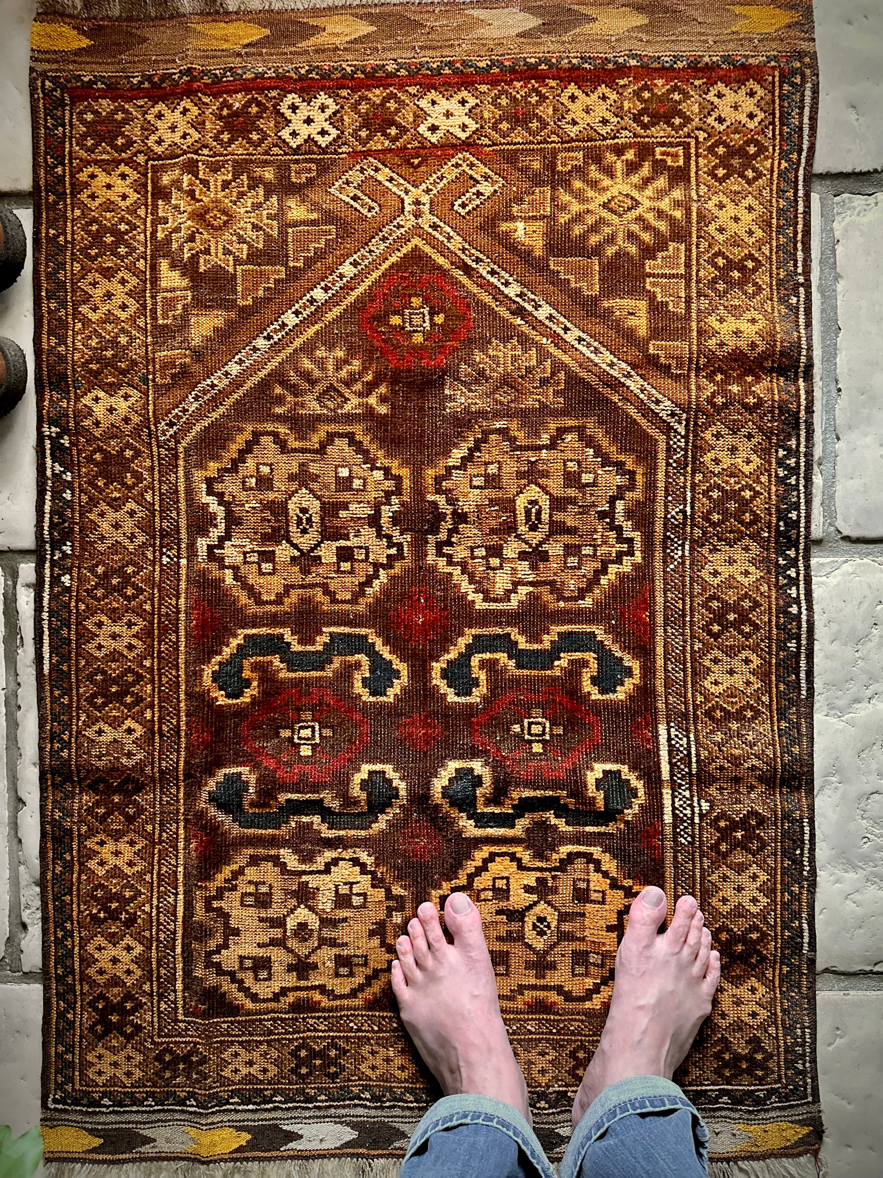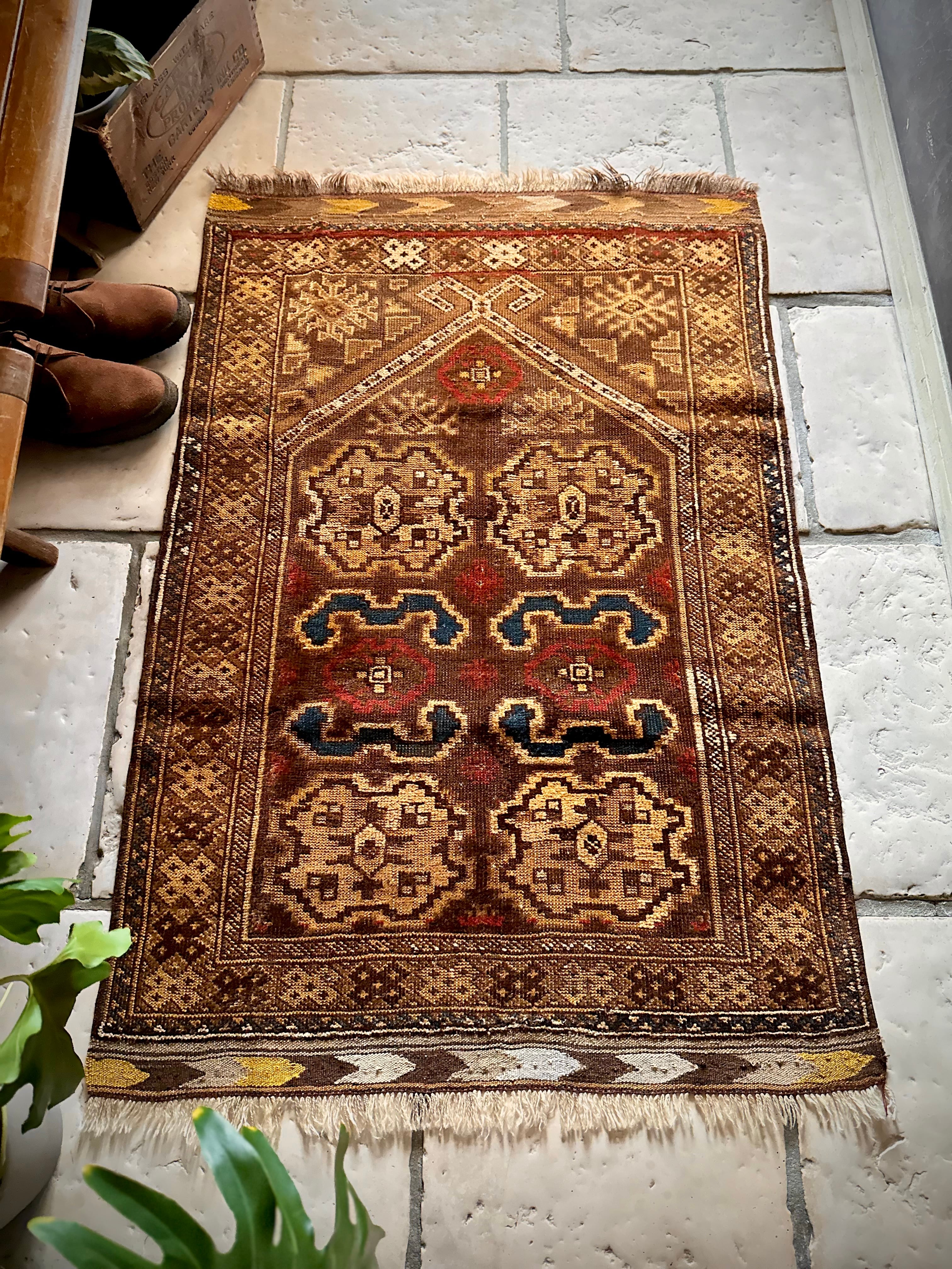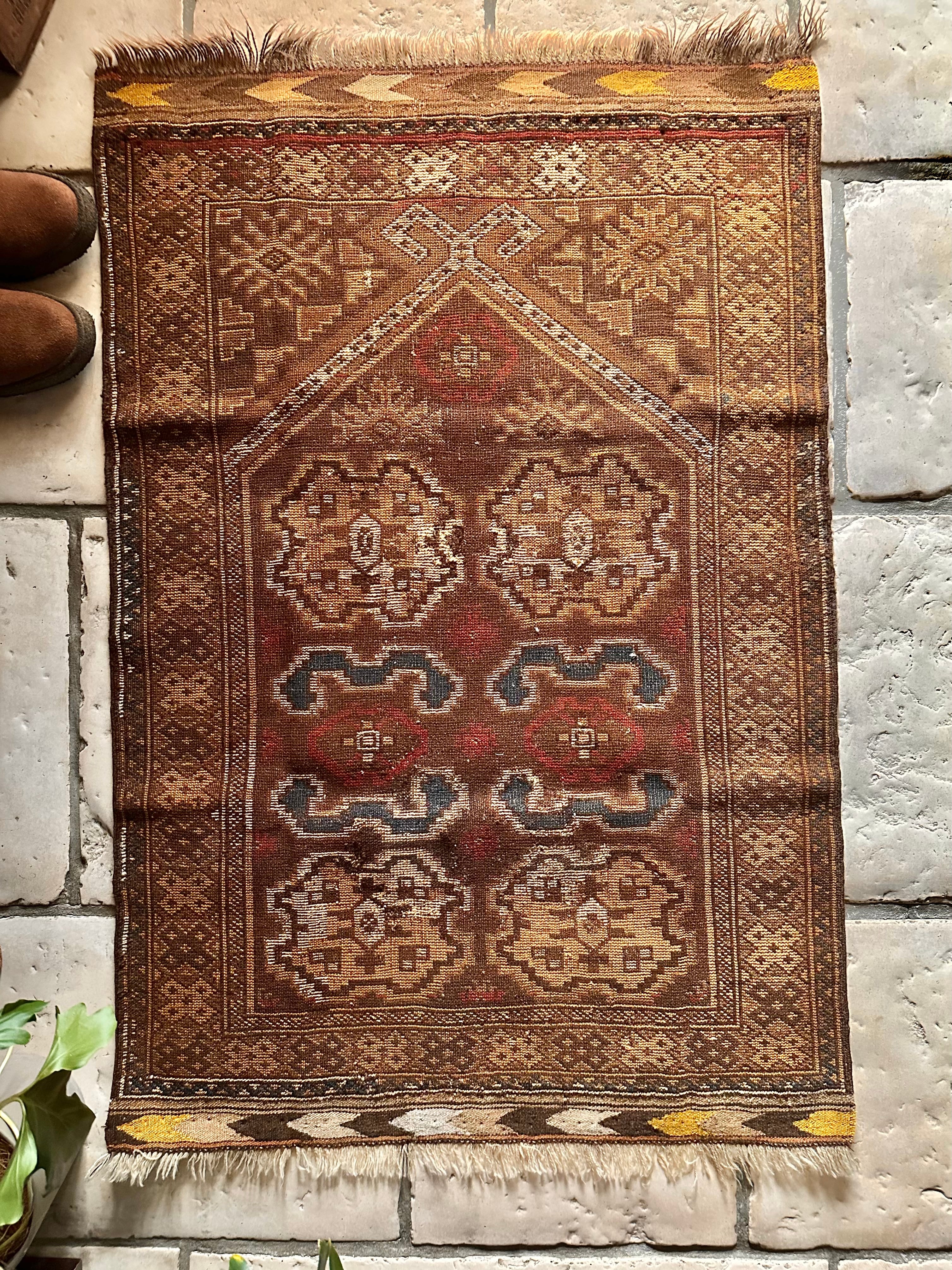 全体的な雰囲気からオーラを放つ1枚として床に敷くにはどうかなぁと言った代物で、ミフラープと呼ばれる図案から祈祷用のプレイヤーラグになりますが、現地のセラーも雰囲気重視としてあえてリペアやフリンジカットは施していません。