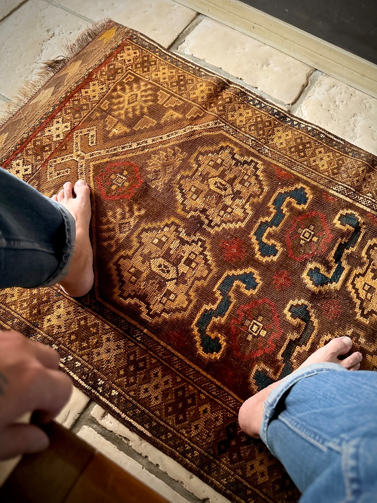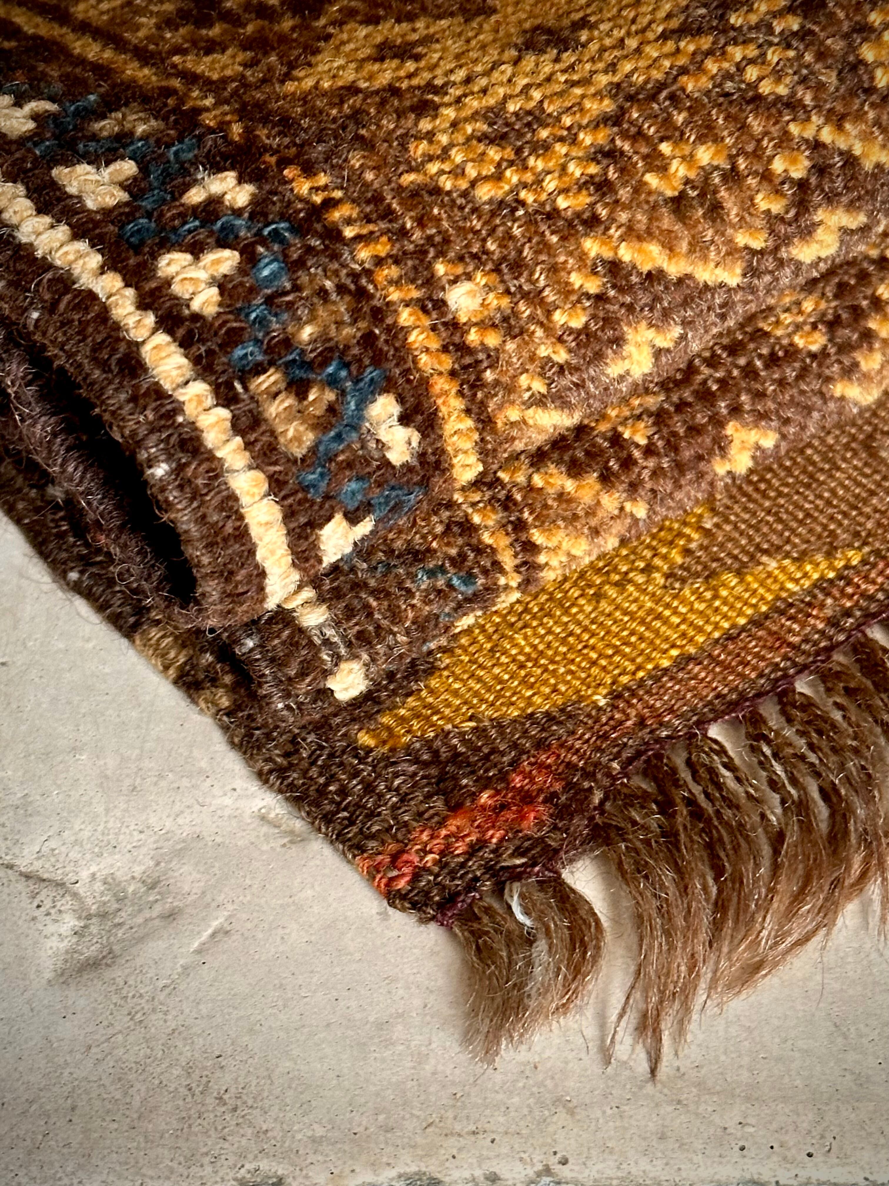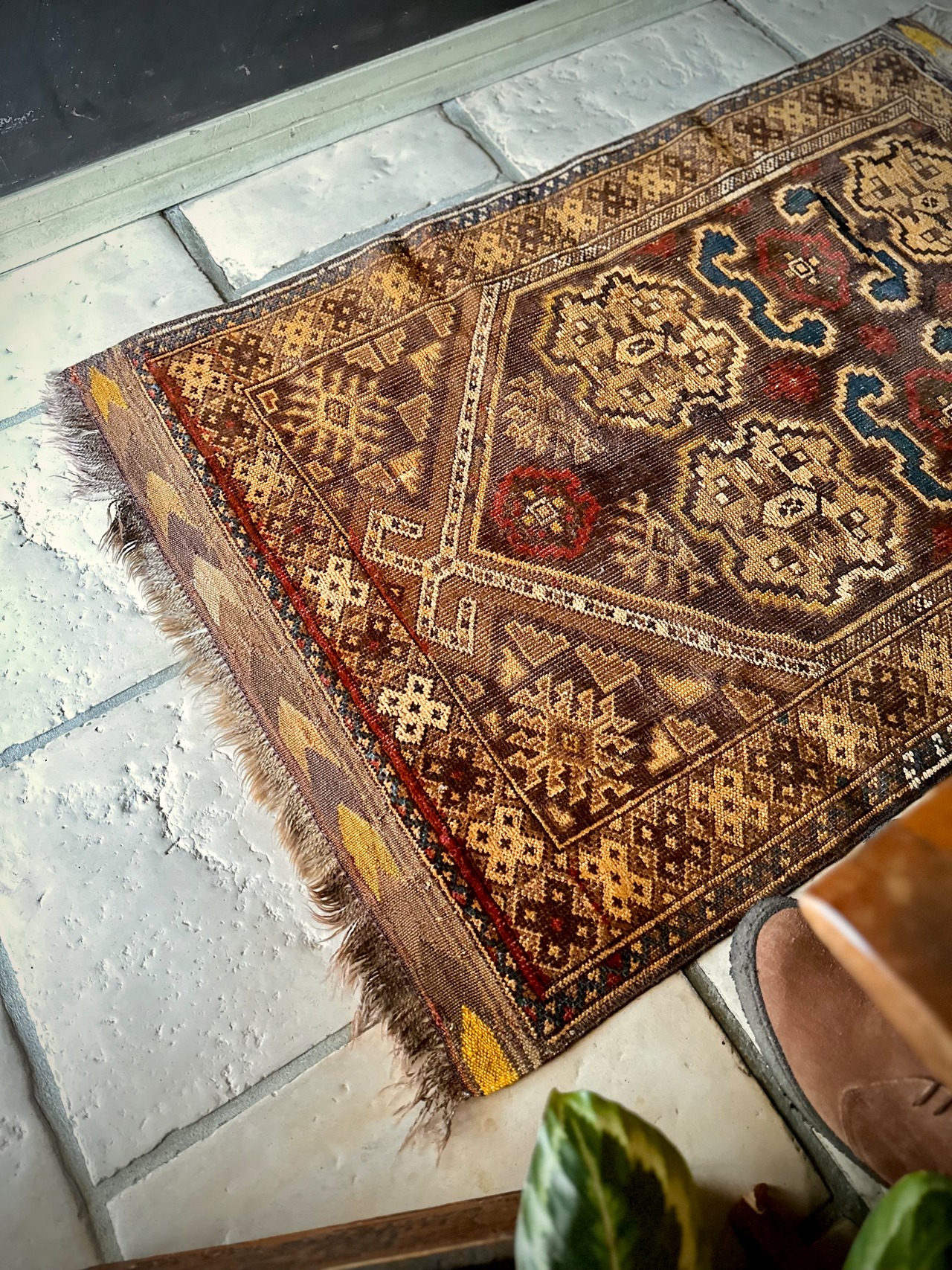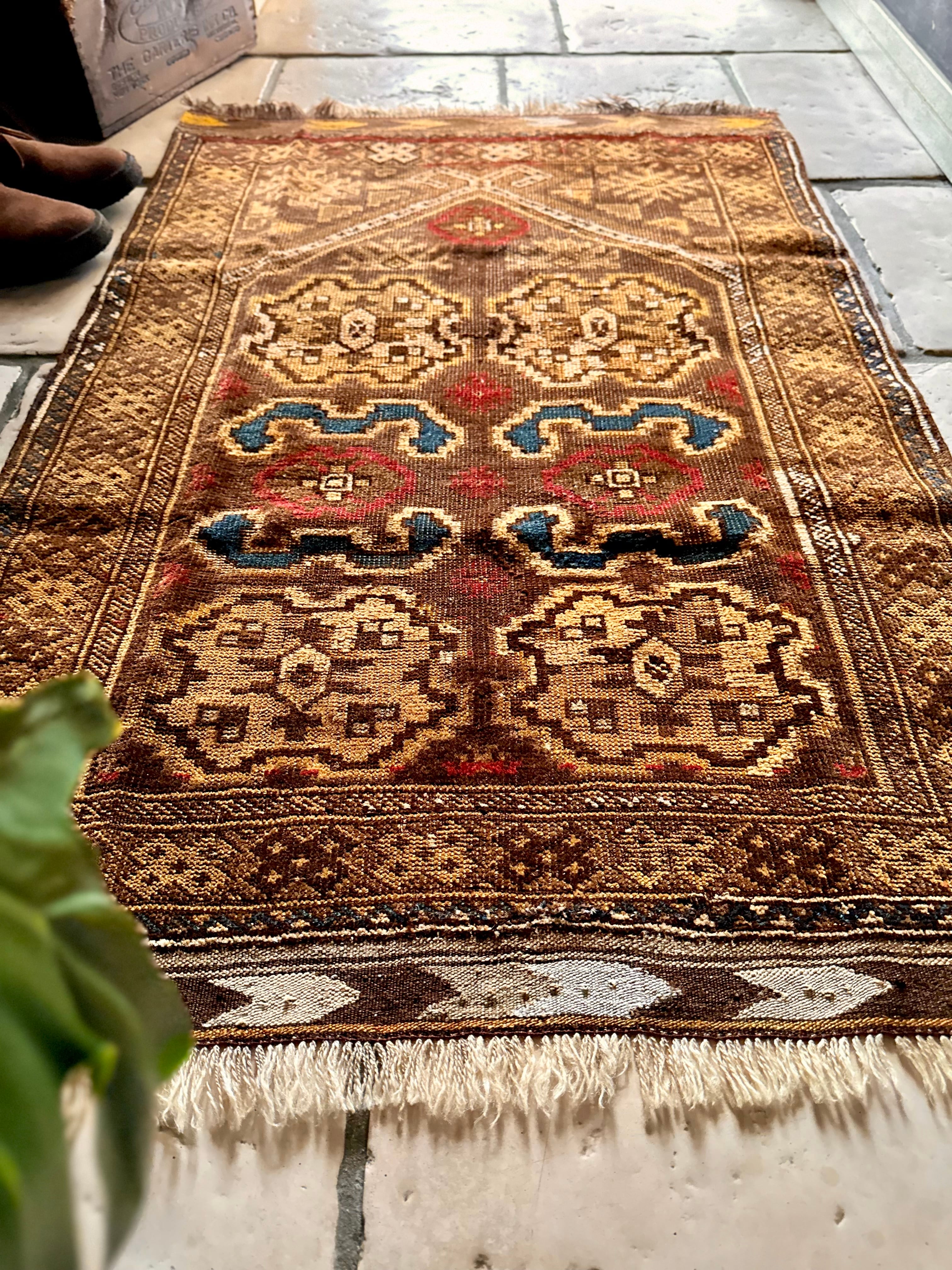 全体的な雰囲気からオーラを放つ1枚として床に敷くにはどうかなぁと言った代物で、ミフラープと呼ばれる図案から祈祷用のプレイヤーラグになりますが、現地のセラーも雰囲気重視としてあえてリペアやフリンジカットは施していません。