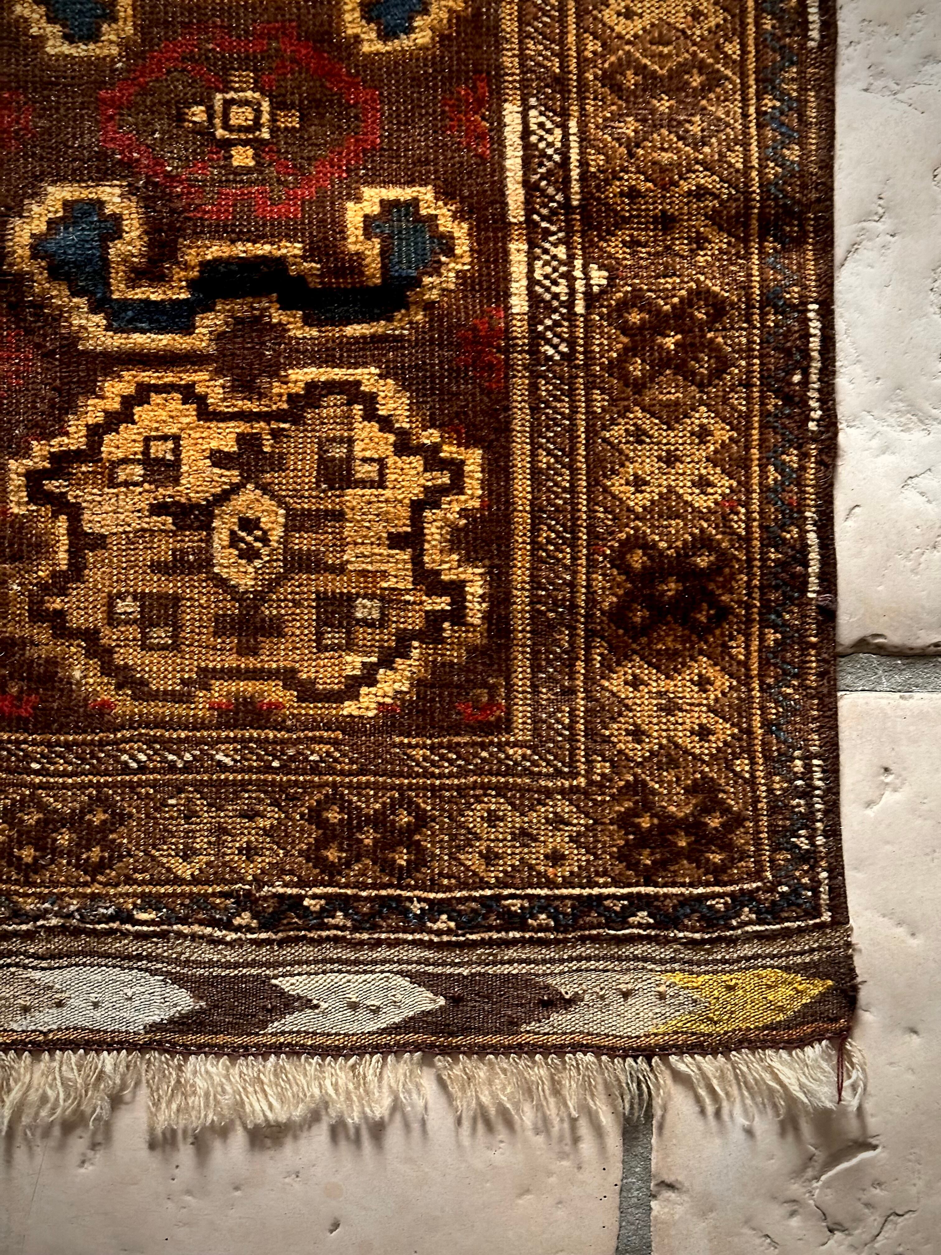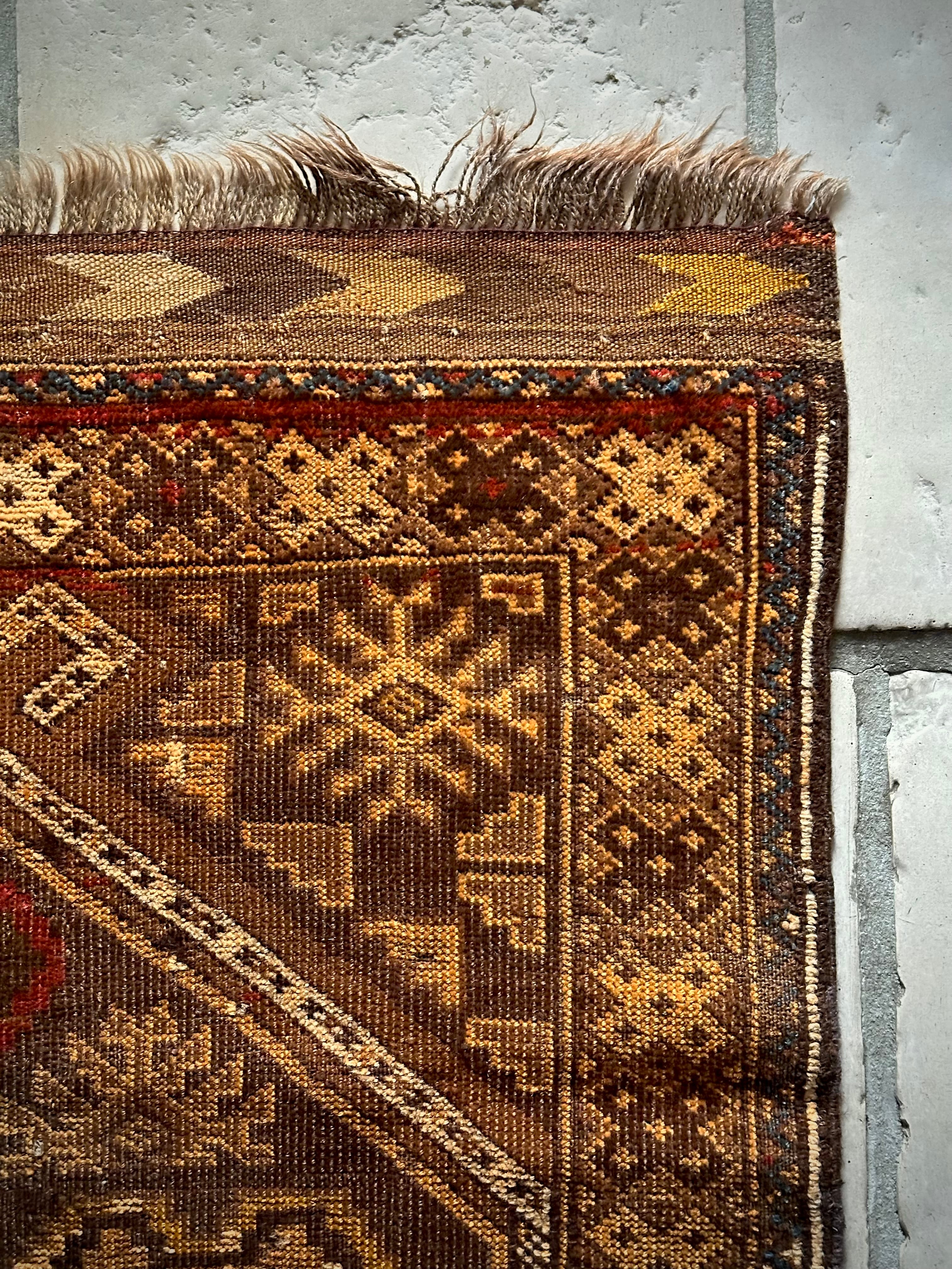 なんとも燻し銀な雰囲気を放つイエローゴールドに輝くこちらは、アフガニスタン北部に居住するトルクメン族のトライバルラグで、おおよそ100年も前に織られたアンティークラグになります。