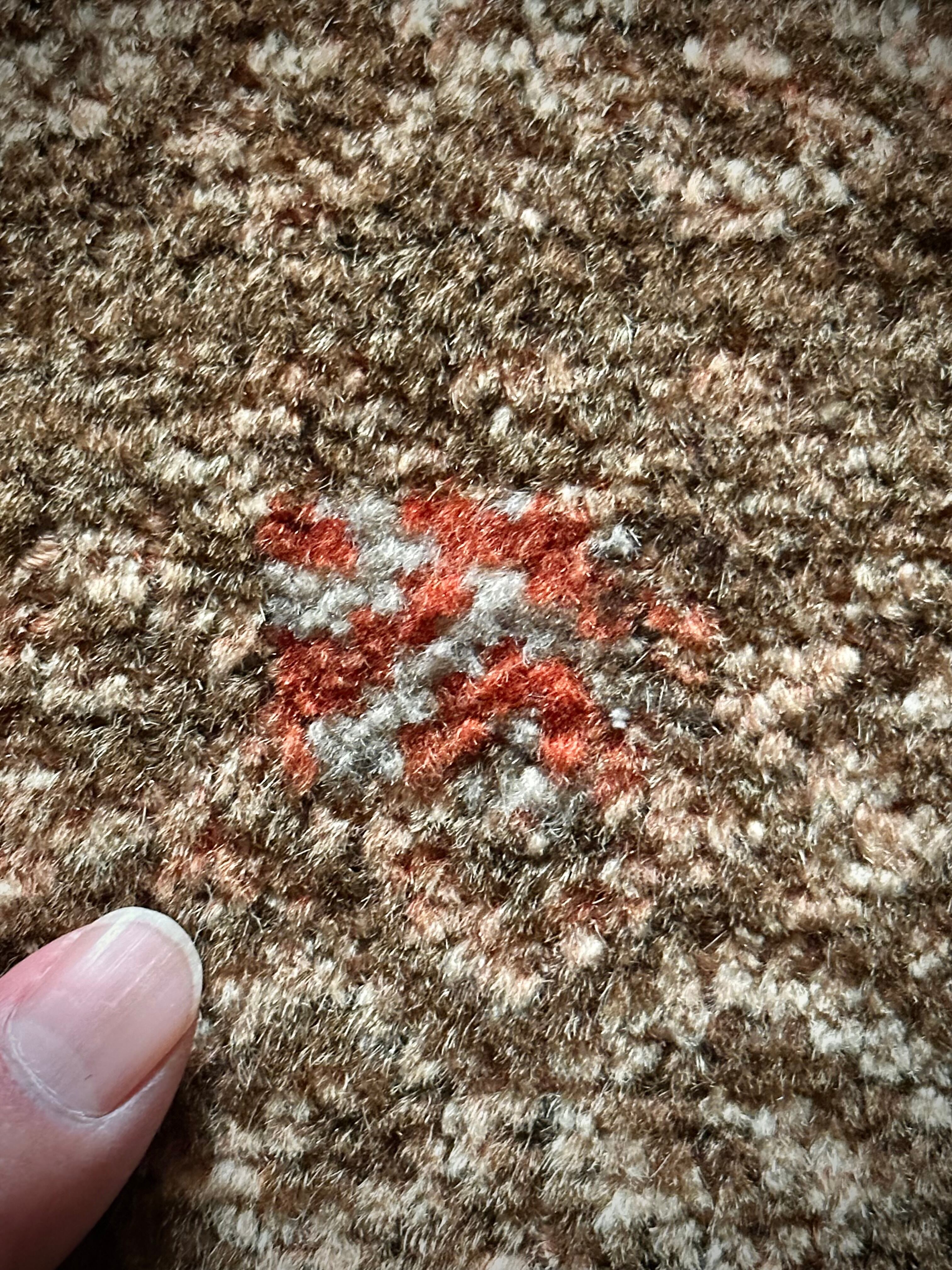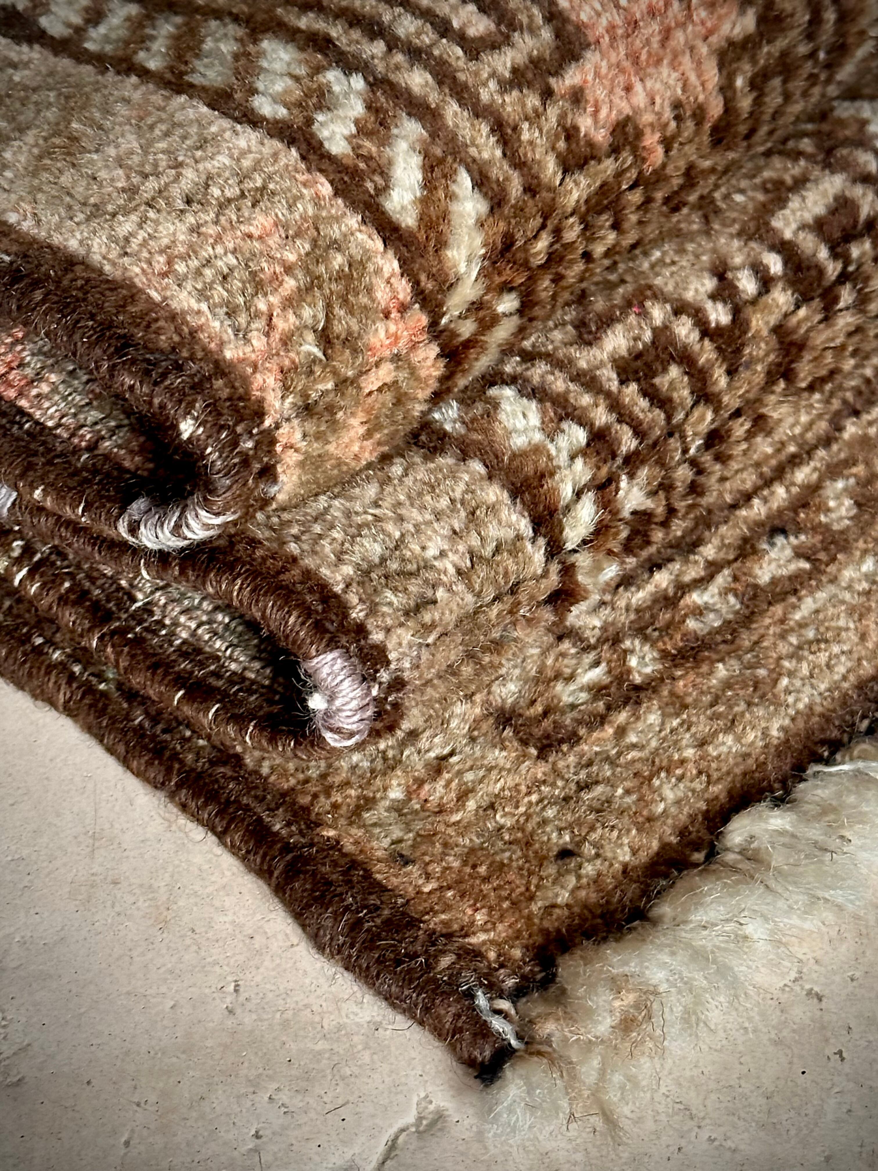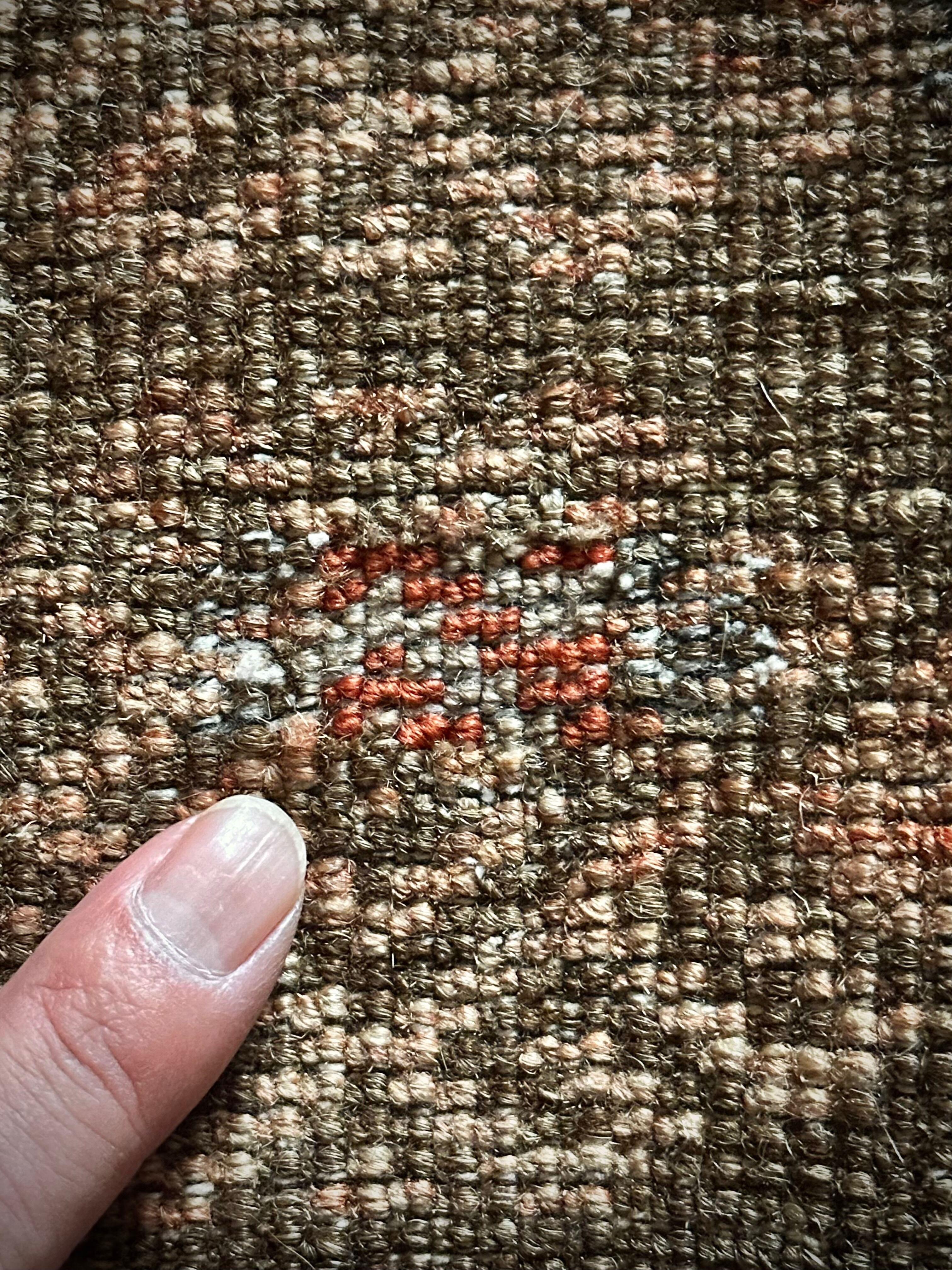 経年としてはかなり古い55年のヴィンテージラグとして、それなりの使用感に当時からの下手なリペアがありますが、愛嬌がてらの雰囲気として補えてください。またそれら以外には目立つ汚れにダメージはありまんし、パイル自体も程よいサラッとした肌触りの1枚で、大きさ的にはベッドサイドやチェスト前にちょうどなアクセントラグになります。