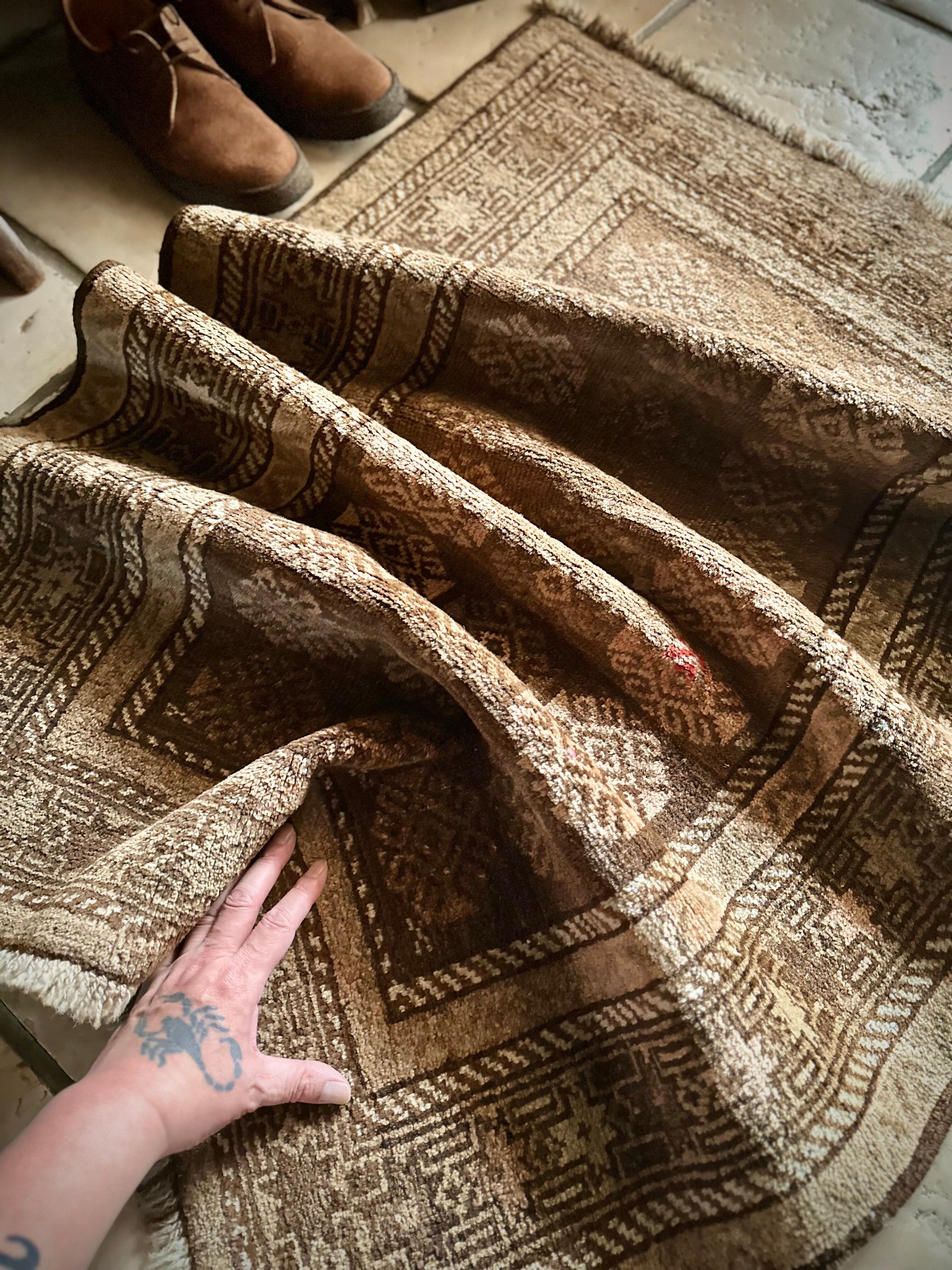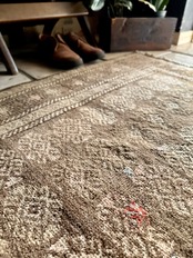 最後にラグそのものに関しては羊毛特有の匂いがあり、採寸は中央付近で計測していますが、手織りならではの歪みによる誤差や水洗いクリーニングによる縮み、また草木染めによる経年劣化の色ムラなどがありますが、それもまたヴィンテージラグの魅力かとご理解ください。