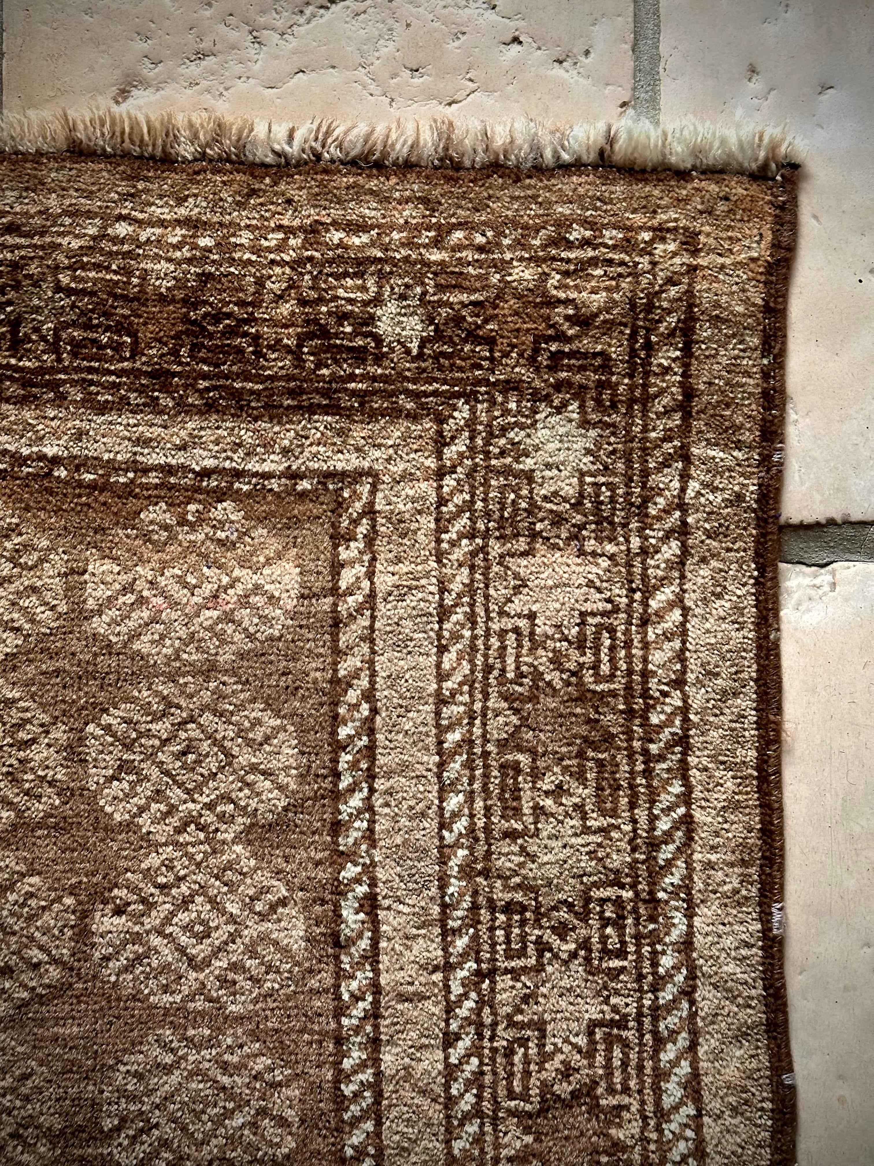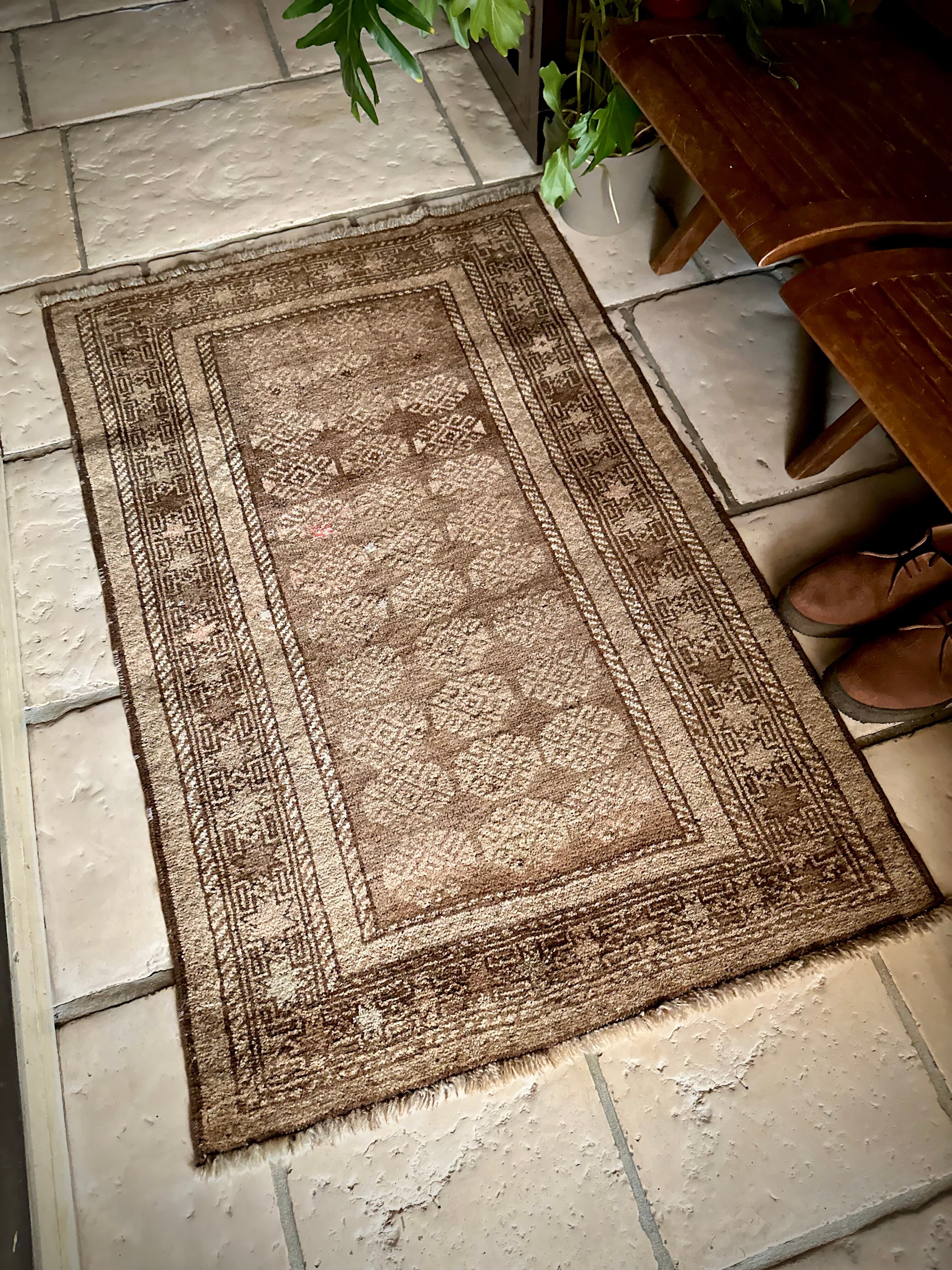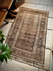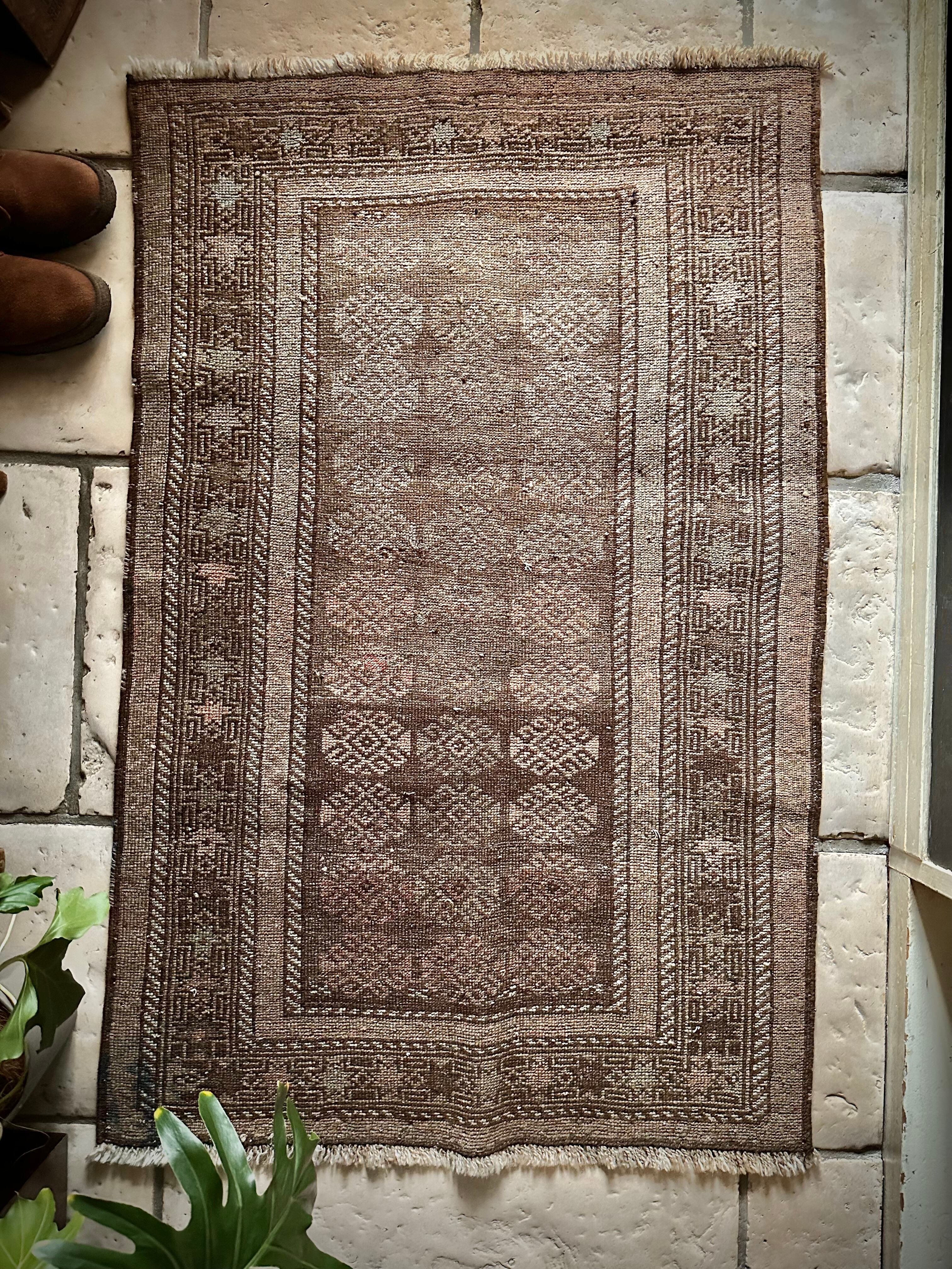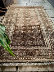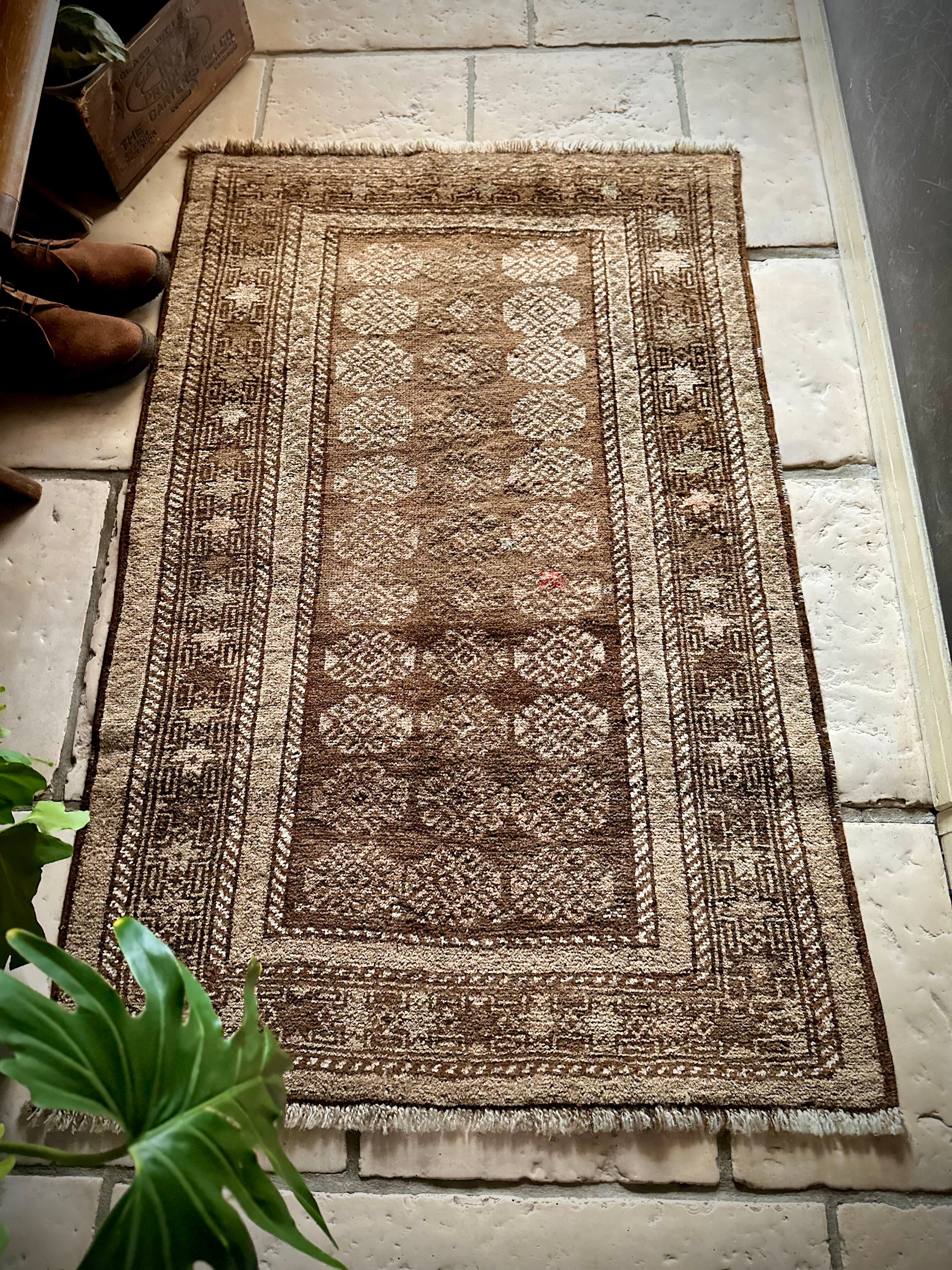 柔らかな表情ながらもシャビーなベージュとブラウンが輝いて見えるシンプルなこちらは、アフガニスタンはヘラート州に居住するバルーチ族のトライバルラグで、かなり年季の入った面構えがかっこいい1枚になります。