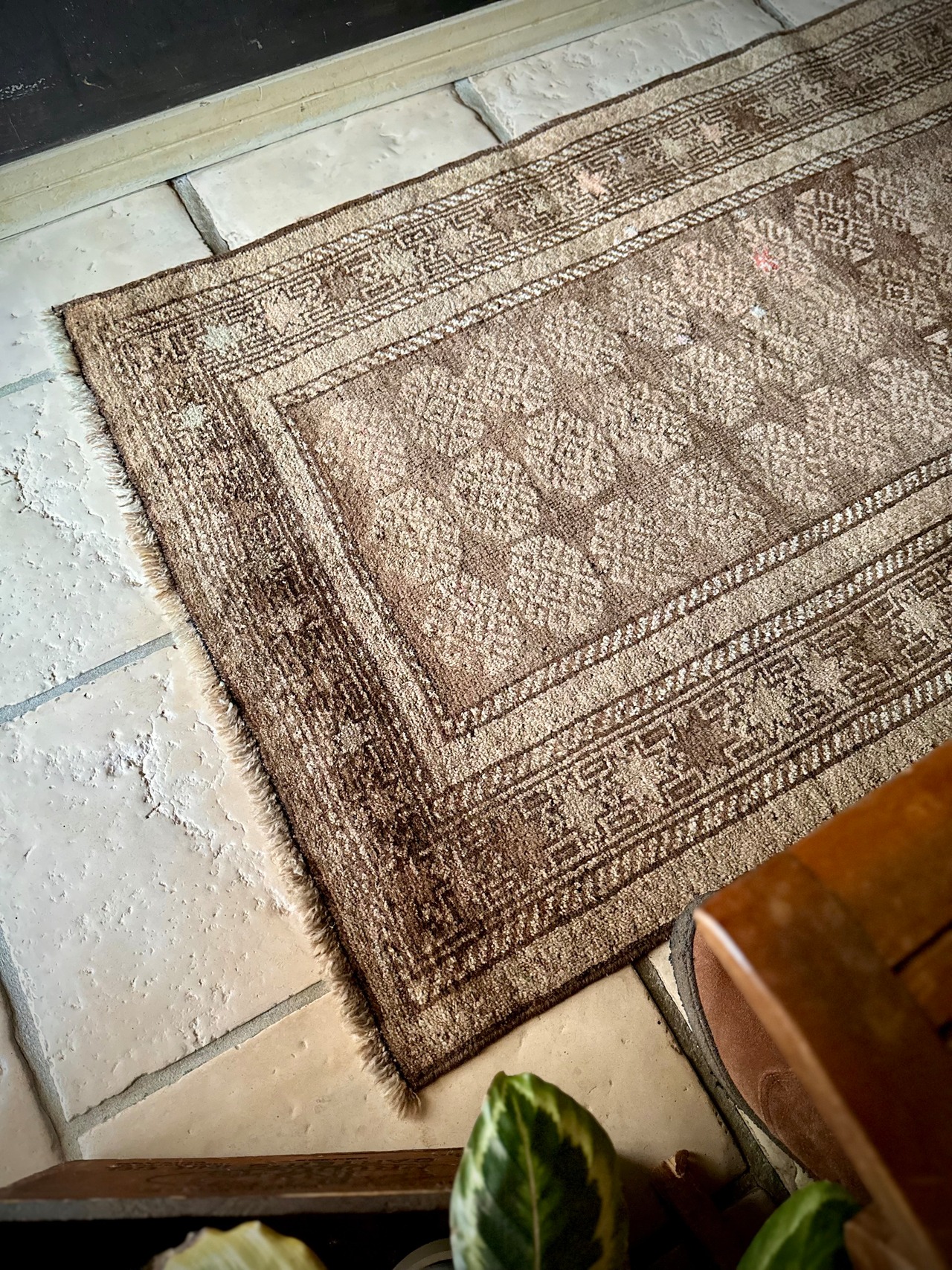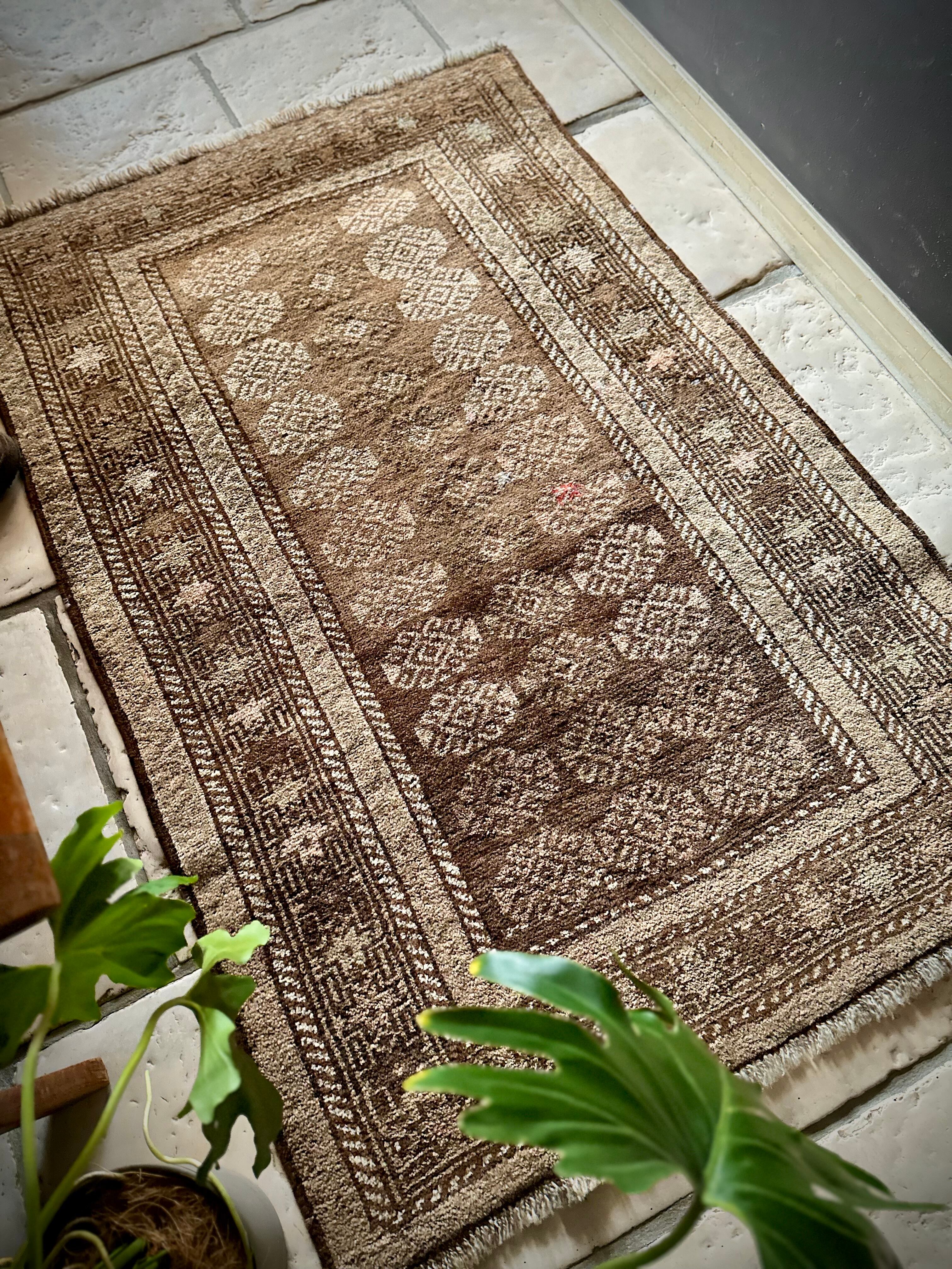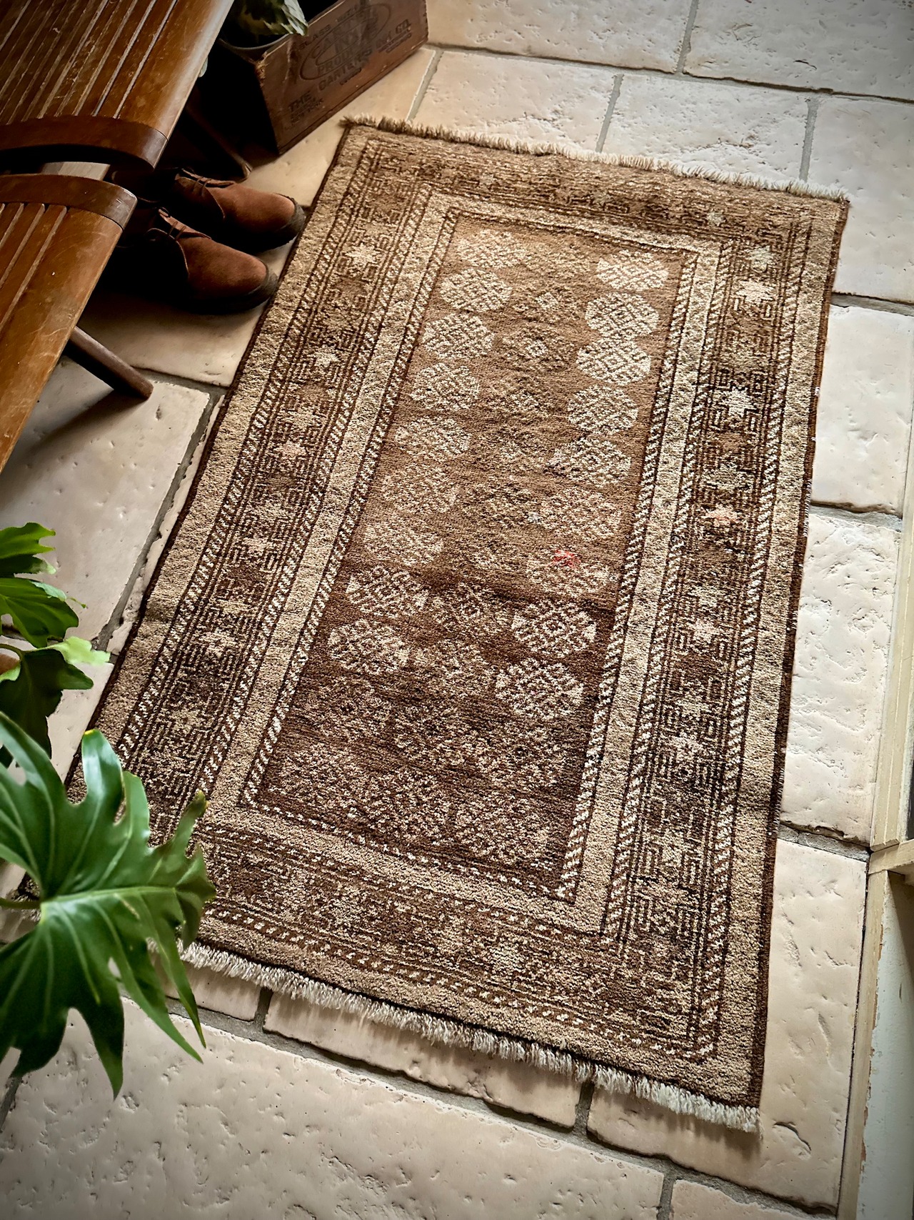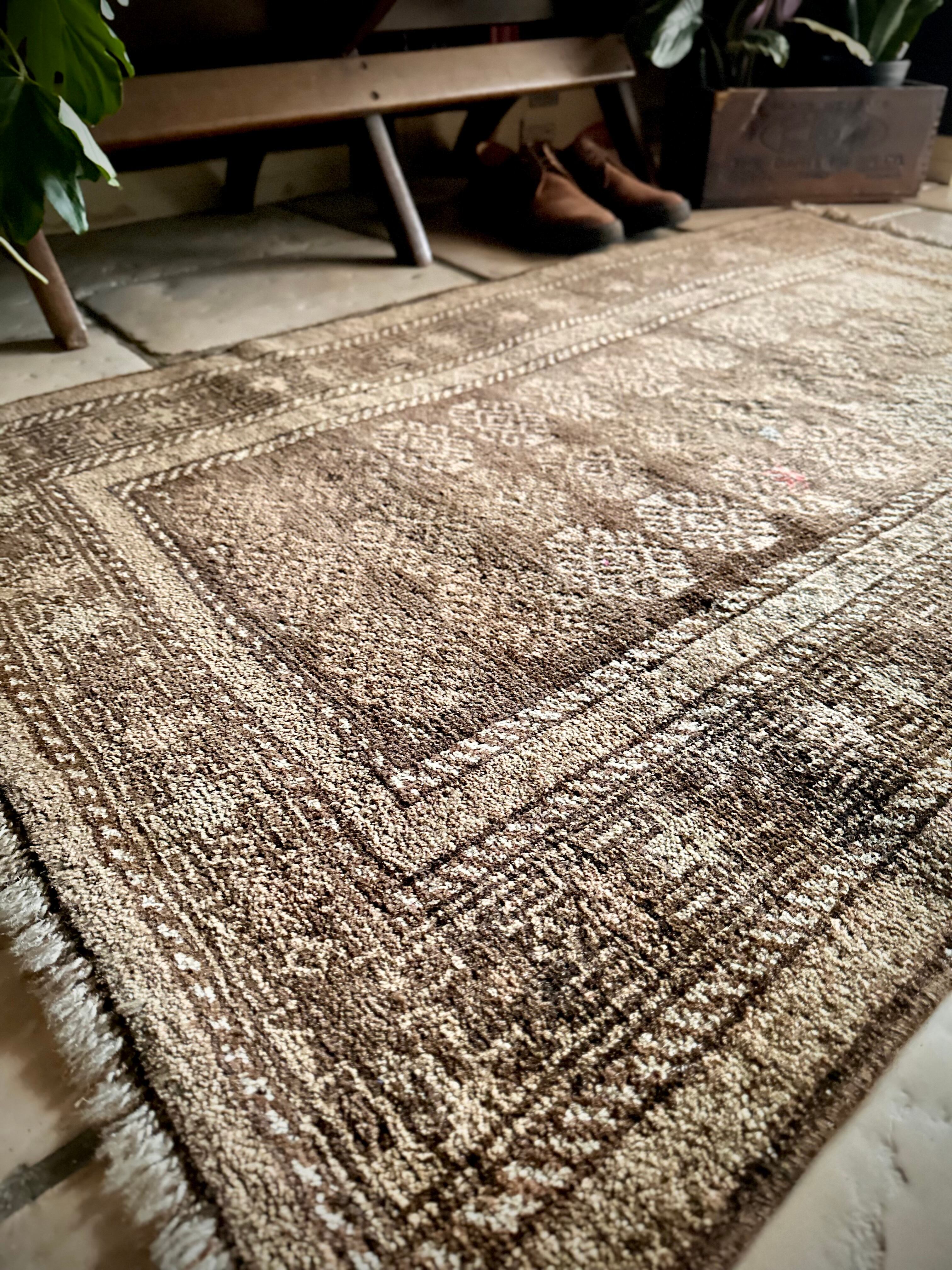 柔らかな表情ながらもシャビーなベージュとブラウンが輝いて見えるシンプルなこちらは、アフガニスタンはヘラート州に居住するバルーチ族のトライバルラグで、かなり年季の入った面構えがかっこいい1枚になります。