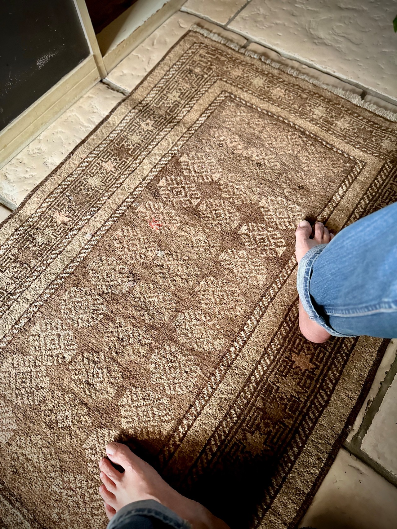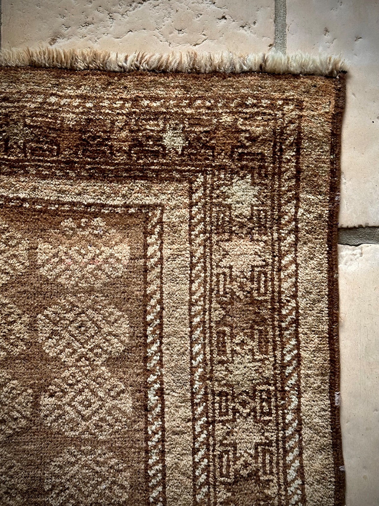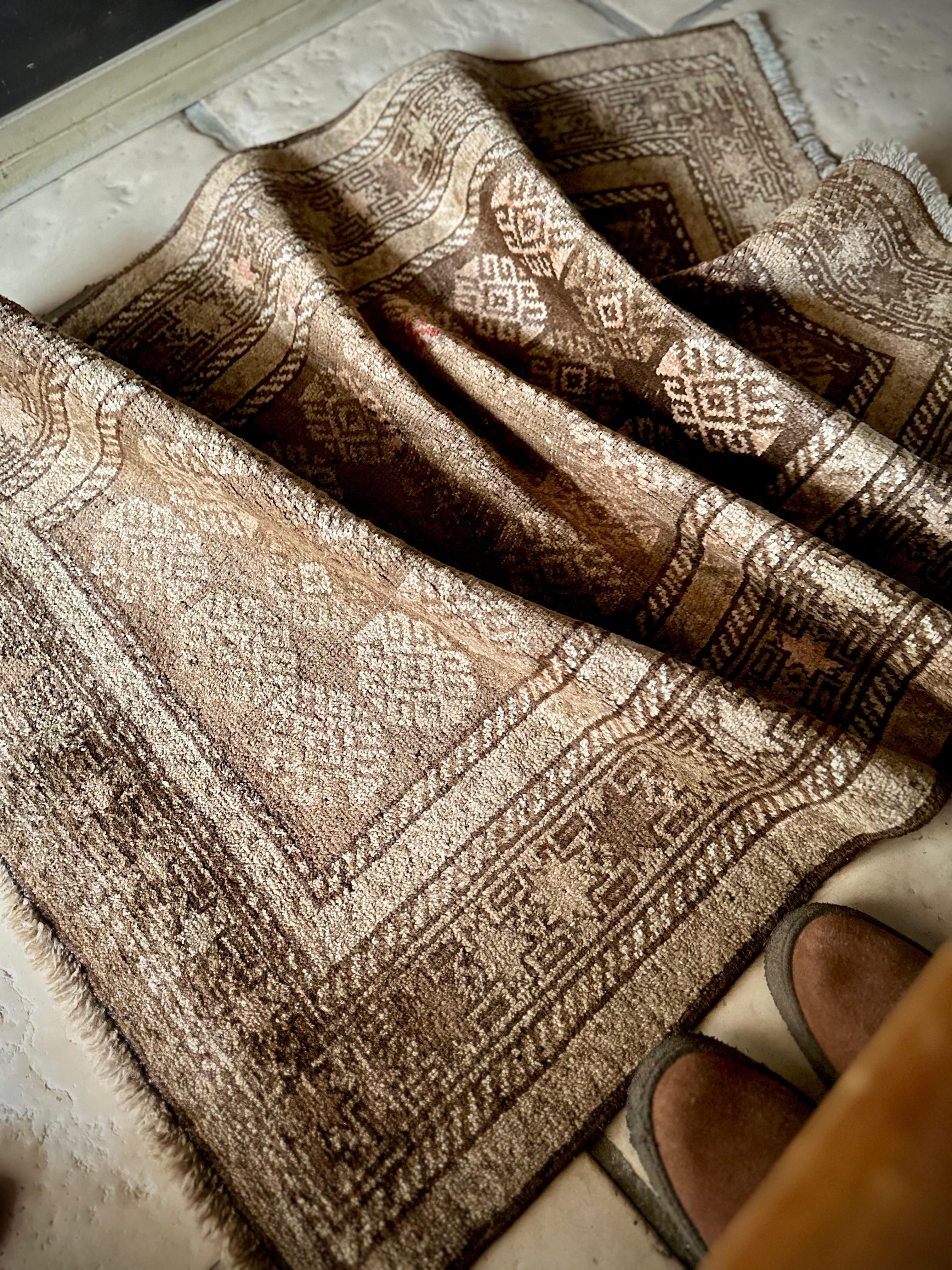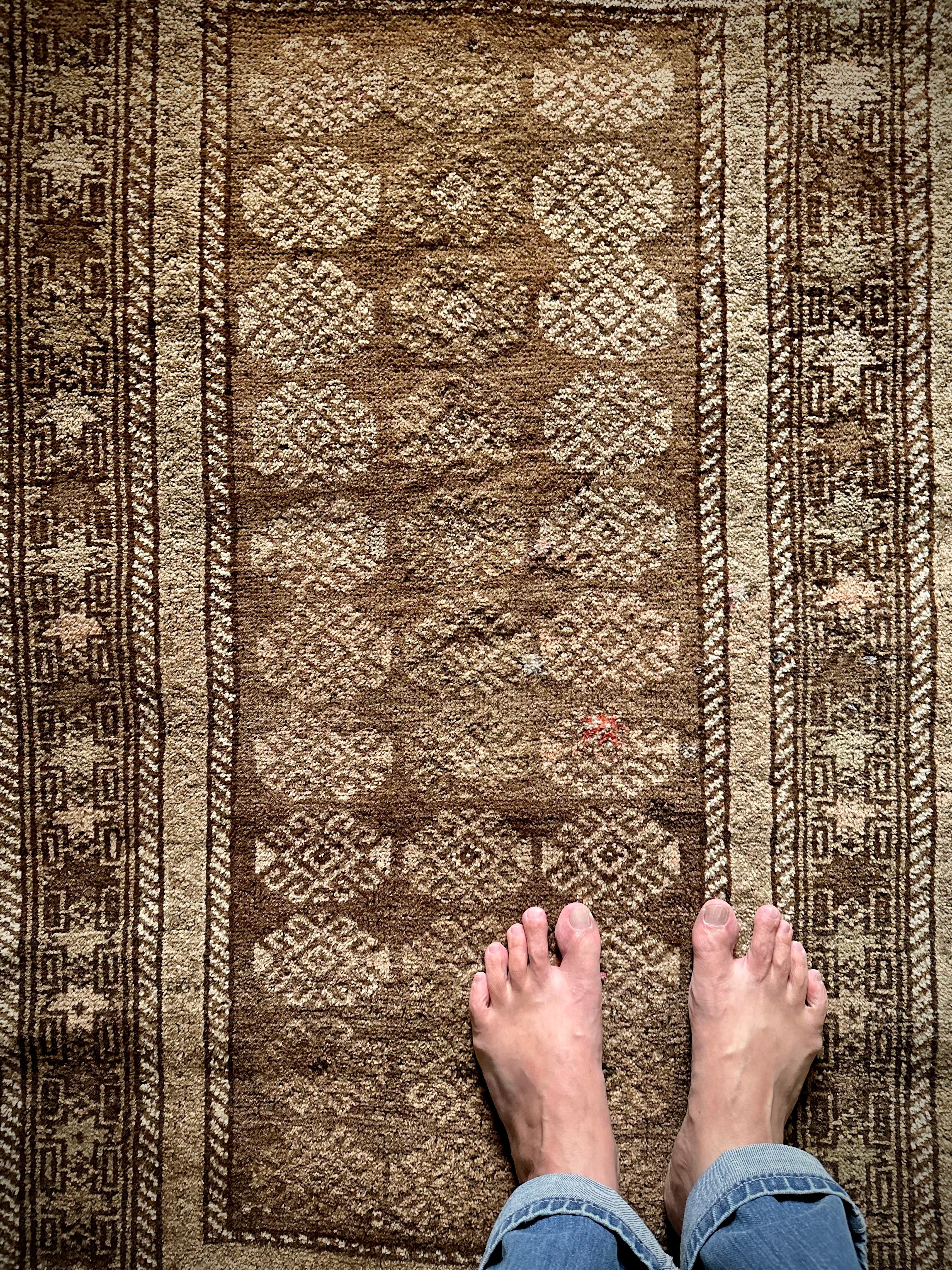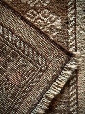 とりわけハッキリとした色使いにパキッとした絵柄が多いアフガン産バルーチですが、個人的にはこういったボヤけた絵柄が好みで、シンプルな連続紋様に八芒星が並んだだけのプリミティブさが逆にかっこよく、さりげない色合いにパイルの艶が映えているところが良いですね。