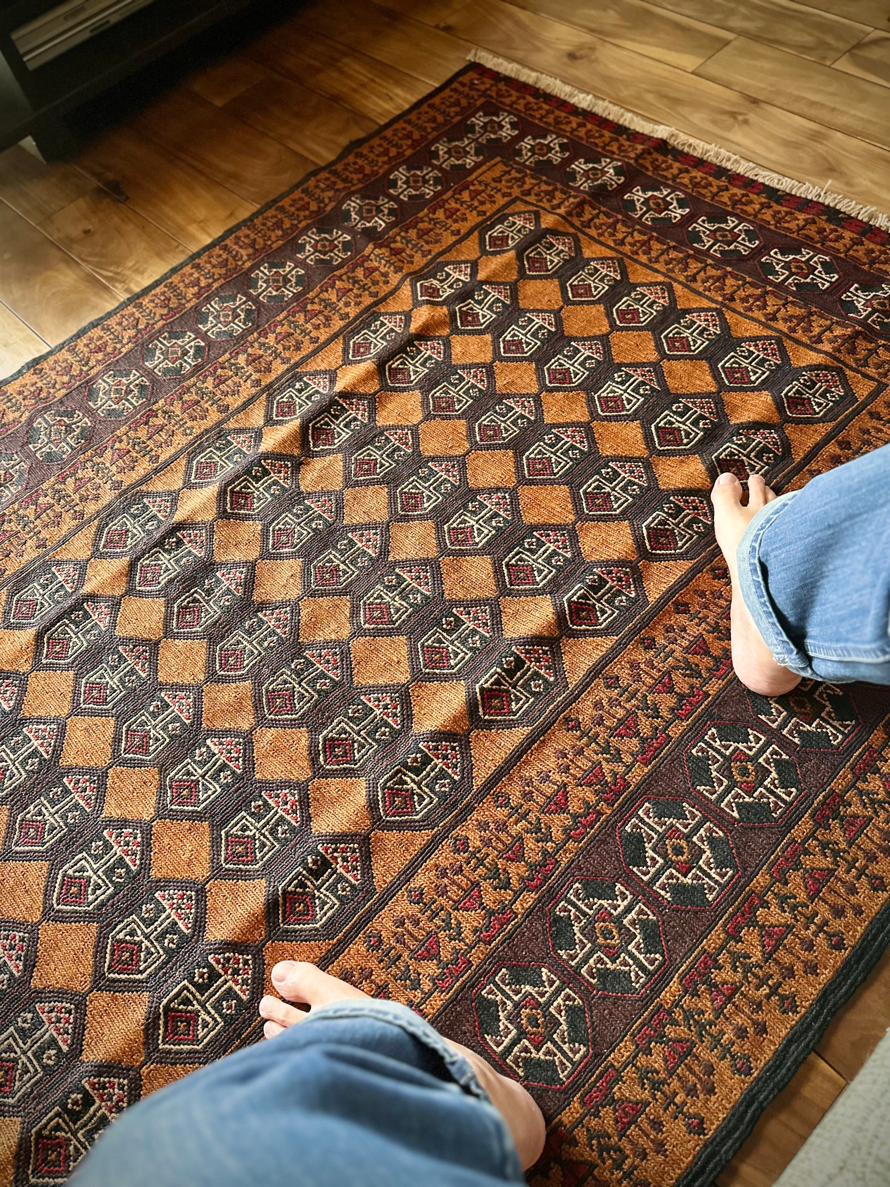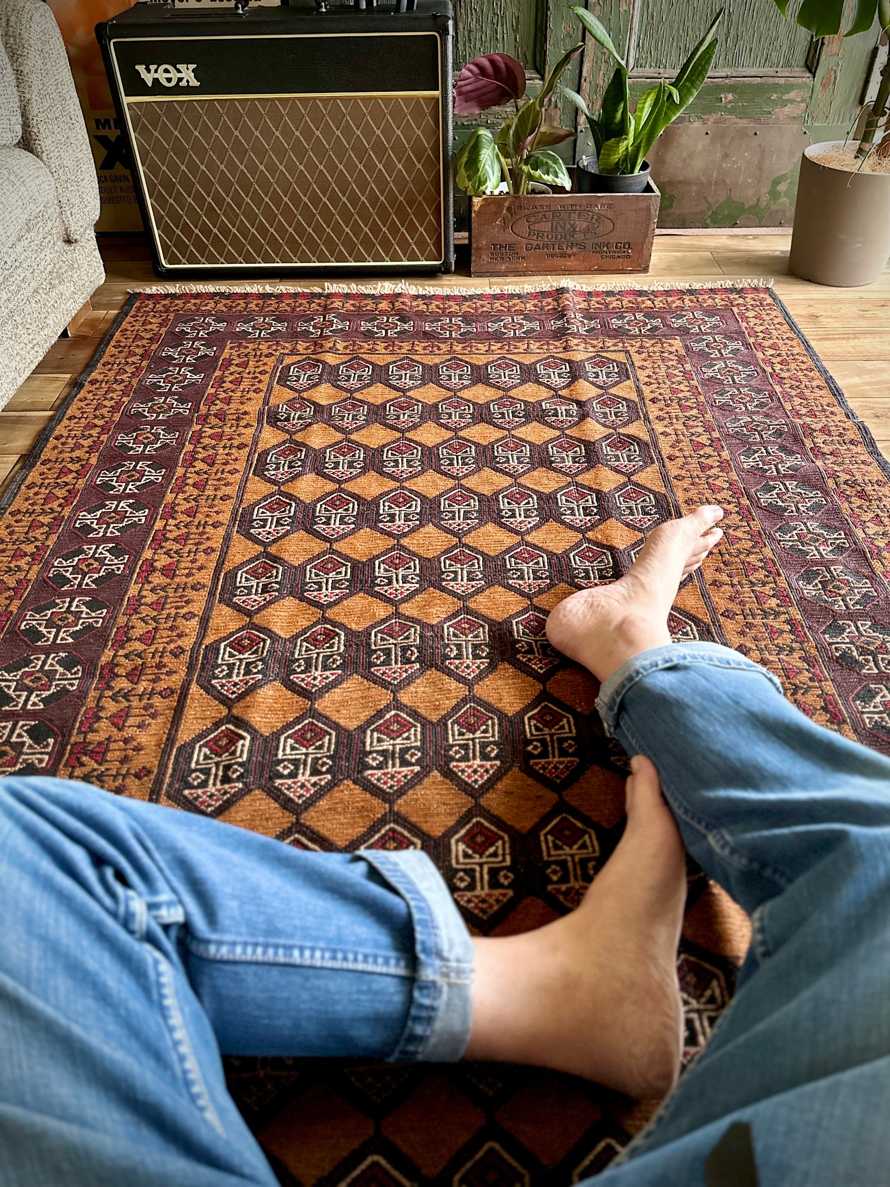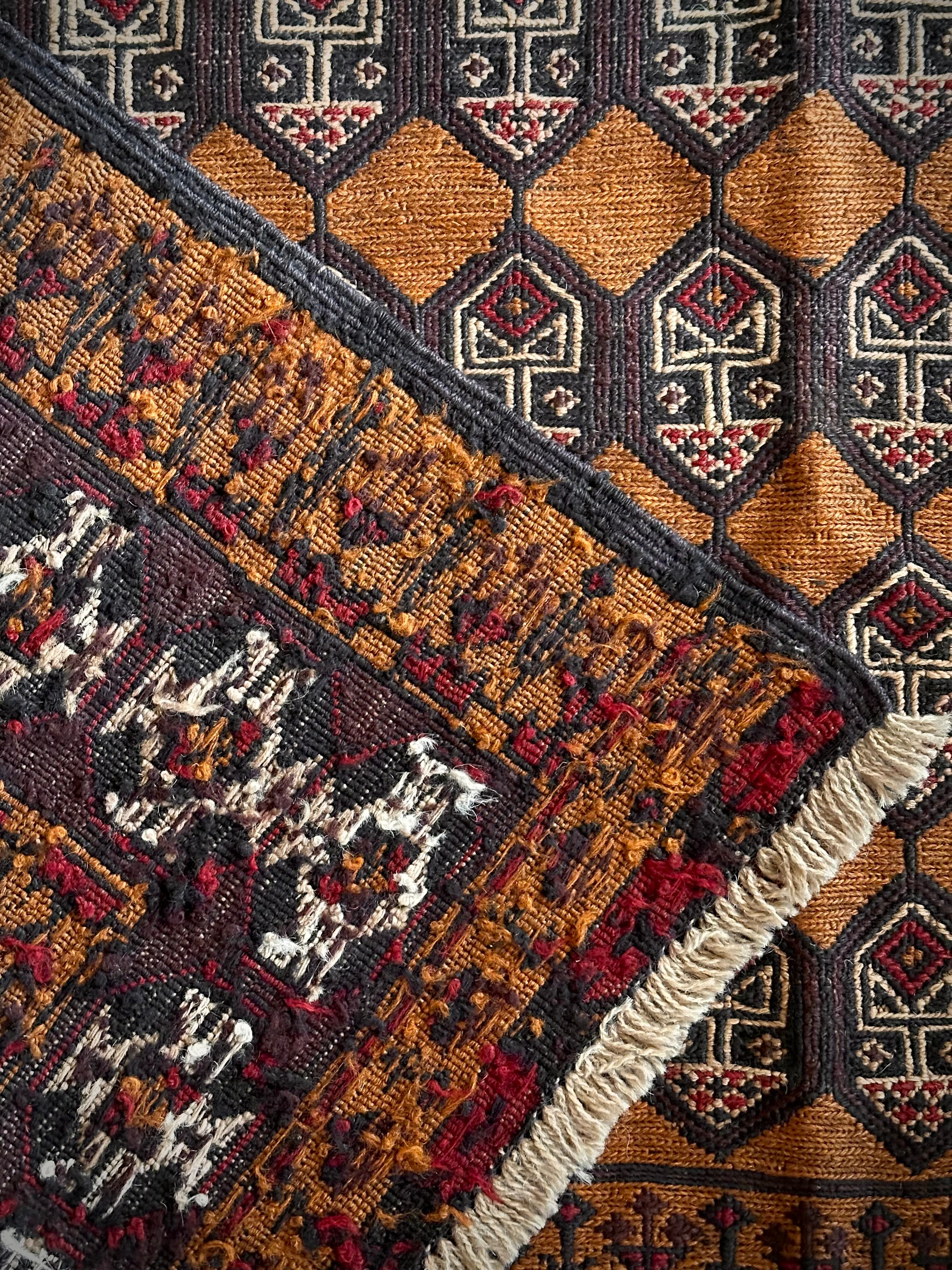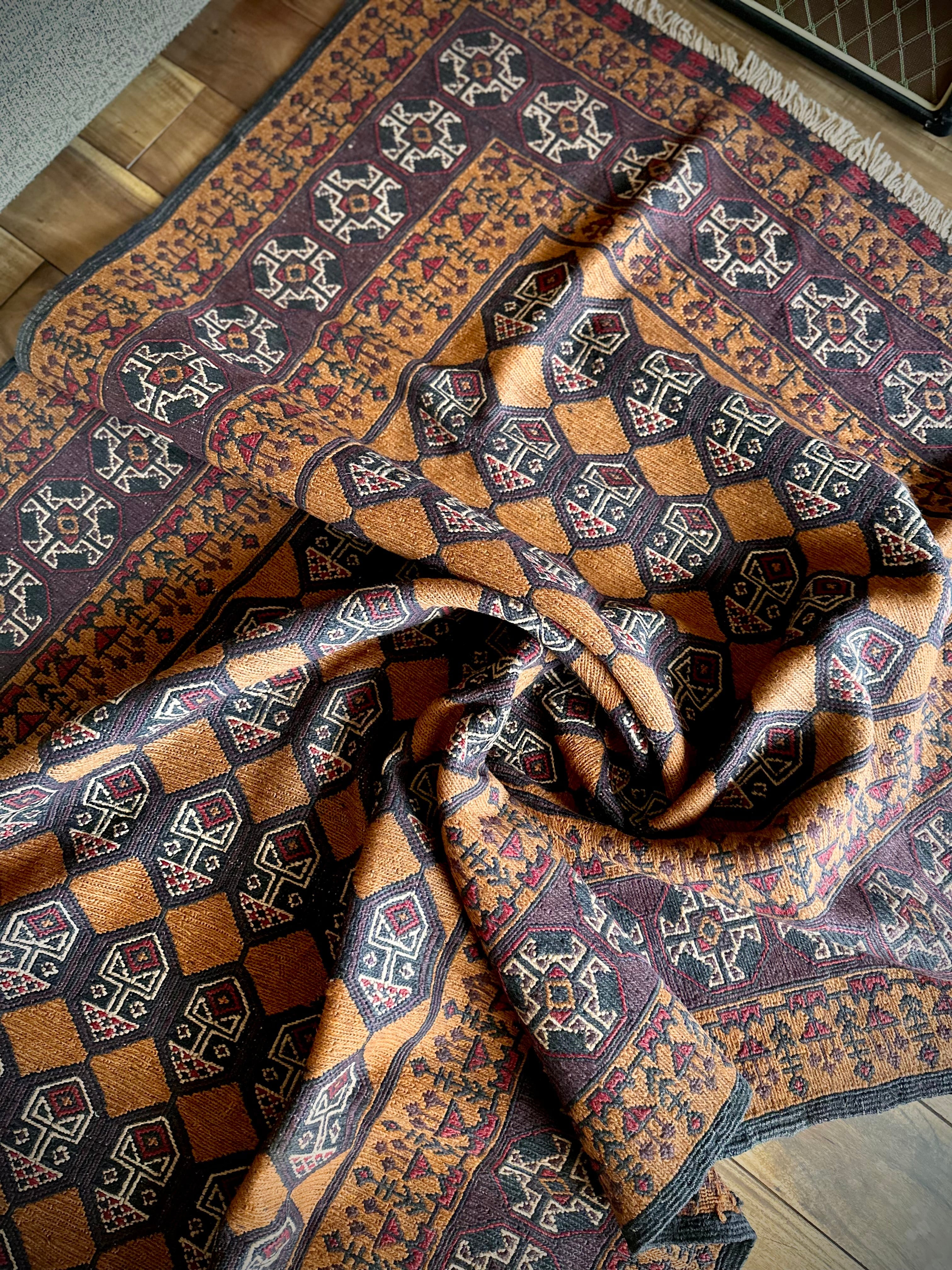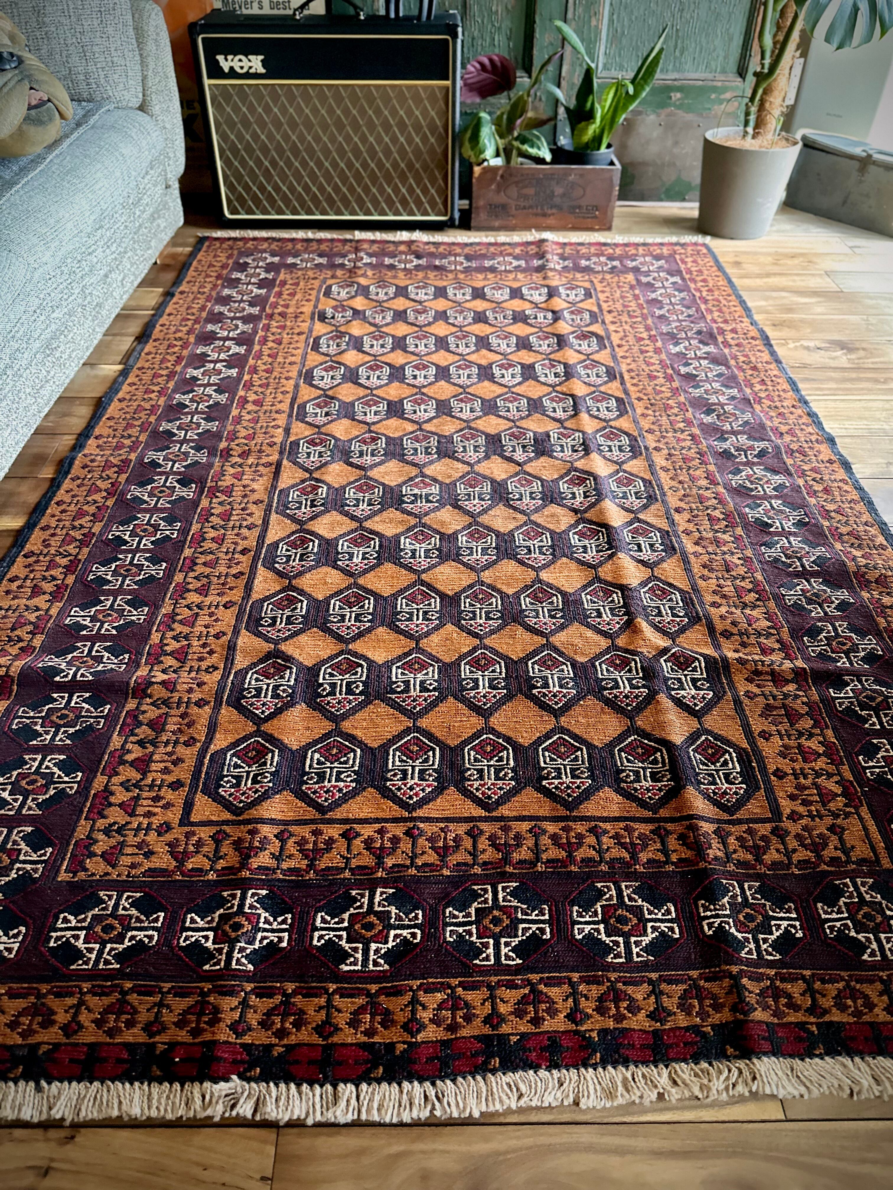 琥珀色のフィールドに植物をモチーフにした連続紋様がお面にも見えるプリミティブなこちらは、アフガニスタンはヘラート州に居住するバルーチ族のキリムラグで、手間の掛かるスマック織りという技法で織られた大判サイズになります。