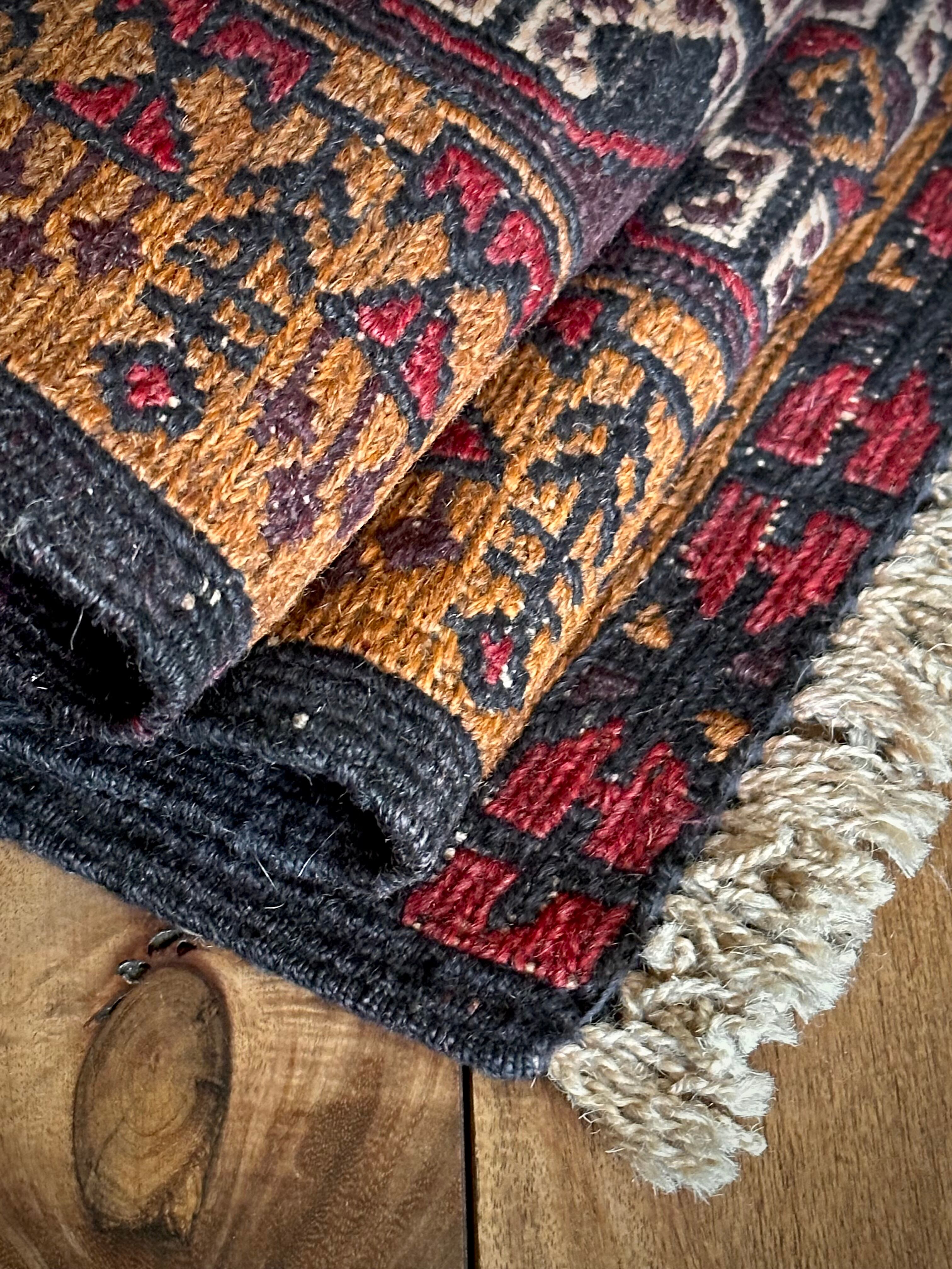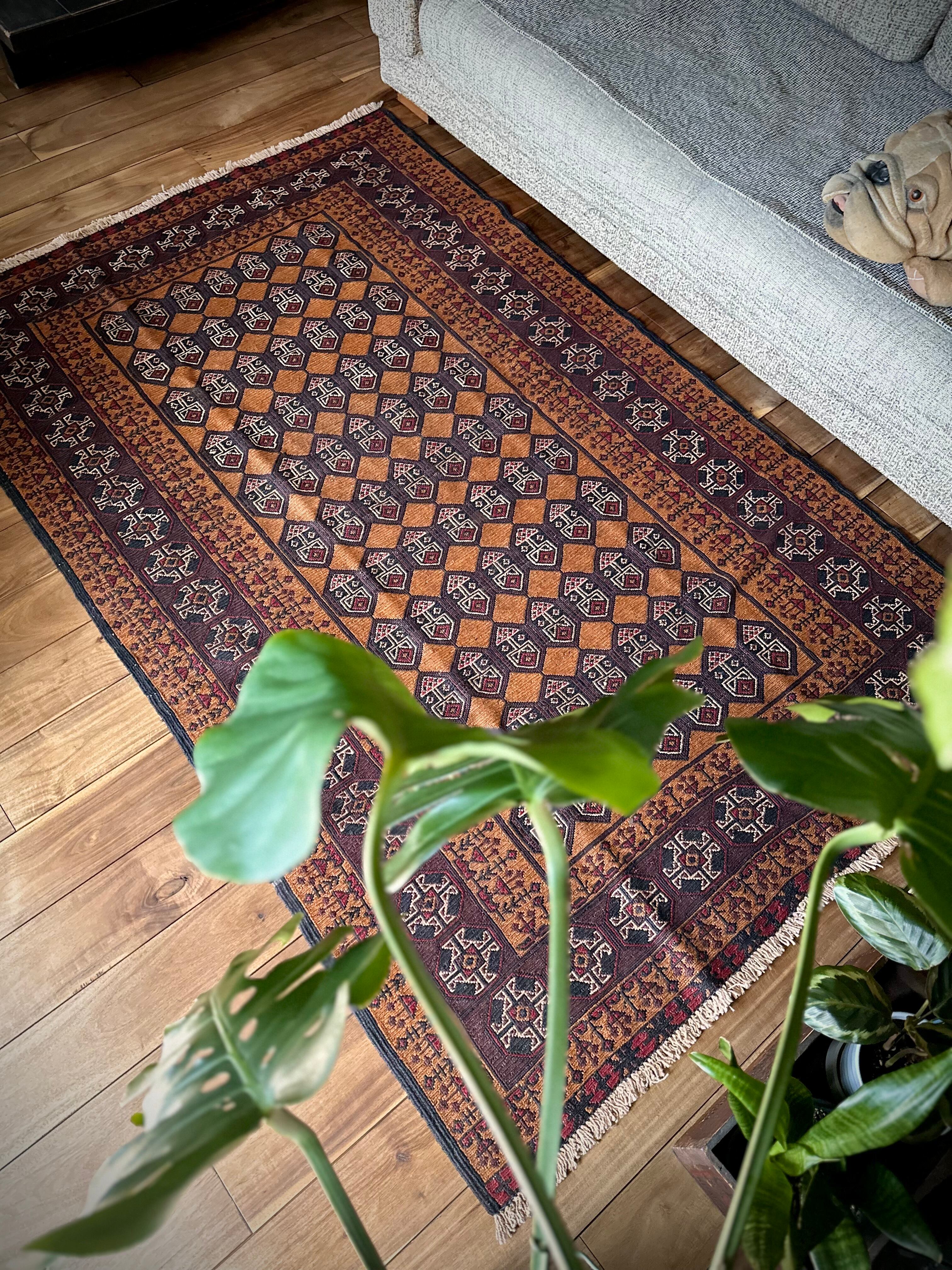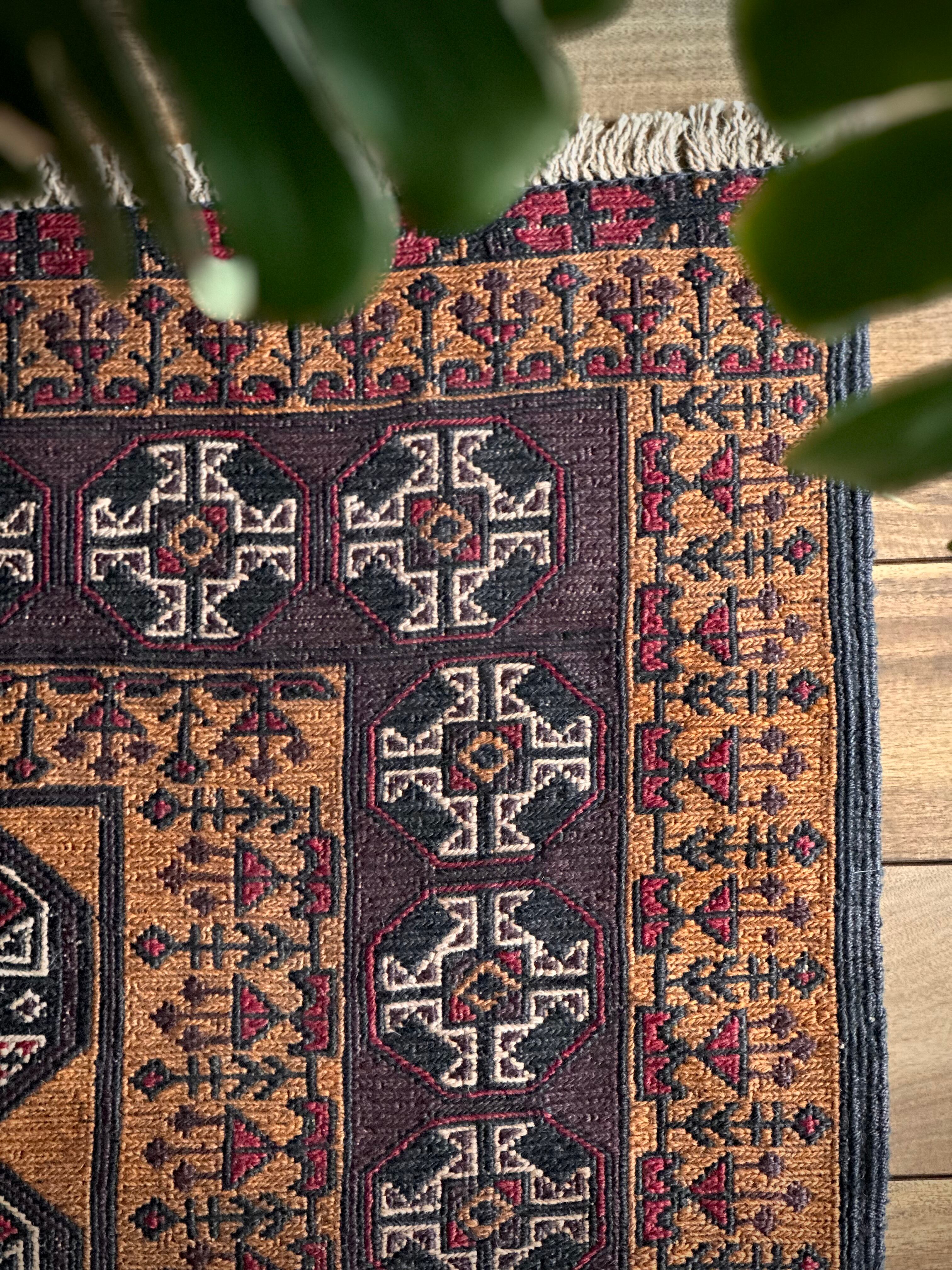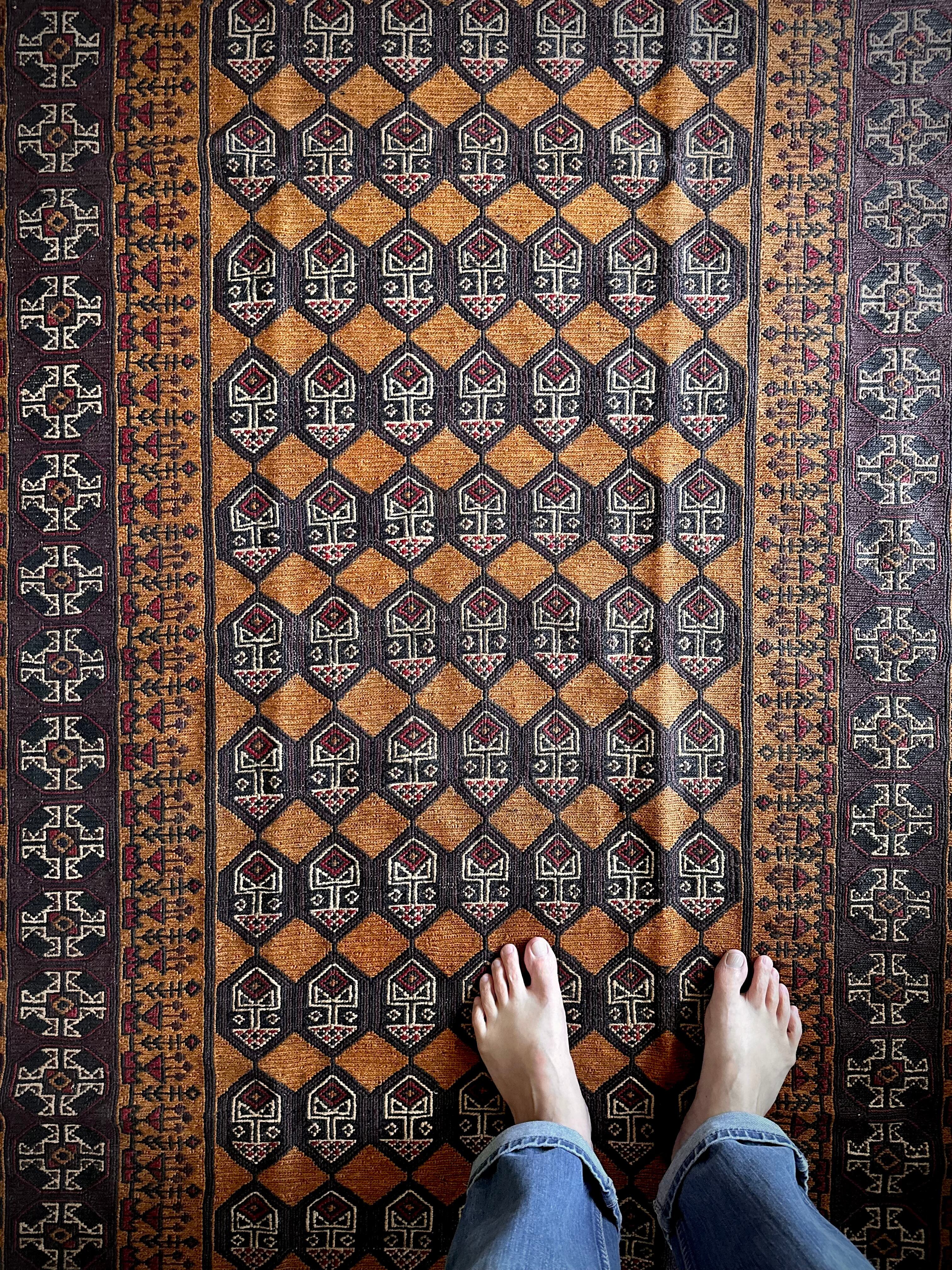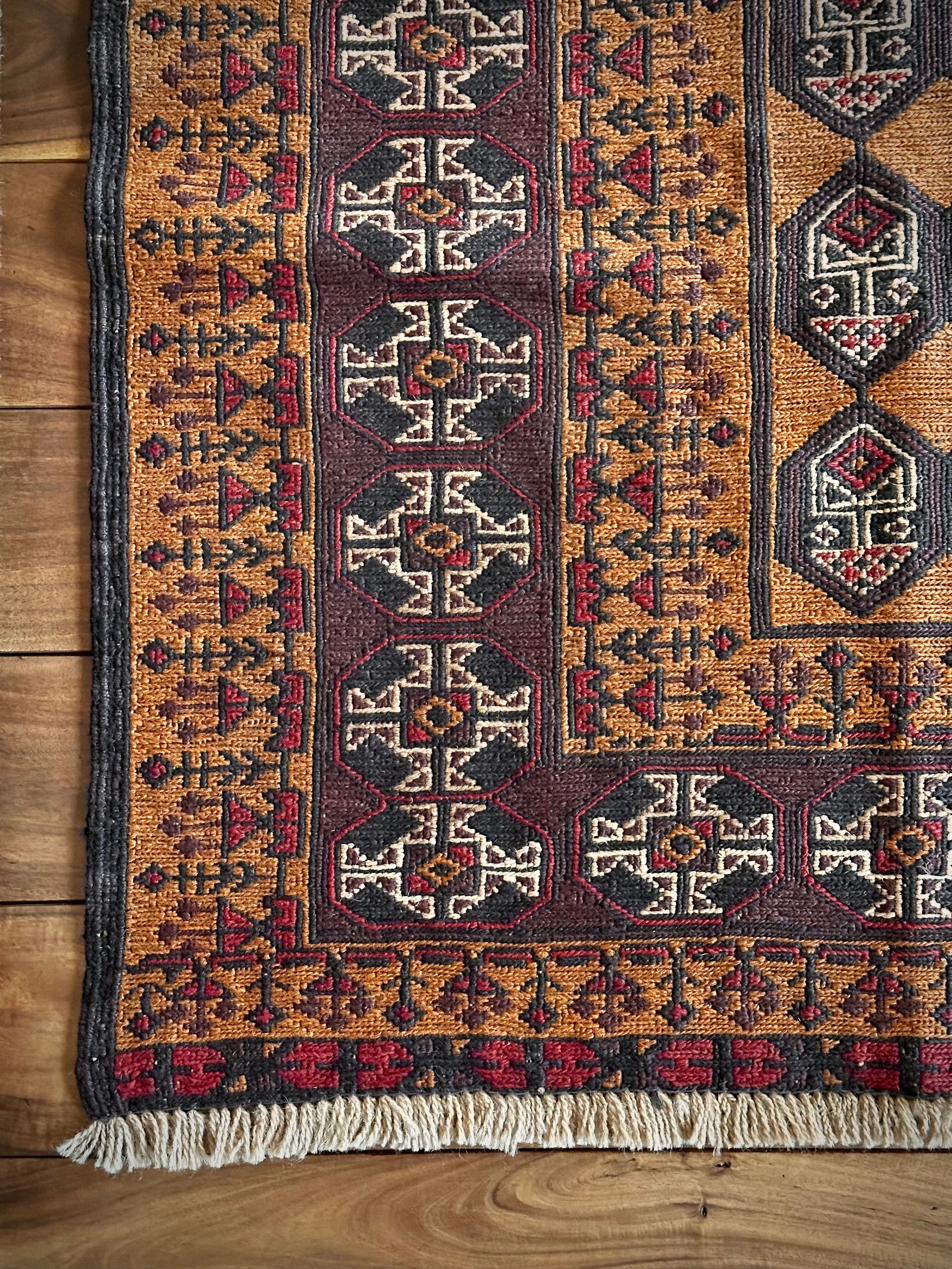 琥珀色のフィールドに植物をモチーフにした連続紋様がお面にも見えるプリミティブなこちらは、アフガニスタンはヘラート州に居住するバルーチ族のキリムラグで、手間の掛かるスマック織りという技法で織られた大判サイズになります。