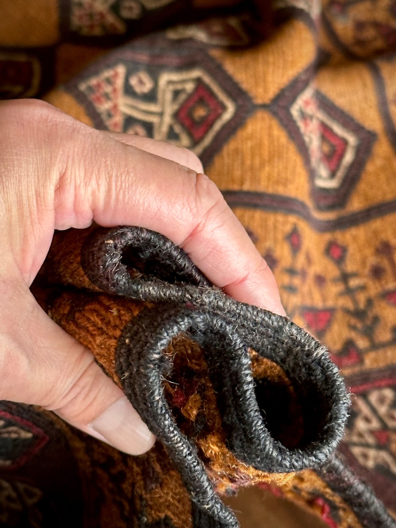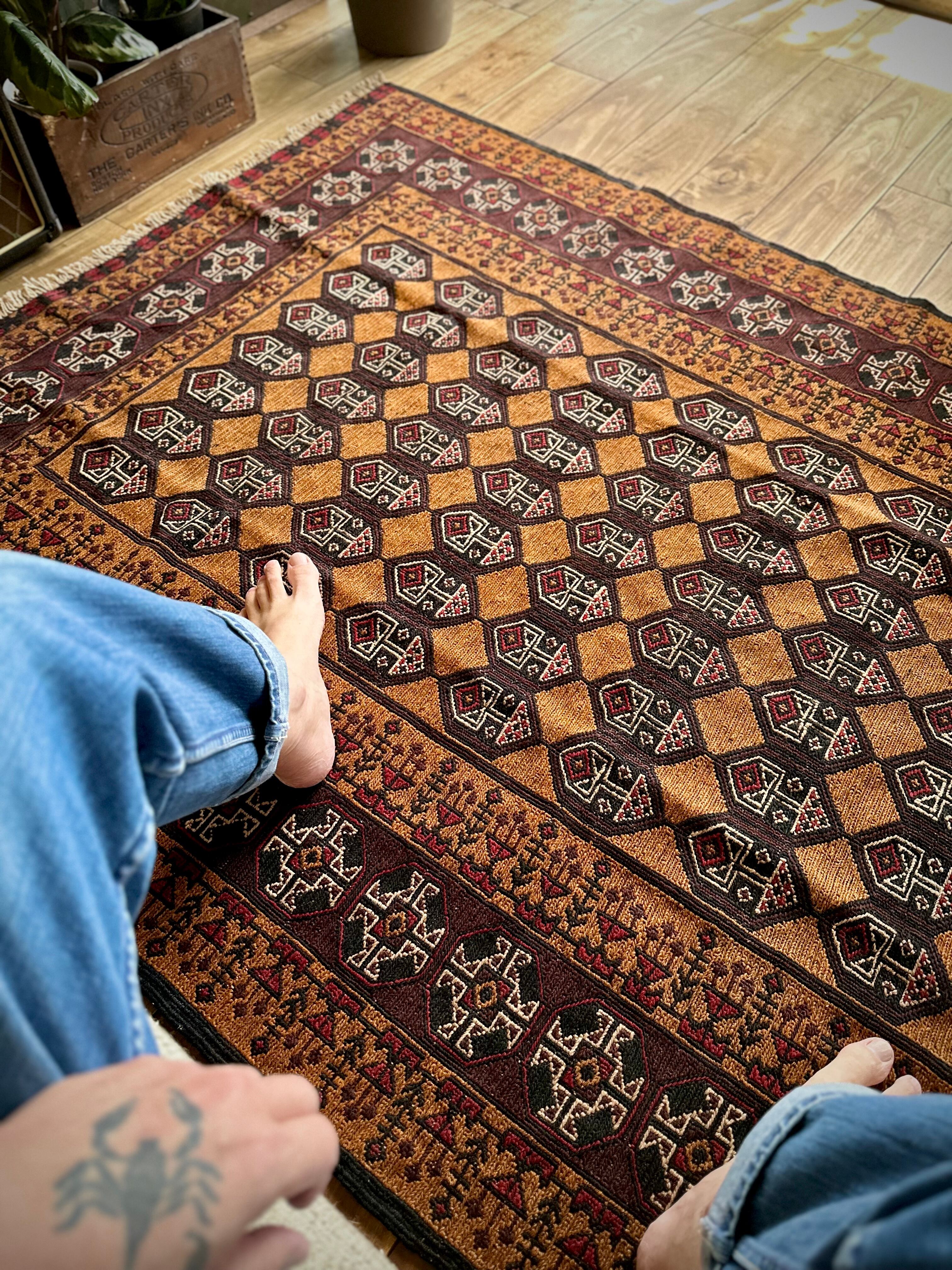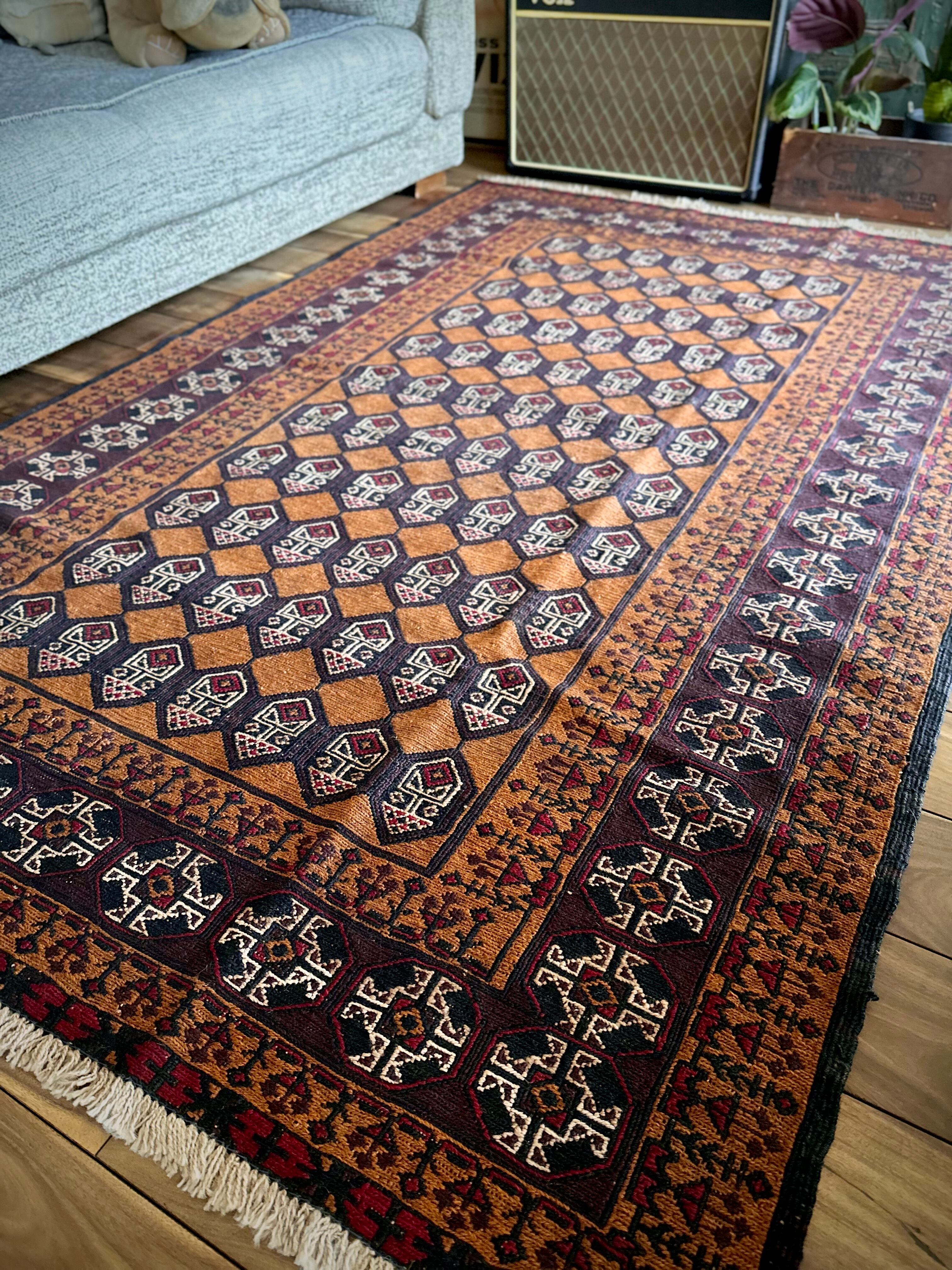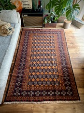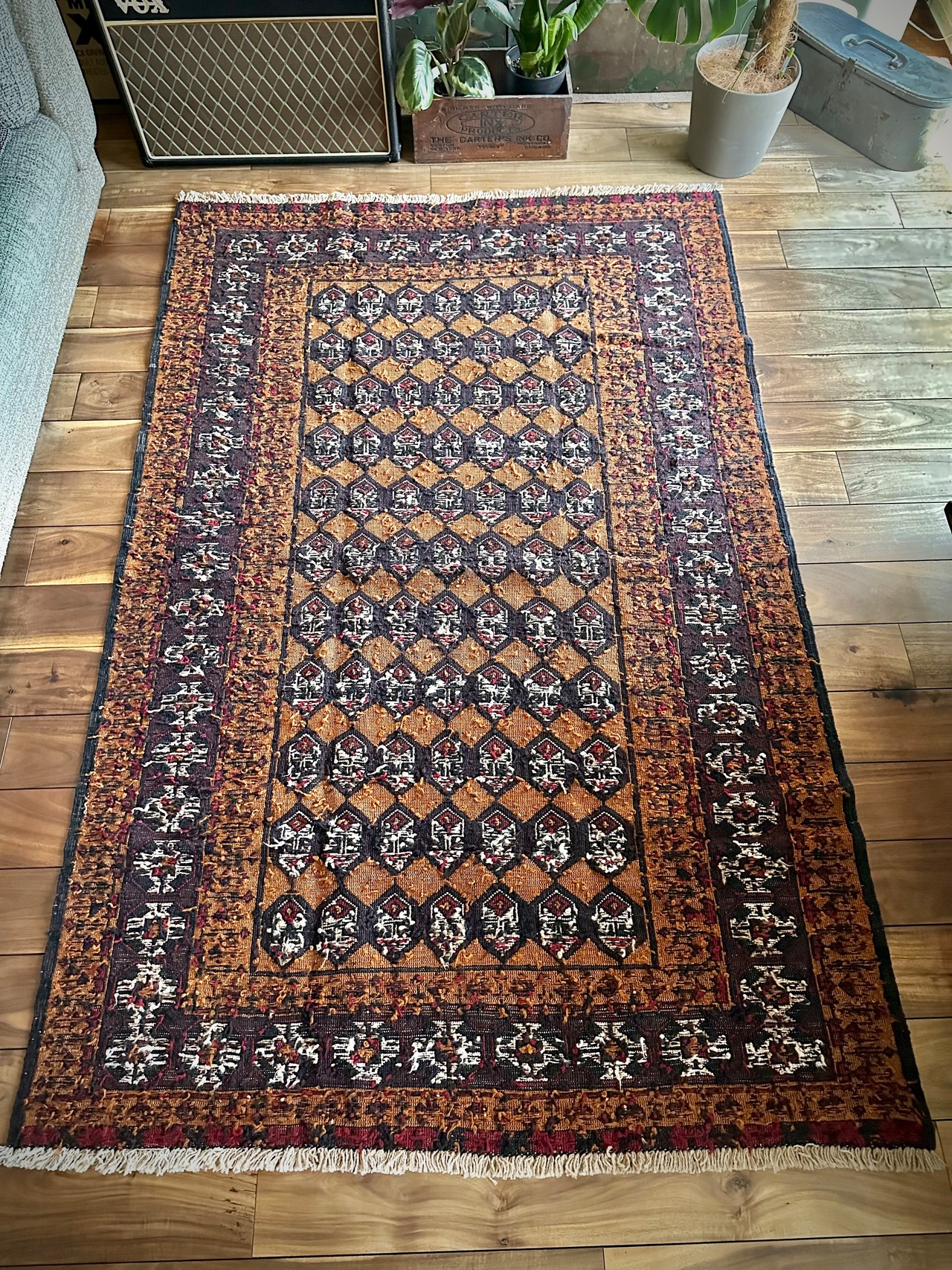 最後にラグそのものに関しては羊毛特有の匂いがあり、採寸は中央付近で計測していますが、手織りならではの歪みによる誤差や水洗いクリーニングによる縮み、また草木染めによる経年劣化の色ムラなどがありますが、それもまたヴィンテージラグの魅力かとご理解ください。