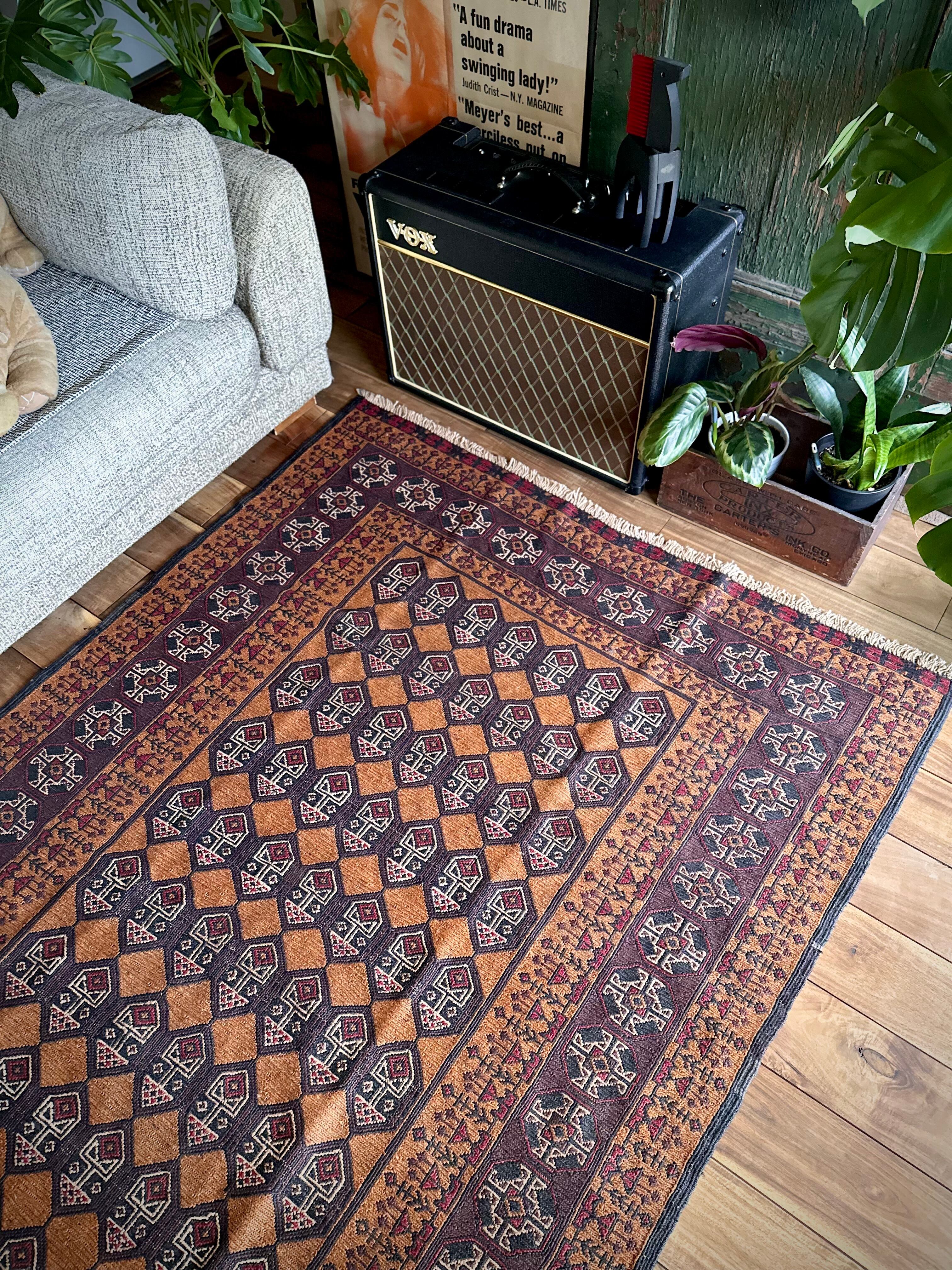 経年としては比較的に新しい30年のヴィンテージラグになり、それほどの使用感はありませんし目立つ汚れにダメージは見当たらないグッドなコンディションが嬉しく、クセのある絵柄にもついつい目がいってしまいます。