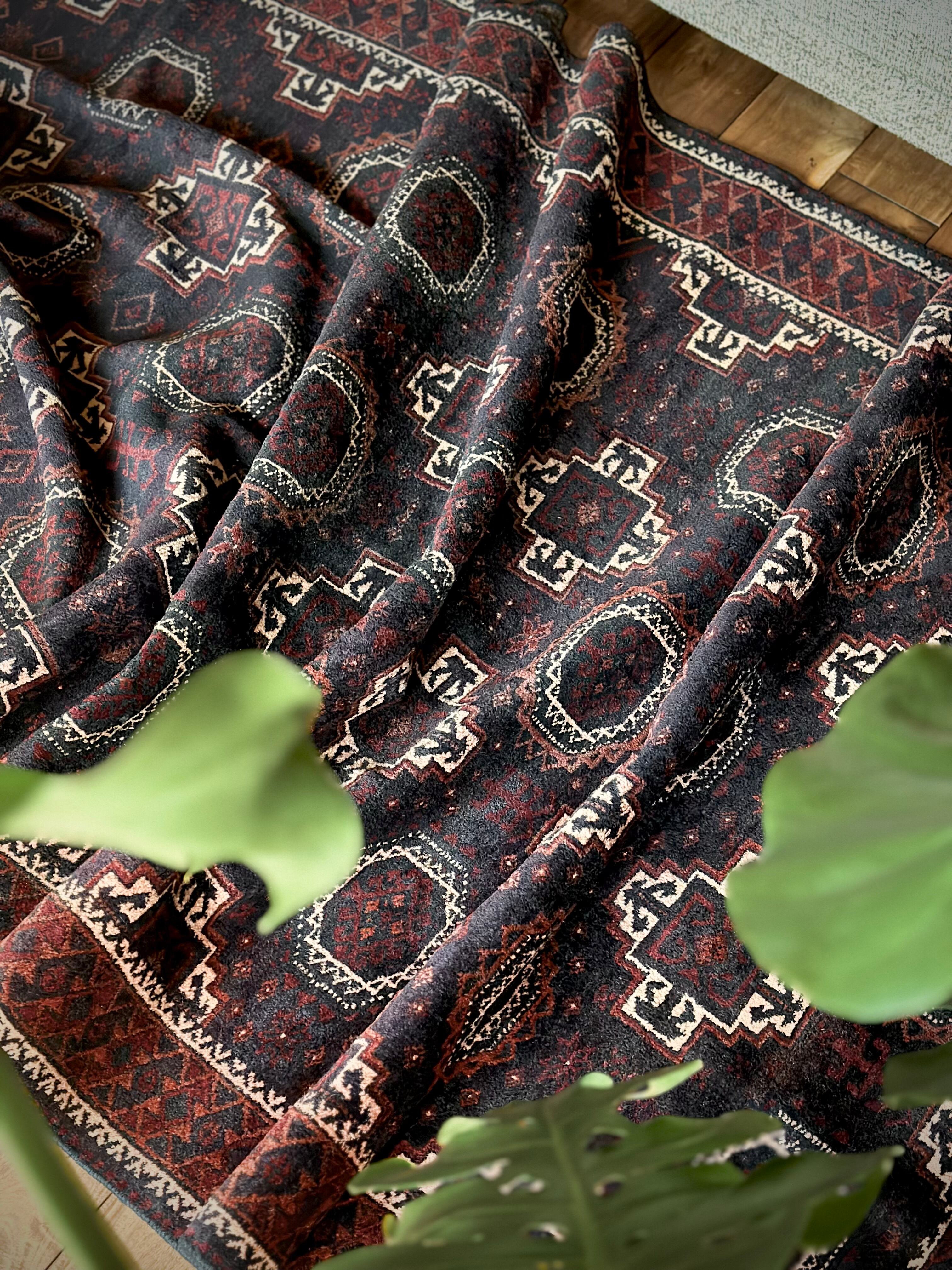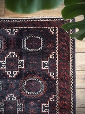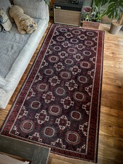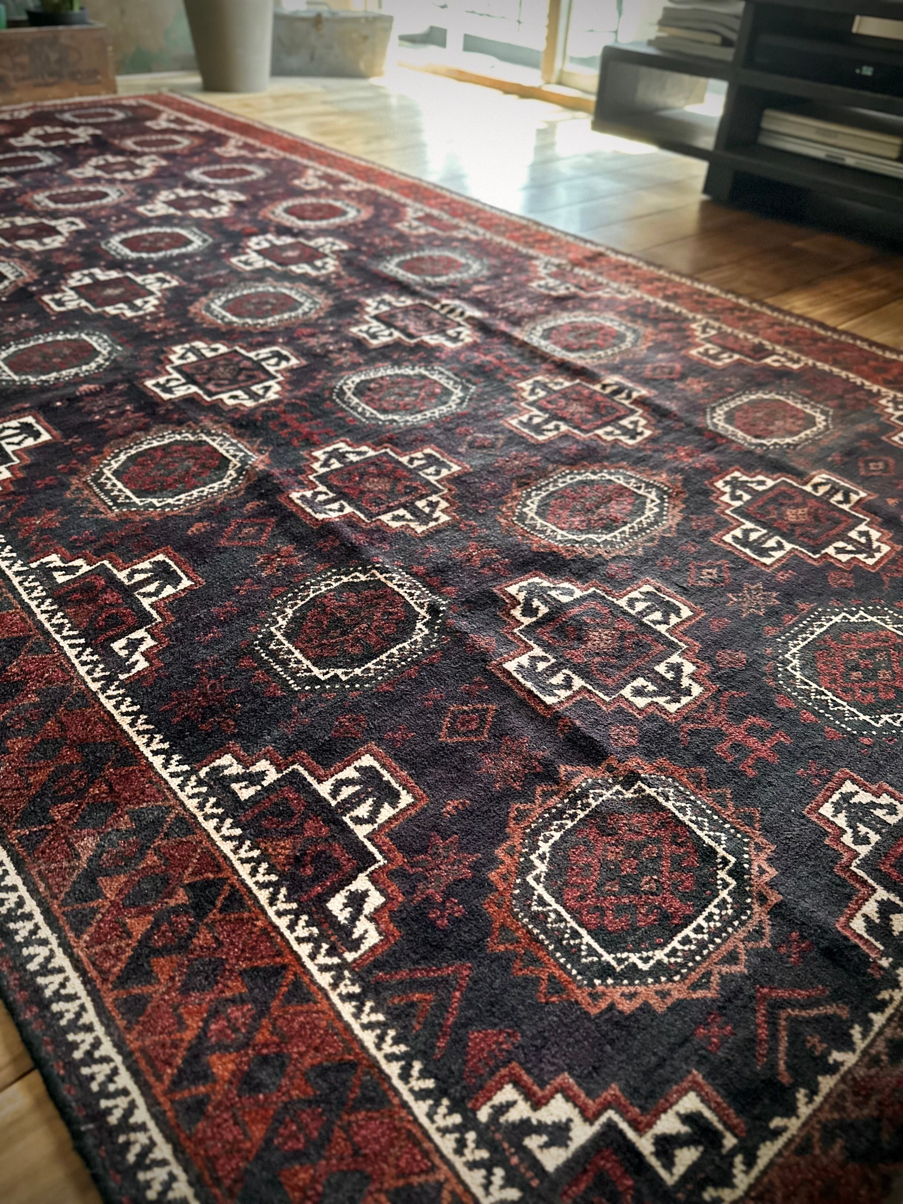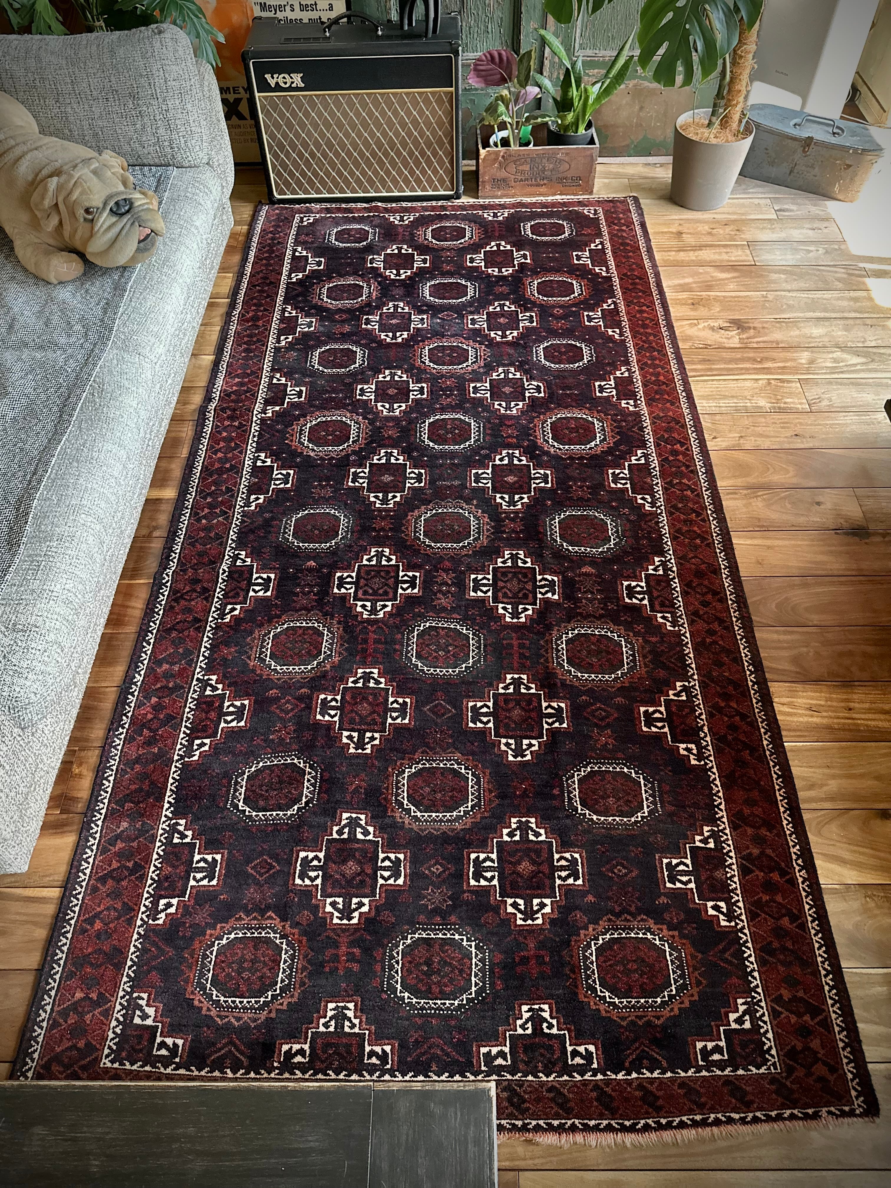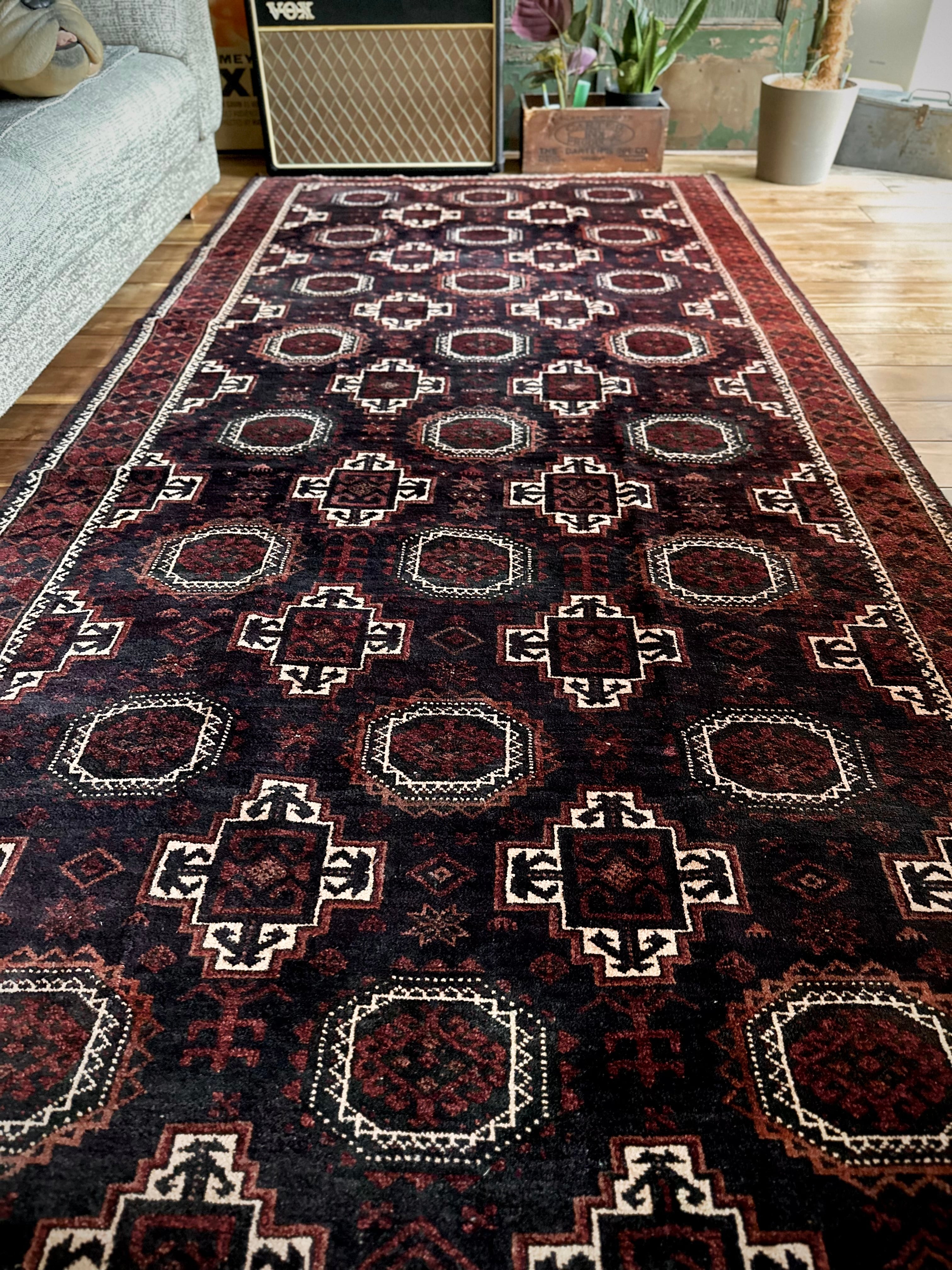 2種類の紋様を組み合わせて均整の取れた構図が部族絨毯らしくて、バルーチお得意の八芒星が幸運を司る素晴らしい出来栄えと言えるでしょうか。大きさとしては通常よりも長さがあり3人掛けソファ前でも充分なサイズ感で、パイル自体は程よい長さのサラッとした肌触りになります。