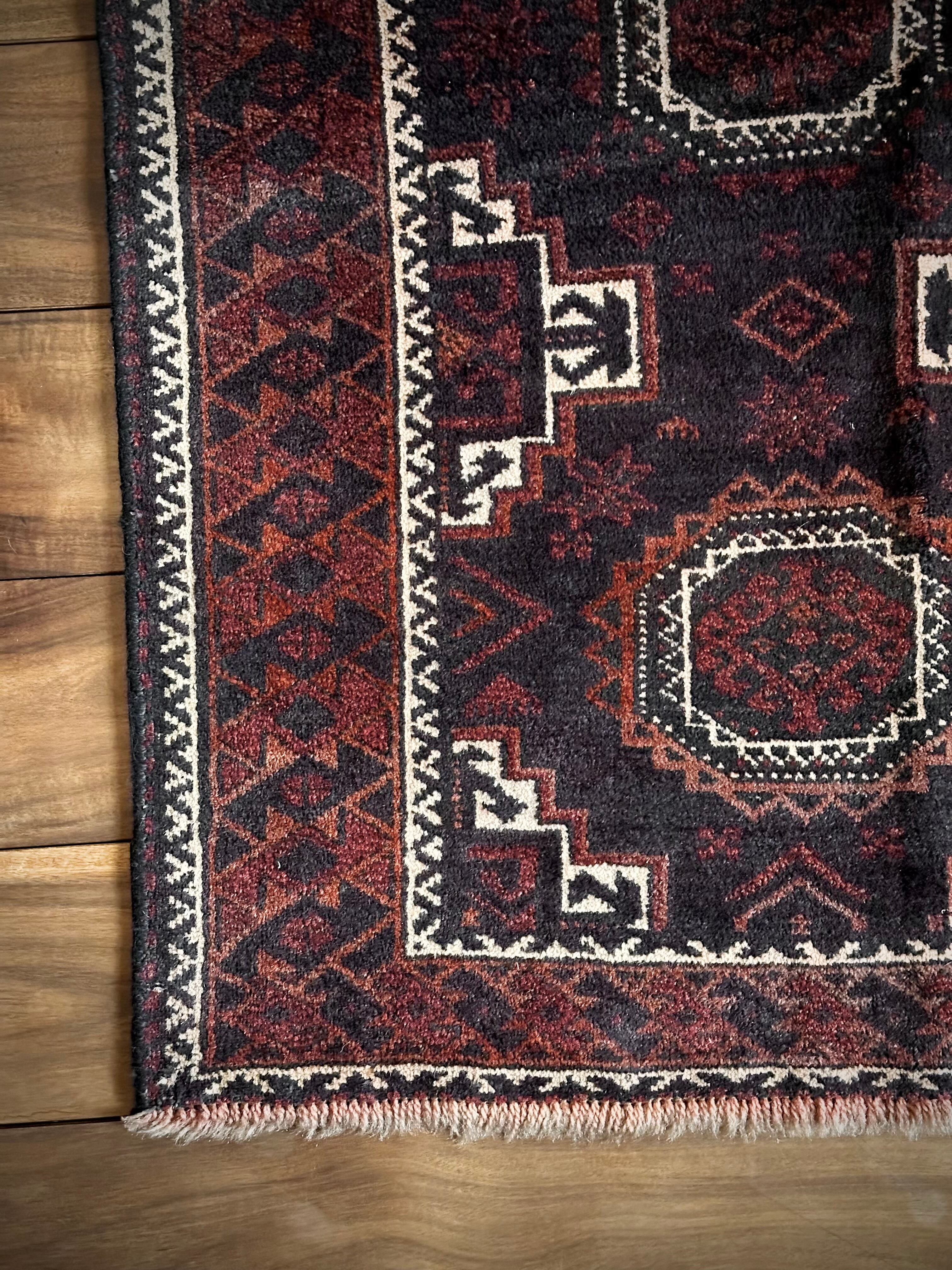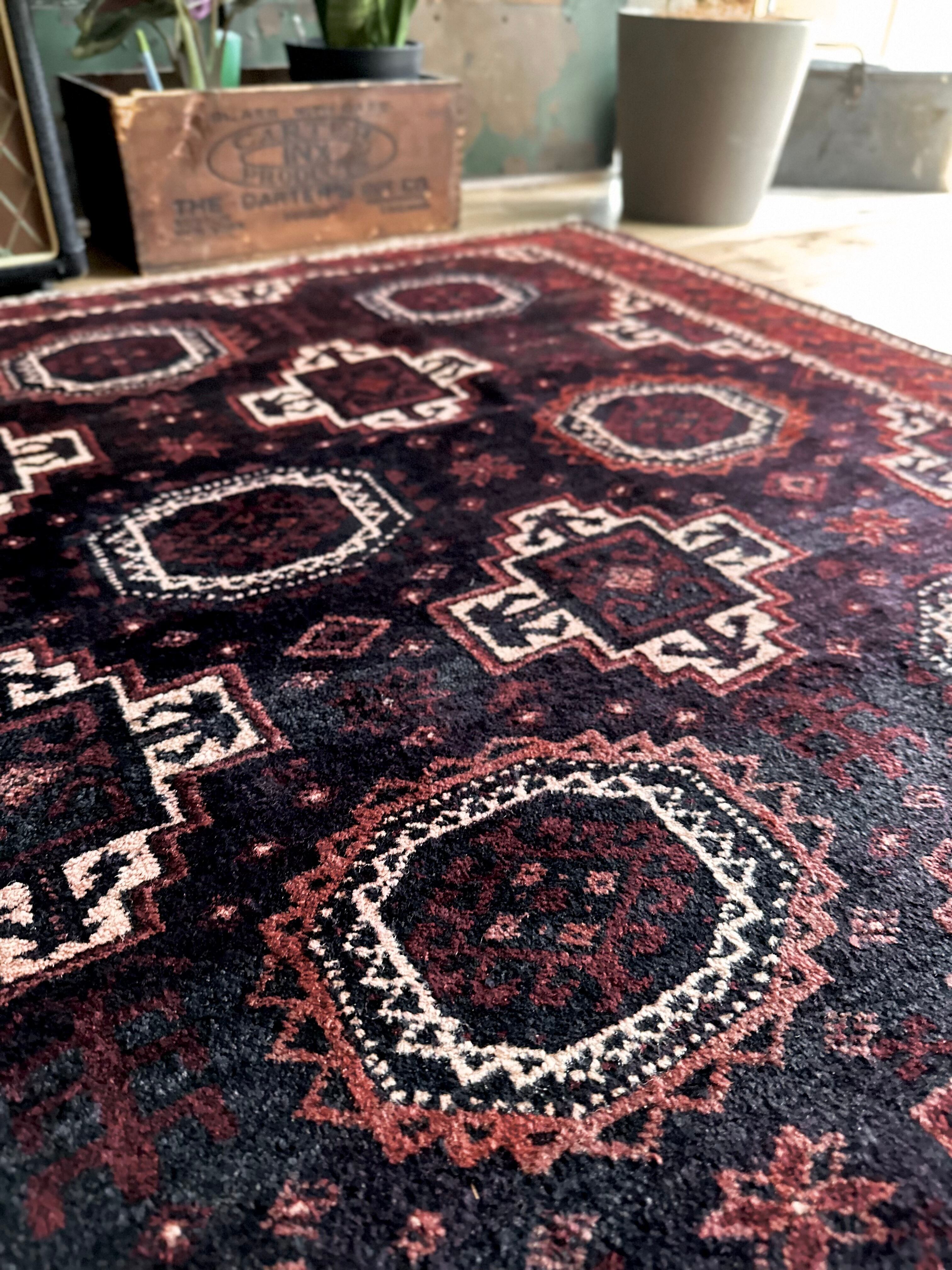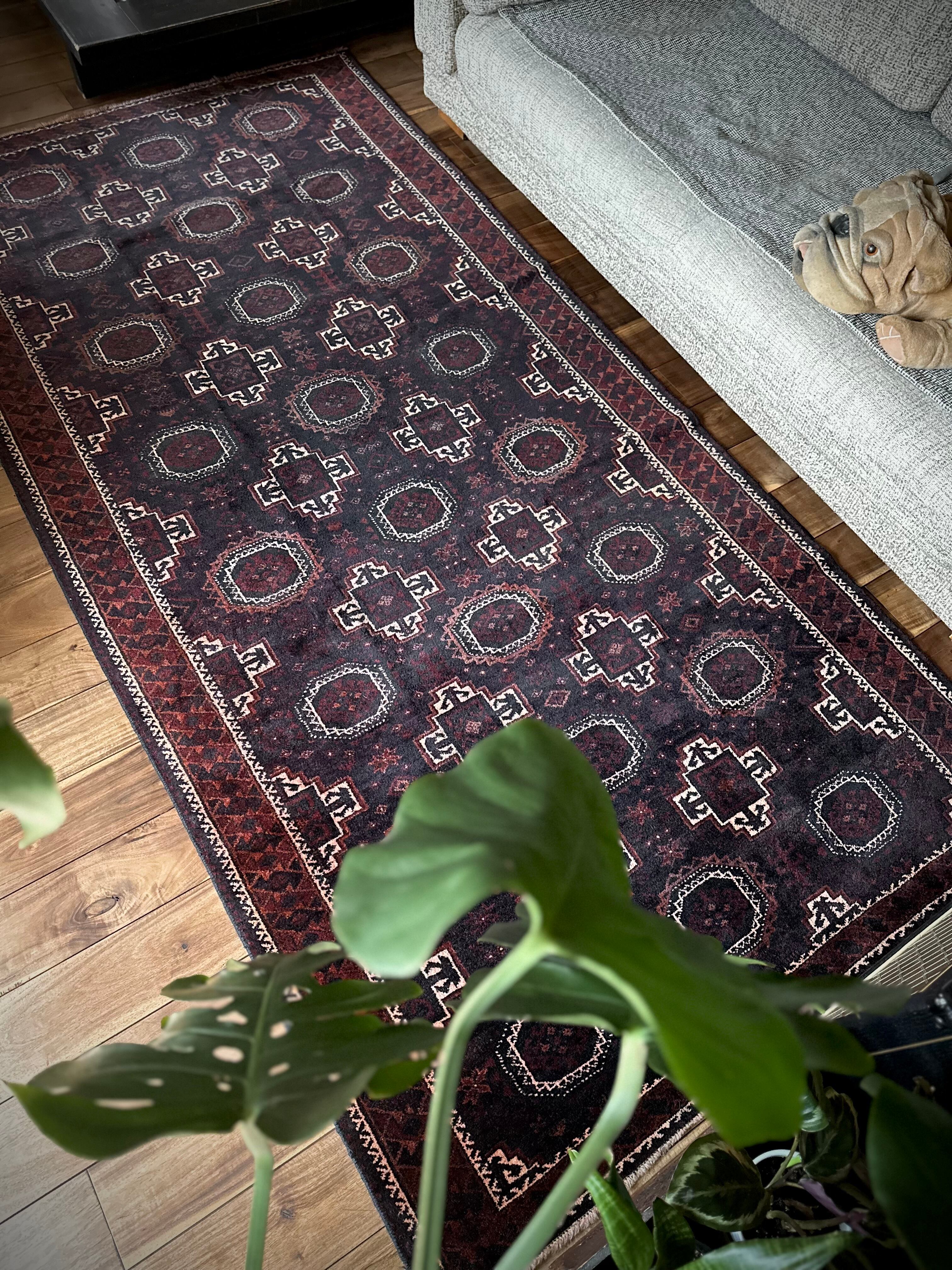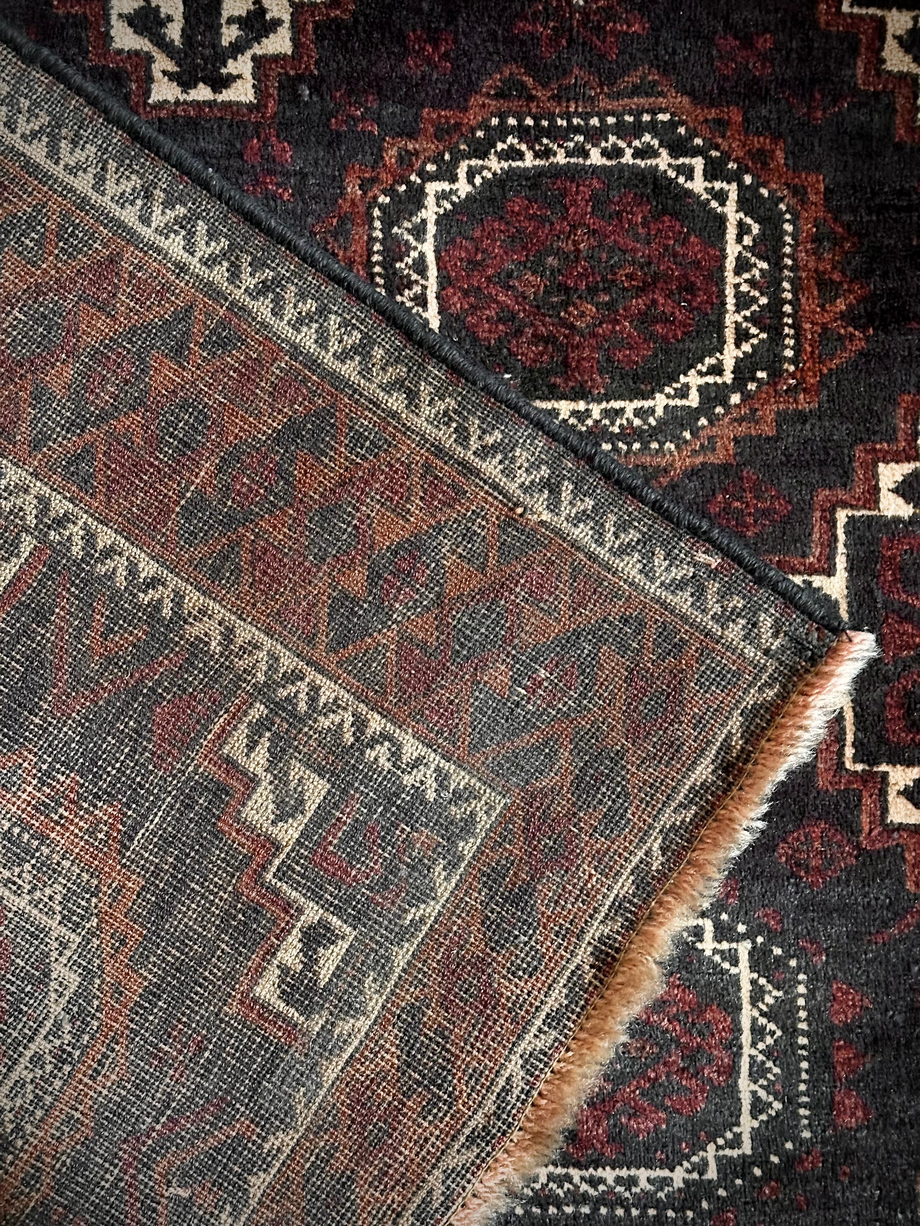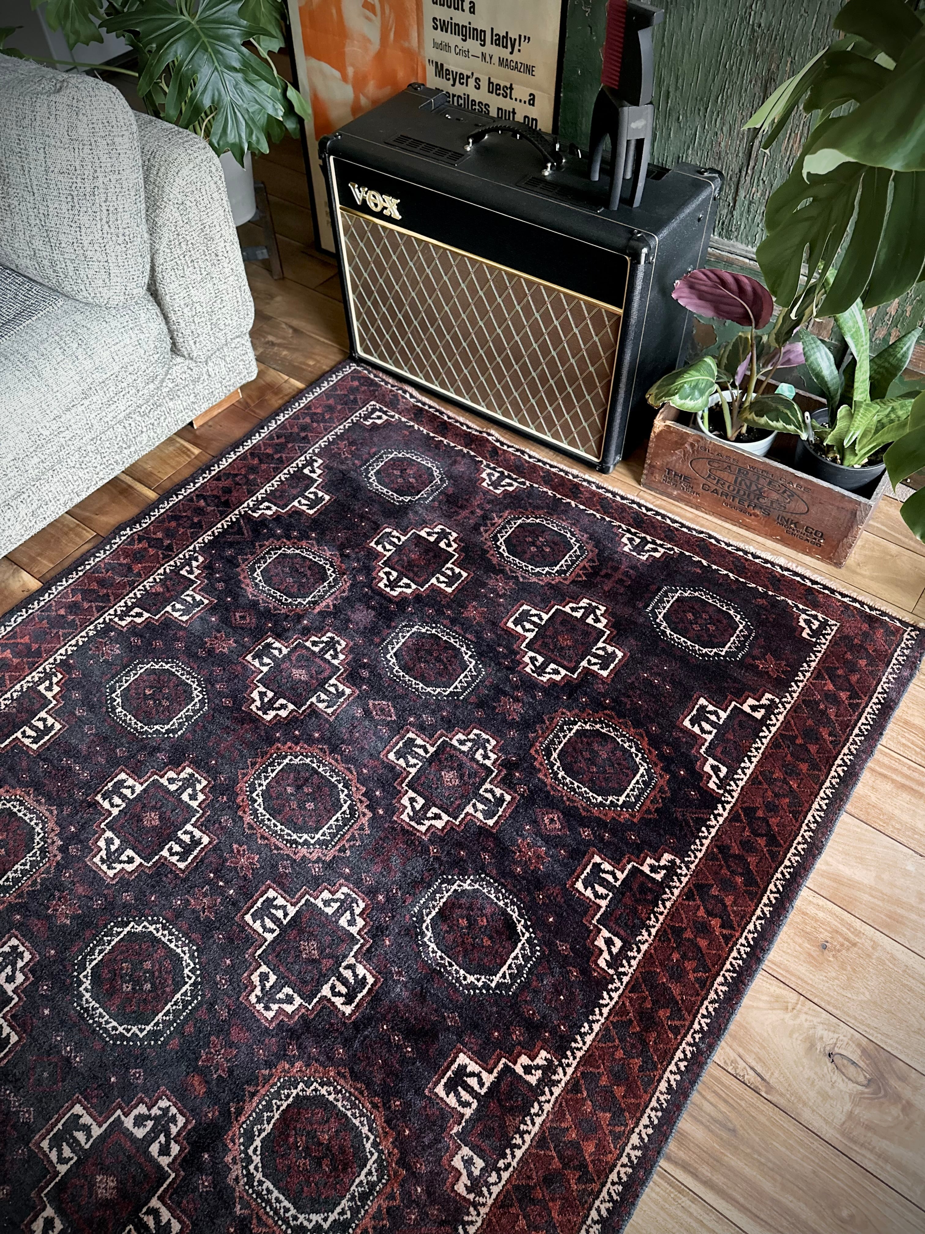 2種類の紋様を組み合わせて均整の取れた構図が部族絨毯らしくて、バルーチお得意の八芒星が幸運を司る素晴らしい出来栄えと言えるでしょうか。大きさとしては通常よりも長さがあり3人掛けソファ前でも充分なサイズ感で、パイル自体は程よい長さのサラッとした肌触りになります。