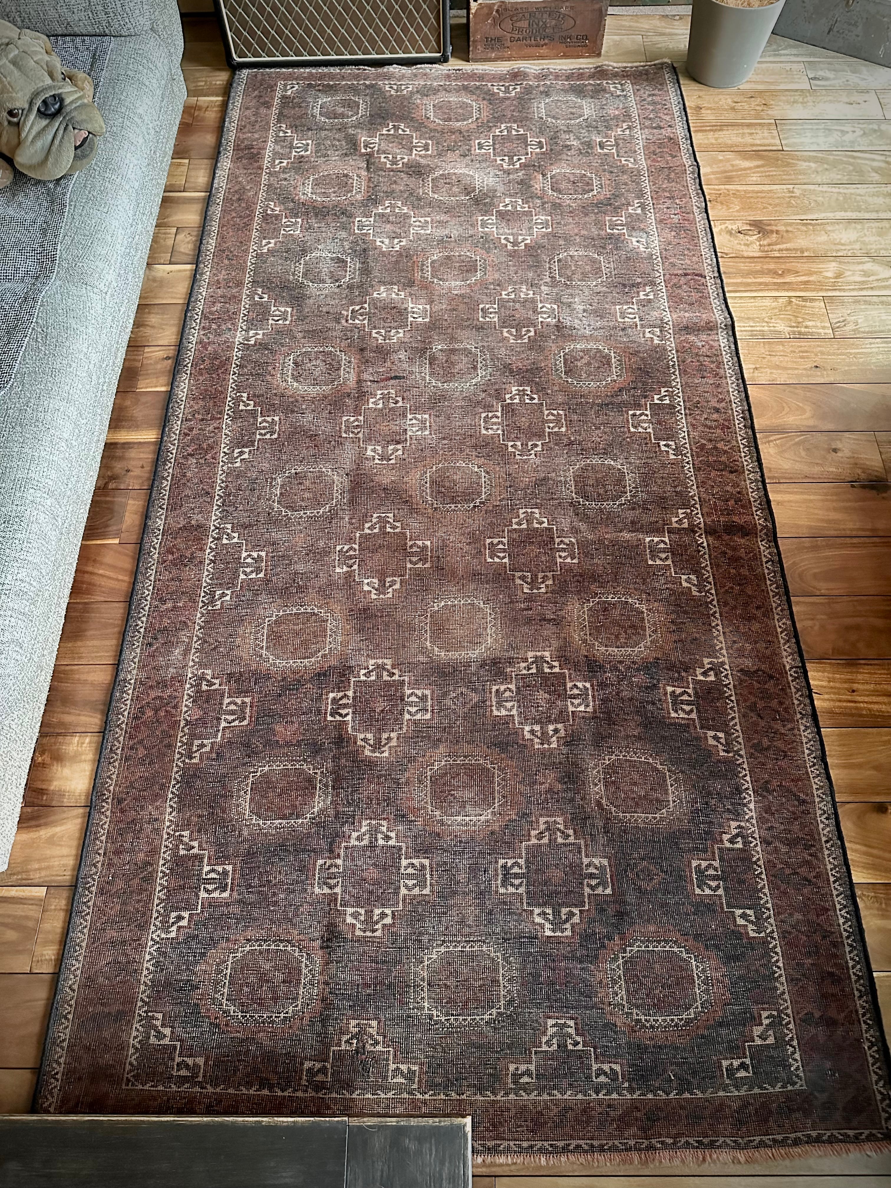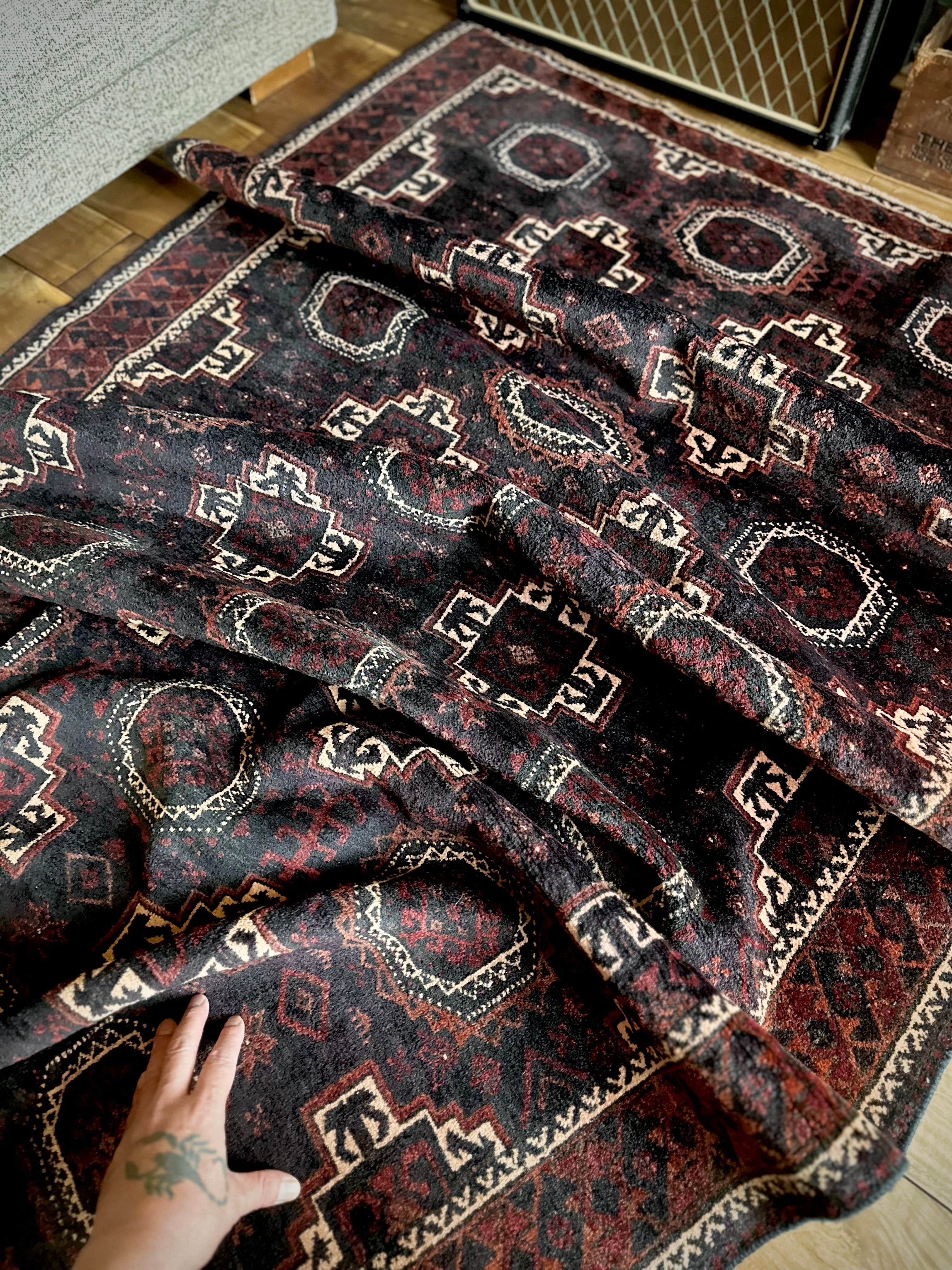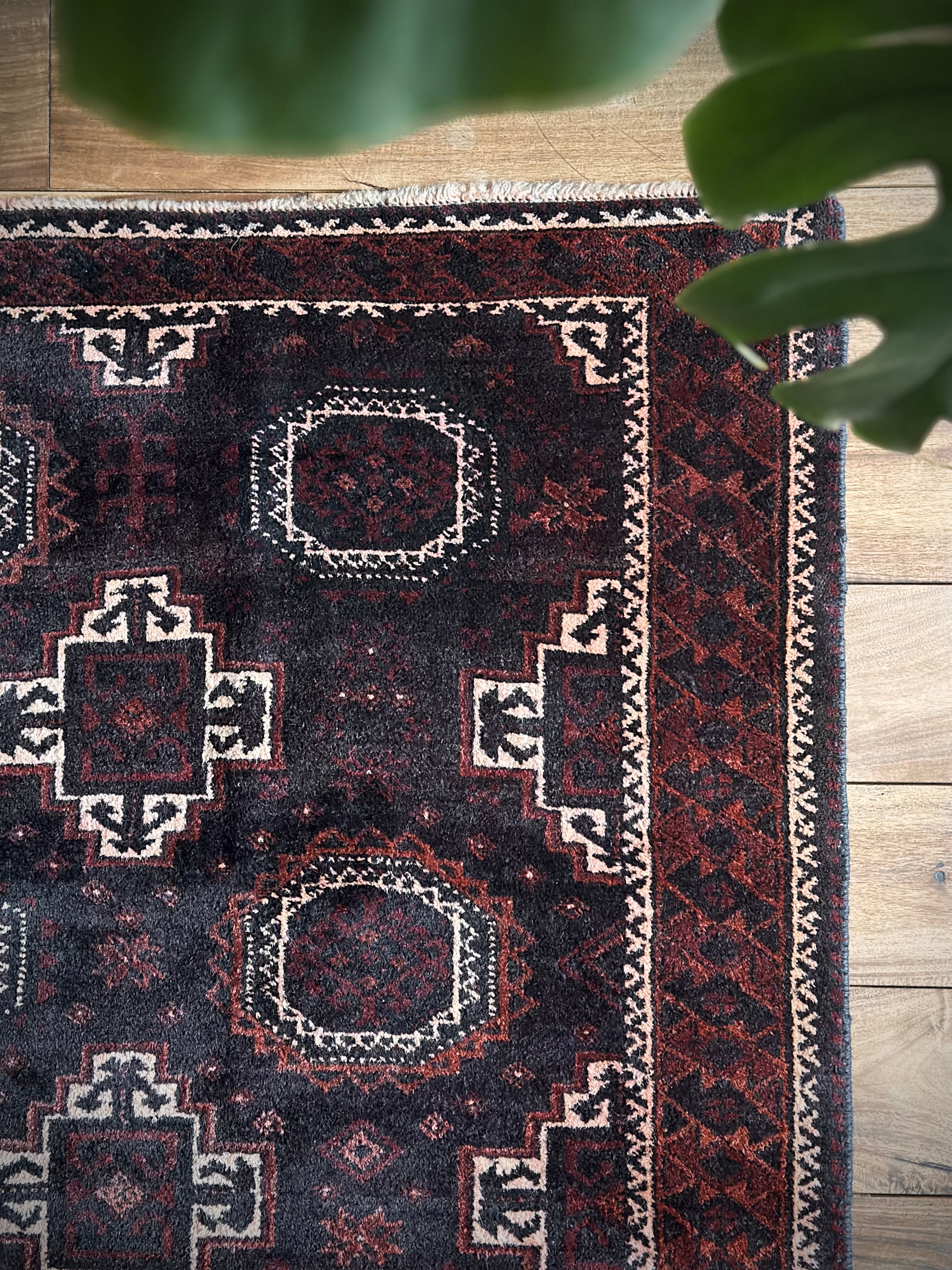ブラックのフィールドにブラウンの連続紋様が落ち着いた雰囲気で、それを中和するキャメルの部分が写真では白く写ってしまうのが難点なこちらは、イラン南東部のシスターン・バローチ州に居住するバルーチ族のトライバルラグで、特徴的なギュルに色使いなどからザボール産かと思われる、実物の色合いの方が何倍もかっこいい写真泣かせな1枚になります。