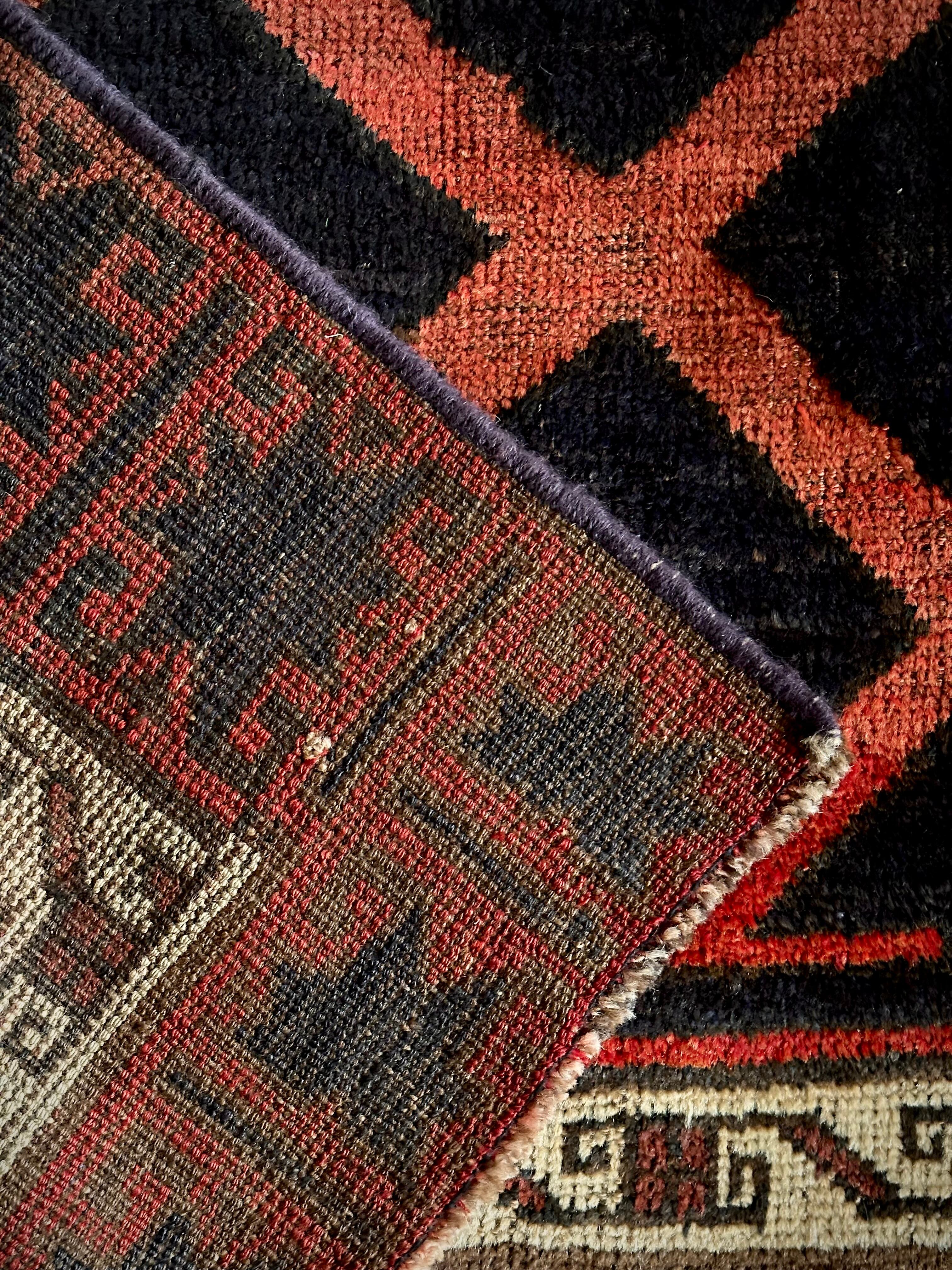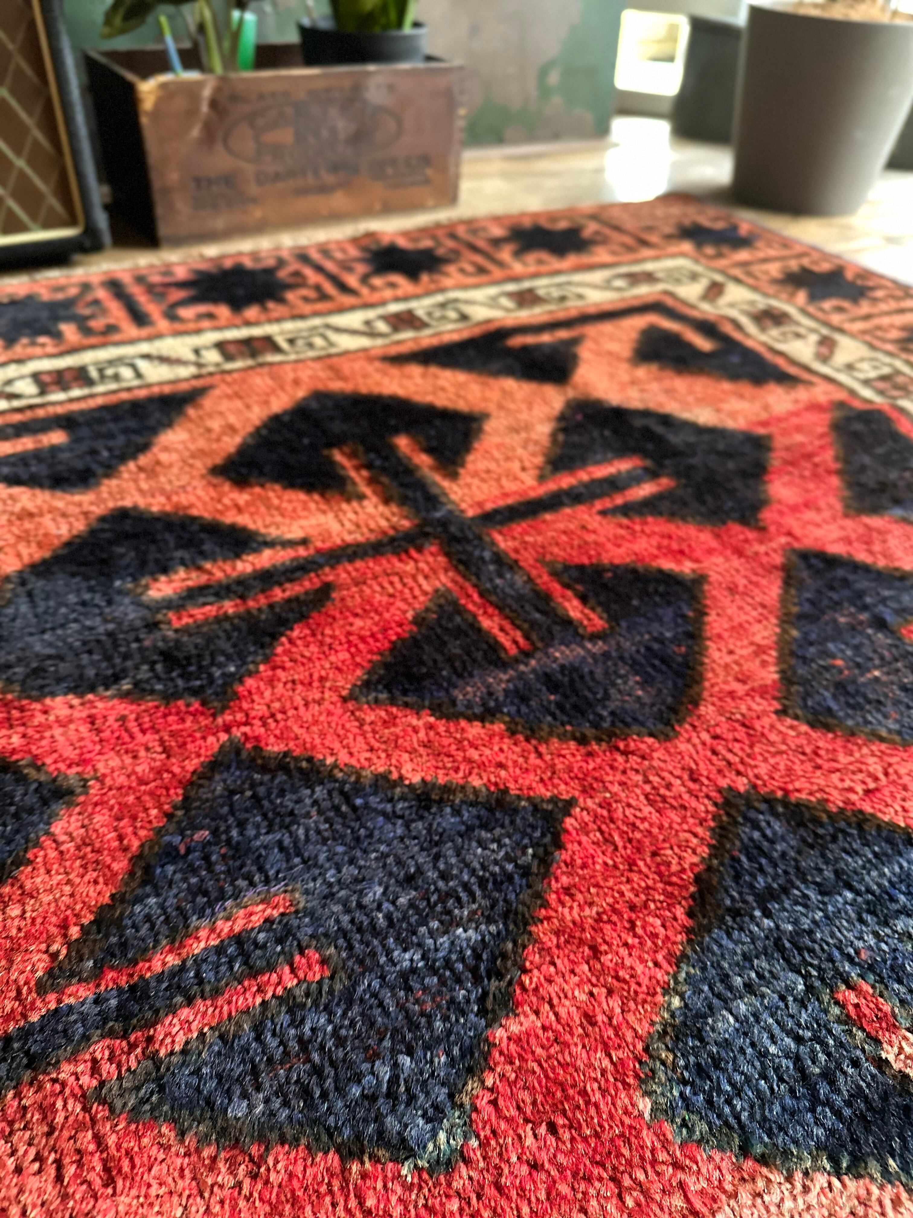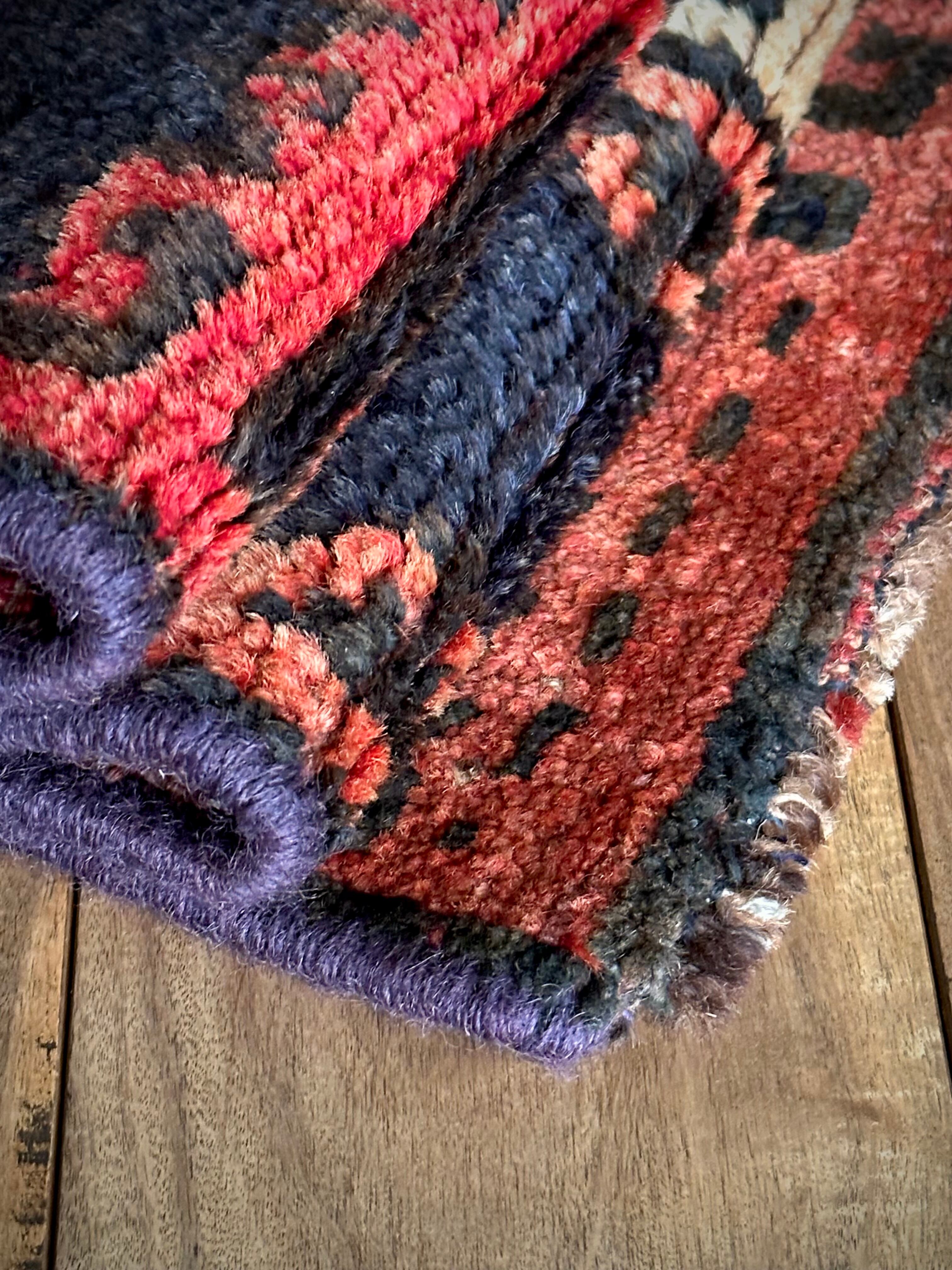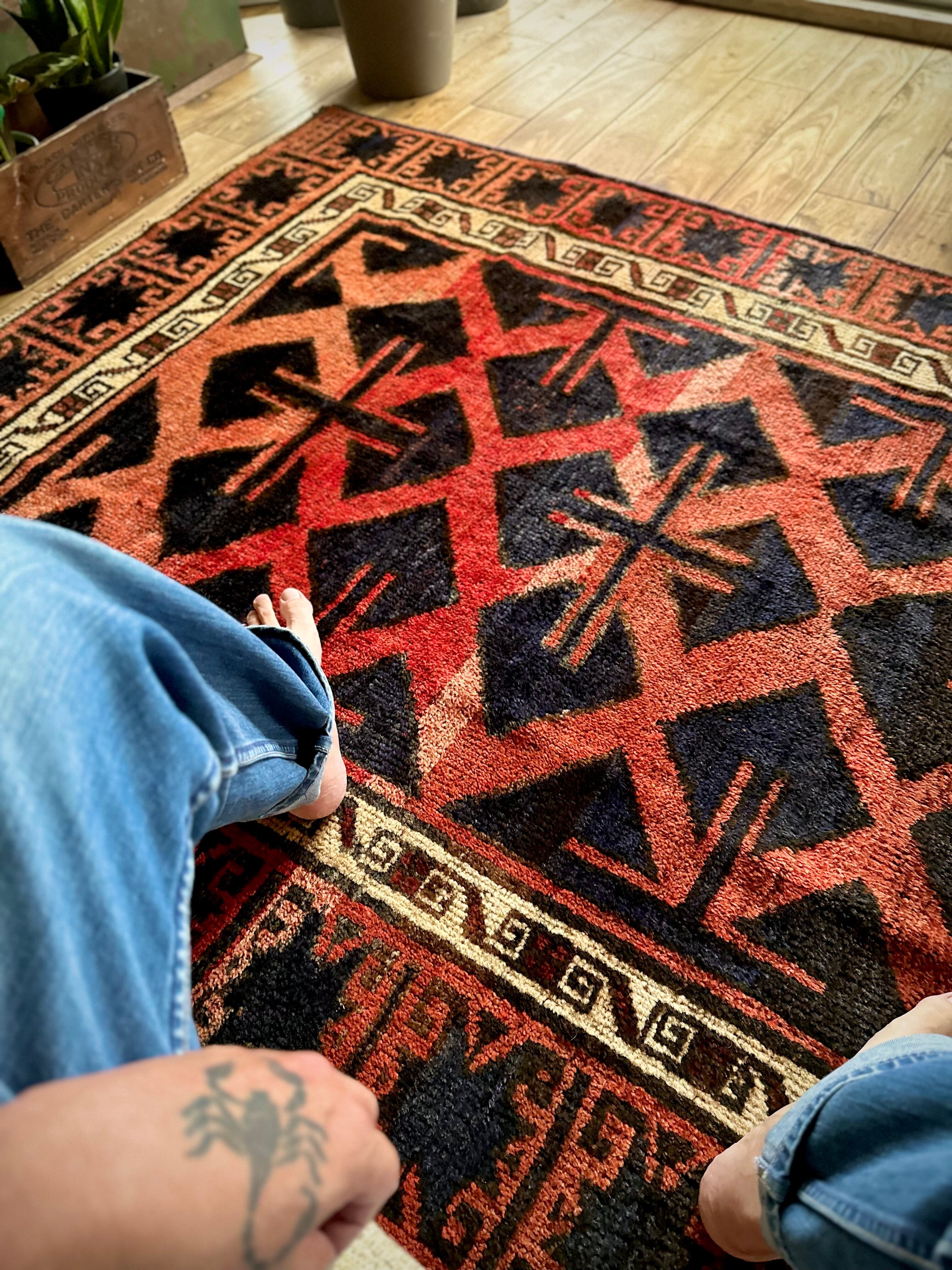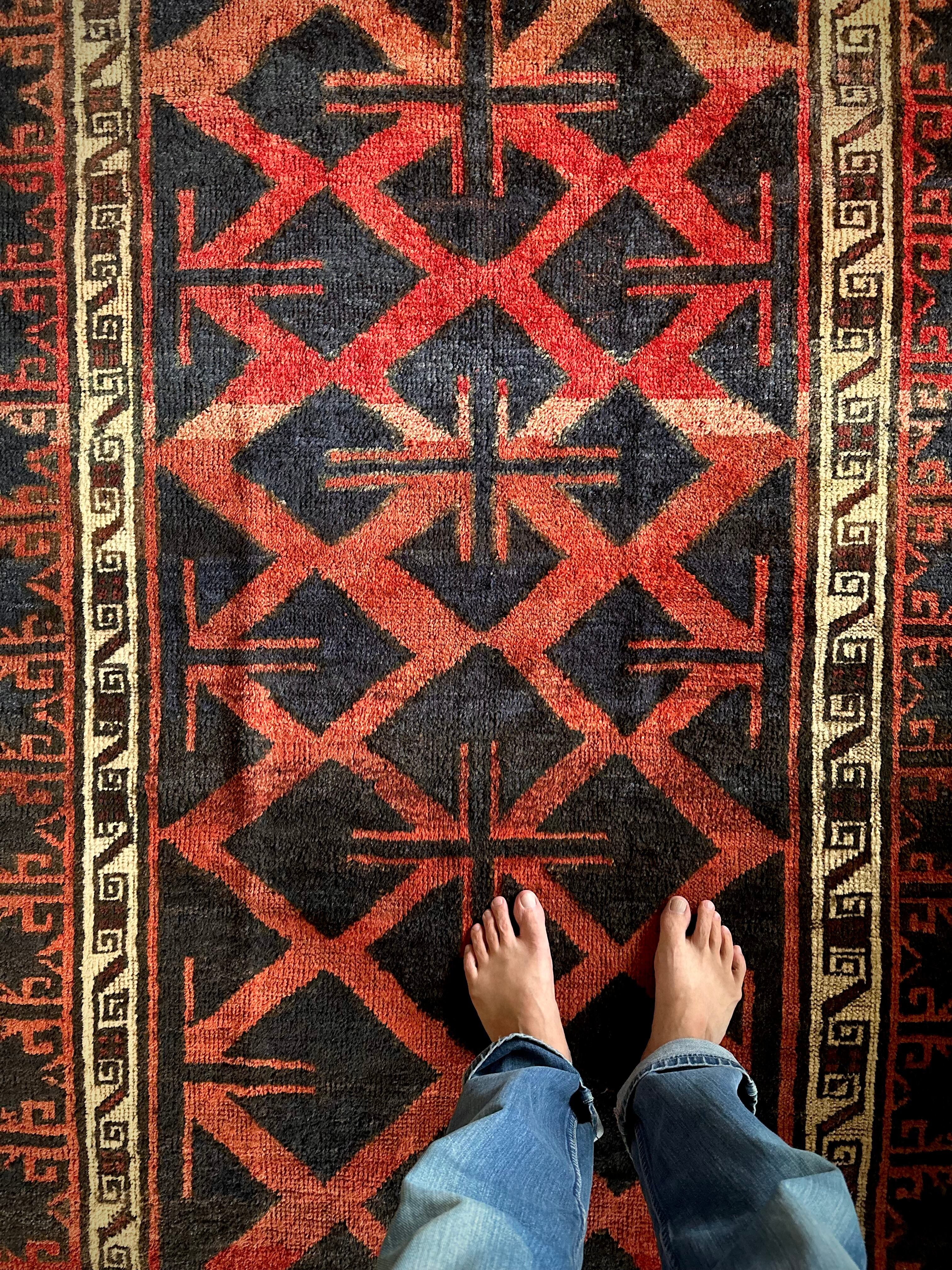 なんとも素晴らしいアブラッシュ※まだらな斑点が目を引くこちらは、イラン南西部の山岳地帯にて最古の遊牧民として知られるロリ族※ロルやルリとも呼ぶのトライバルラグで、赤というよりも朱色から茜色のグラデーションに力強いブラックの模様がモダンデザインにも見えてしまう、個人的にもイチオシなプリミティブアートな1枚になります。