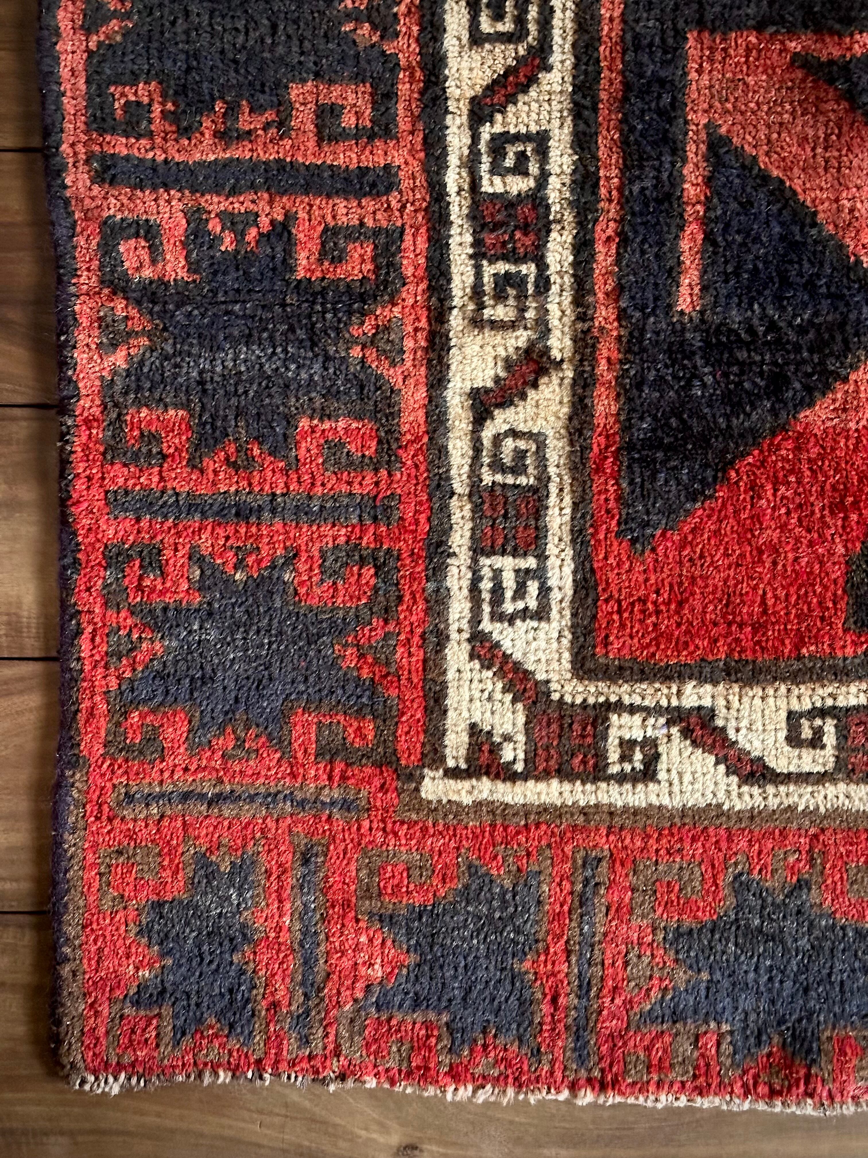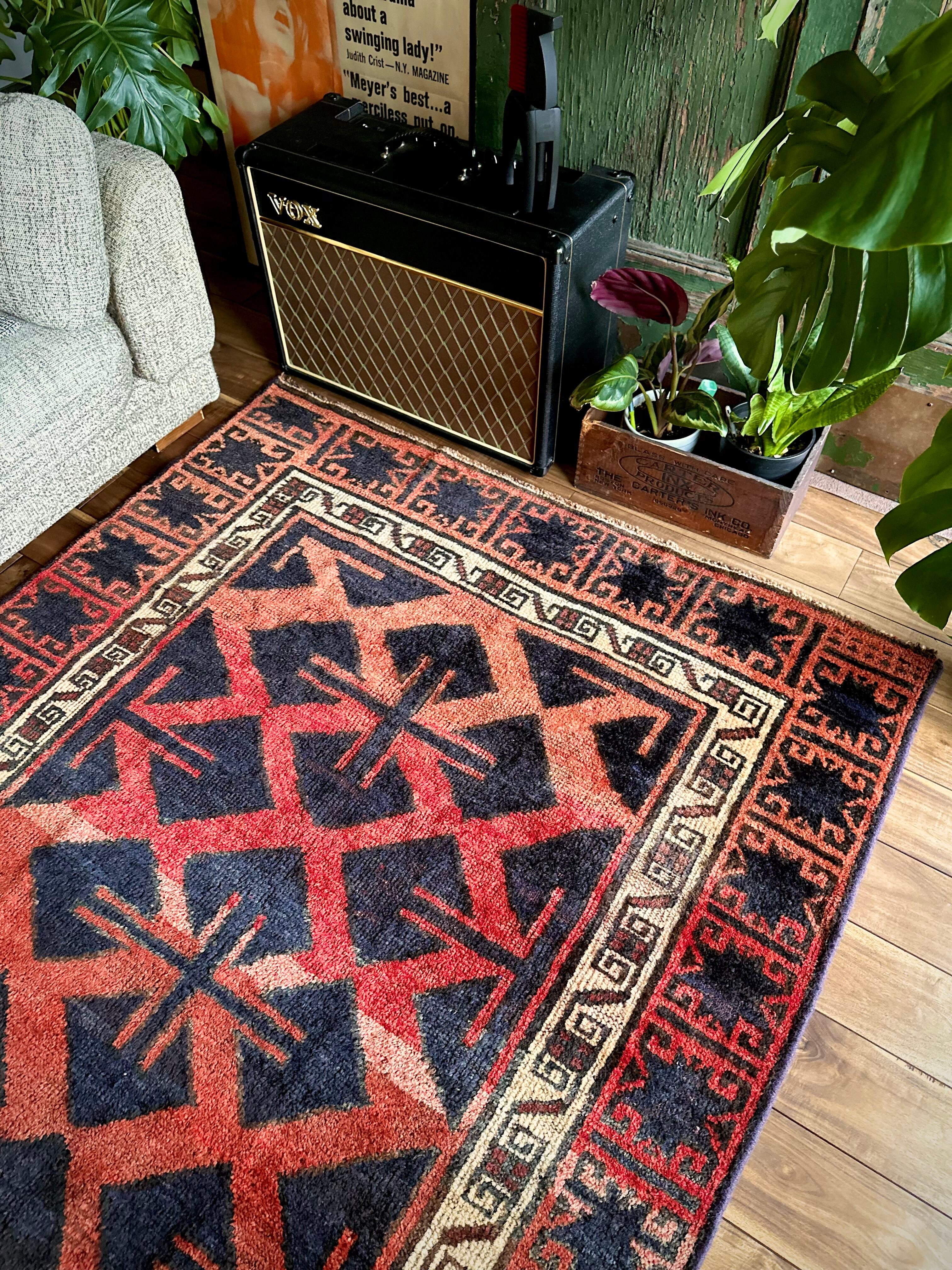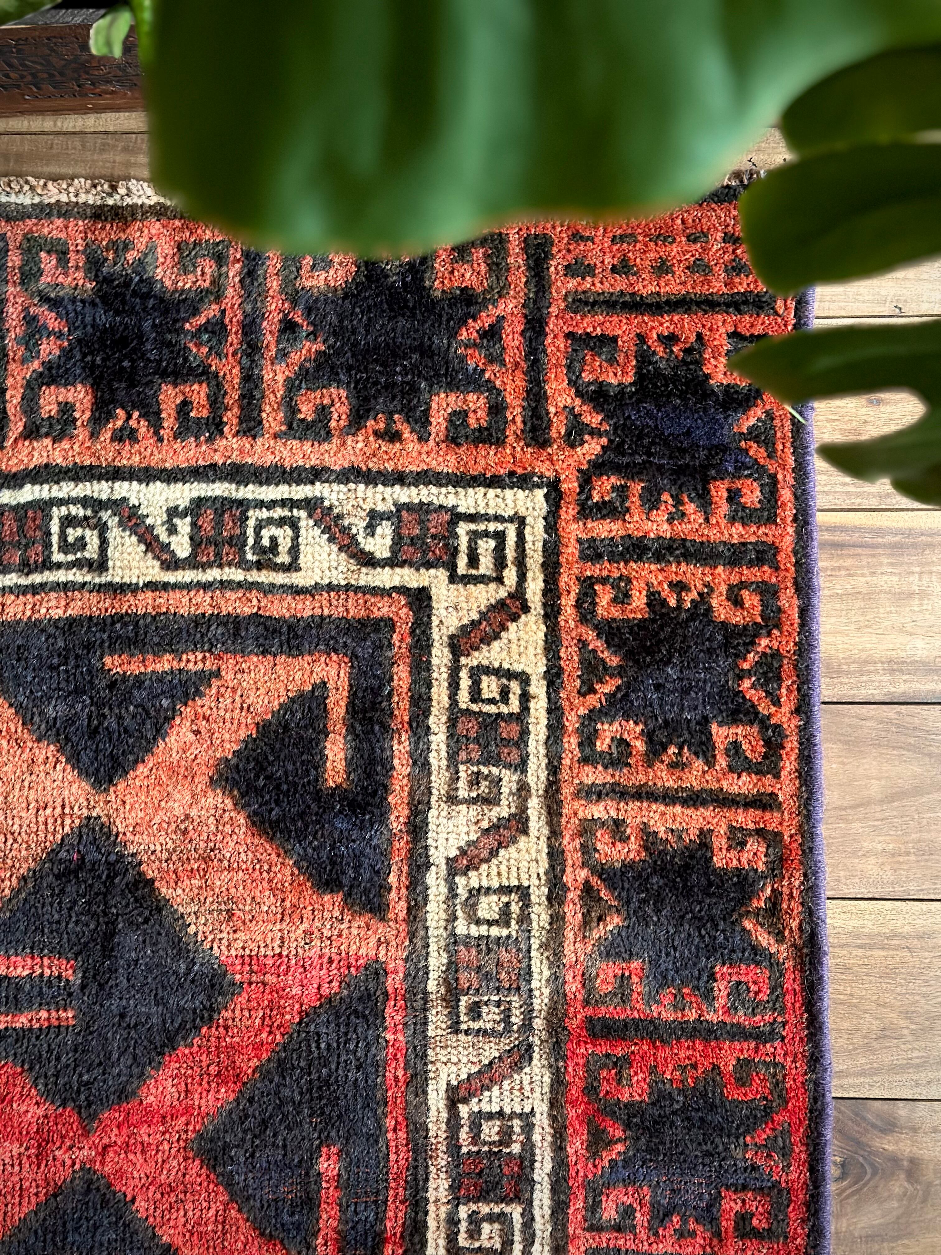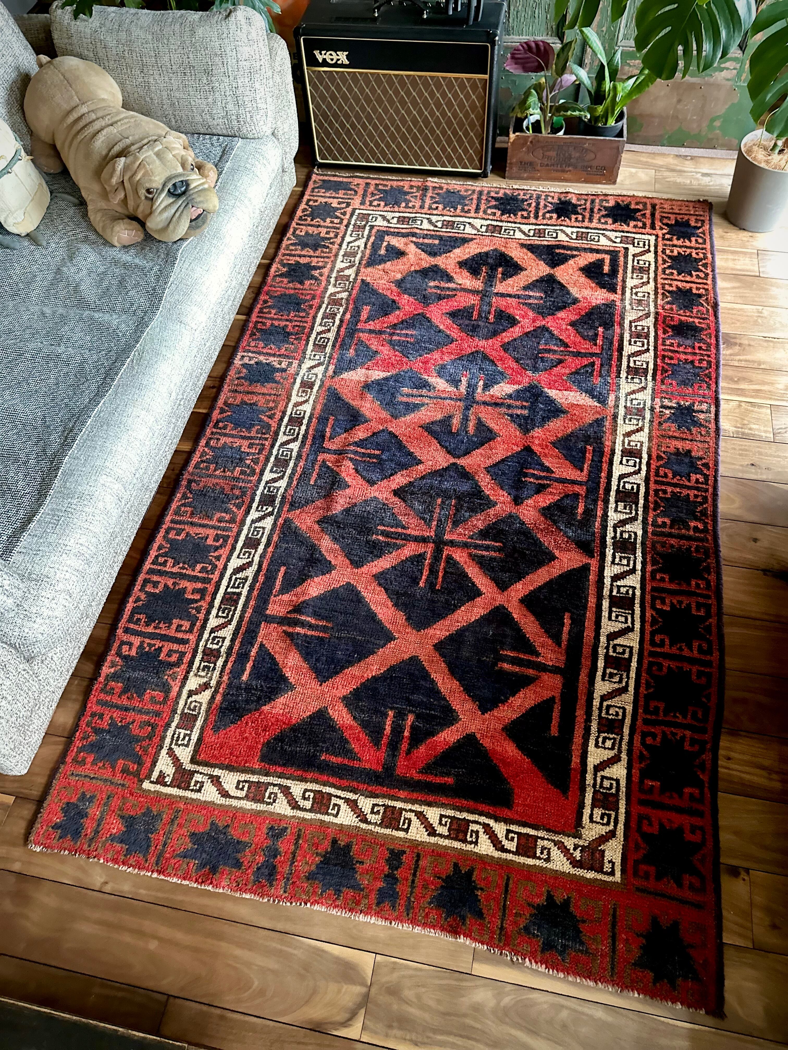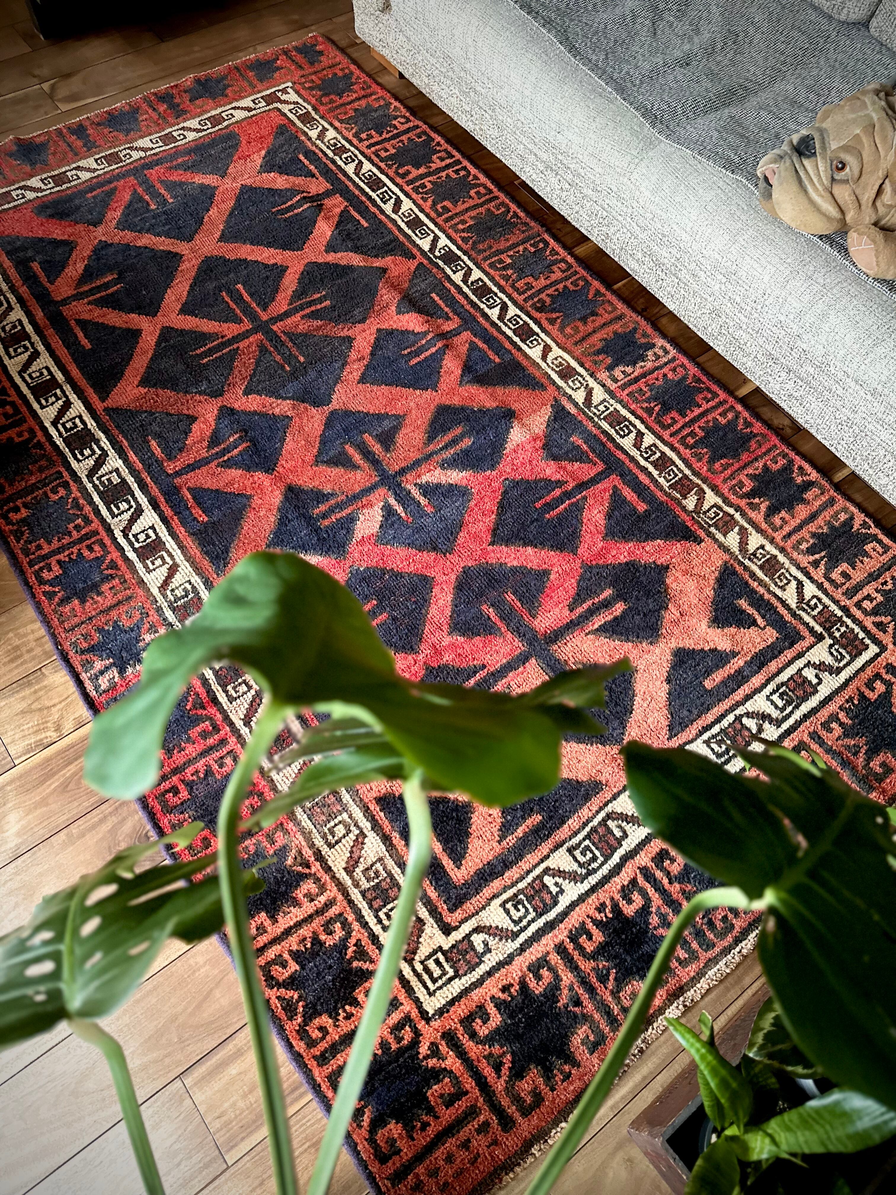 なんとも素晴らしいアブラッシュ※まだらな斑点が目を引くこちらは、イラン南西部の山岳地帯にて最古の遊牧民として知られるロリ族※ロルやルリとも呼ぶのトライバルラグで、赤というよりも朱色から茜色のグラデーションに力強いブラックの模様がモダンデザインにも見えてしまう、個人的にもイチオシなプリミティブアートな1枚になります。