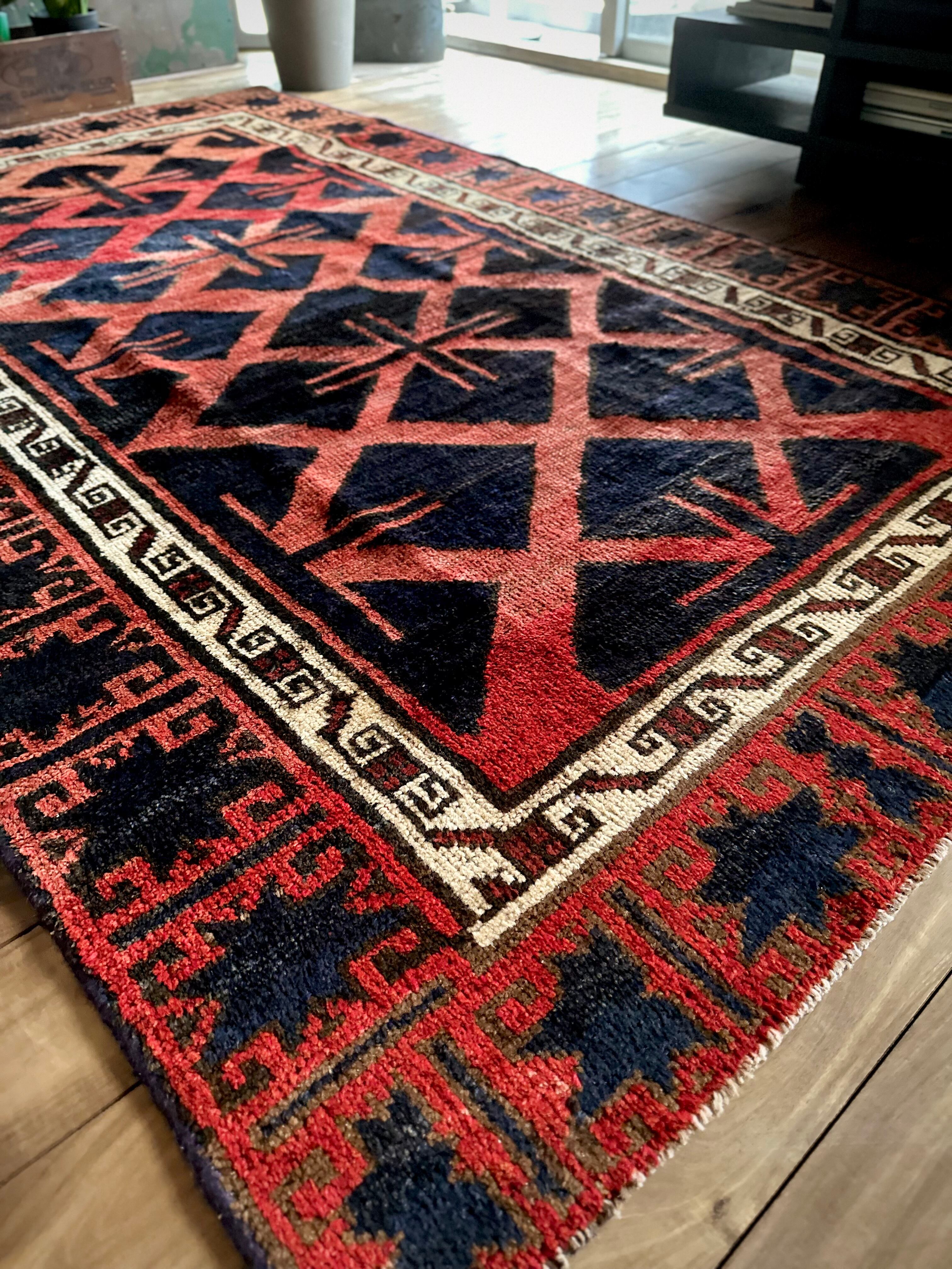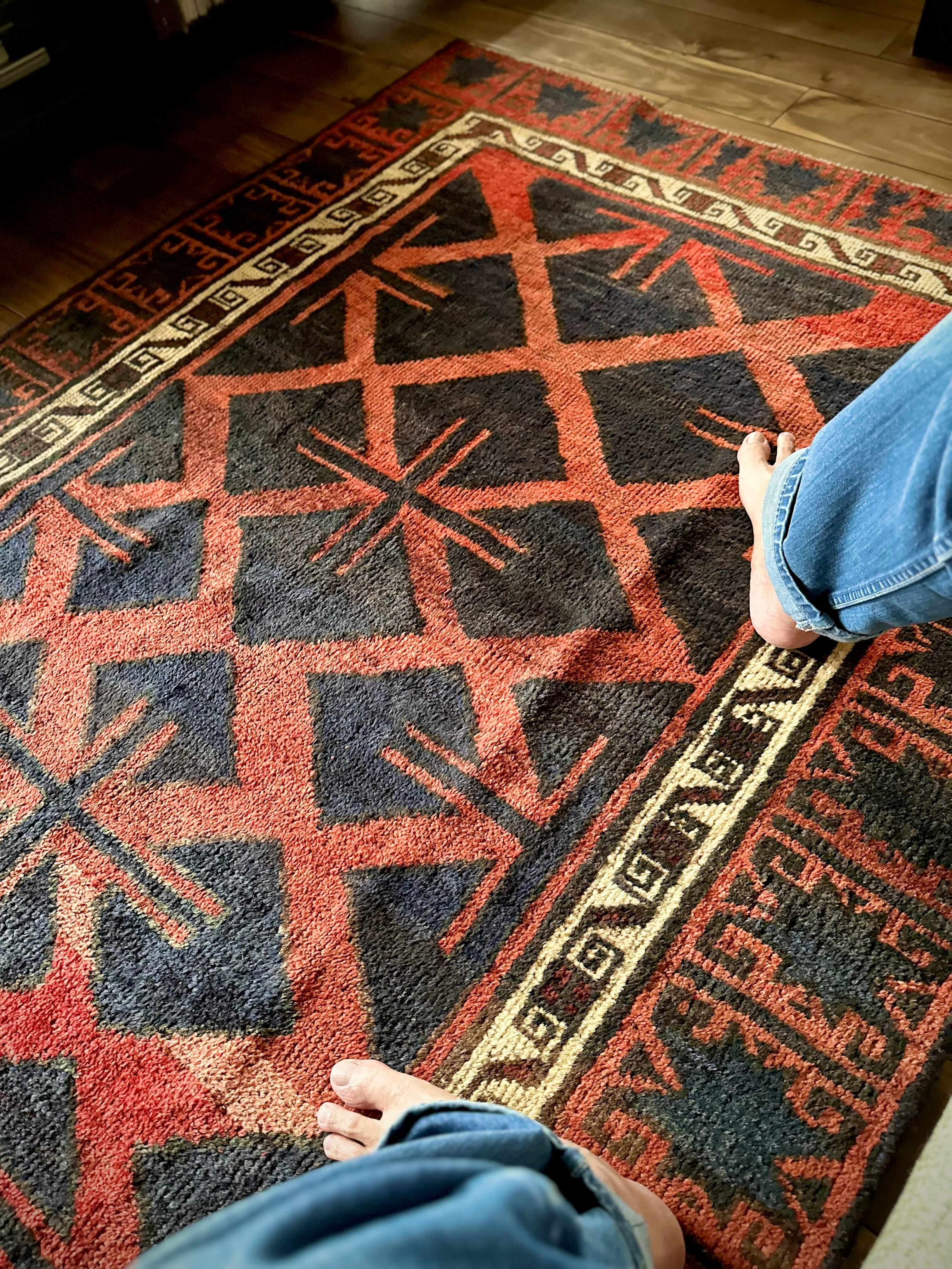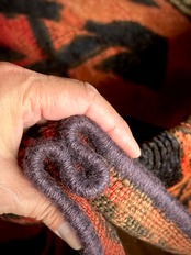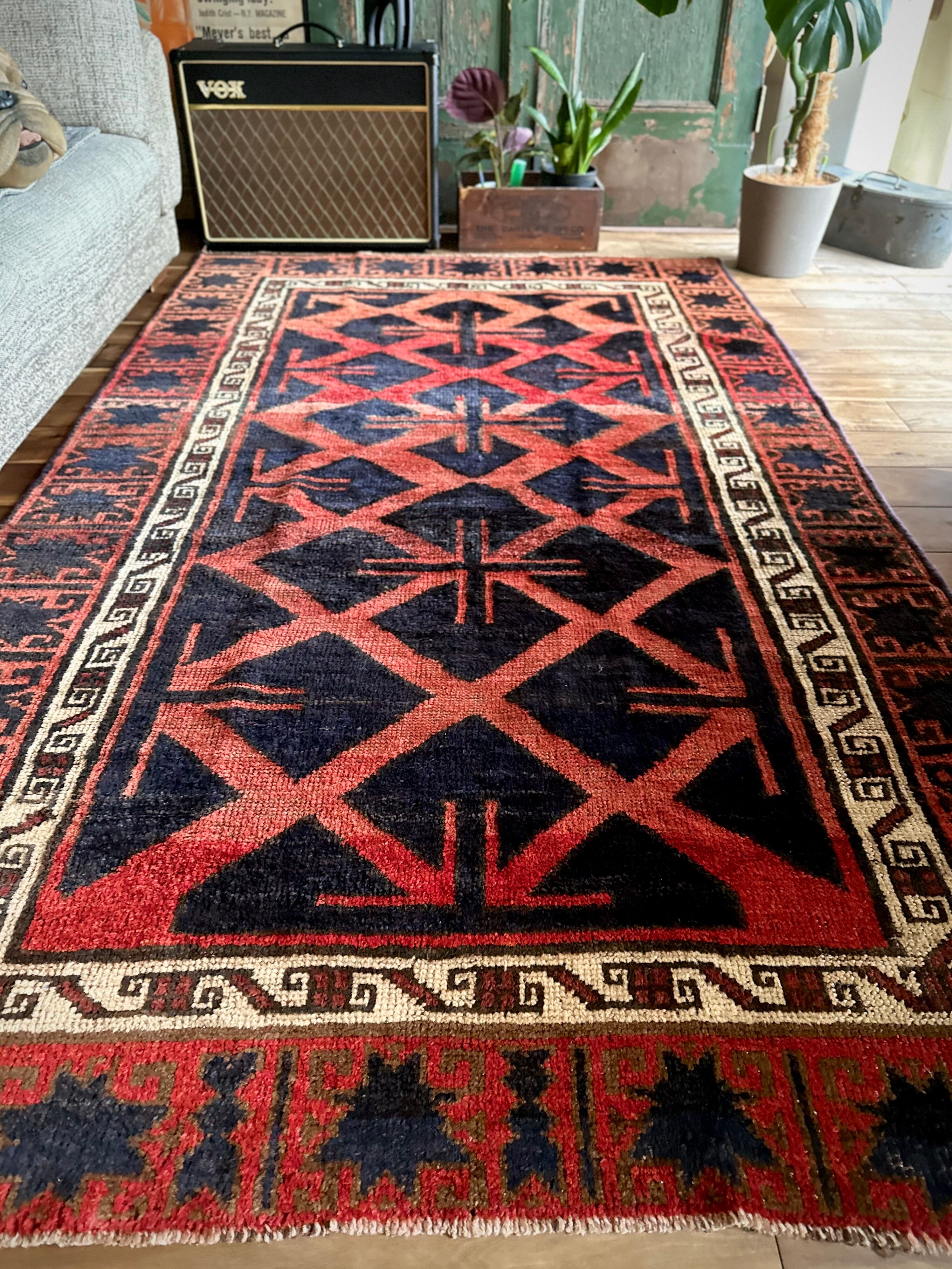 最後にラグそのものに関しては羊毛特有の匂いがあり、採寸は中央付近で計測していますが、手織りならではの歪みによる誤差や水洗いクリーニングによる縮み、また草木染めによる経年劣化の色ムラなどがありますが、それもまたヴィンテージラグの魅力かとご理解ください。