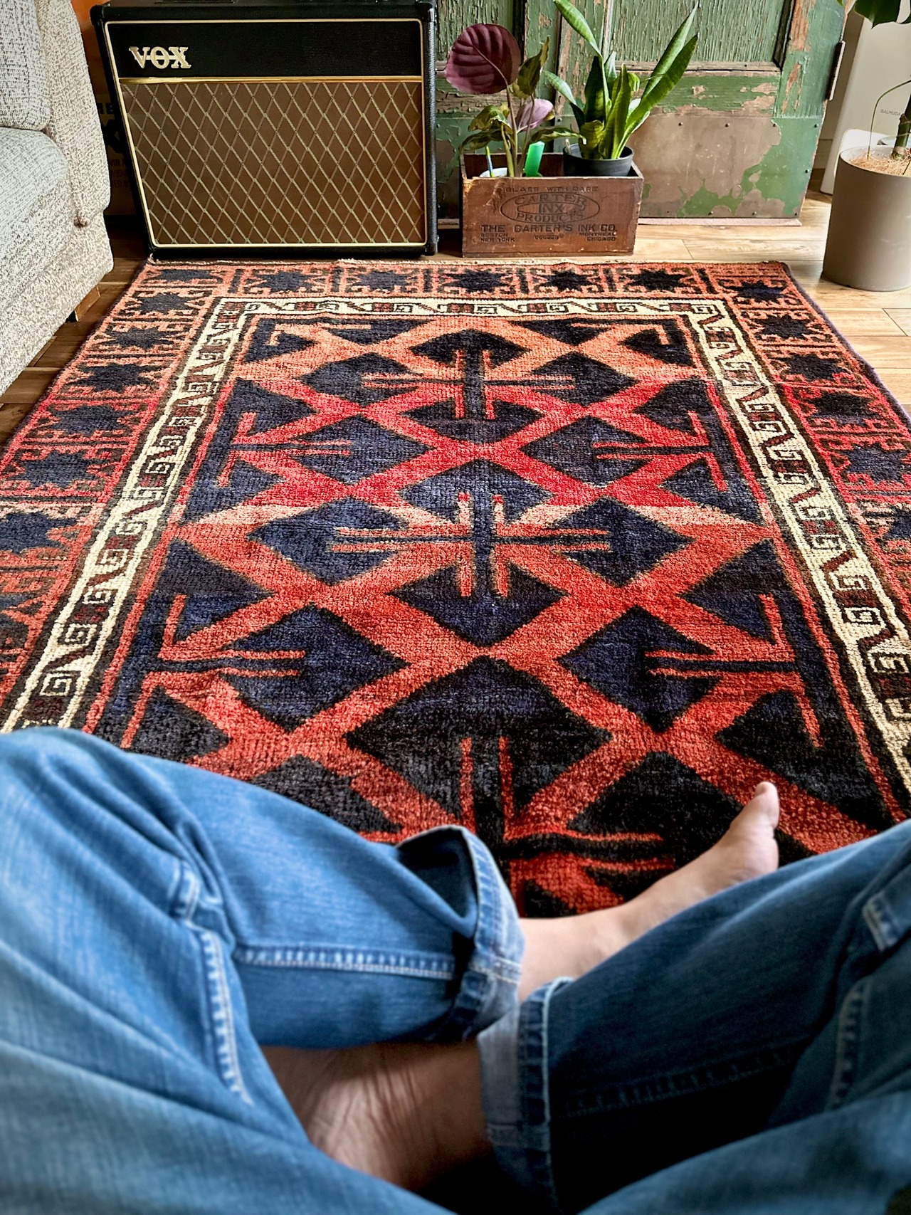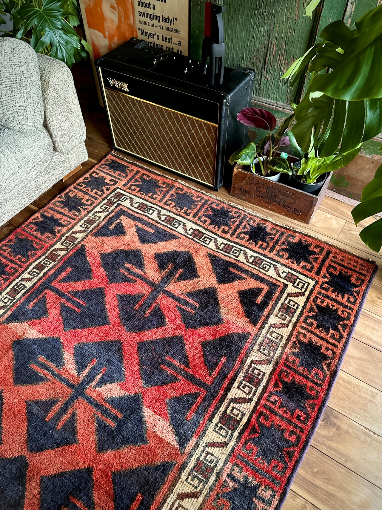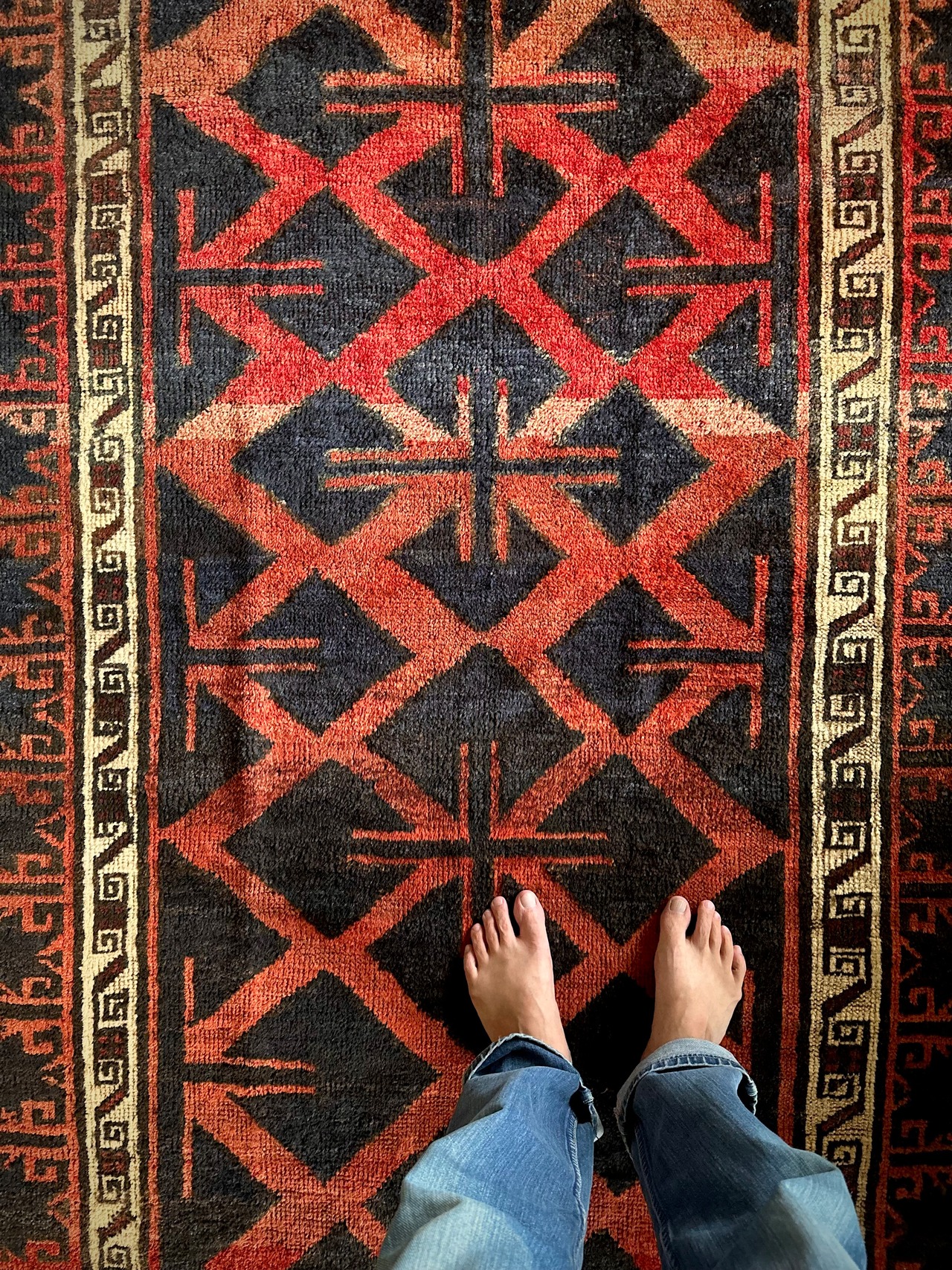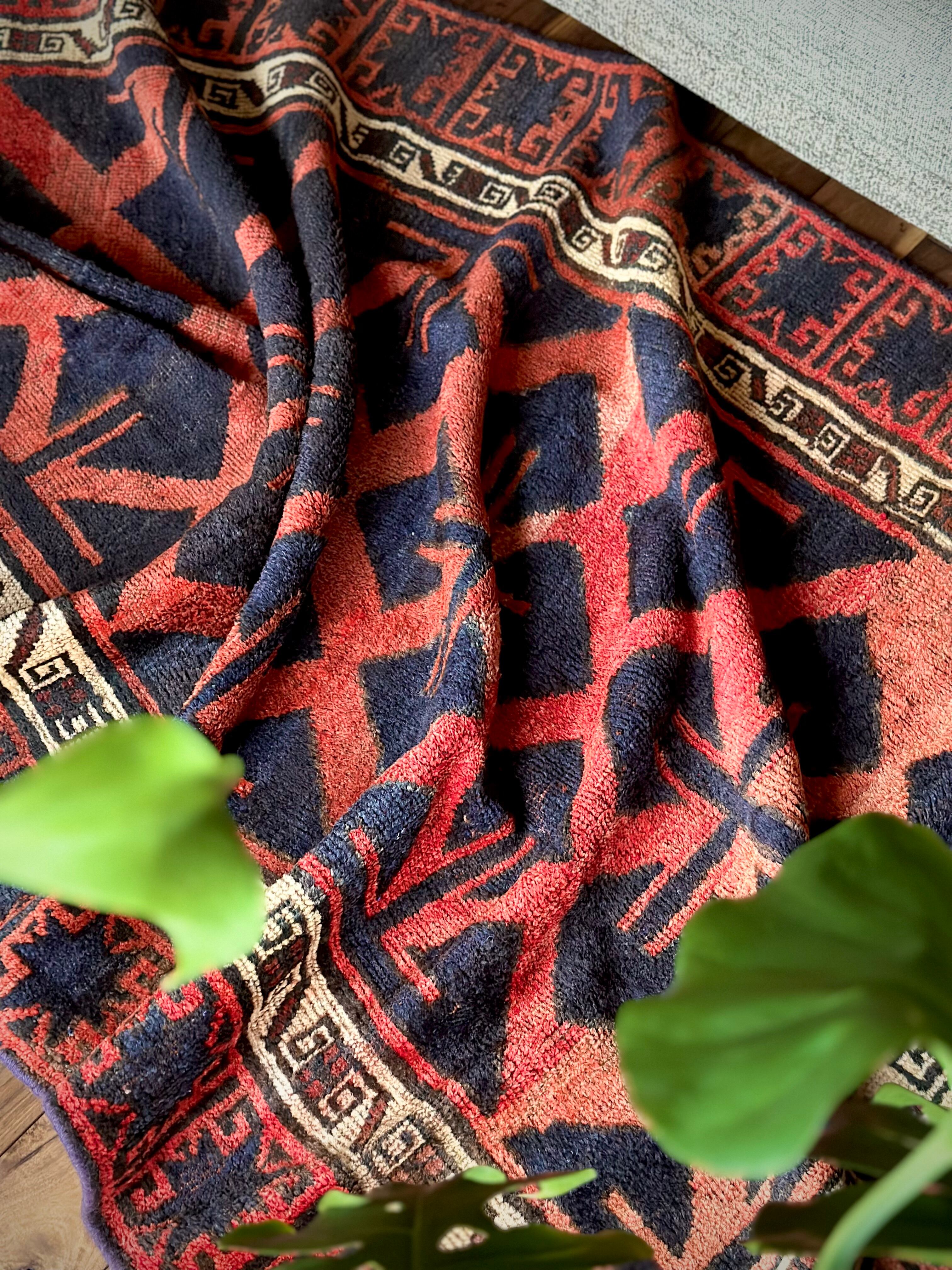 最後にラグそのものに関しては羊毛特有の匂いがあり、採寸は中央付近で計測していますが、手織りならではの歪みによる誤差や水洗いクリーニングによる縮み、また草木染めによる経年劣化の色ムラなどがありますが、それもまたヴィンテージラグの魅力かとご理解ください。