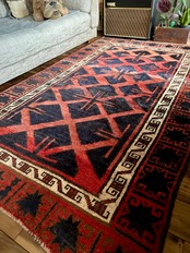 経年としてはかなり古い50年のヴィンテージラグとなり、特に目立つ汚れやダメージはないグッドなコンディションですが、ロリ族特有のざっくりとした織りにそれなりの使用感があり、恐らくシラーゼ部分は巻き直しされています。また大きさとして大判なリビングサイズが嬉しく、パイル自体は長めのフサフサとした柔らかくもガシッとした質感が気持ちいい1枚になります。