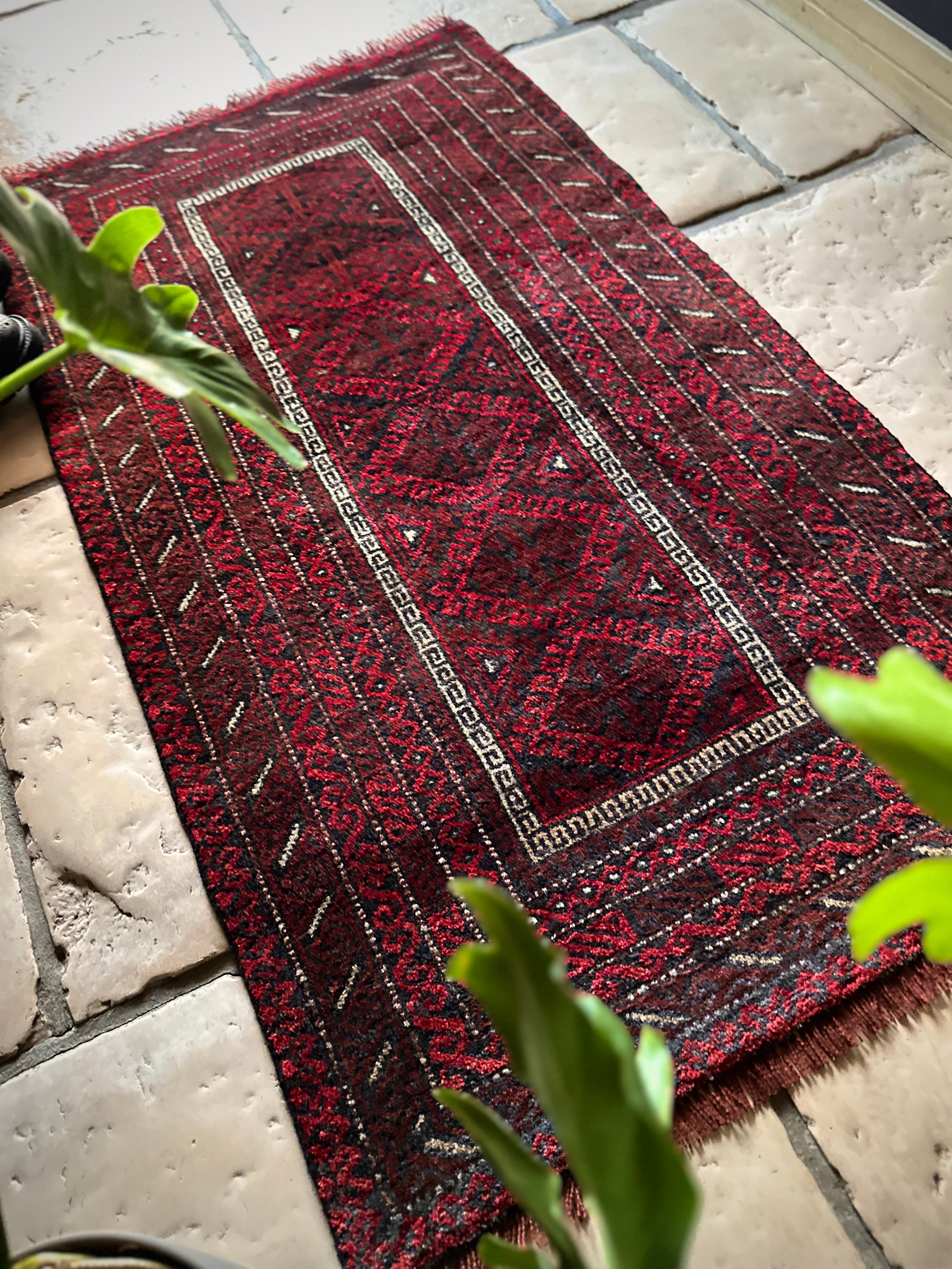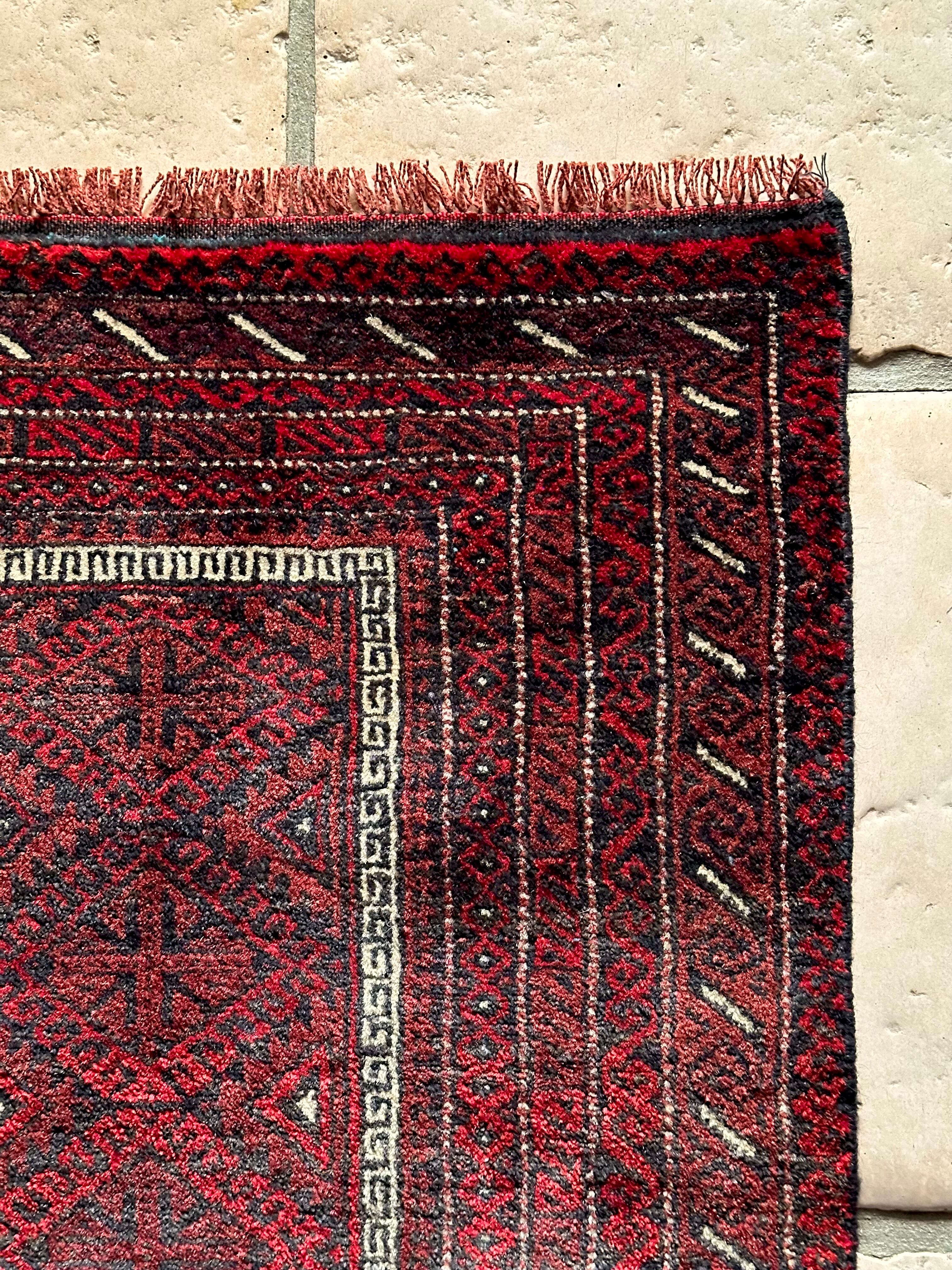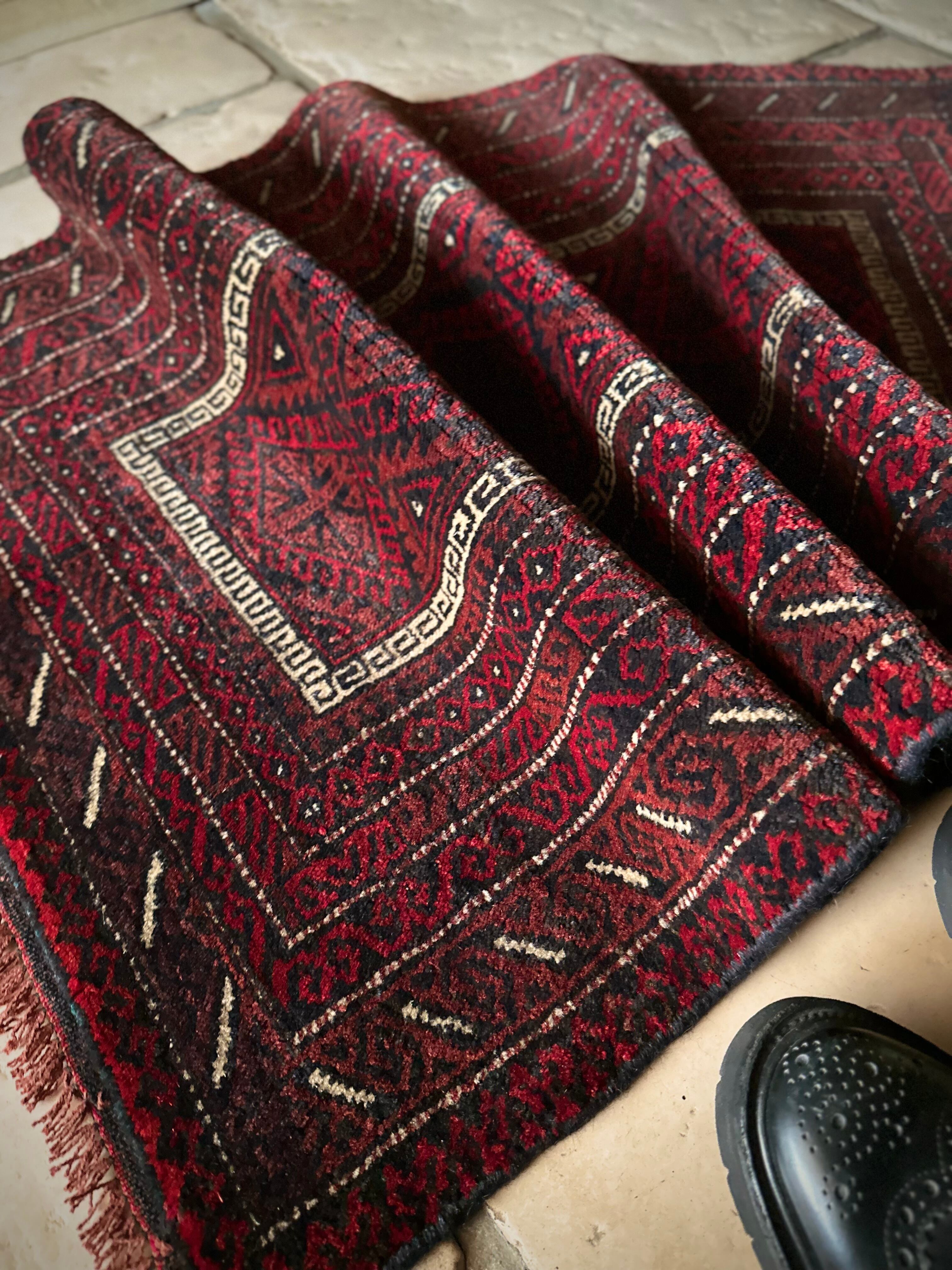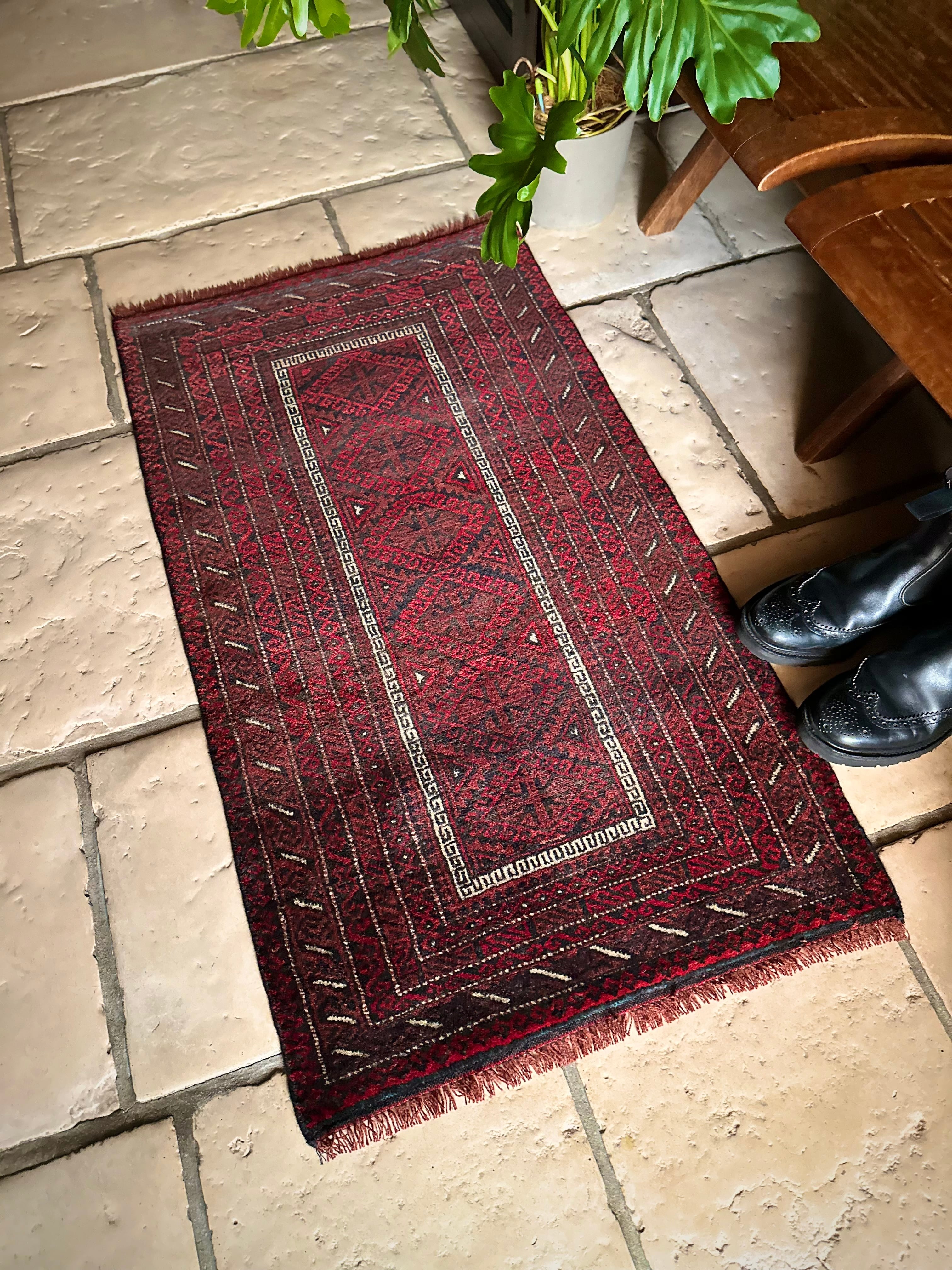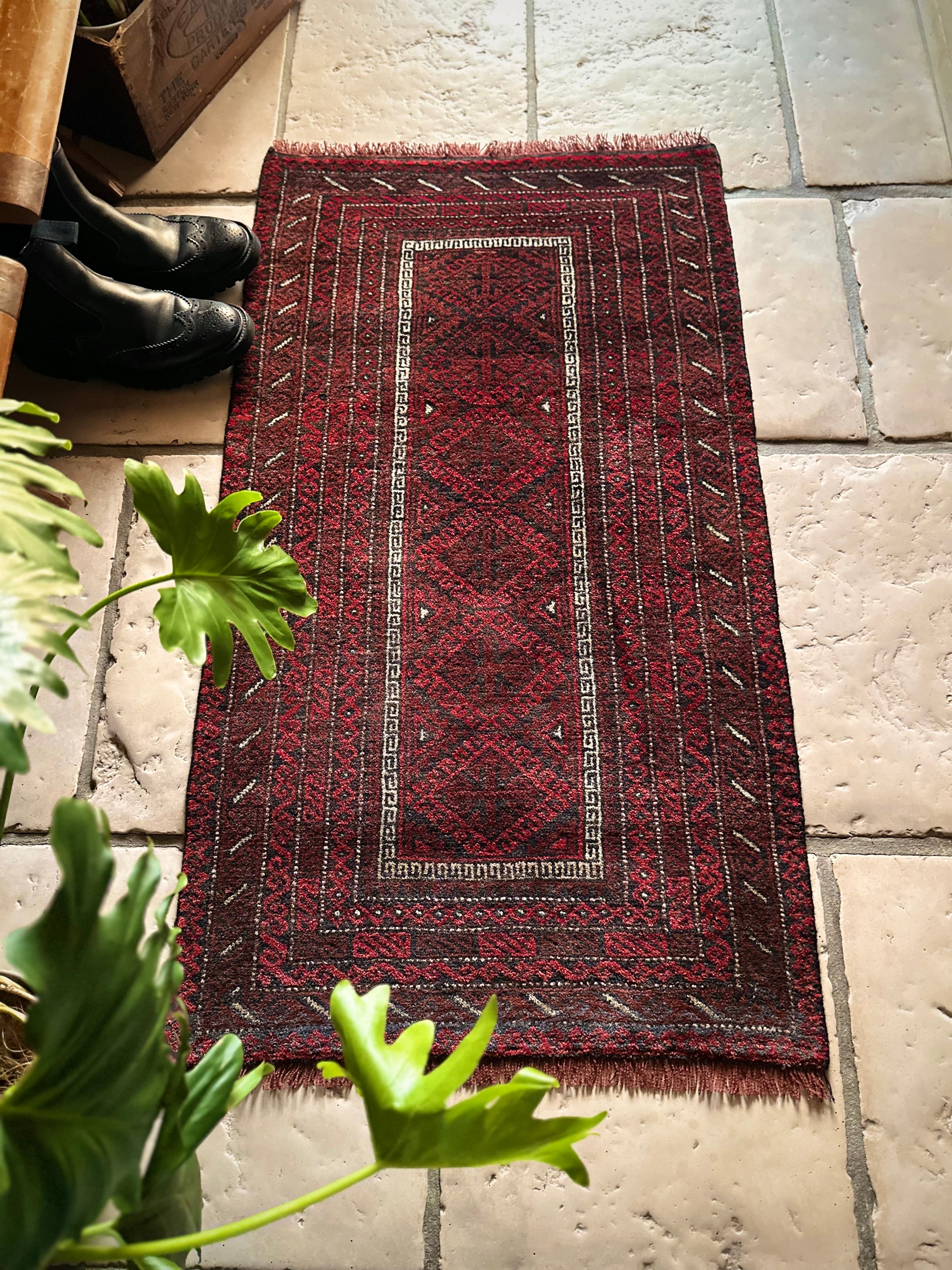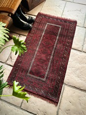 バルーチらしい深紅な色合いにチェーンの連続紋様が目を引く1枚で、小さいながらもしっかりとした織りに玄関やチェスト前など多様な使い道がありますが、個人的には汚れが目立たないのでキッチンマットとしてもお勧めです。
