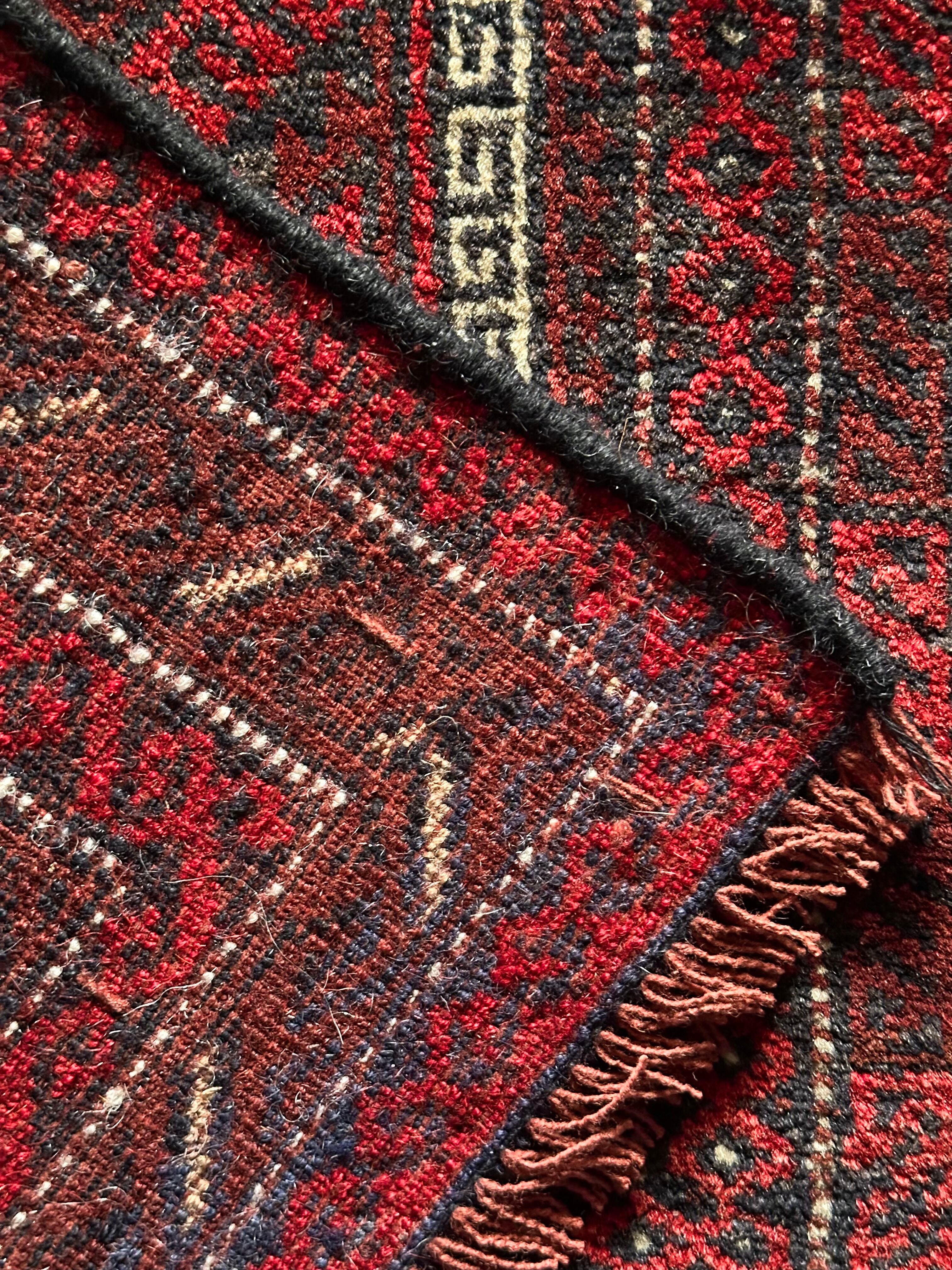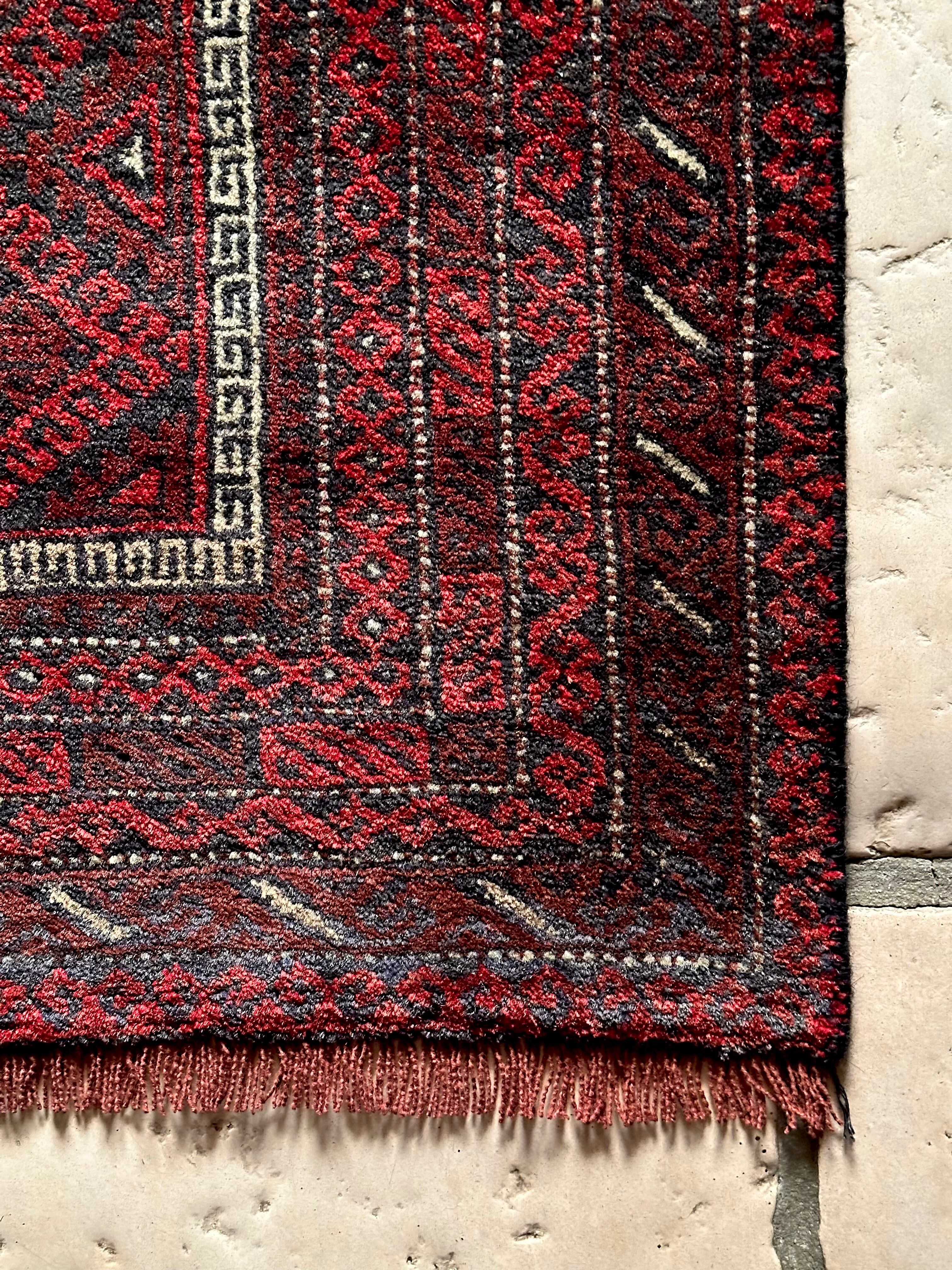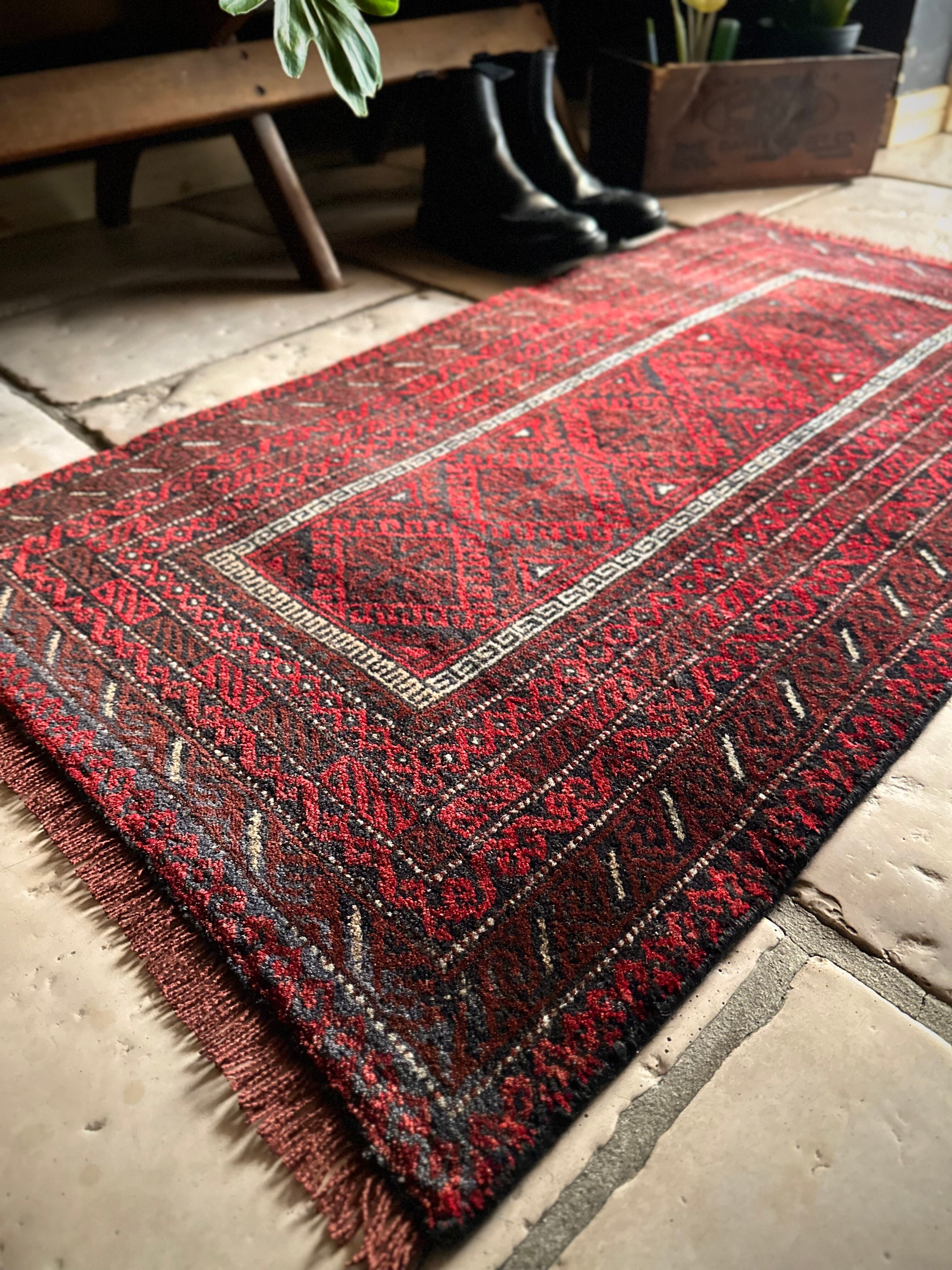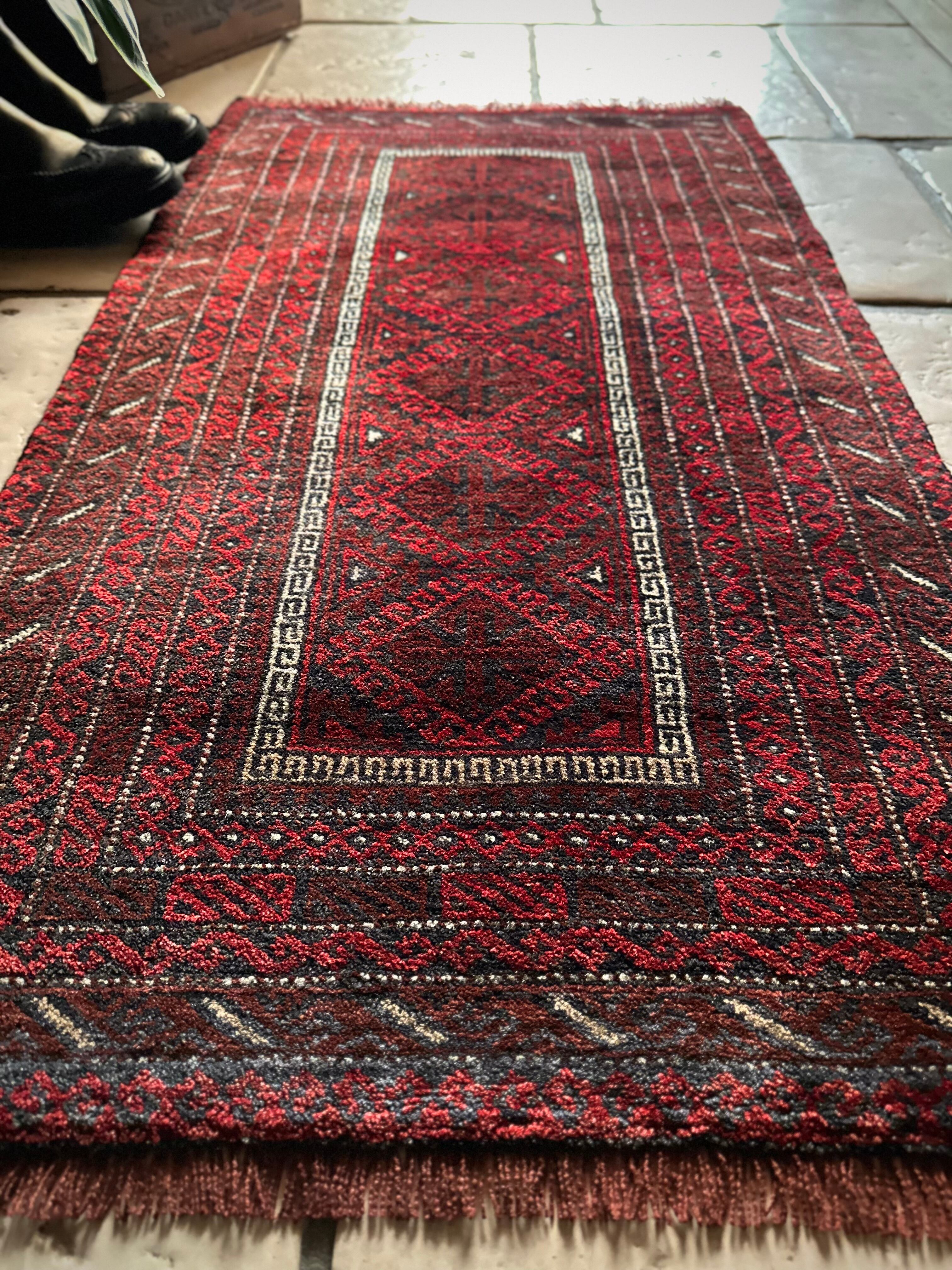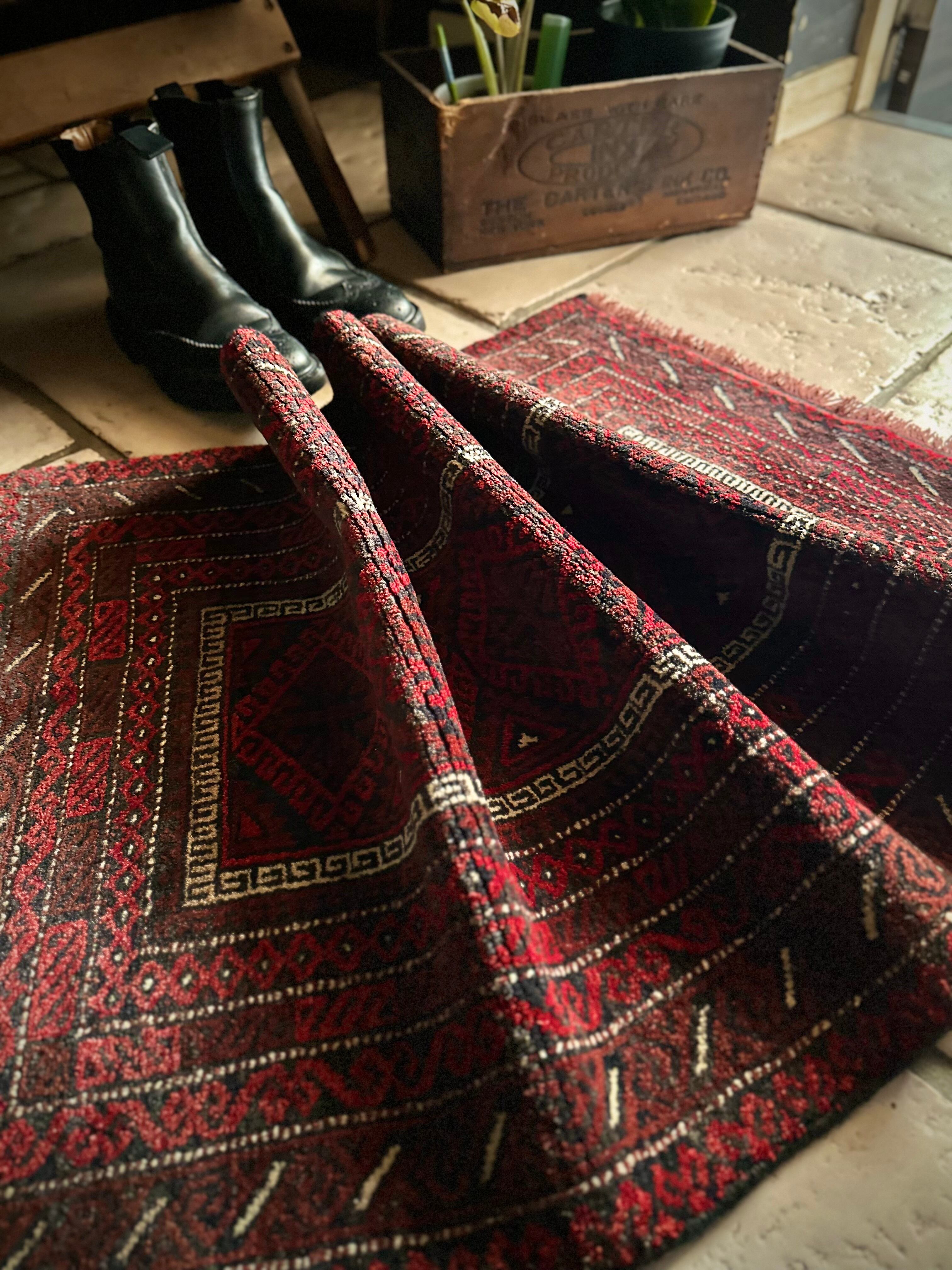 バルーチらしい深紅な色合いにチェーンの連続紋様が目を引く1枚で、小さいながらもしっかりとした織りに玄関やチェスト前など多様な使い道がありますが、個人的には汚れが目立たないのでキッチンマットとしてもお勧めです。