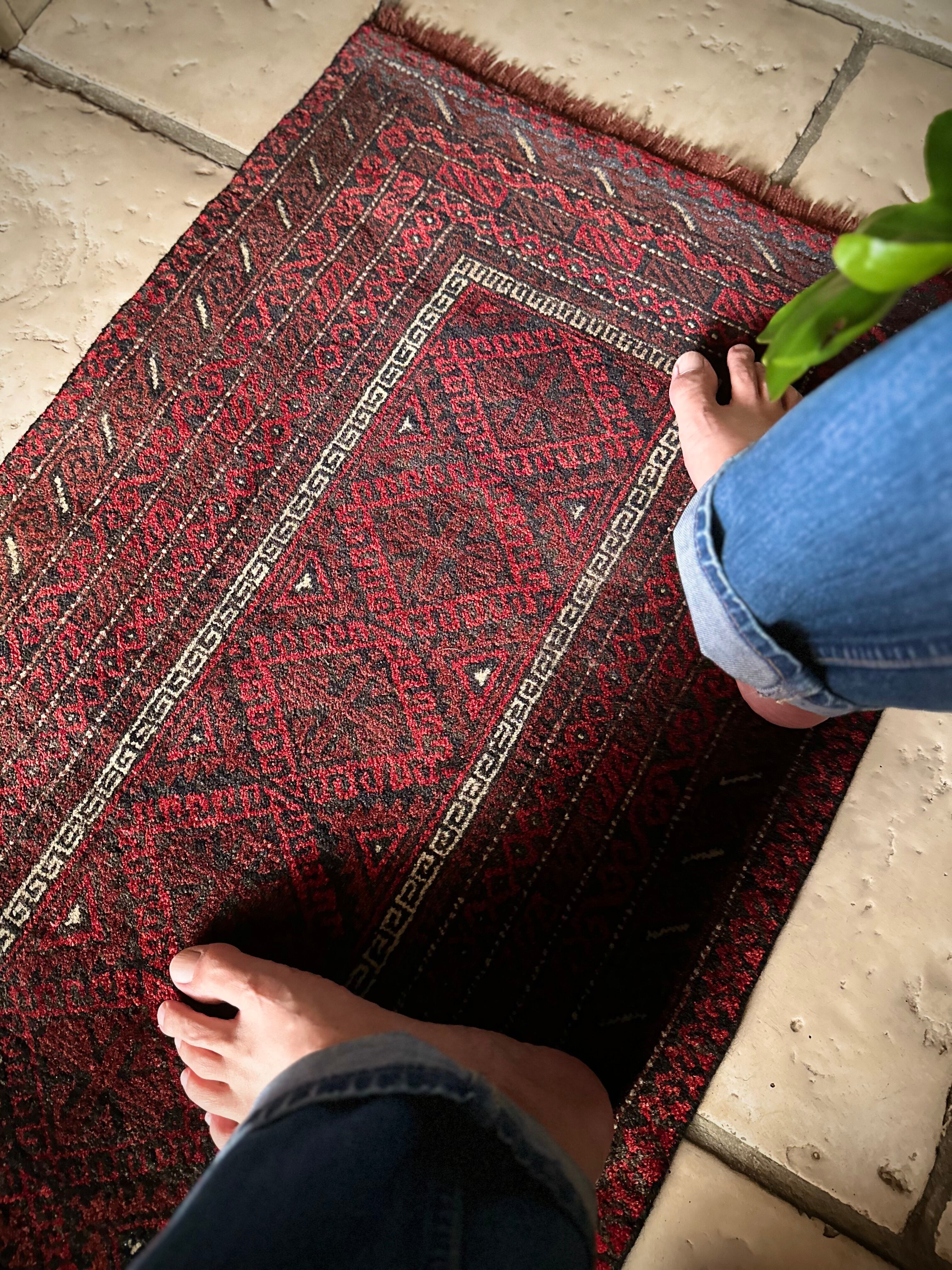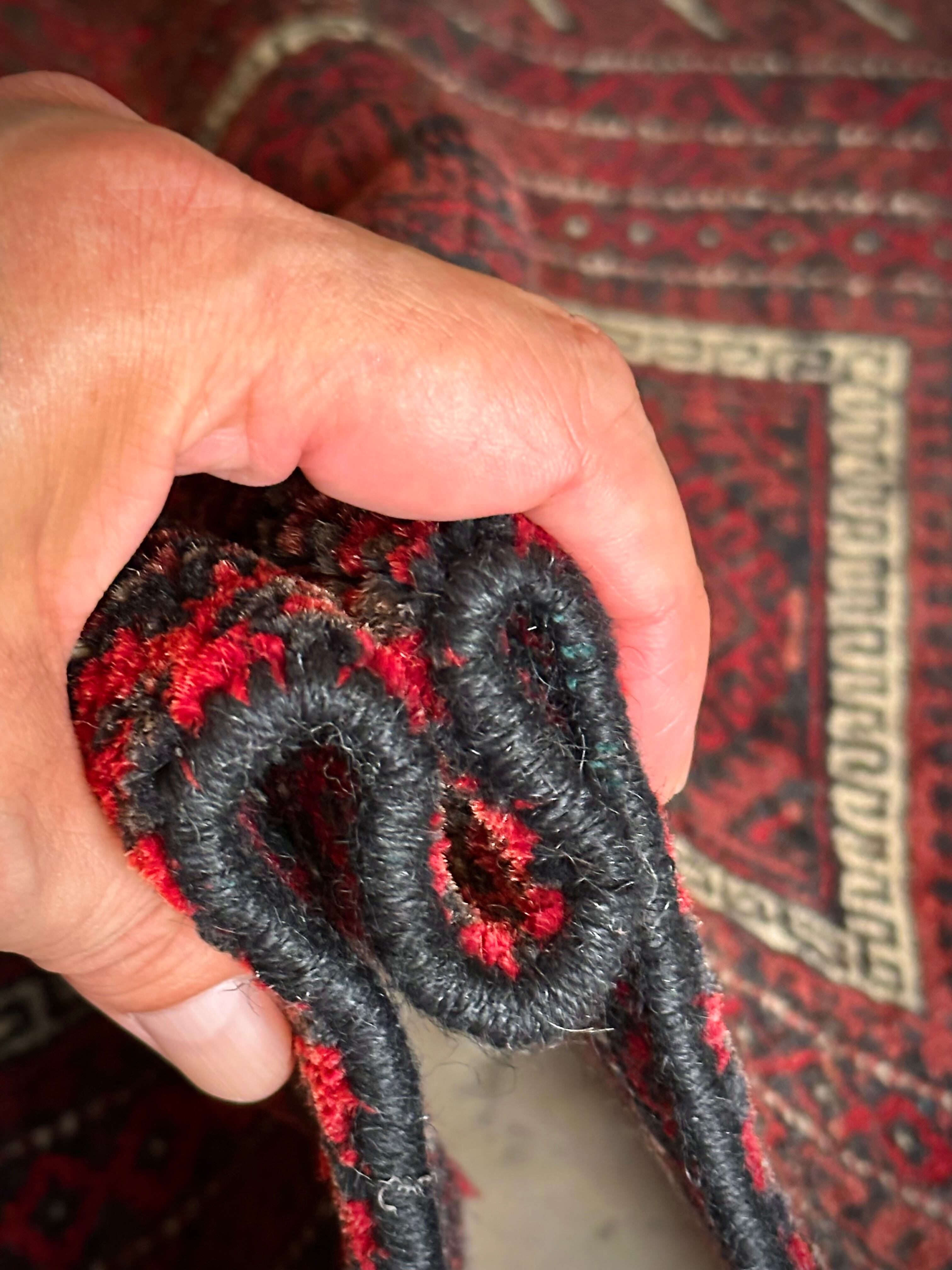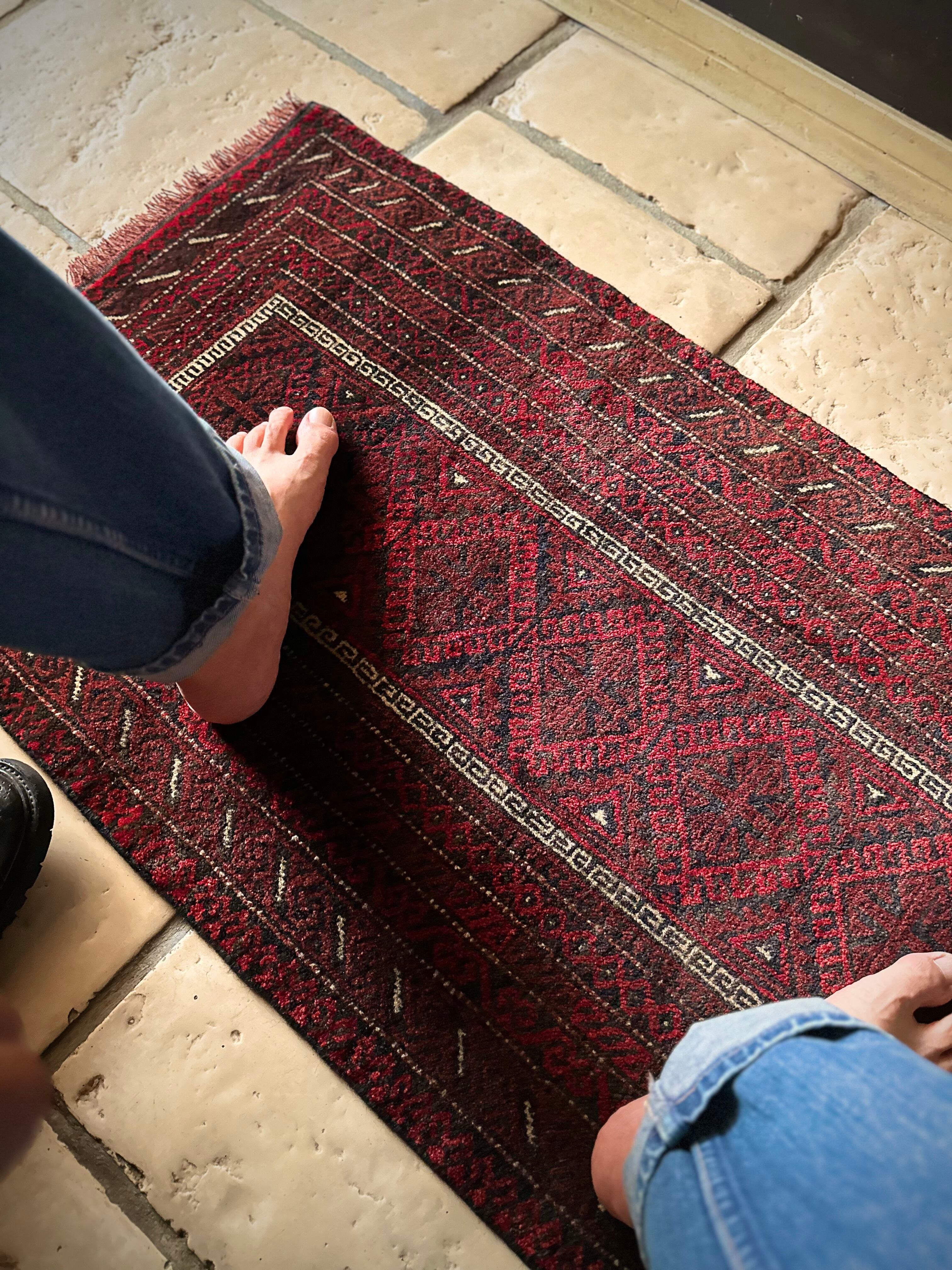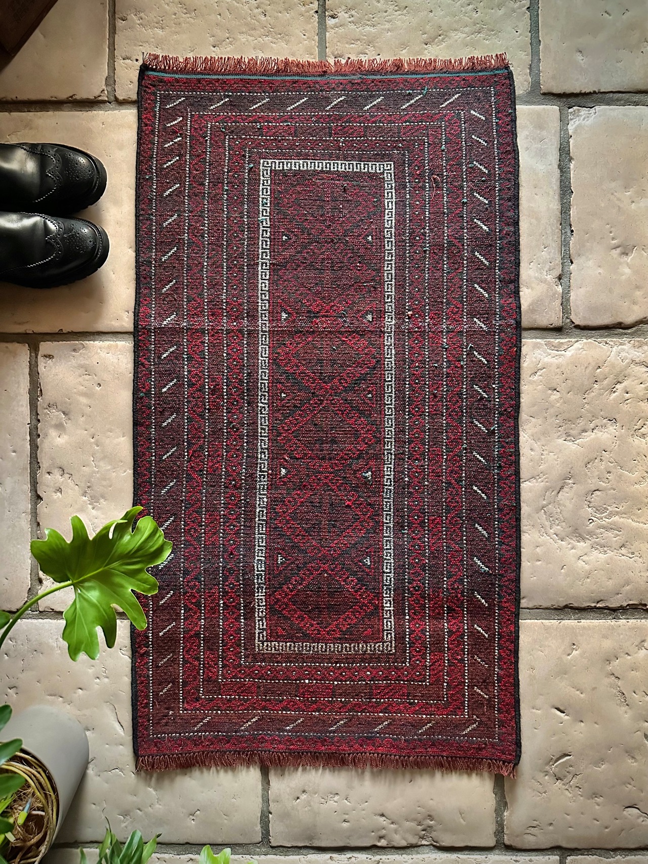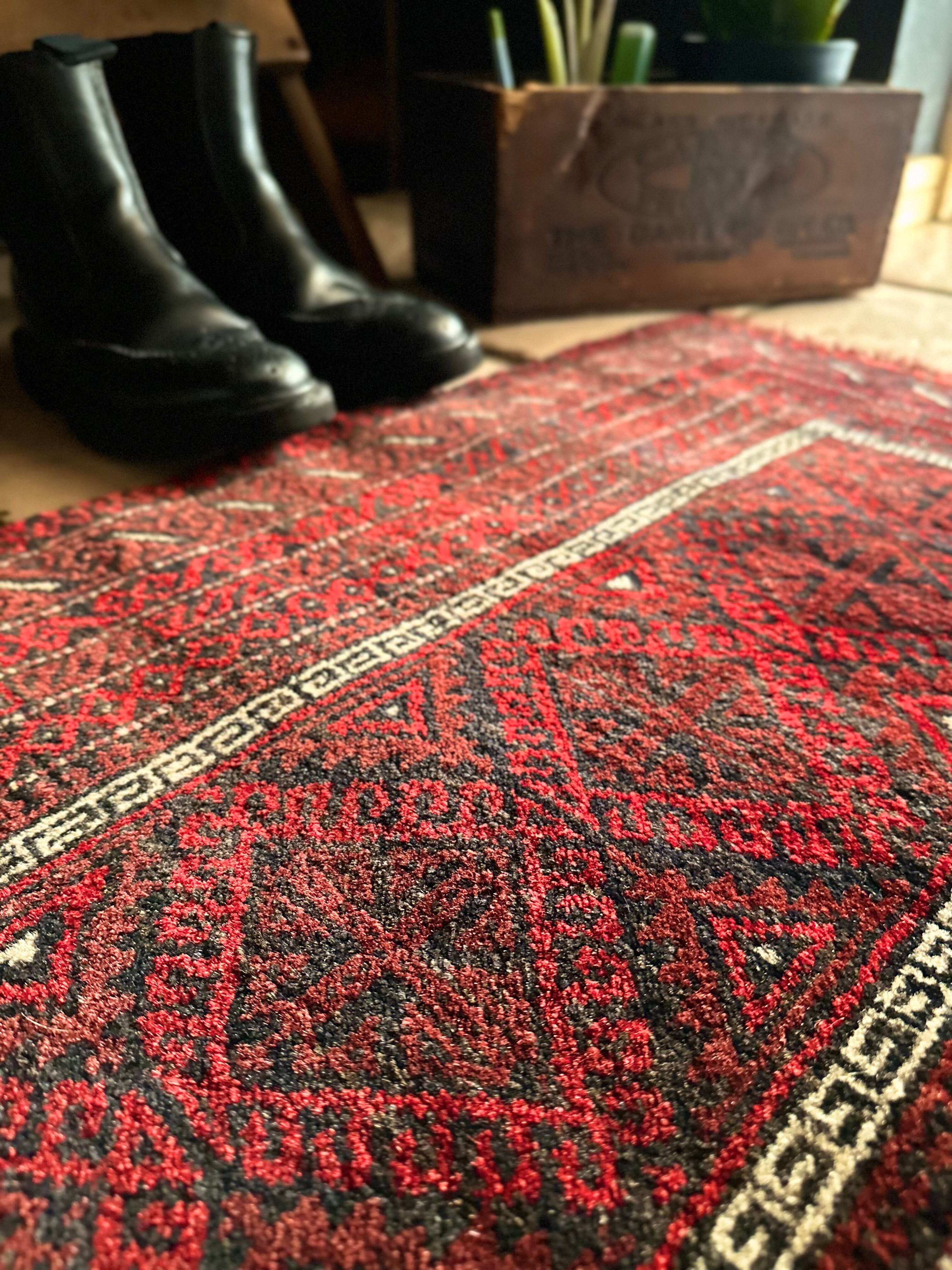 バルーチらしい深紅な色合いにチェーンの連続紋様が目を引く1枚で、小さいながらもしっかりとした織りに玄関やチェスト前など多様な使い道がありますが、個人的には汚れが目立たないのでキッチンマットとしてもお勧めです。