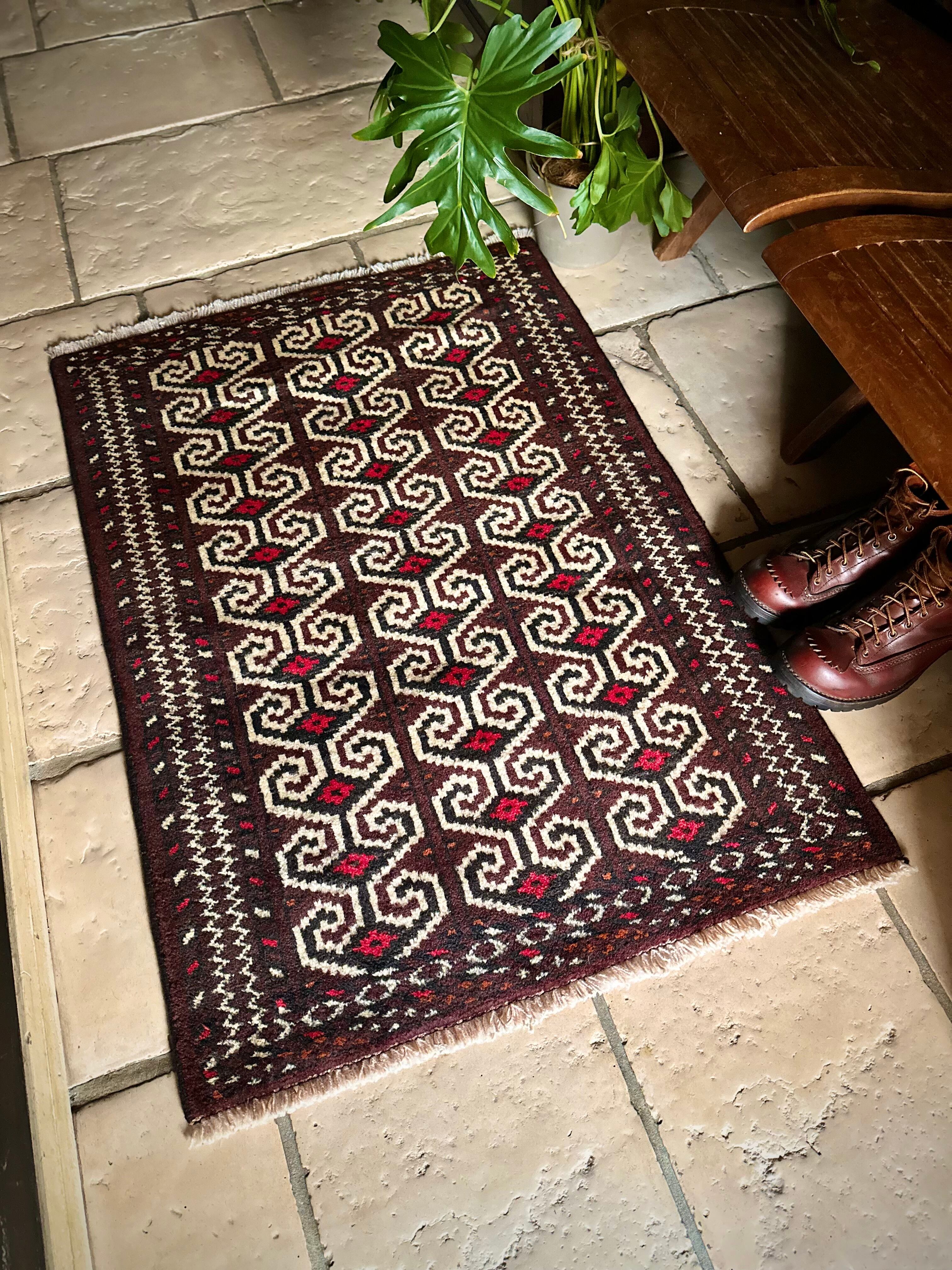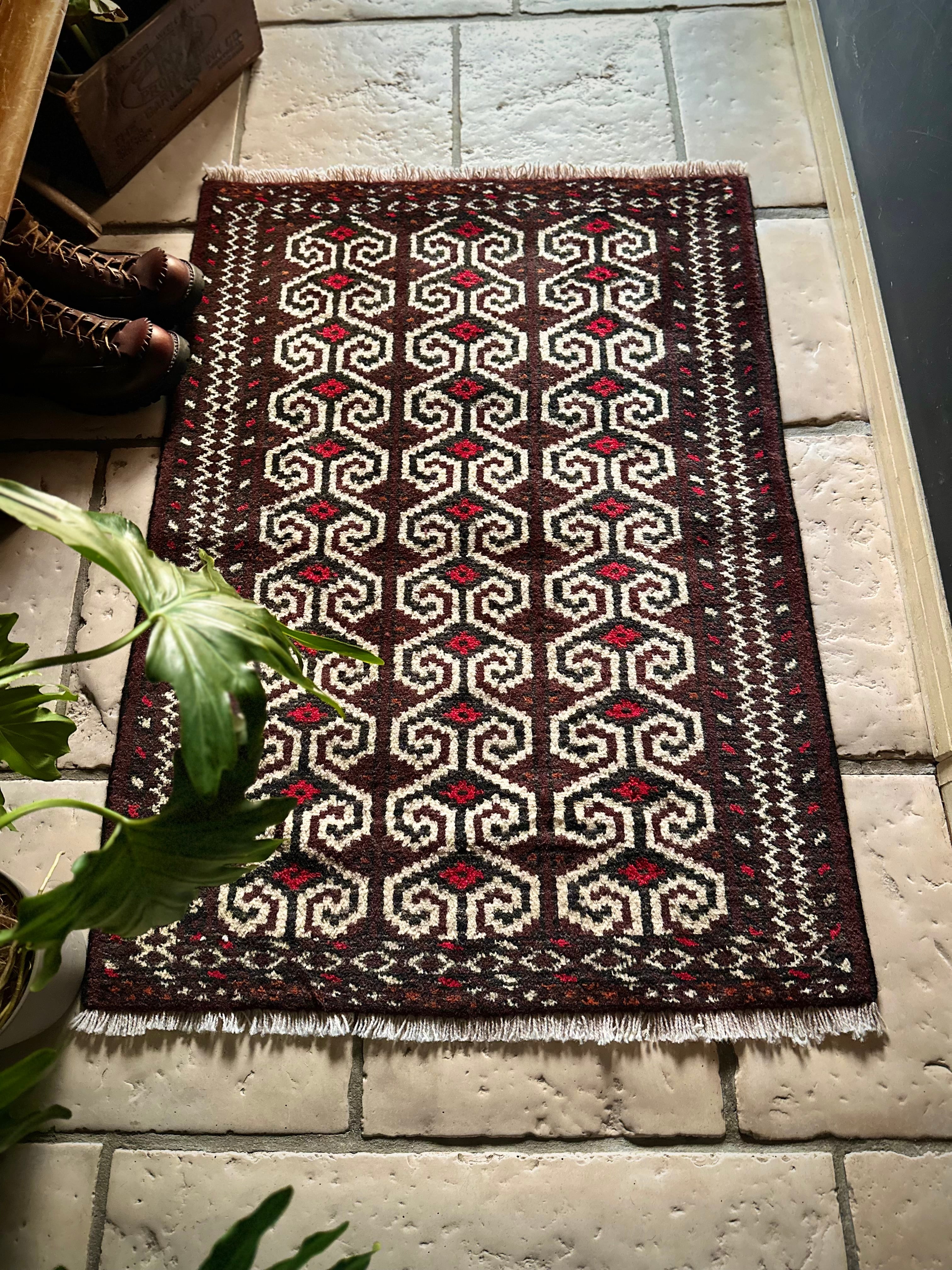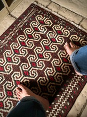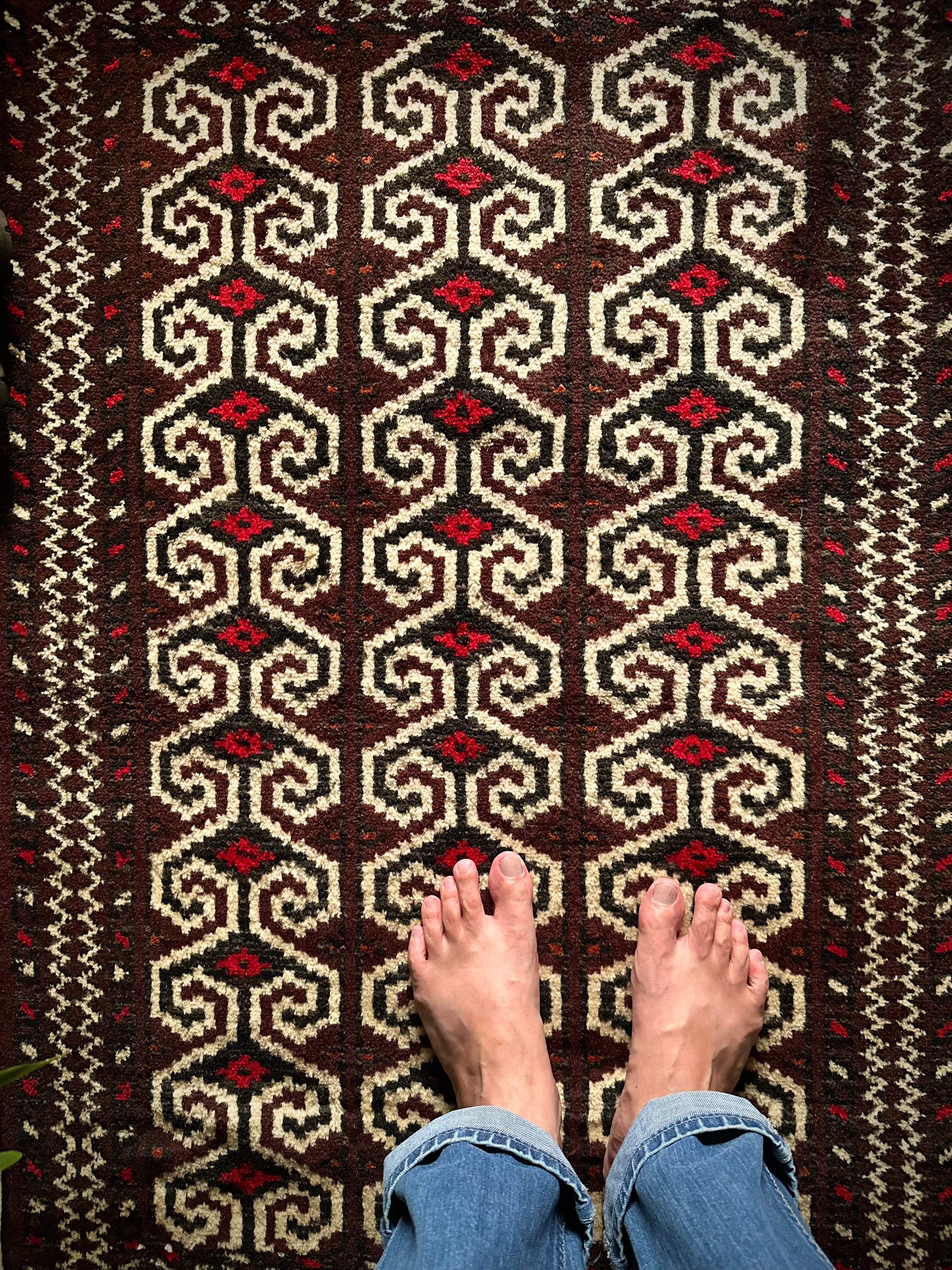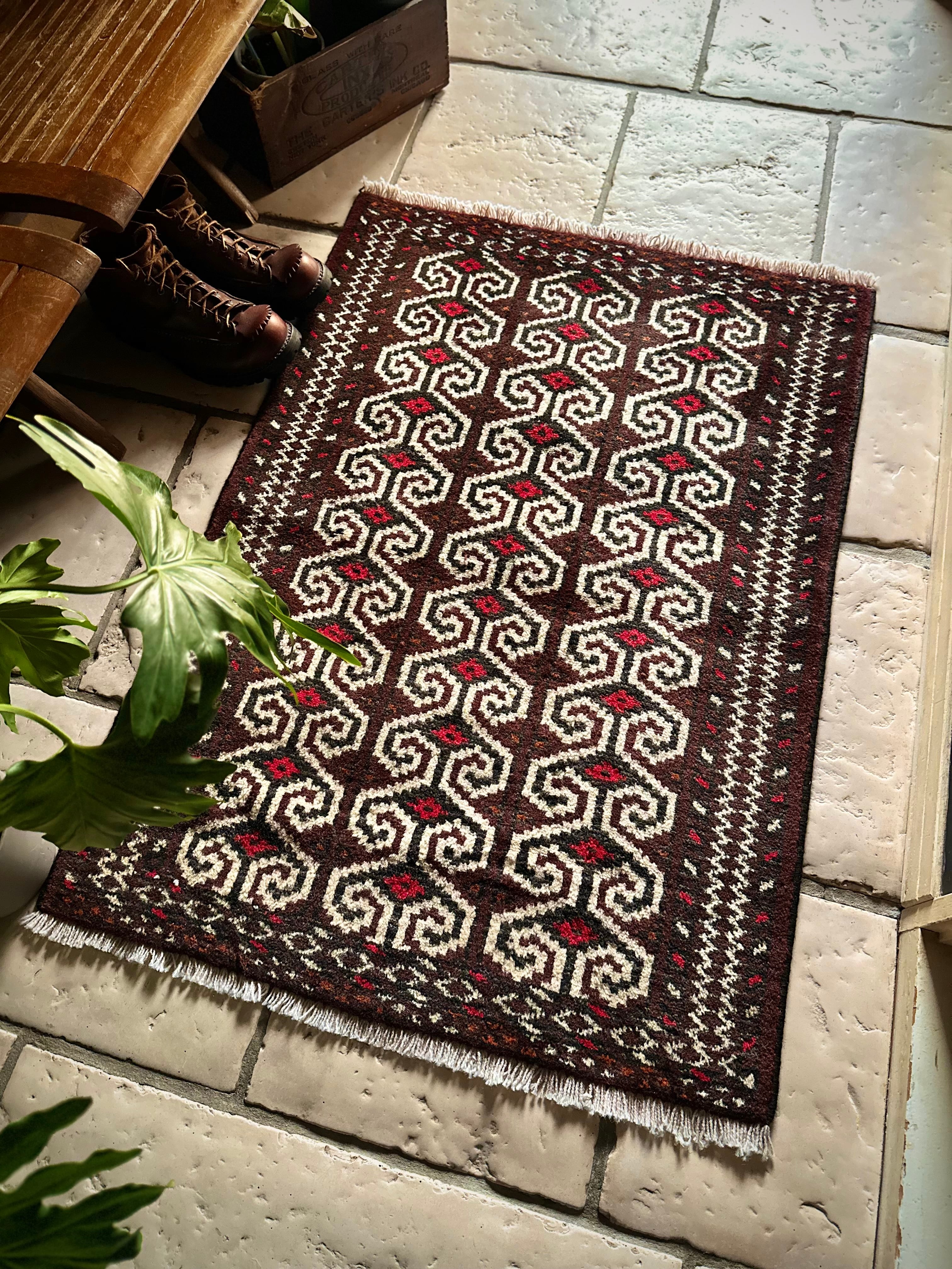 雄牛の角に見立てたイラン産トルクメンの独特な紋様でモダンな感じにも見えますが、見ようによっては可愛らしく好き嫌いが分かれるでしょうか。織りとしてはかなり分厚くみっちりと油分を含んだパイルはしっとりとした踏み心地で気分上々です。