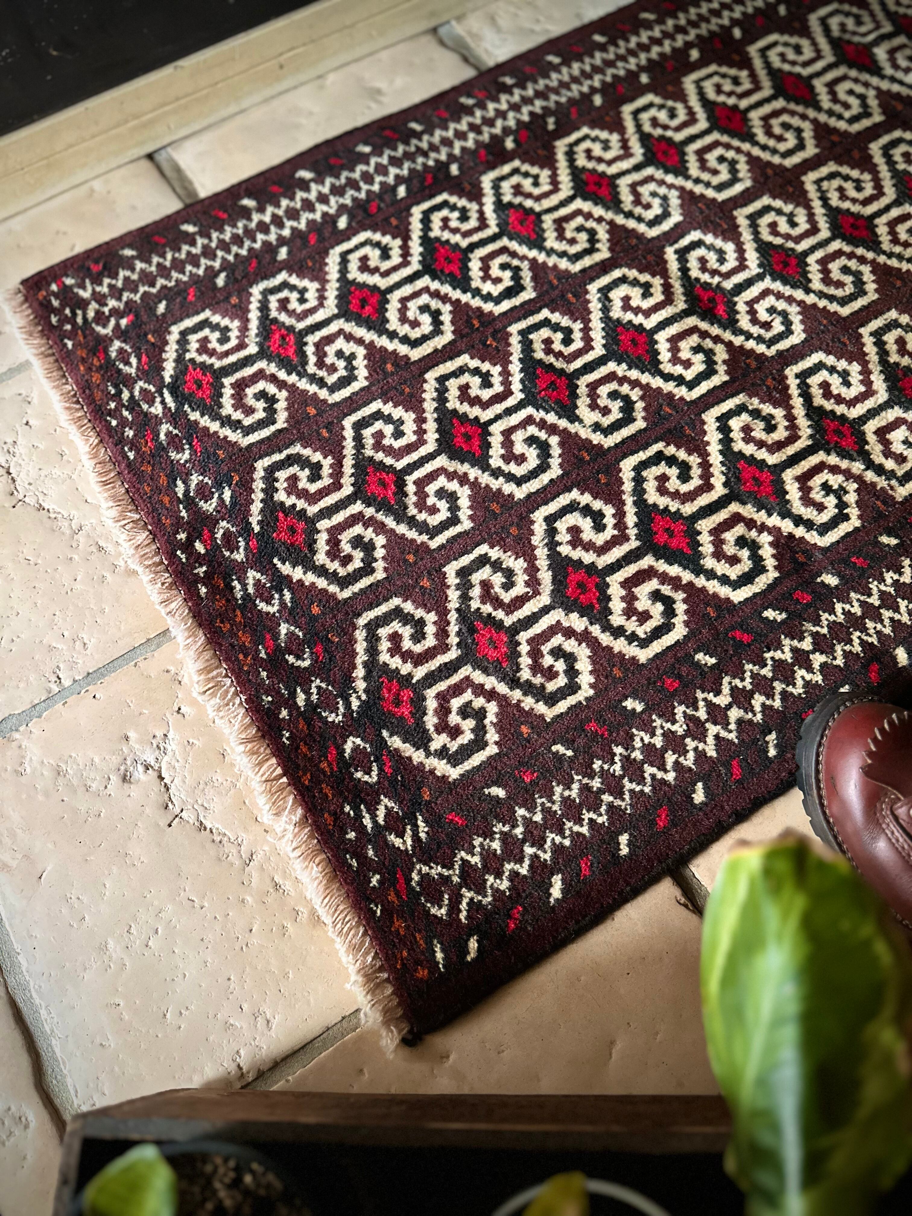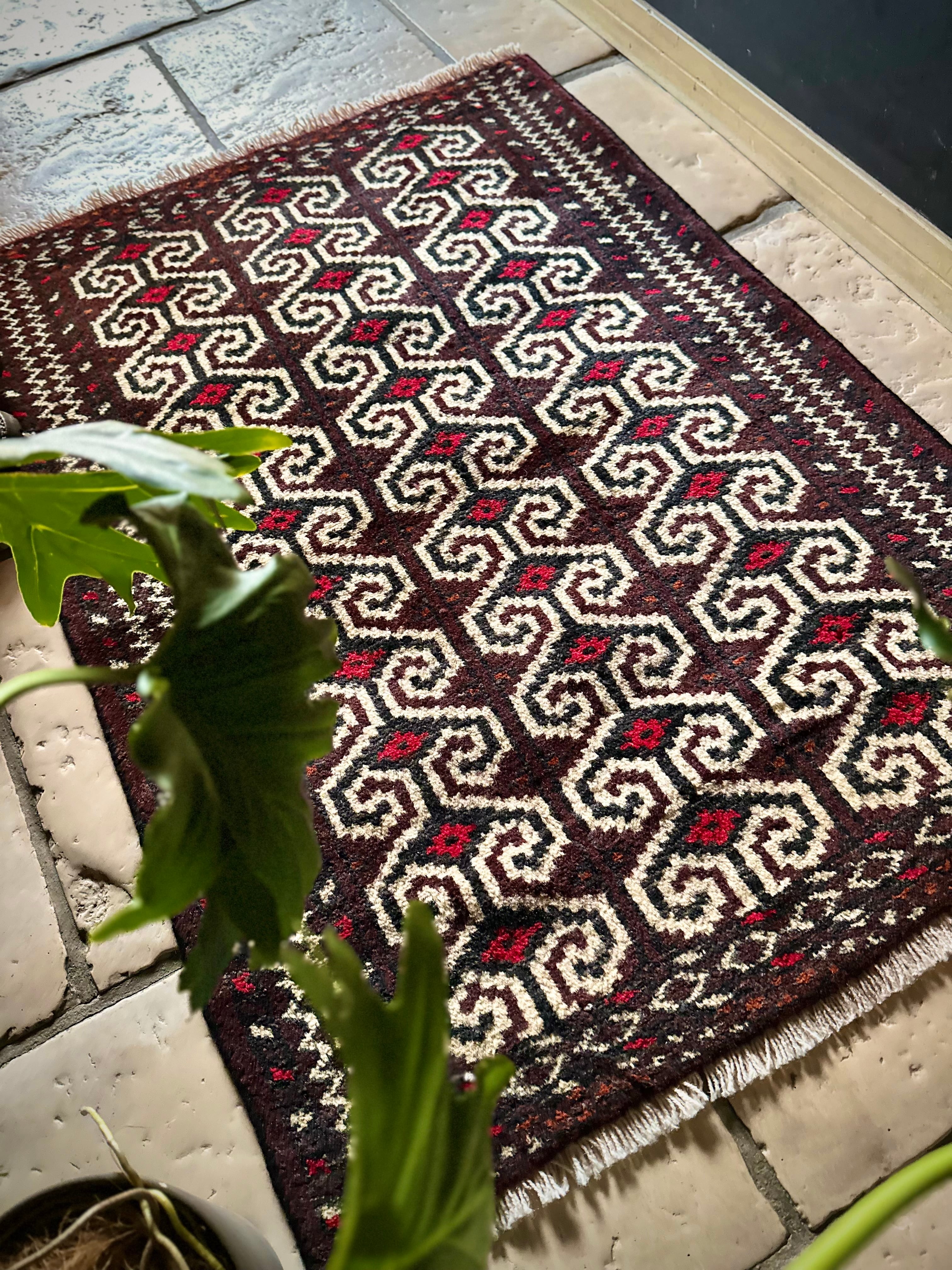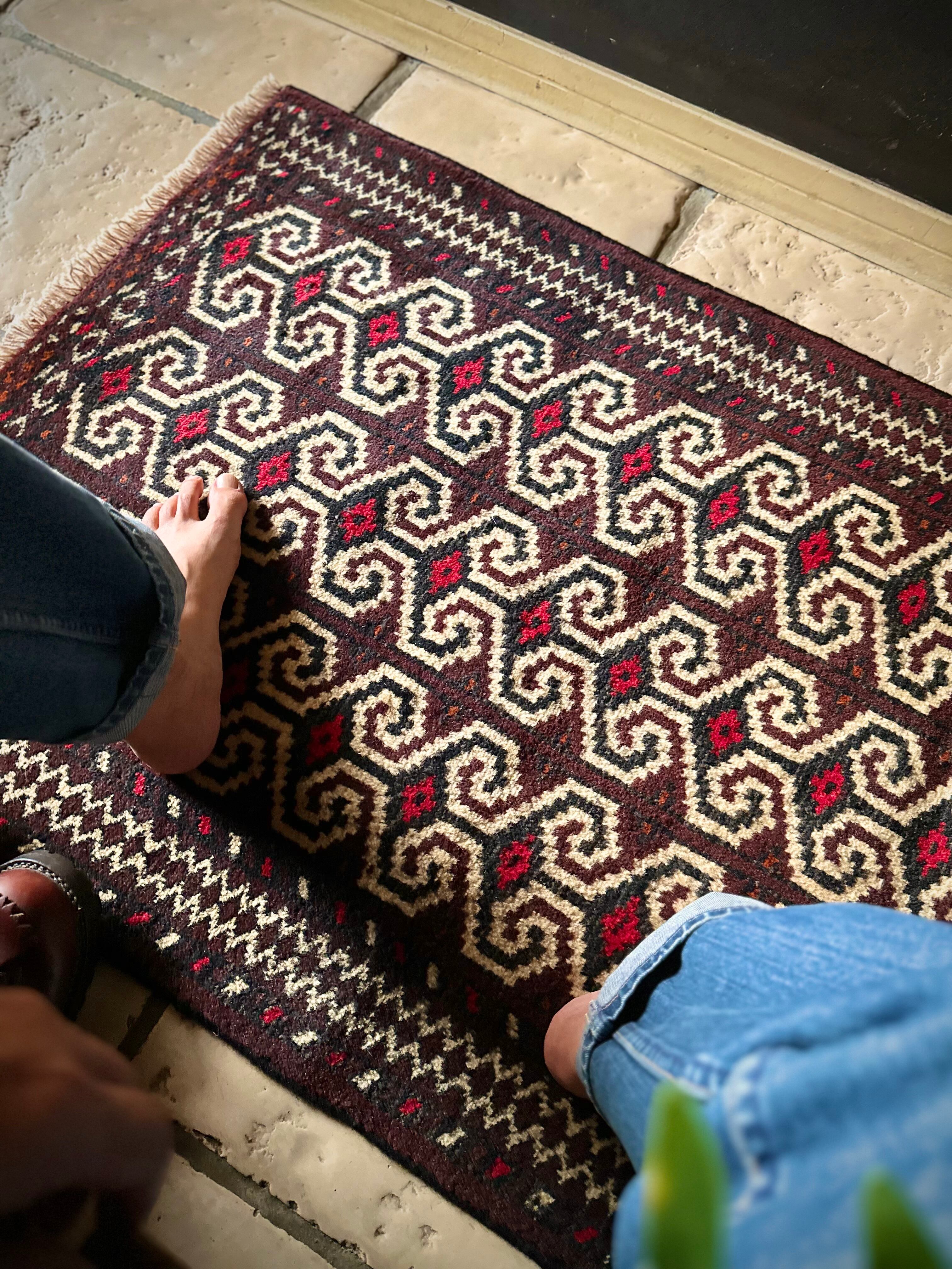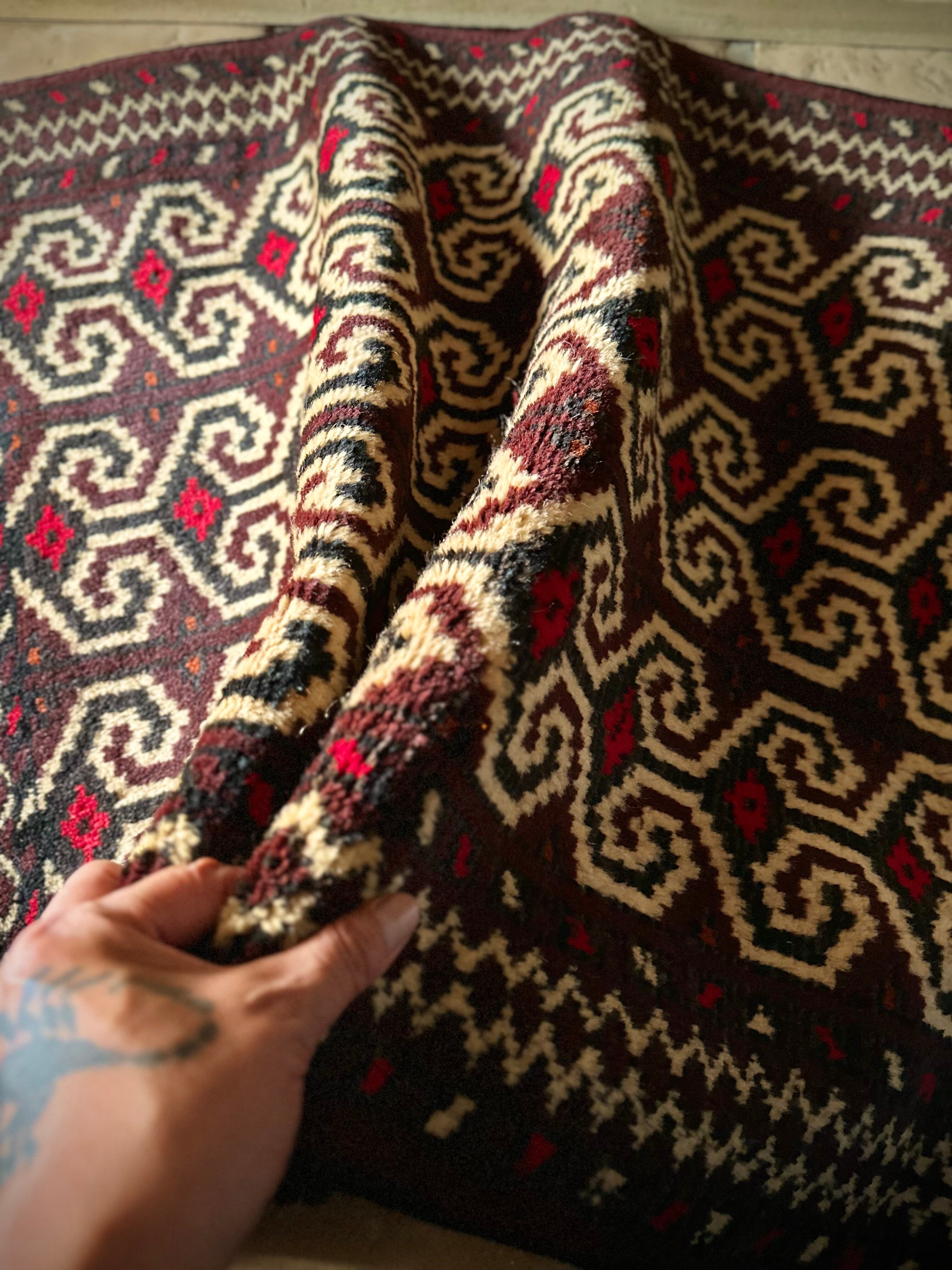 雄牛の角に見立てたイラン産トルクメンの独特な紋様でモダンな感じにも見えますが、見ようによっては可愛らしく好き嫌いが分かれるでしょうか。織りとしてはかなり分厚くみっちりと油分を含んだパイルはしっとりとした踏み心地で気分上々です。