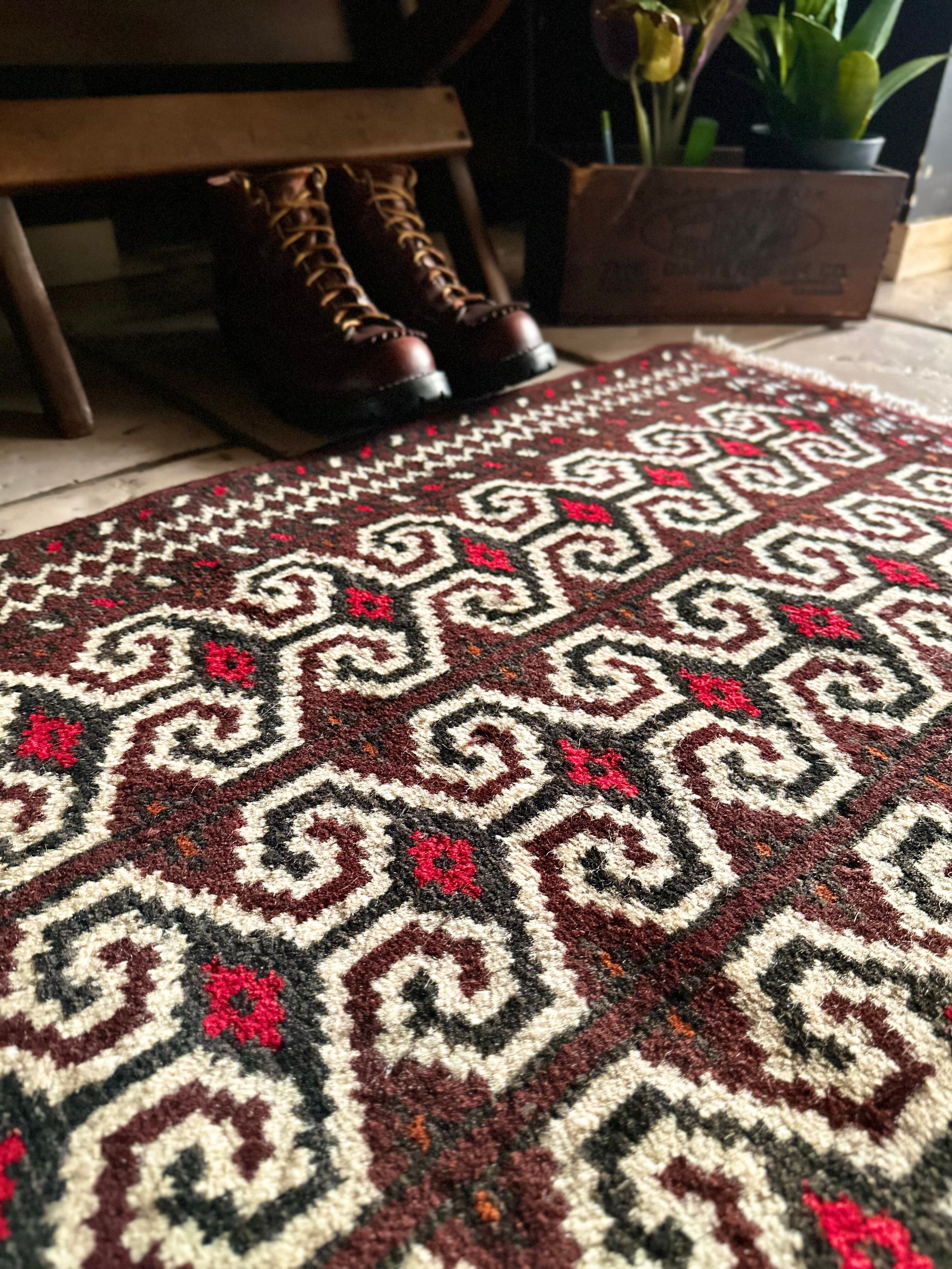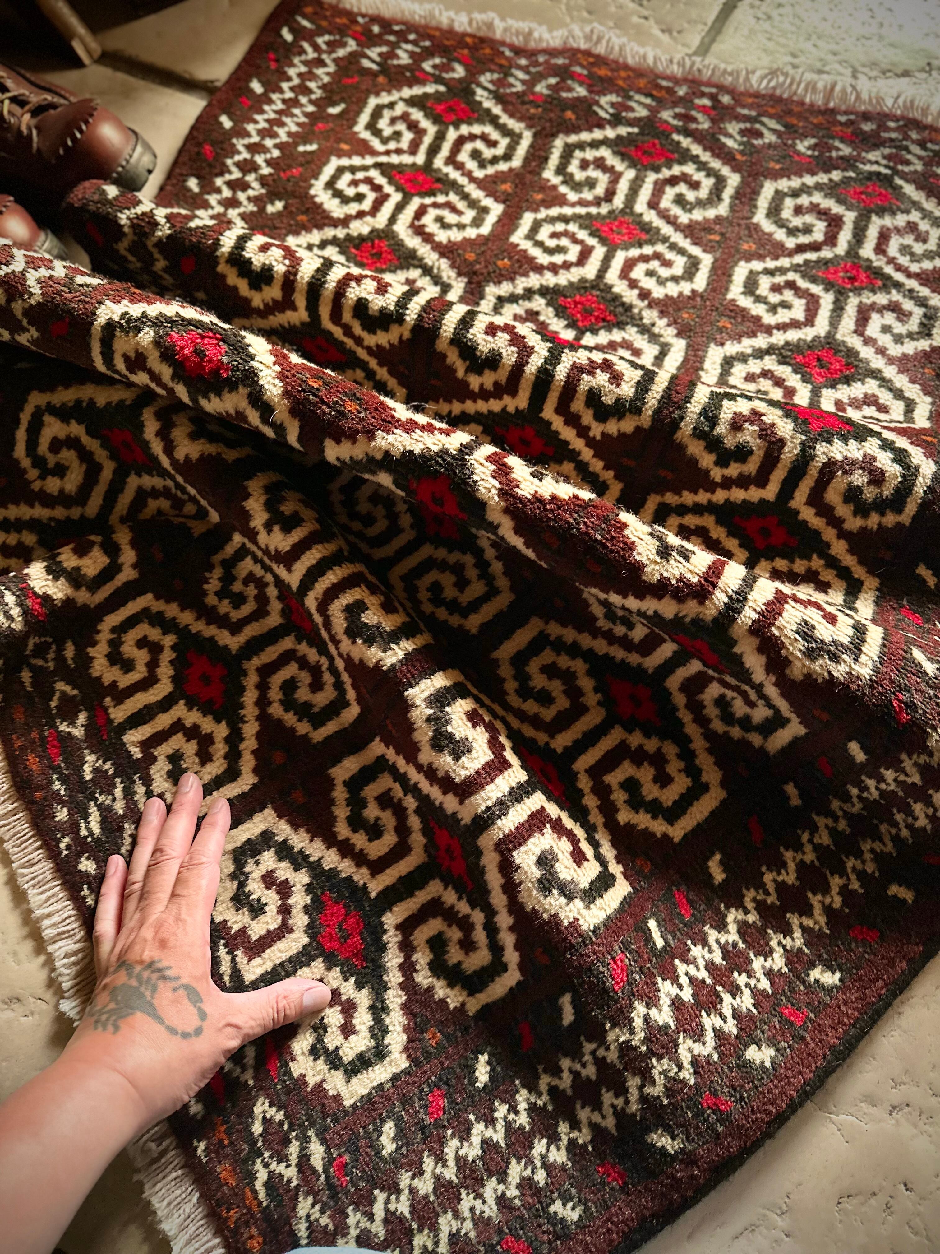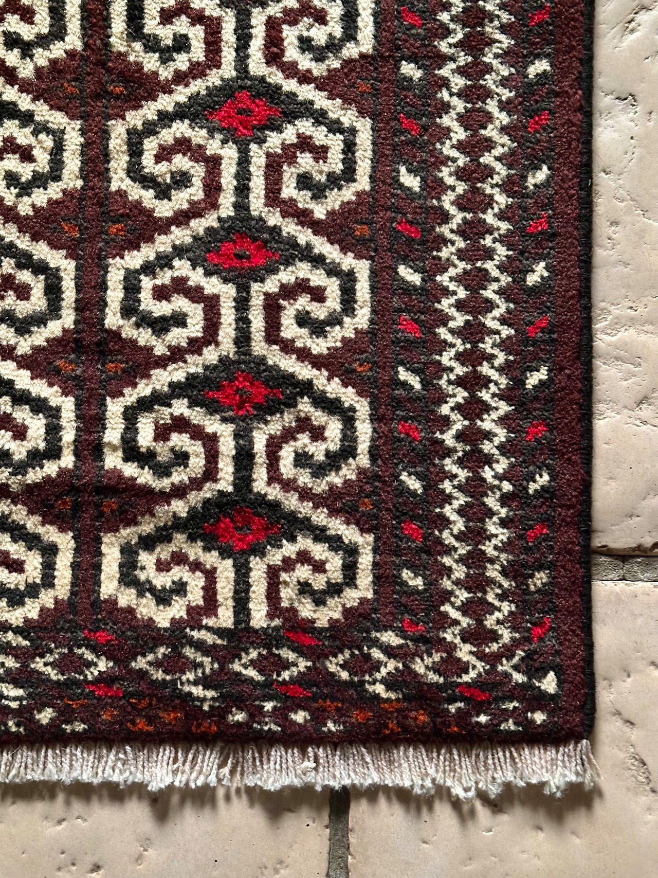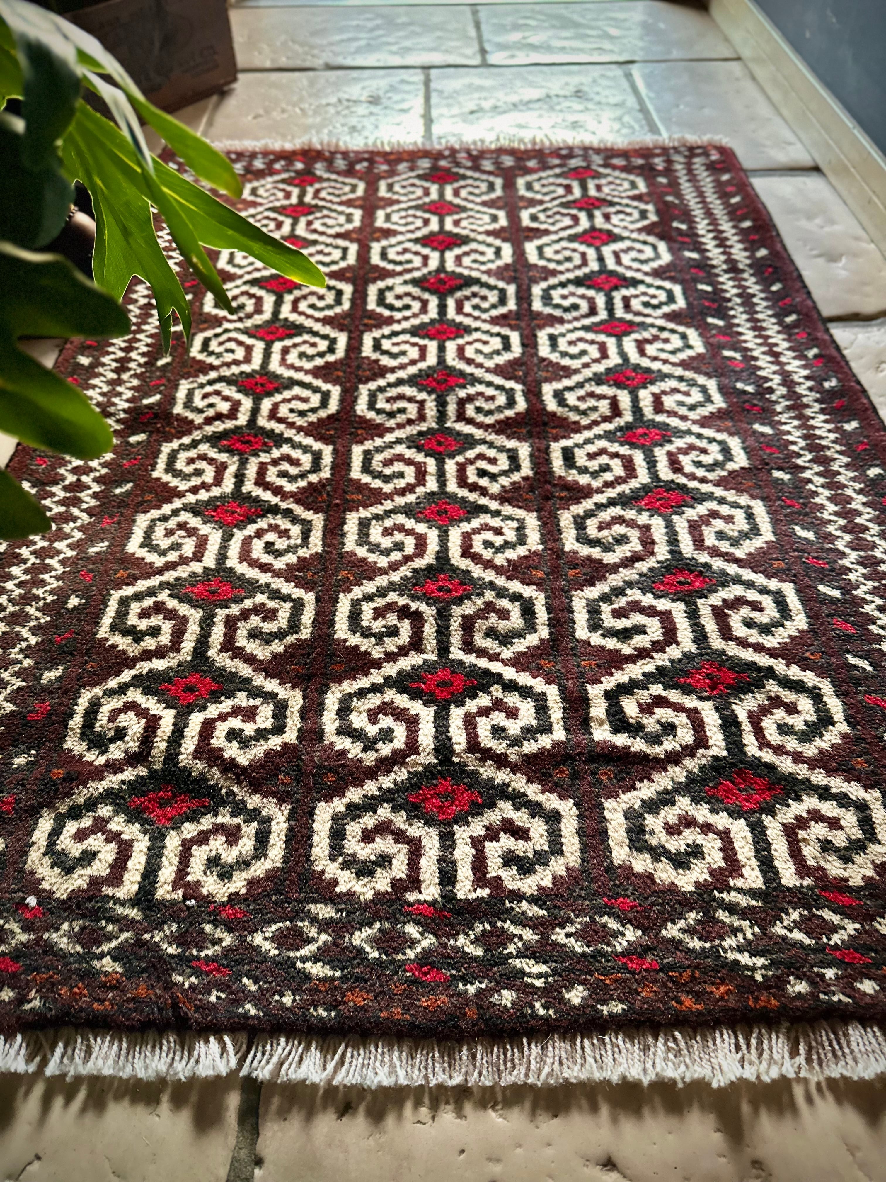 雄牛の角に見立てたイラン産トルクメンの独特な紋様でモダンな感じにも見えますが、見ようによっては可愛らしく好き嫌いが分かれるでしょうか。織りとしてはかなり分厚くみっちりと油分を含んだパイルはしっとりとした踏み心地で気分上々です。