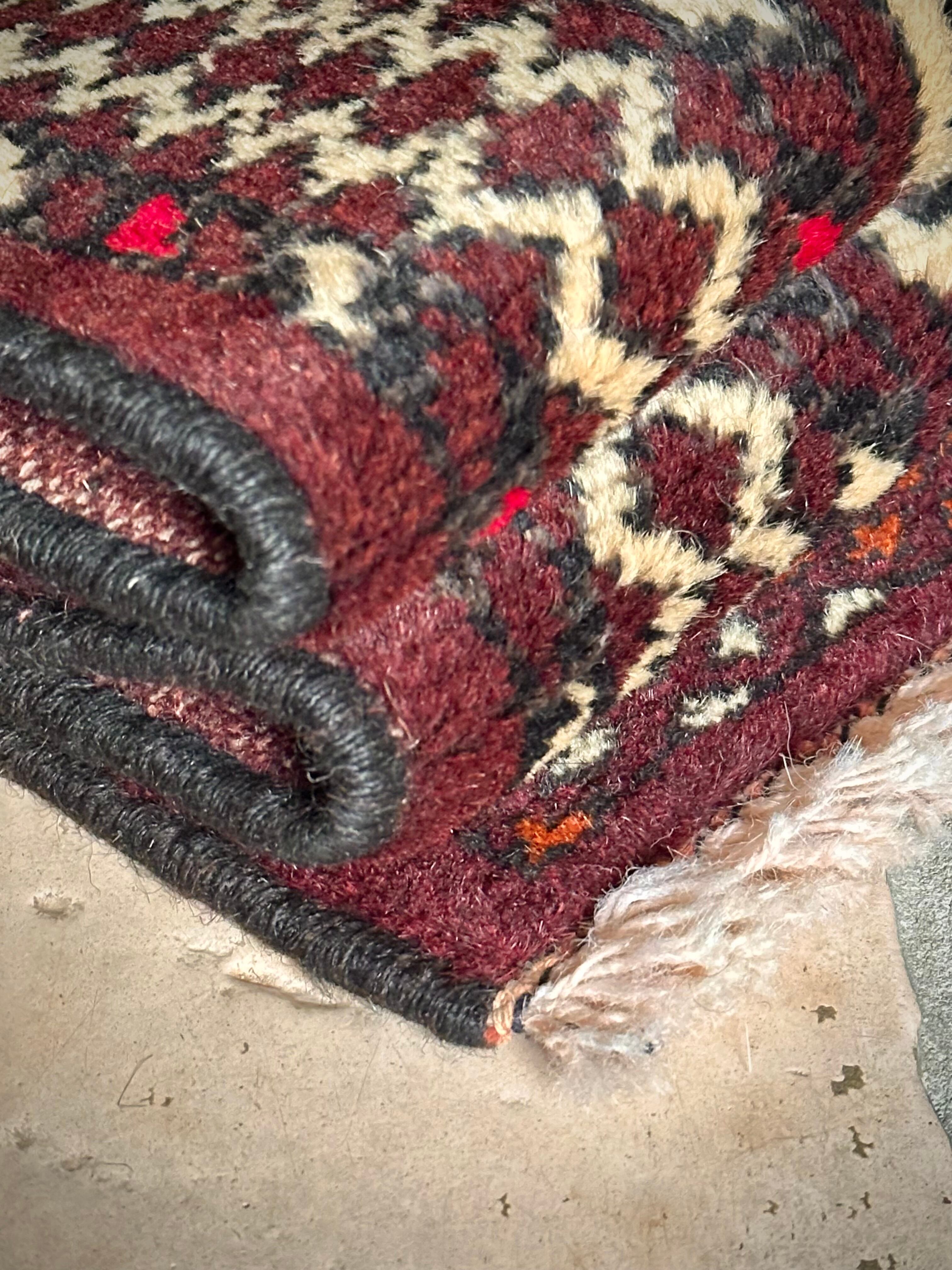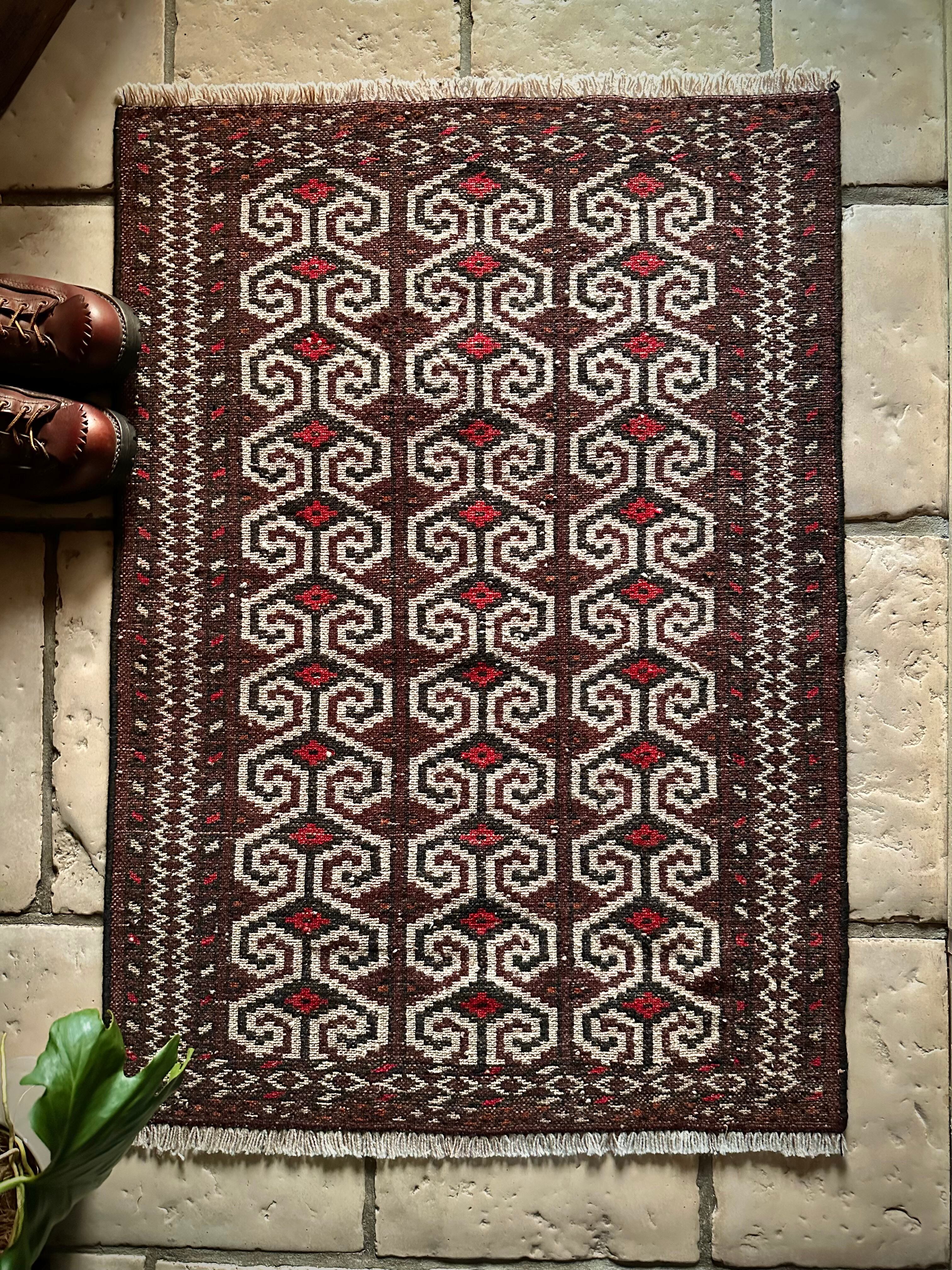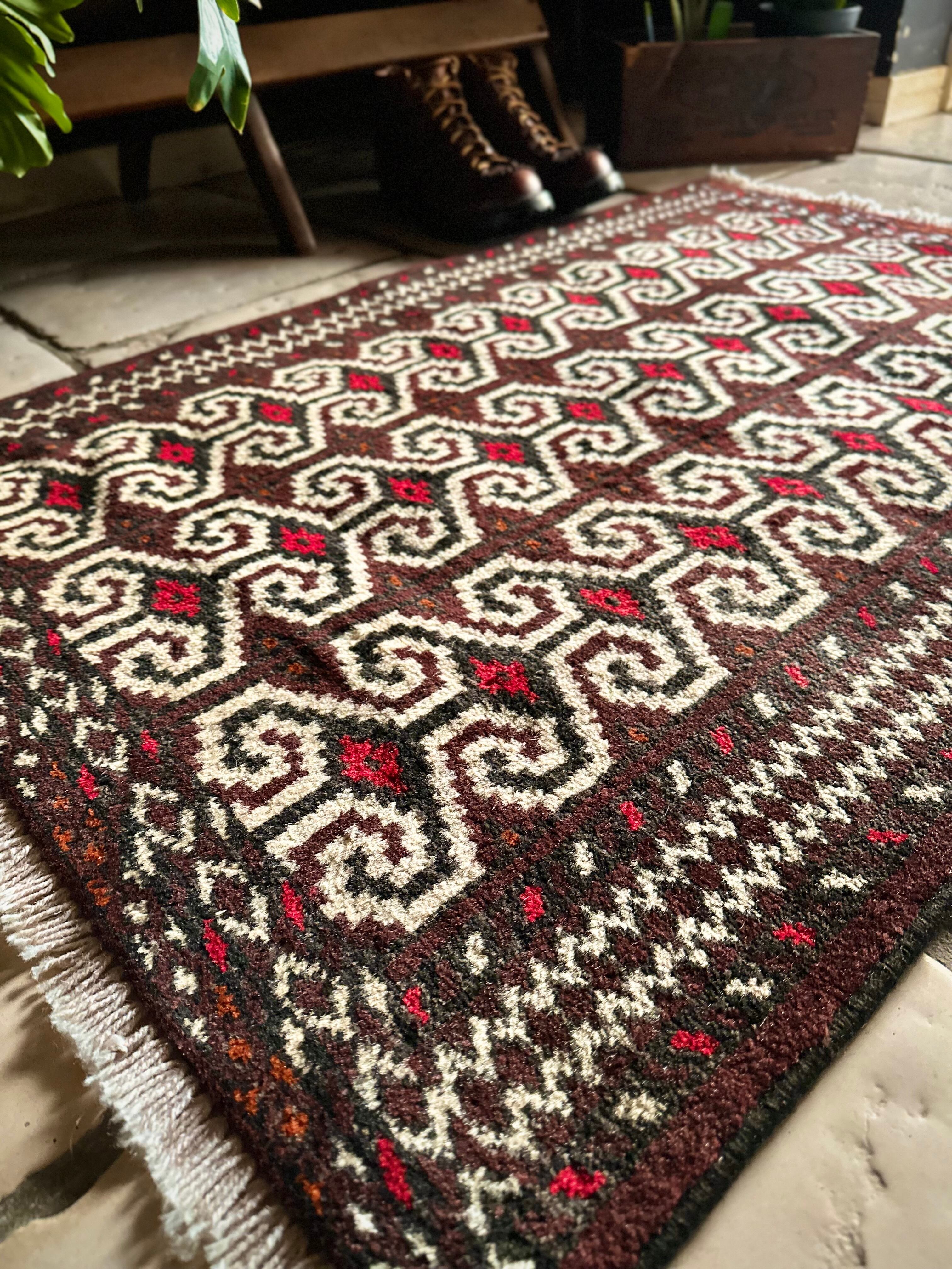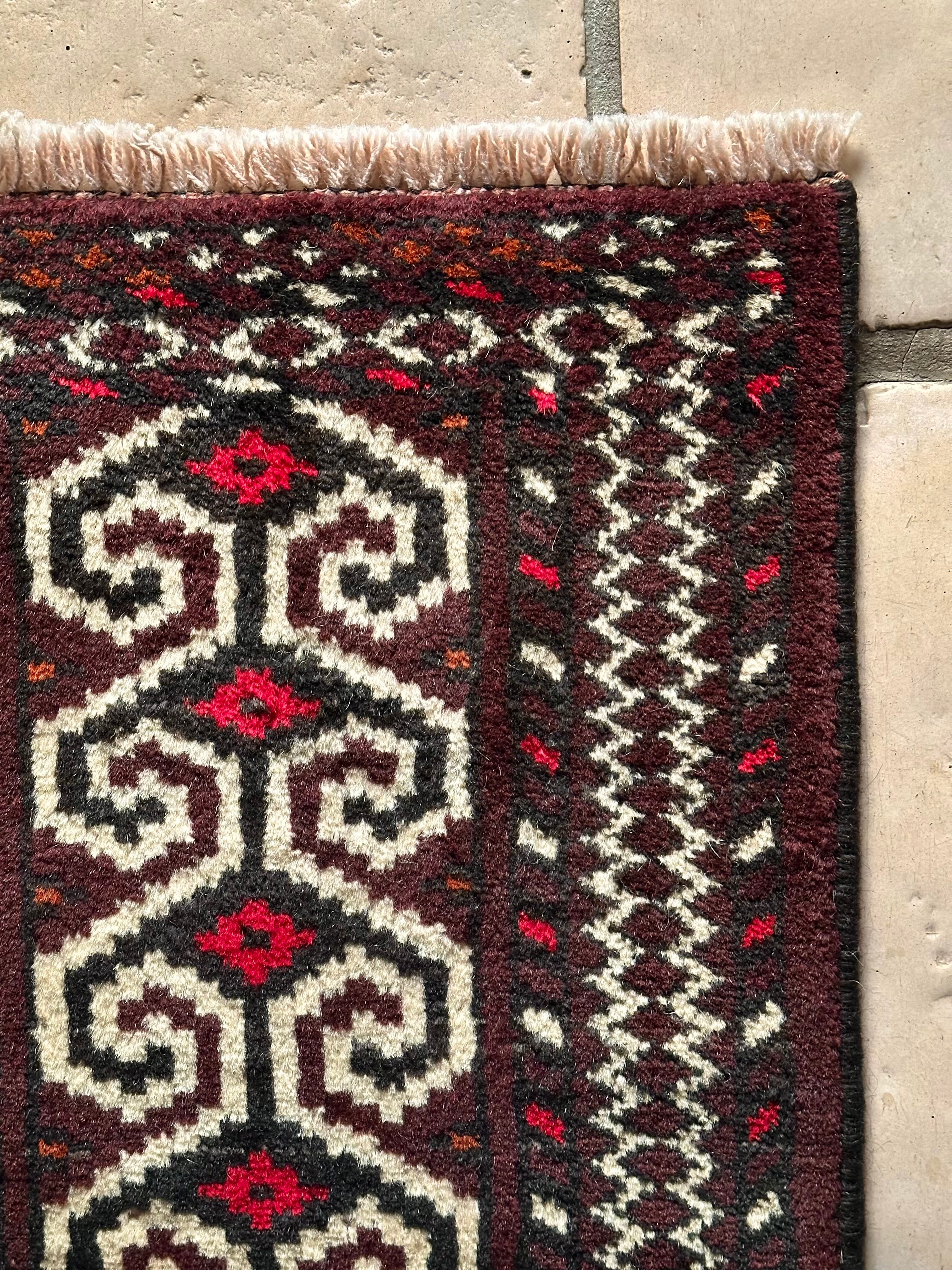雄牛の角に見立てたイラン産トルクメンの独特な紋様でモダンな感じにも見えますが、見ようによっては可愛らしく好き嫌いが分かれるでしょうか。織りとしてはかなり分厚くみっちりと油分を含んだパイルはしっとりとした踏み心地で気分上々です。