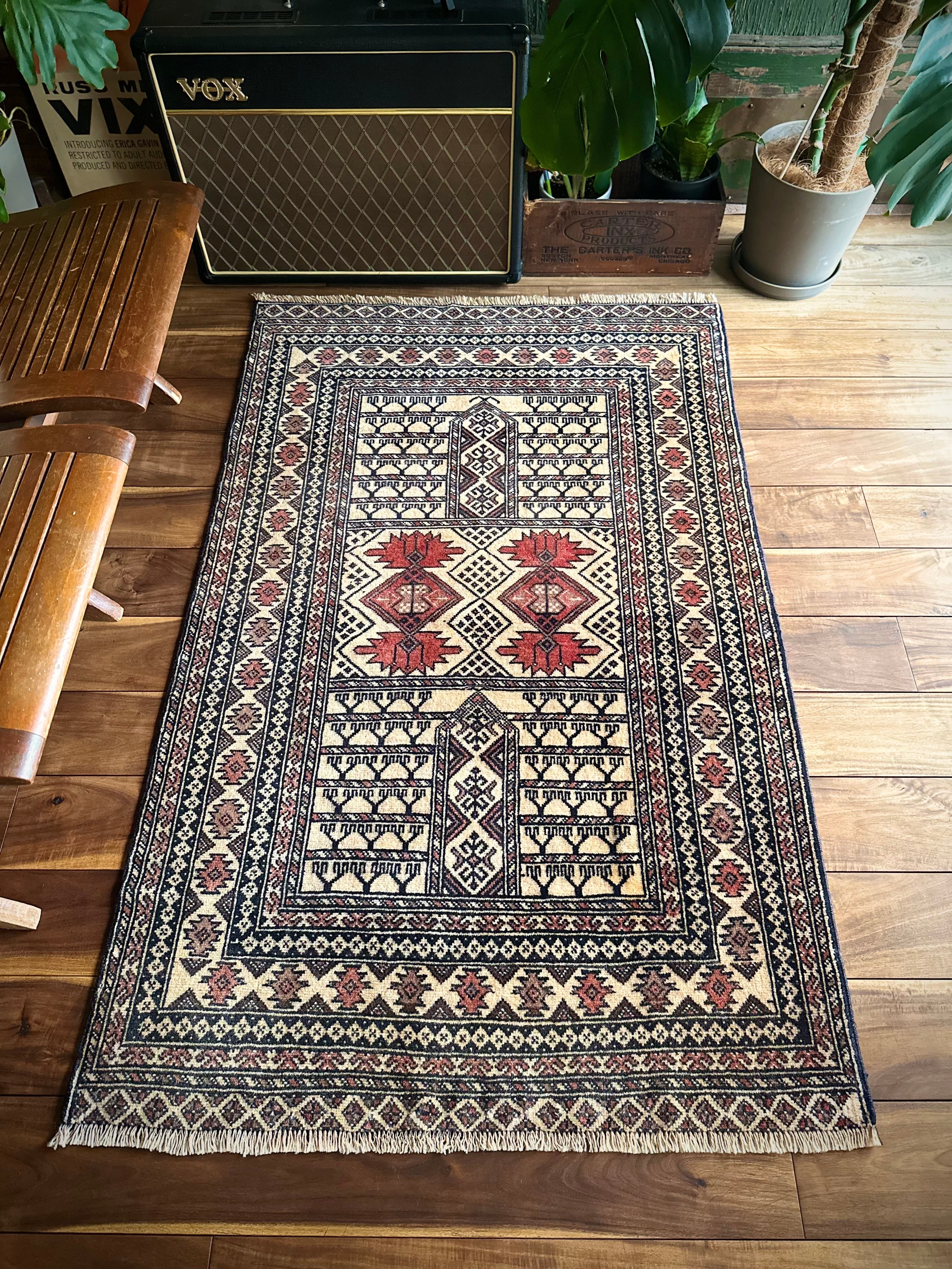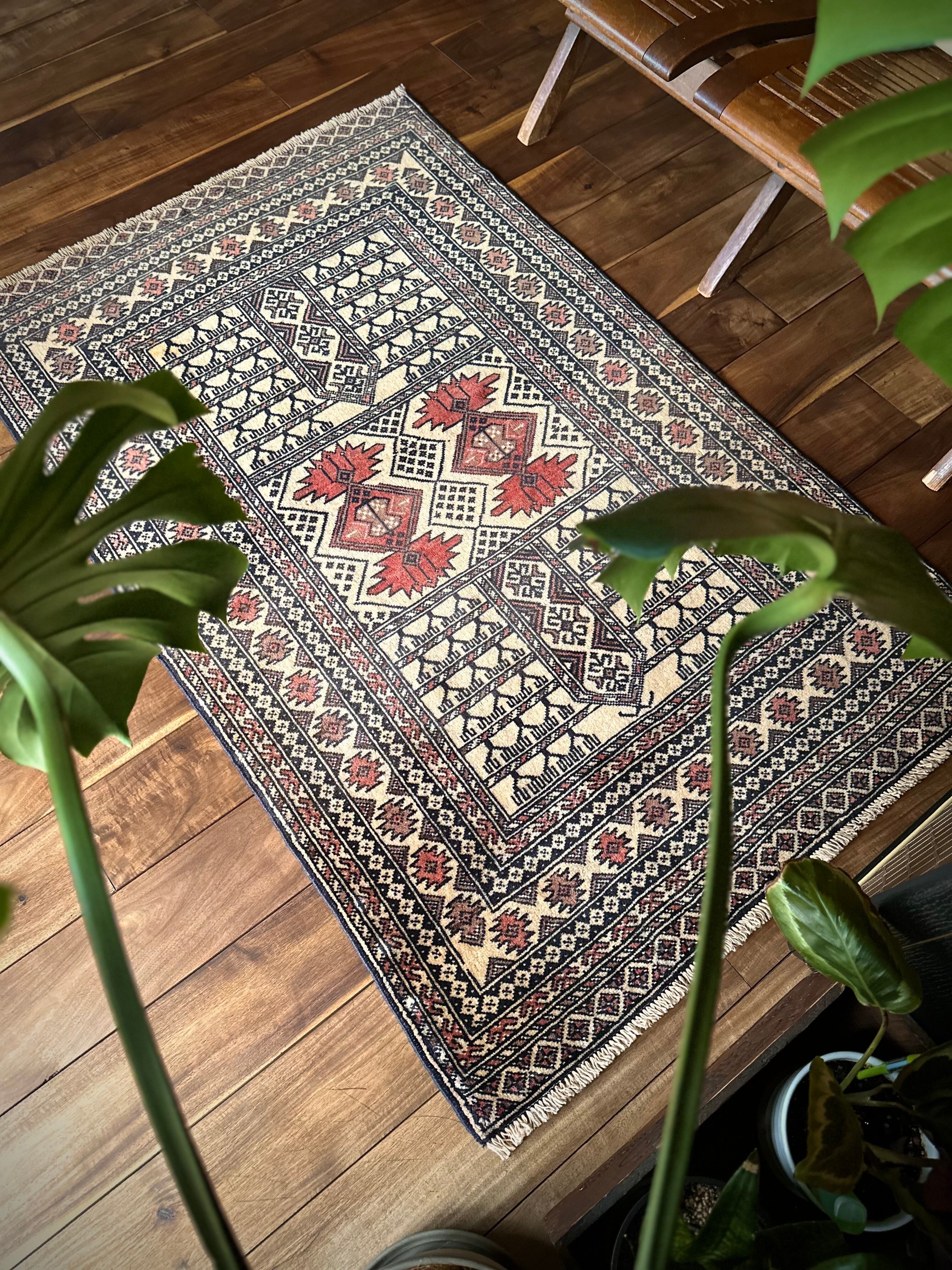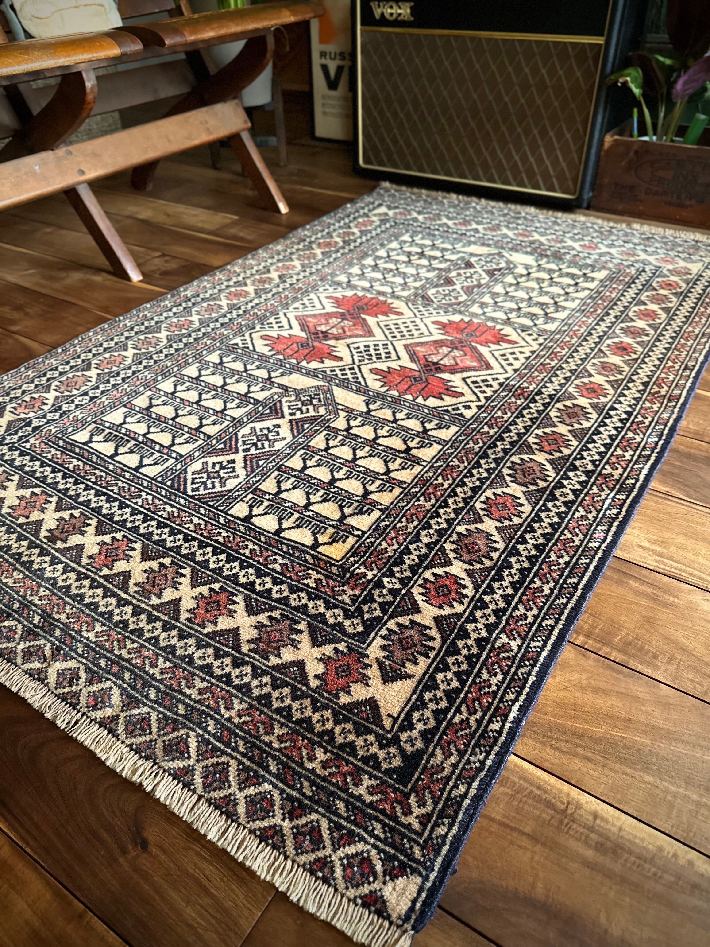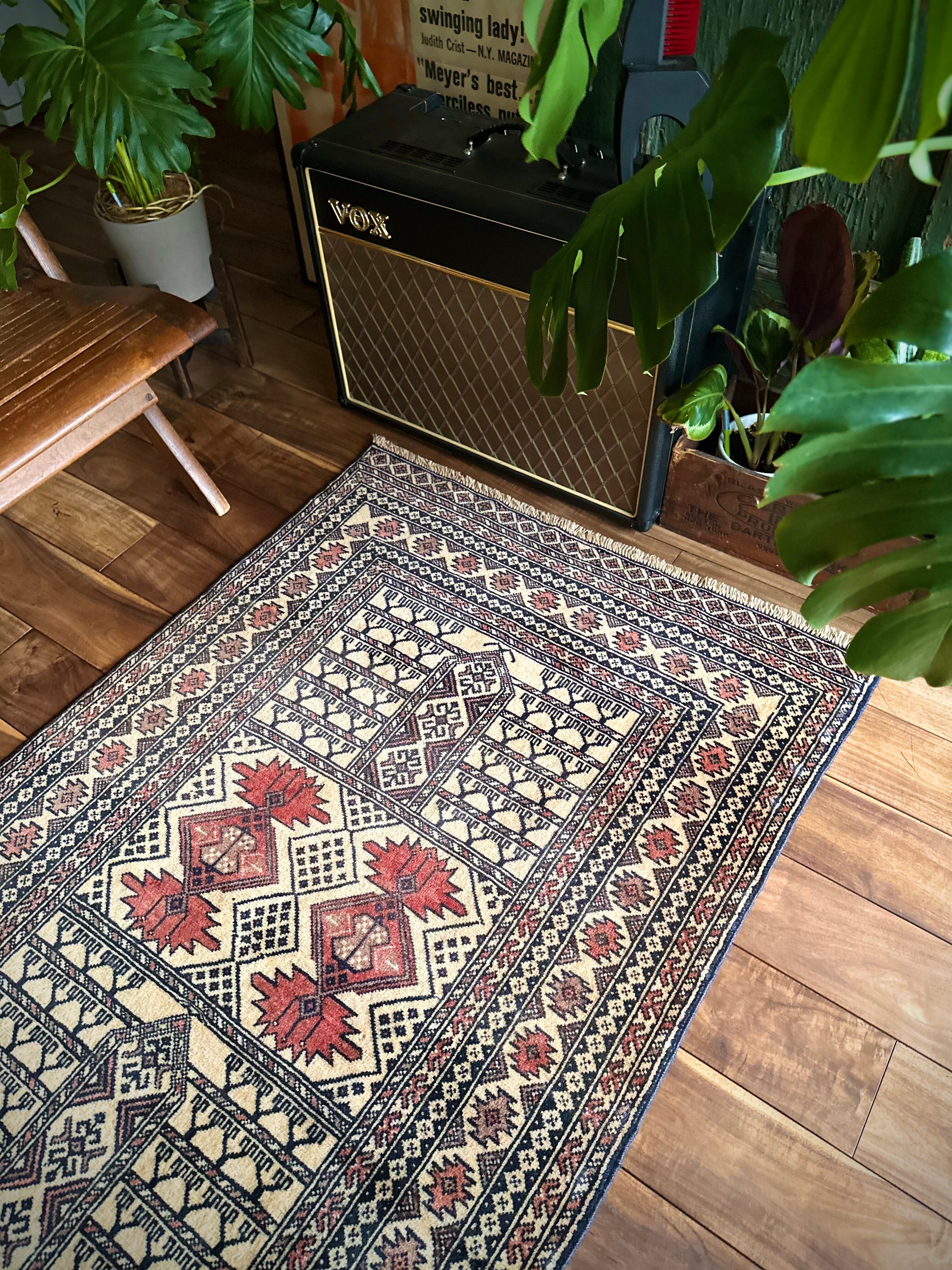 最後にラグそのものに関しては羊毛特有の匂いがあり、採寸は中央付近で計測していますが、手織りならではの歪みによる誤差や水洗いクリーニングによる縮み、また草木染めによる経年劣化の色ムラなどがありますが、それもまたヴィンテージラグの魅力かとご理解ください。