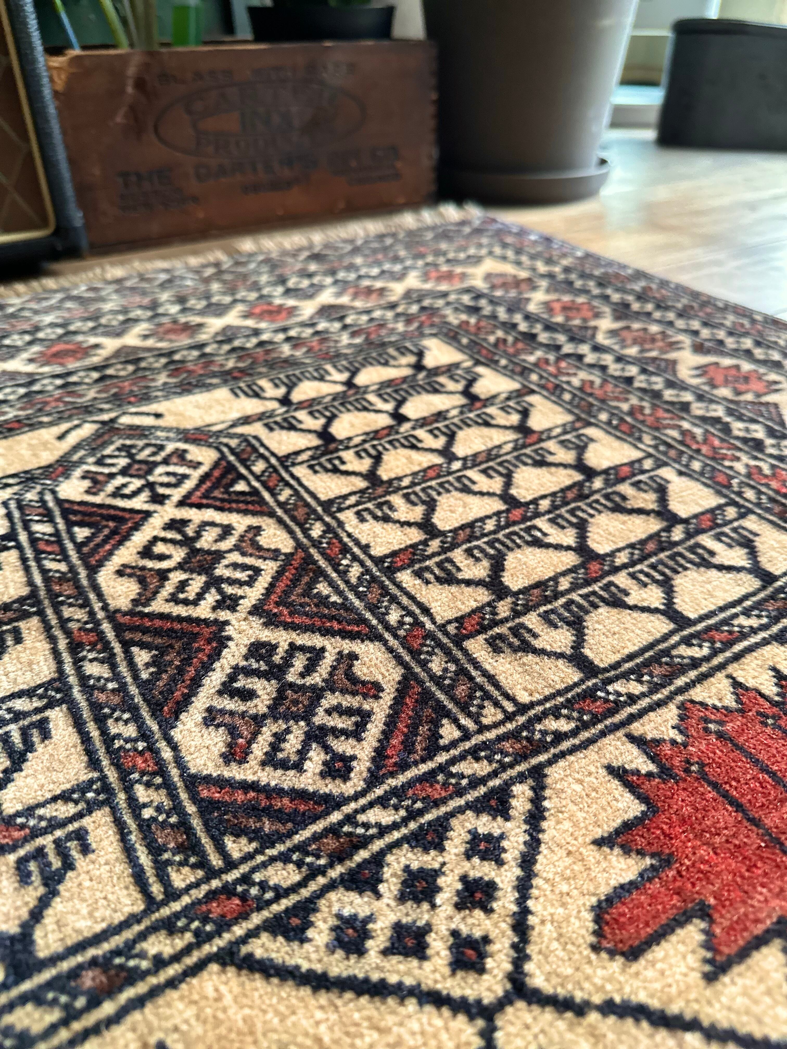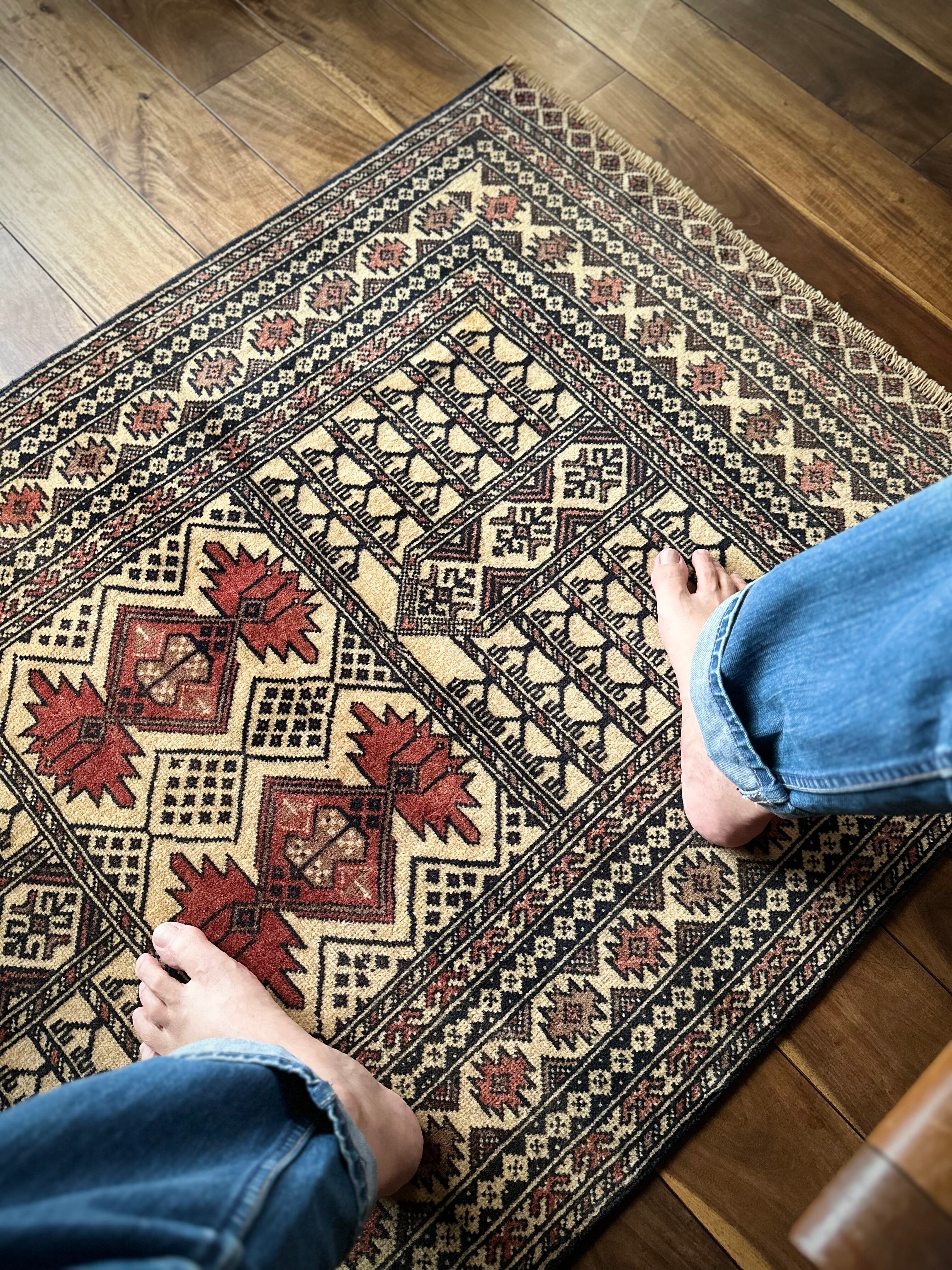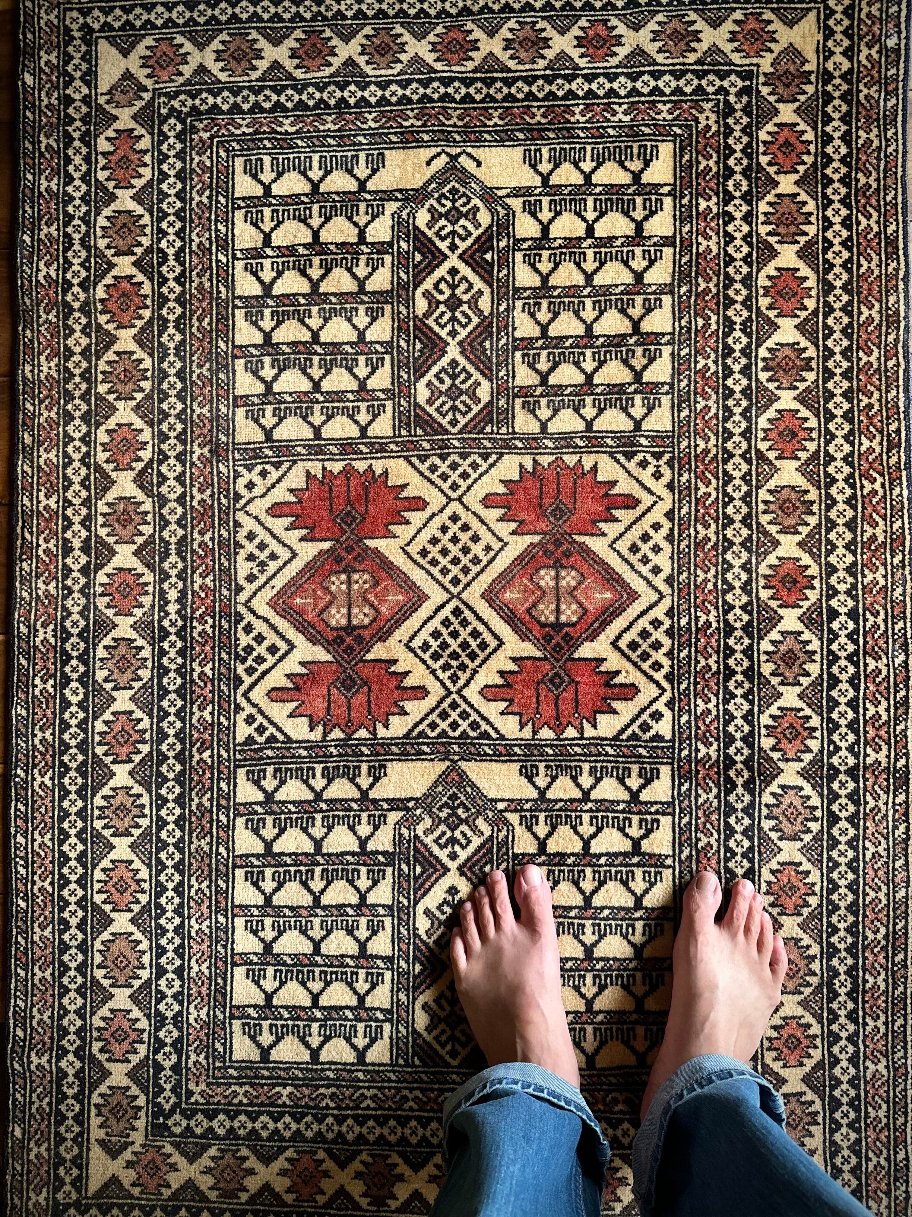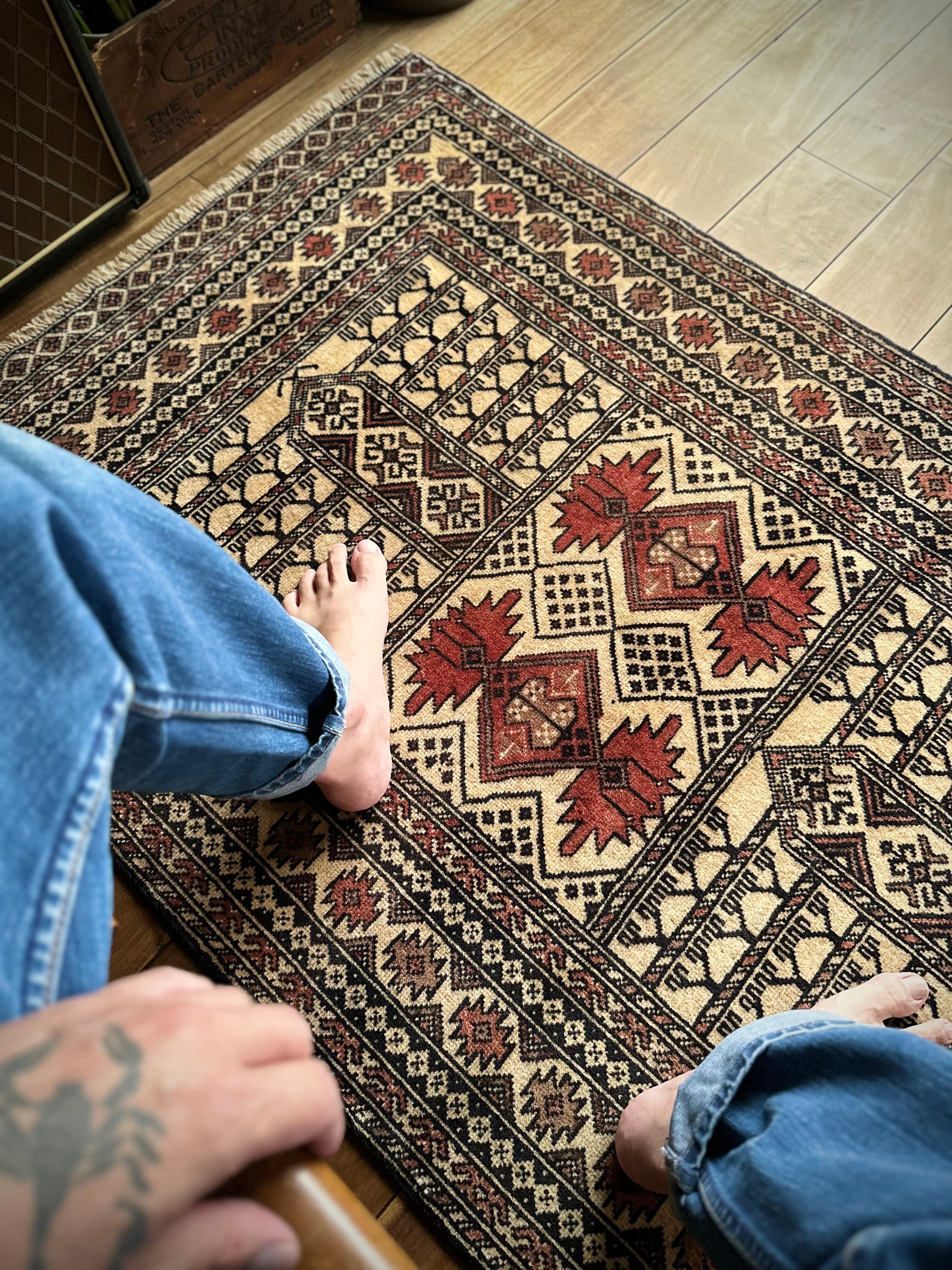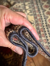 最後にラグそのものに関しては羊毛特有の匂いがあり、採寸は中央付近で計測していますが、手織りならではの歪みによる誤差や水洗いクリーニングによる縮み、また草木染めによる経年劣化の色ムラなどがありますが、それもまたヴィンテージラグの魅力かとご理解ください。