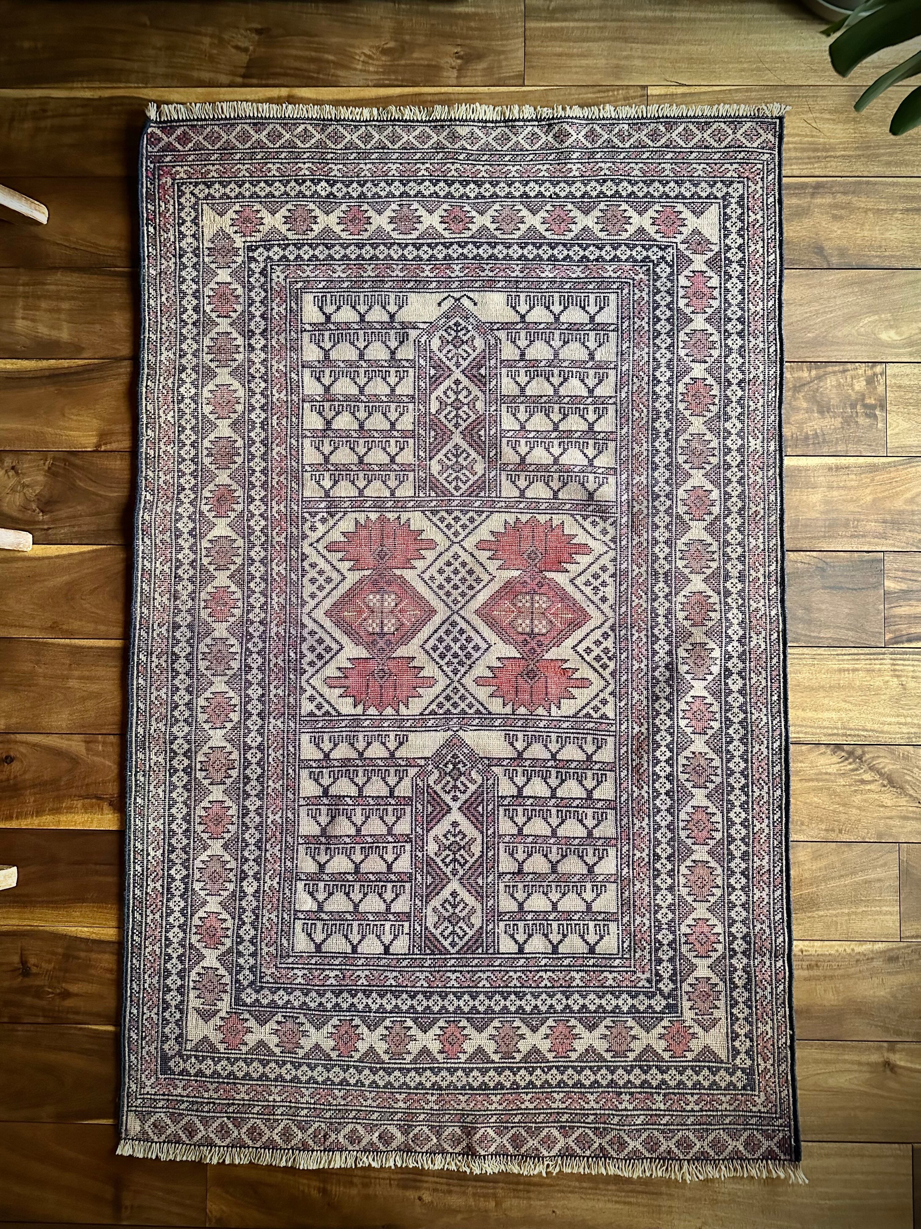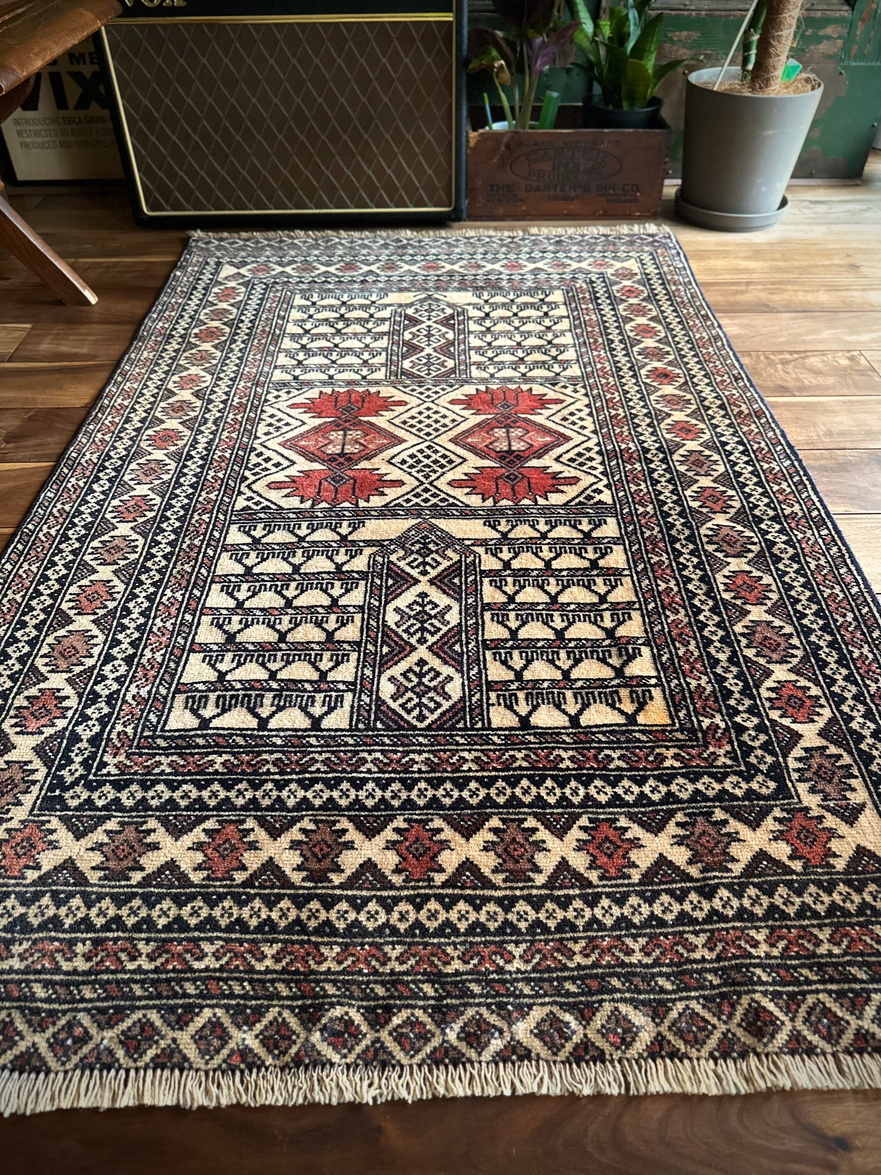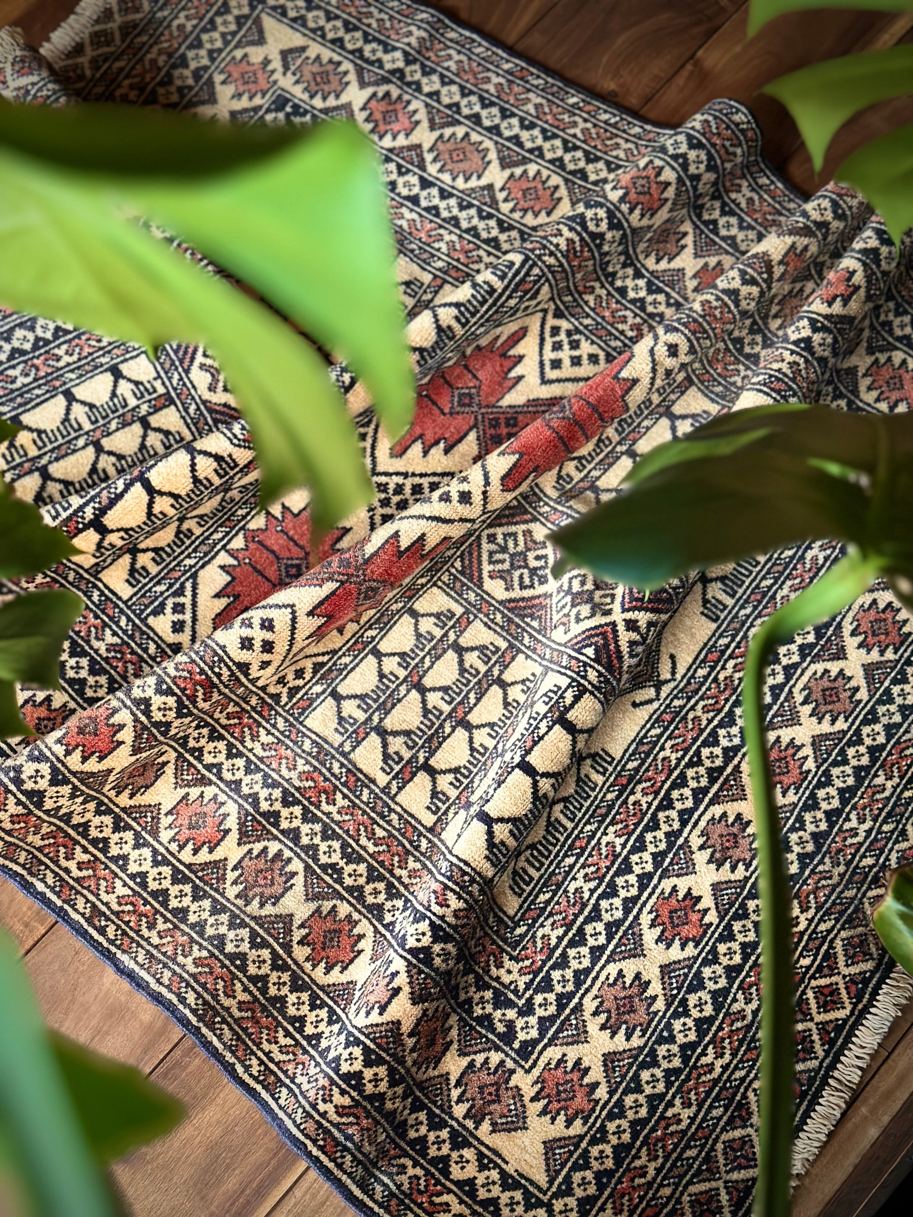 無染色の羊毛をベースに緻密に計算され尽くされた細かな構図がその部族の律儀さを表しているこちらは、アフガニスタン北部に居住するトルクメン族のトライバルラグで、パシュトゥーン系の工房で製作される細やかな織りのアリホジャと呼ばれる1枚になります。