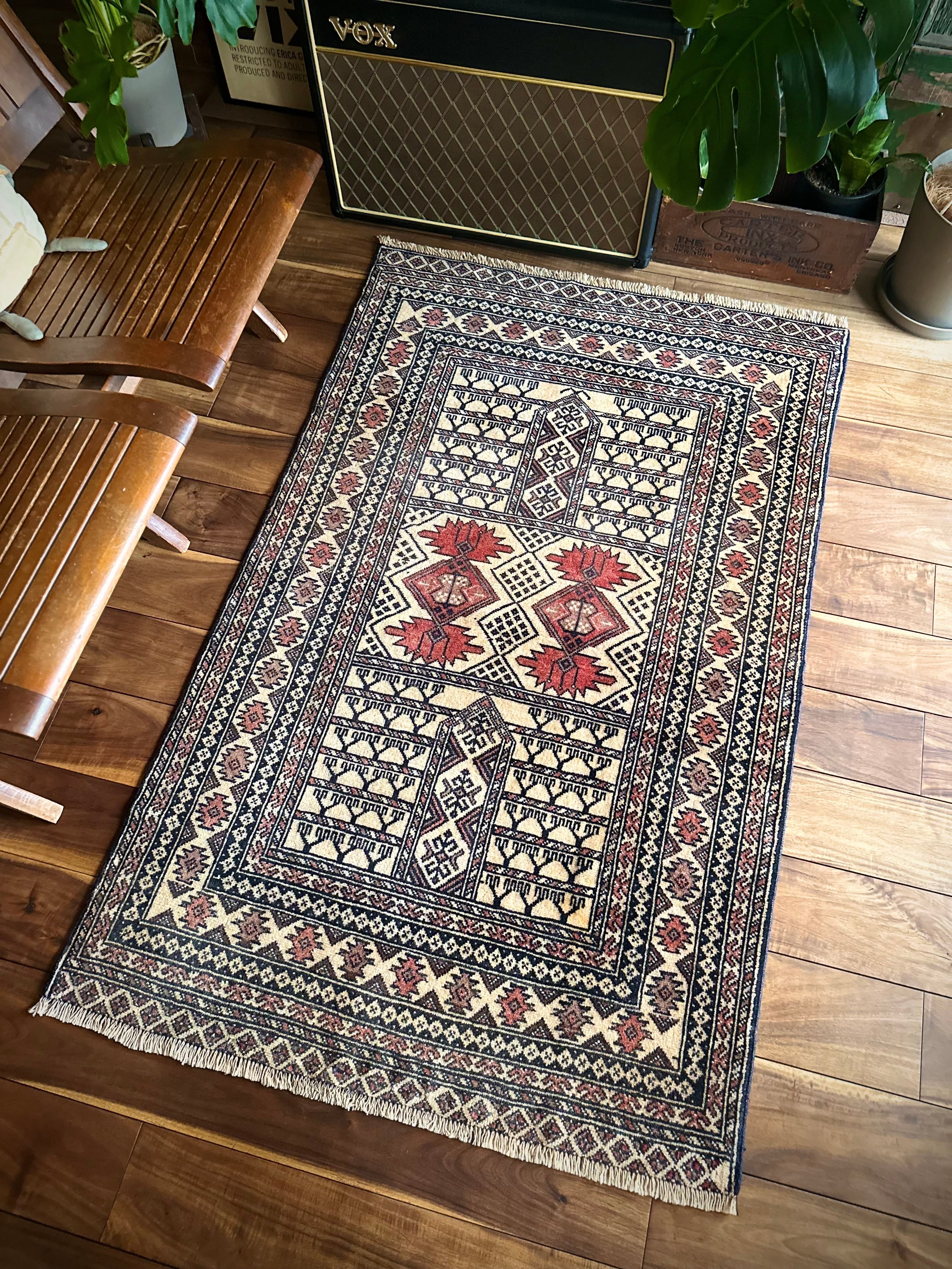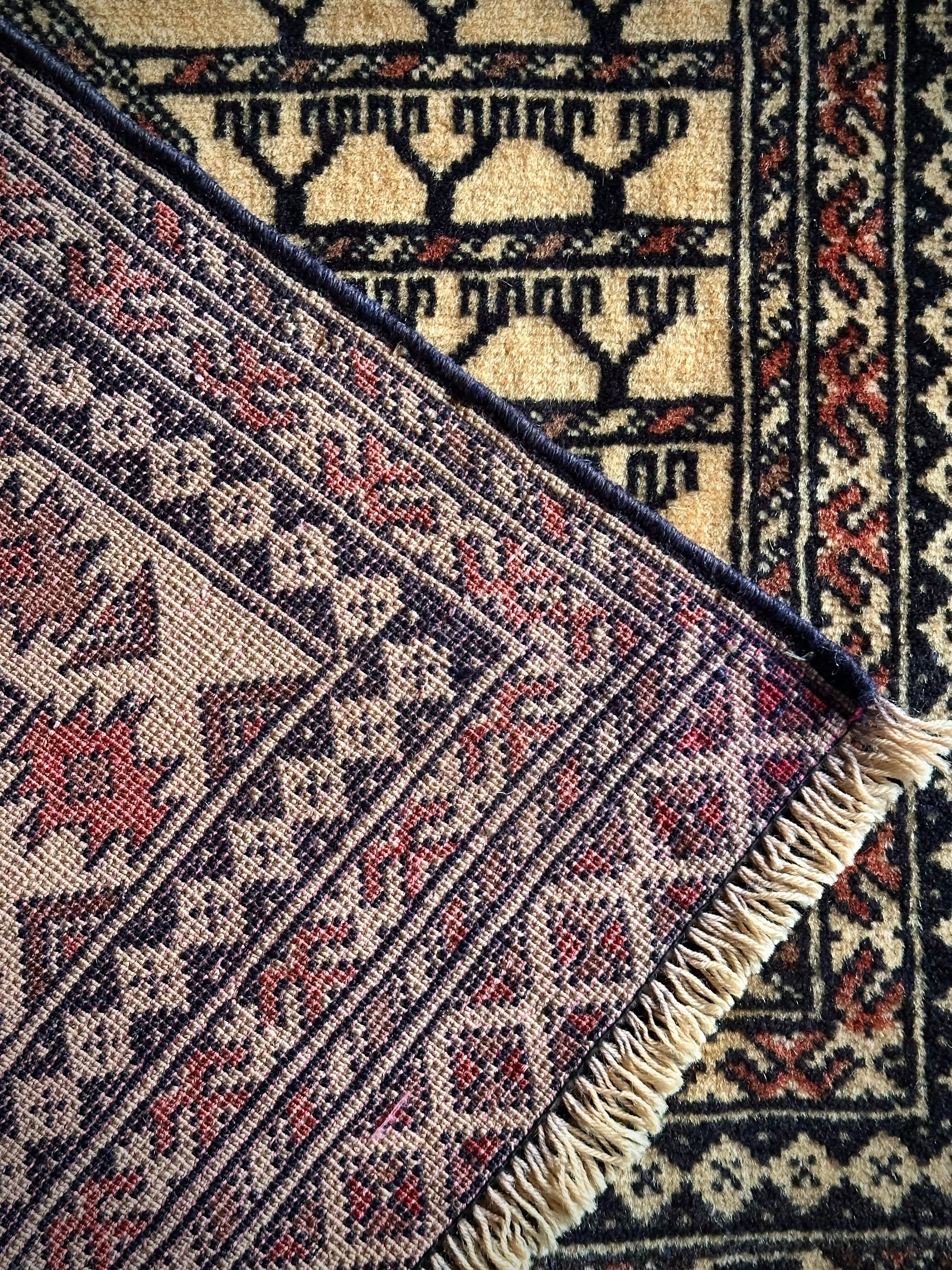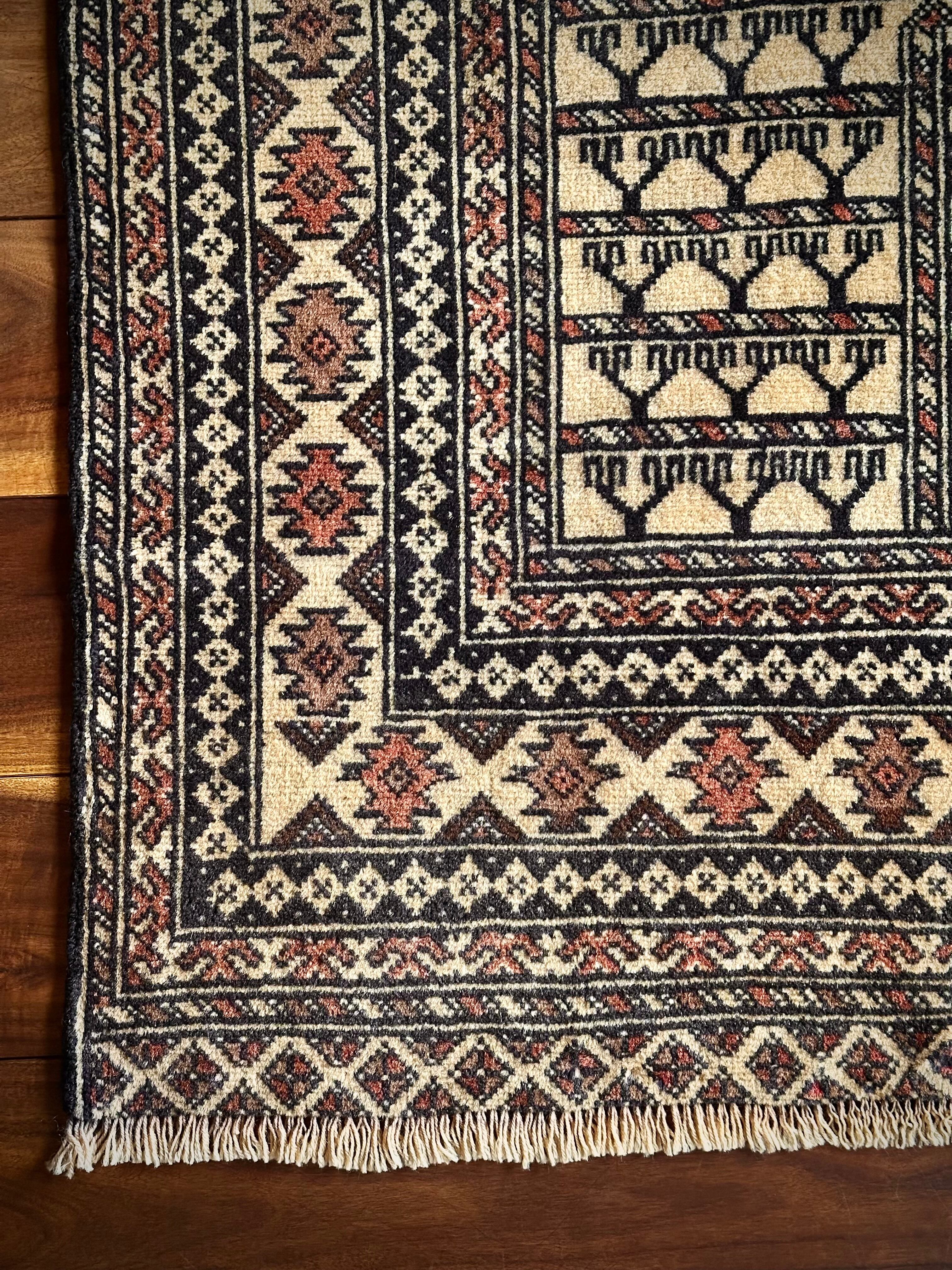 無染色の羊毛をベースに緻密に計算され尽くされた細かな構図がその部族の律儀さを表しているこちらは、アフガニスタン北部に居住するトルクメン族のトライバルラグで、パシュトゥーン系の工房で製作される細やかな織りのアリホジャと呼ばれる1枚になります。