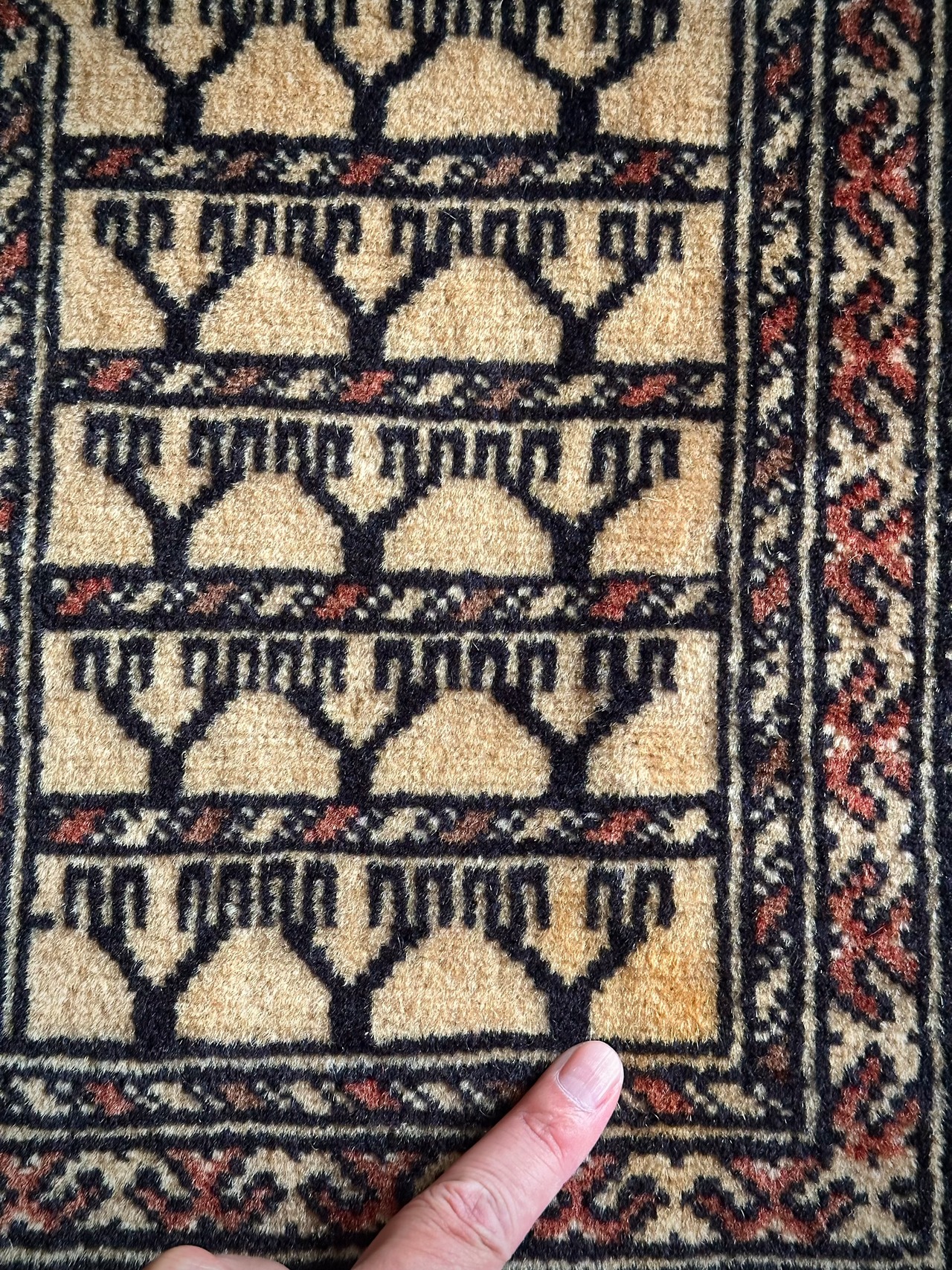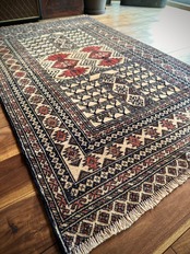 整然と並んだ細かな絵柄にはトルクメンの暖簾の役割りのようなエンシにも似た小さな紋様が織られていて、厚みはそれほどなくパイル自体も光沢の出やすい短めでサラッとした肌触りとなり、色合いもシンプルながら小さなカウチ前に適したミディアムサイズが扱い易いかと思われます。