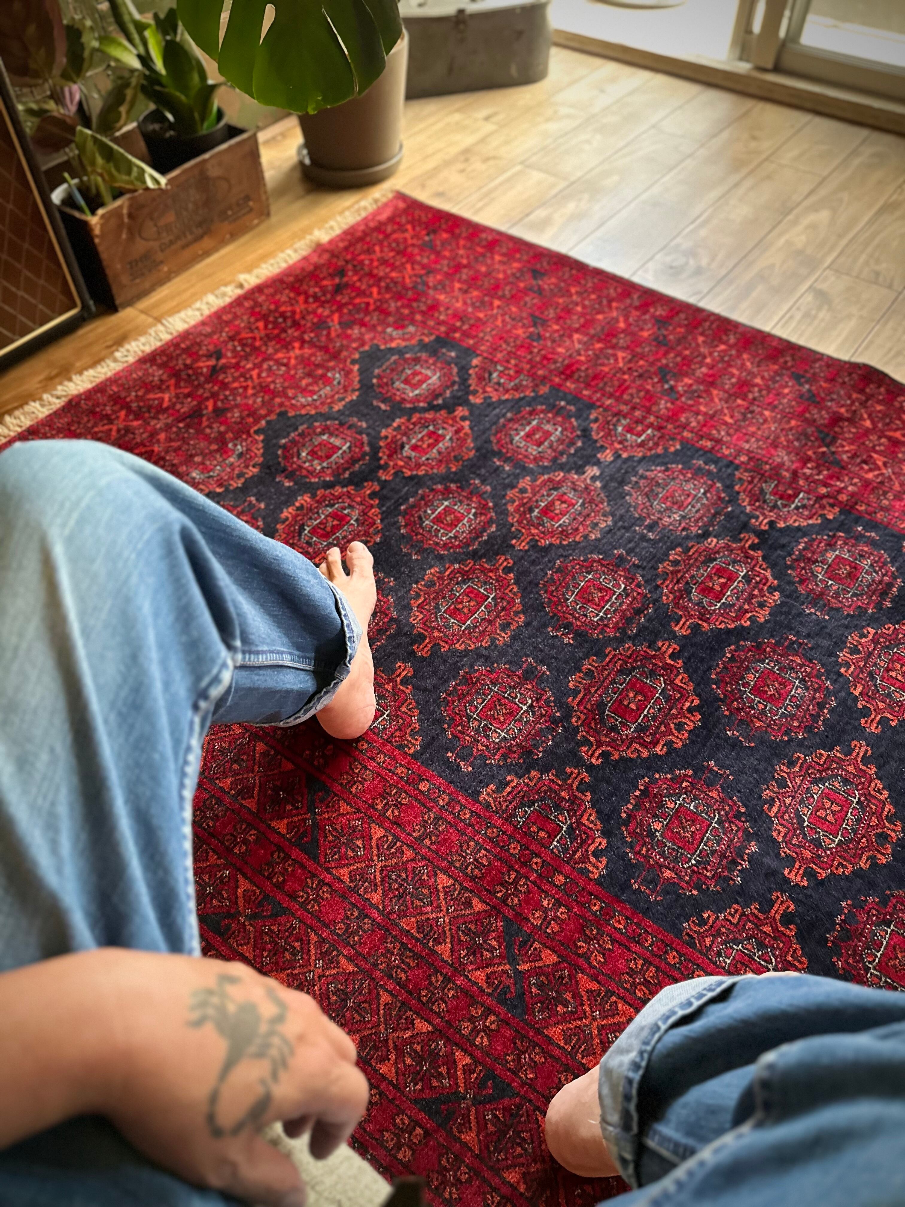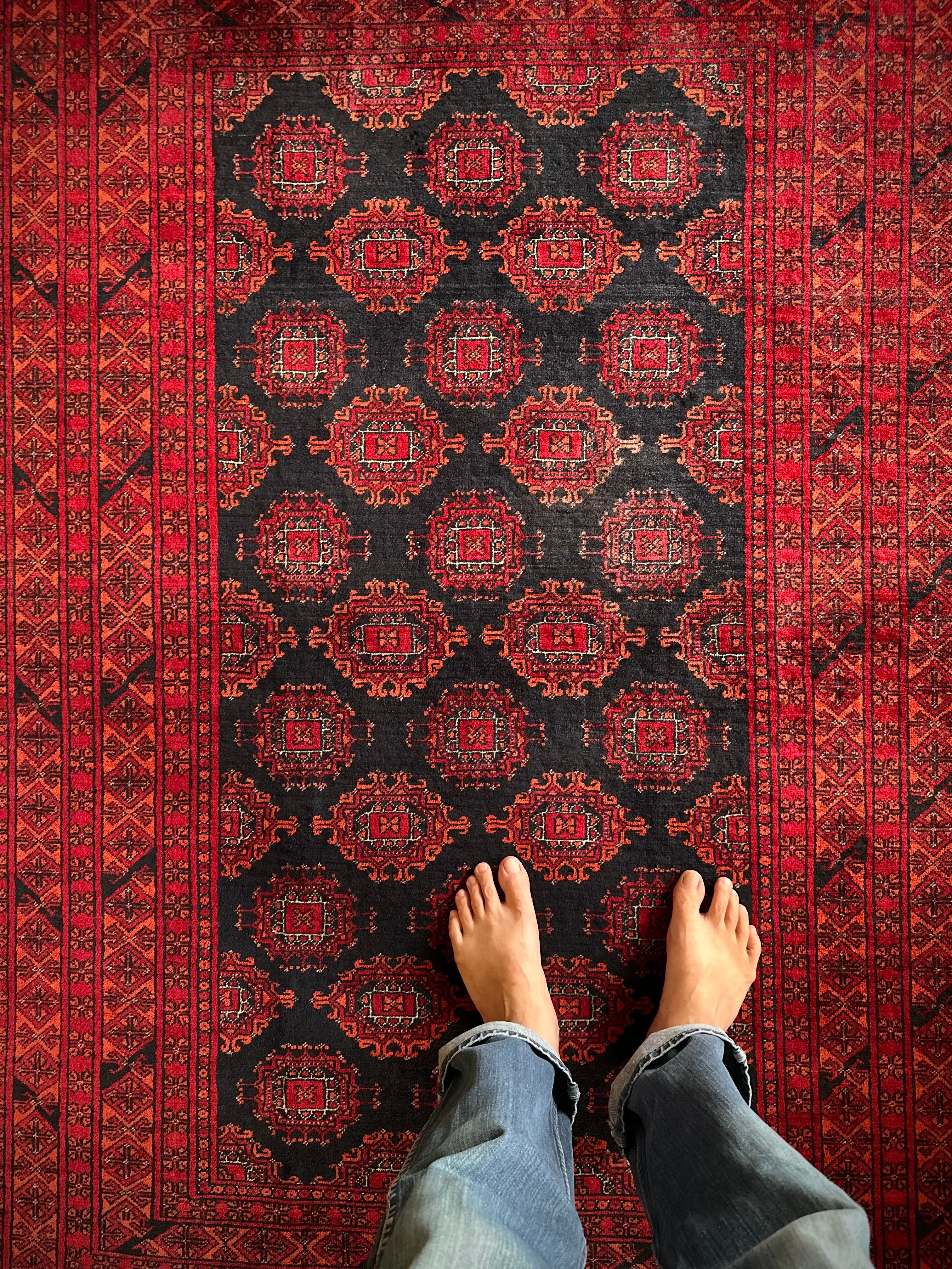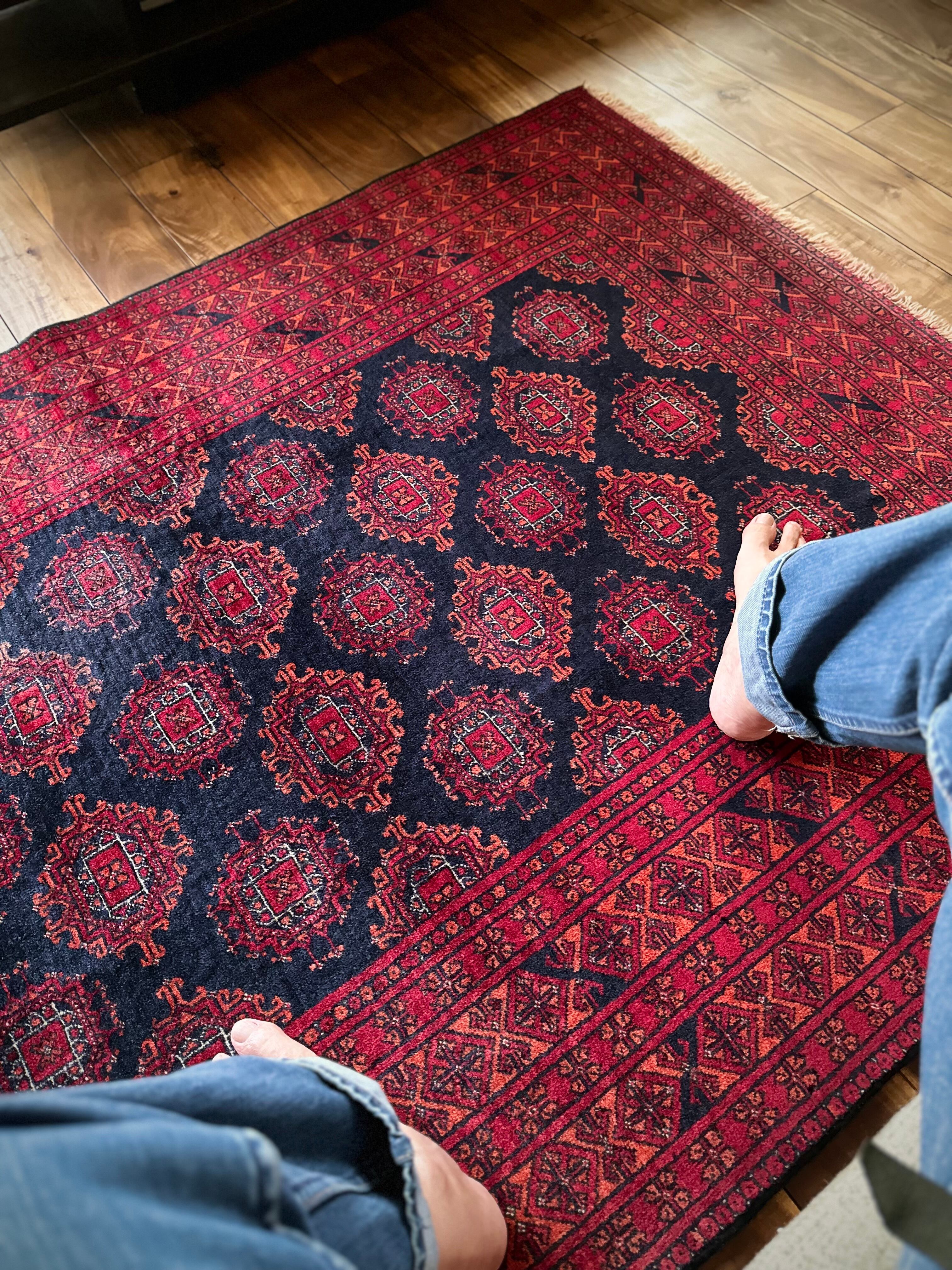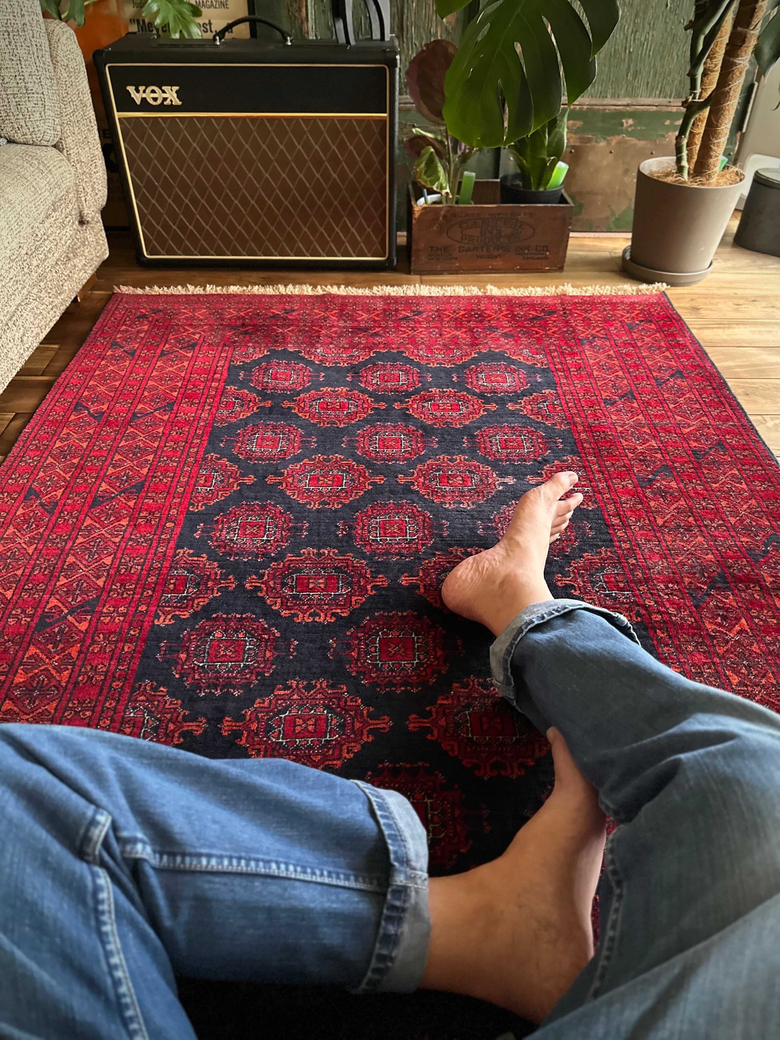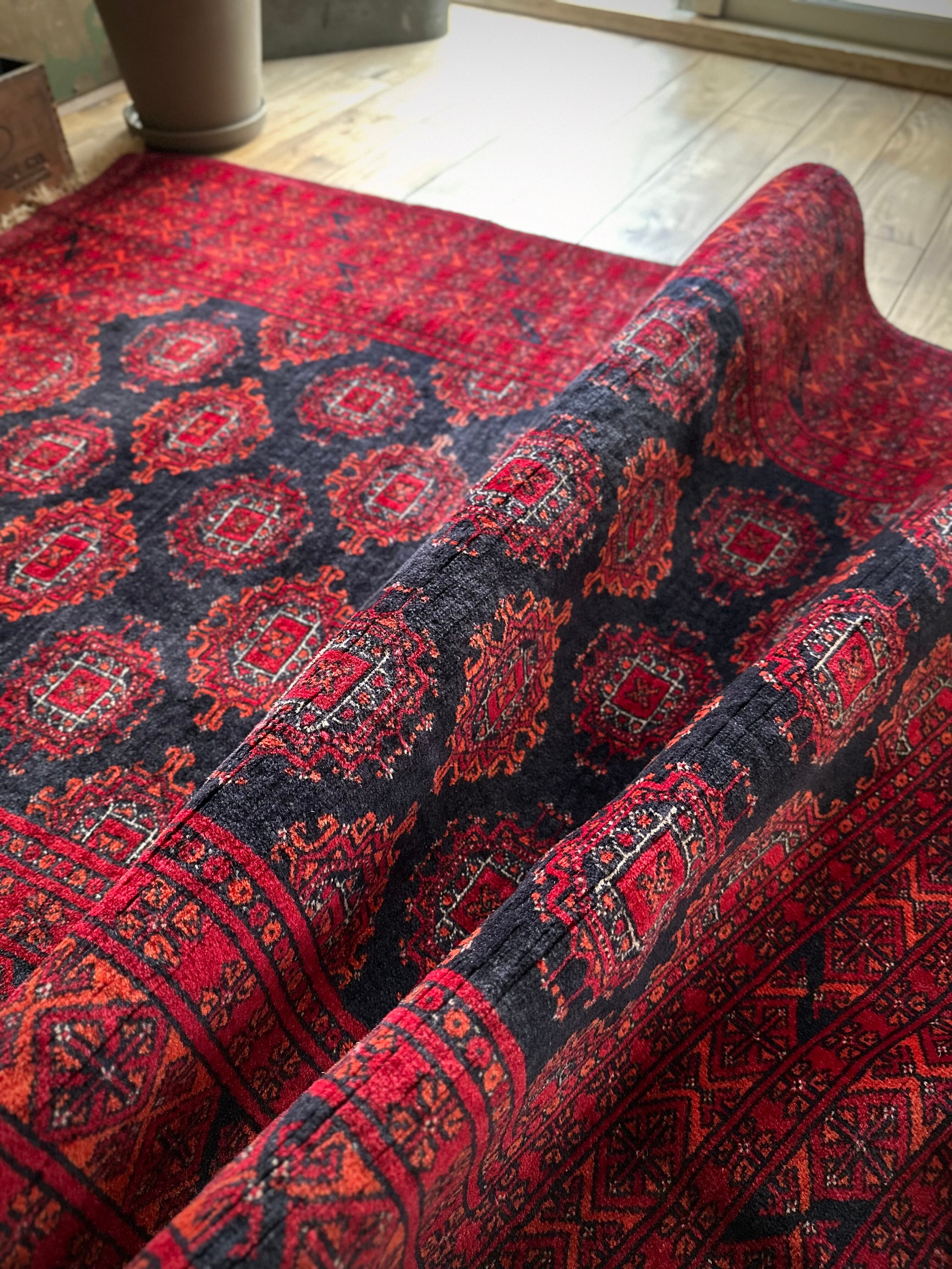 最後にラグそのものに関しては羊毛特有の匂いがあり、採寸は中央付近で計測していますが、手織りならではの歪みによる誤差や水洗いクリーニングによる縮み、また草木染めによる経年劣化の色ムラなどがありますが、それもまたヴィンテージラグの魅力かとご理解ください。