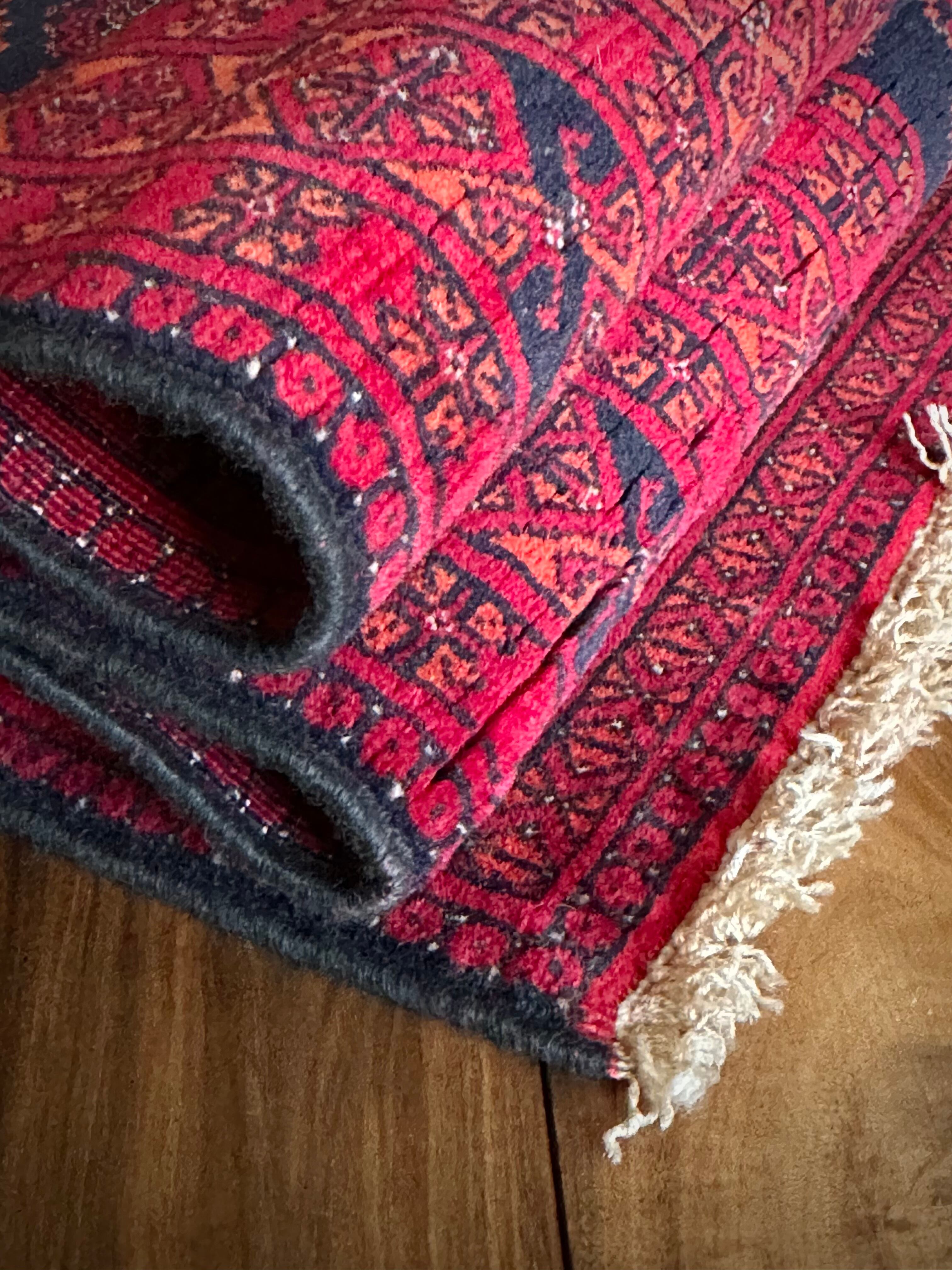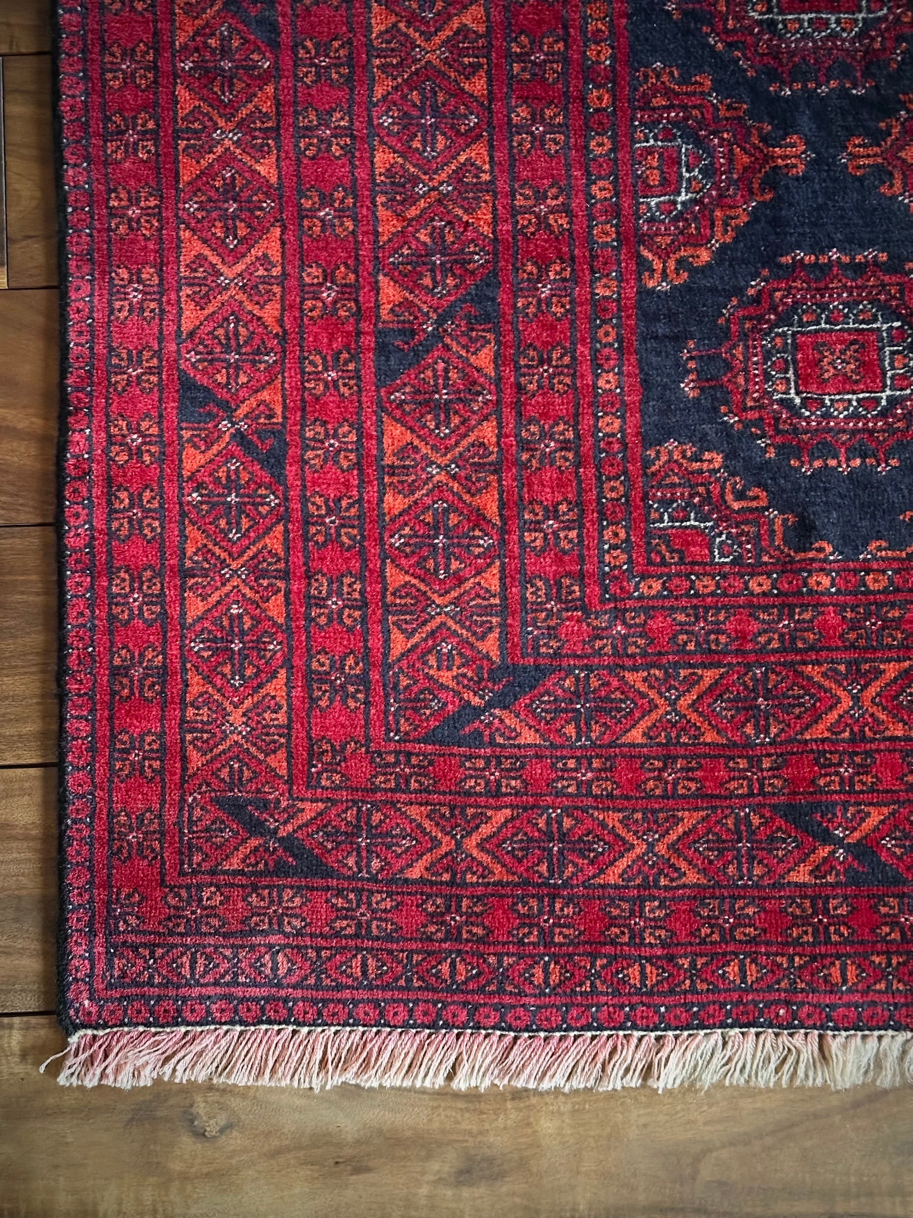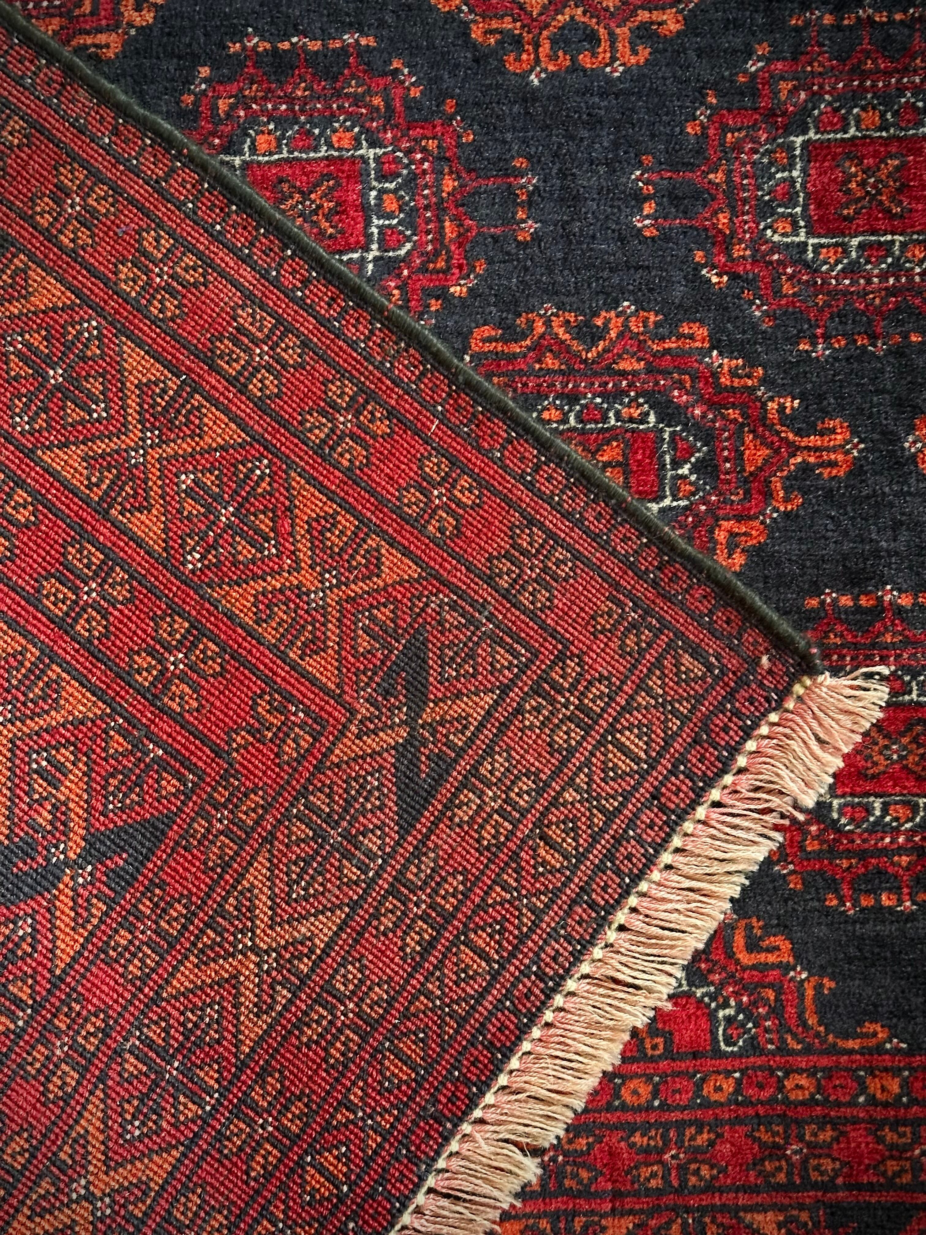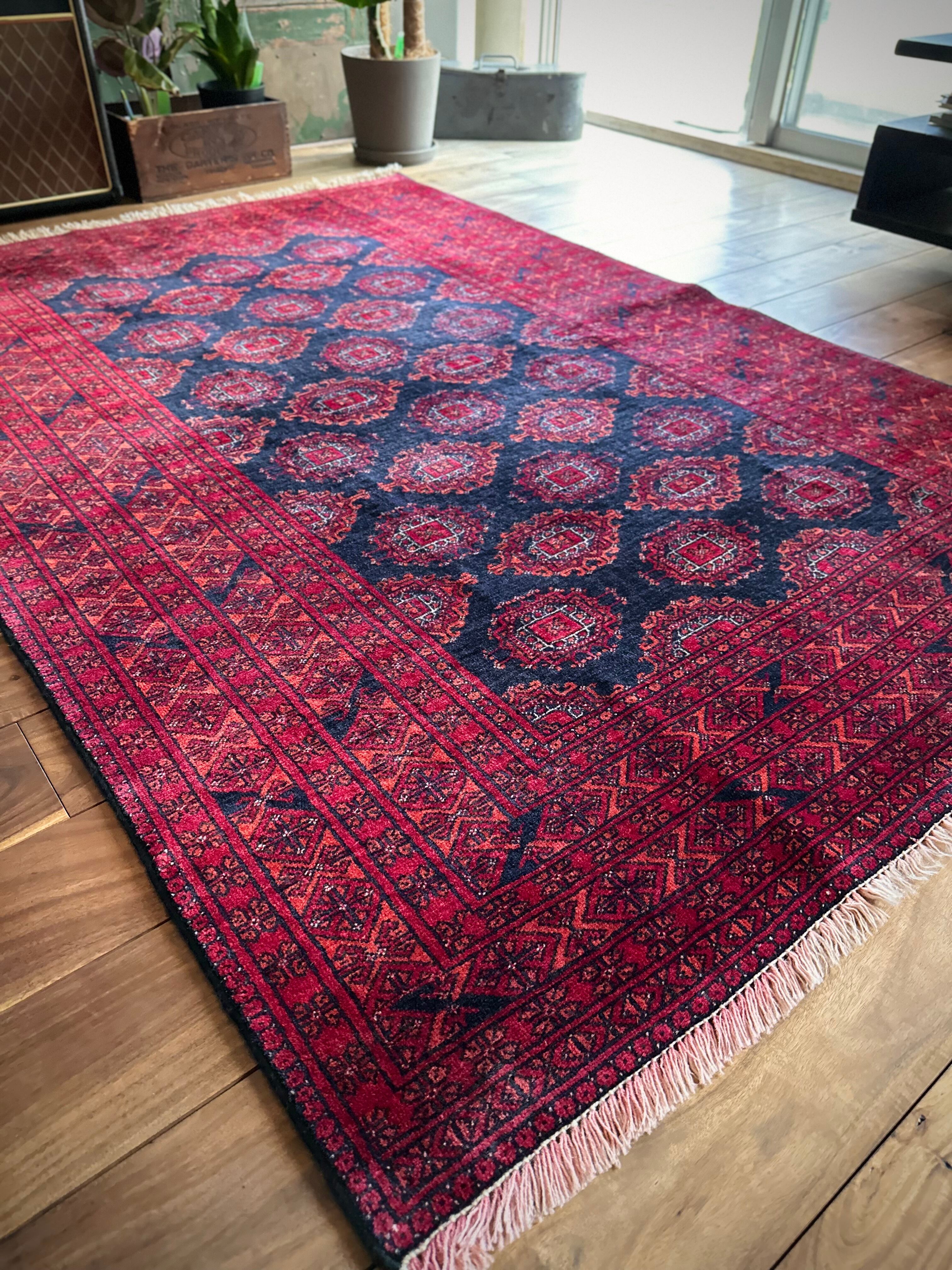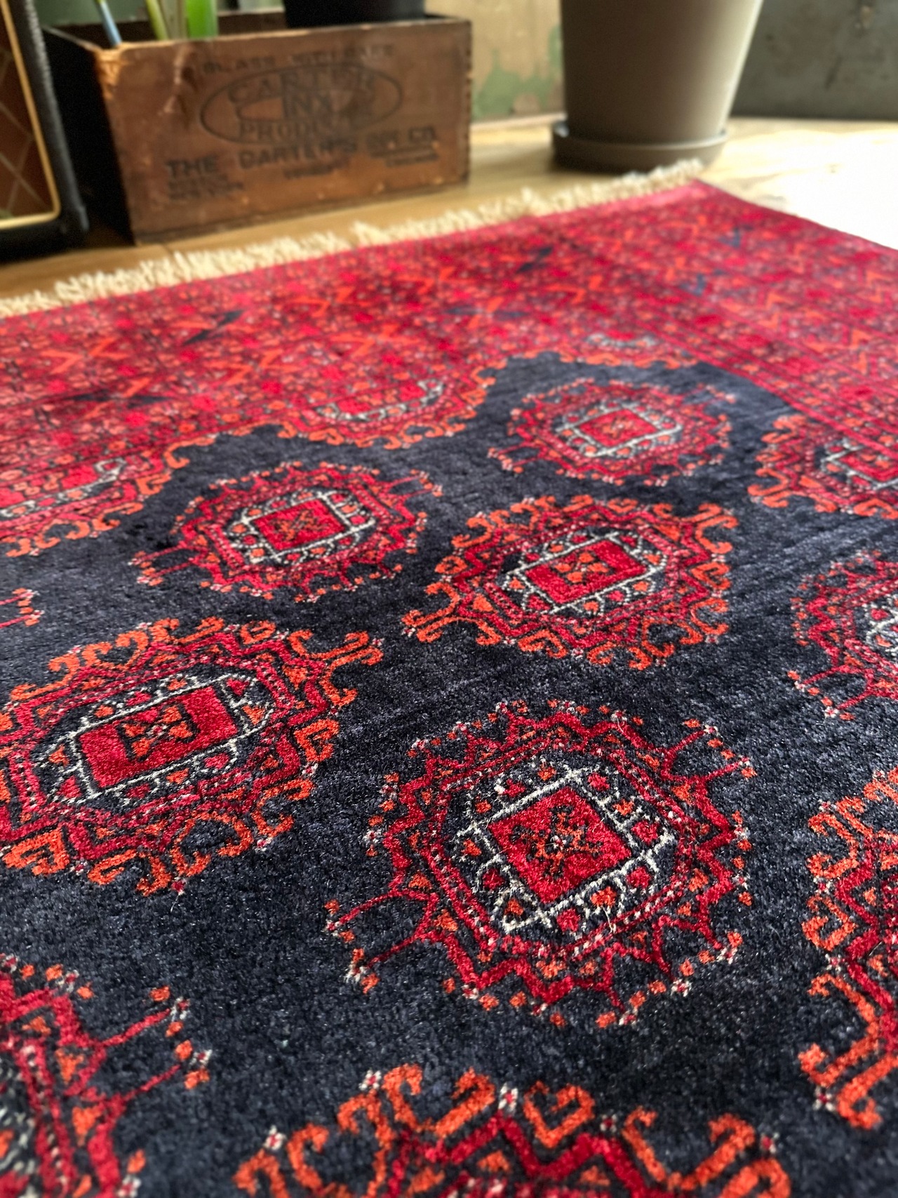 フィールドのネイビーとは対照的に大胆な赤色に巧みなオレンジ使いが目を見張るこちらは、アフガニスタン北部に居住するトルクメン族のトライバルラグで、ミルフィーユ状のボーダーにギュルの連続紋様がかっこいいトルクメンらしい1枚になります。