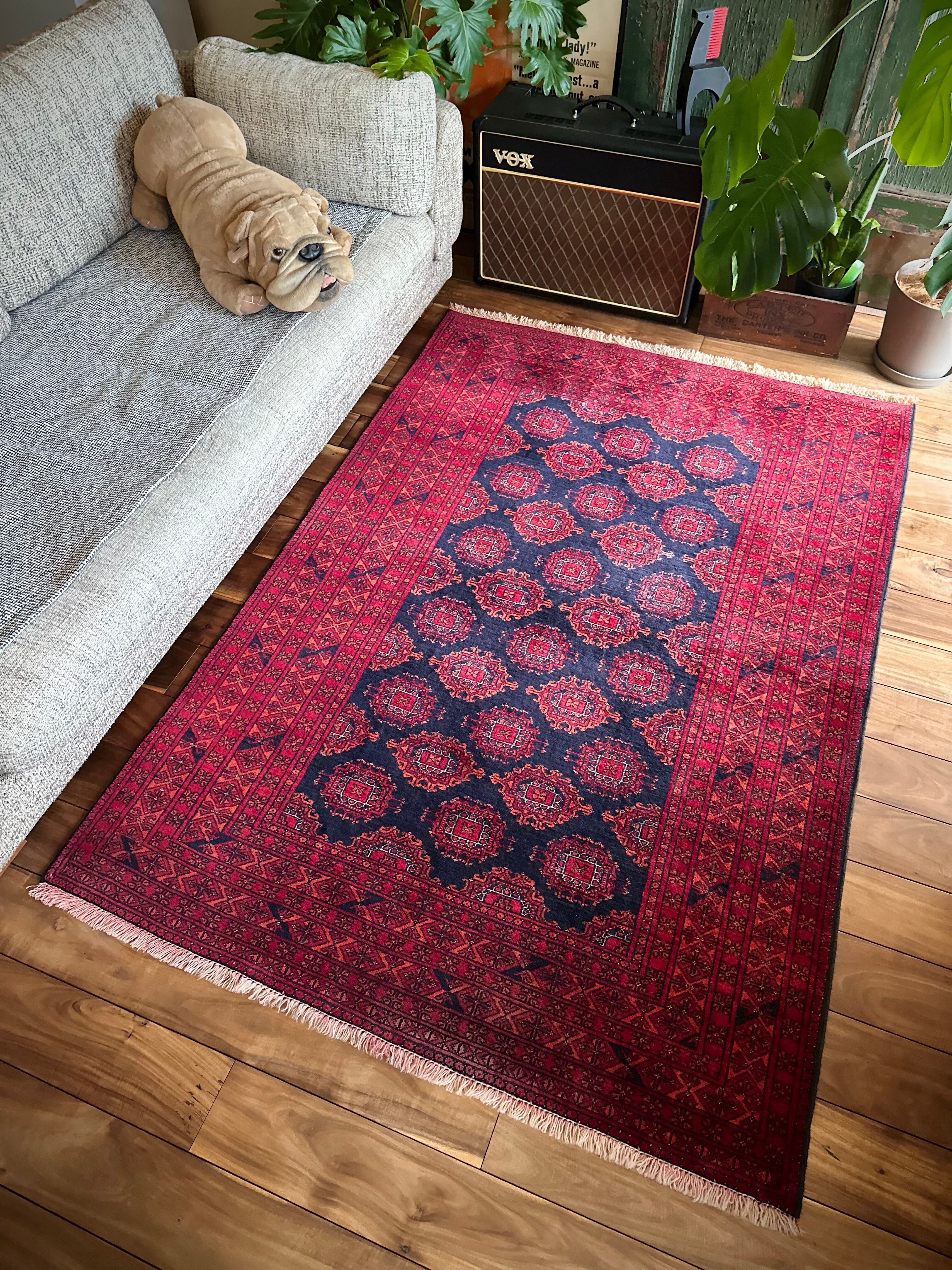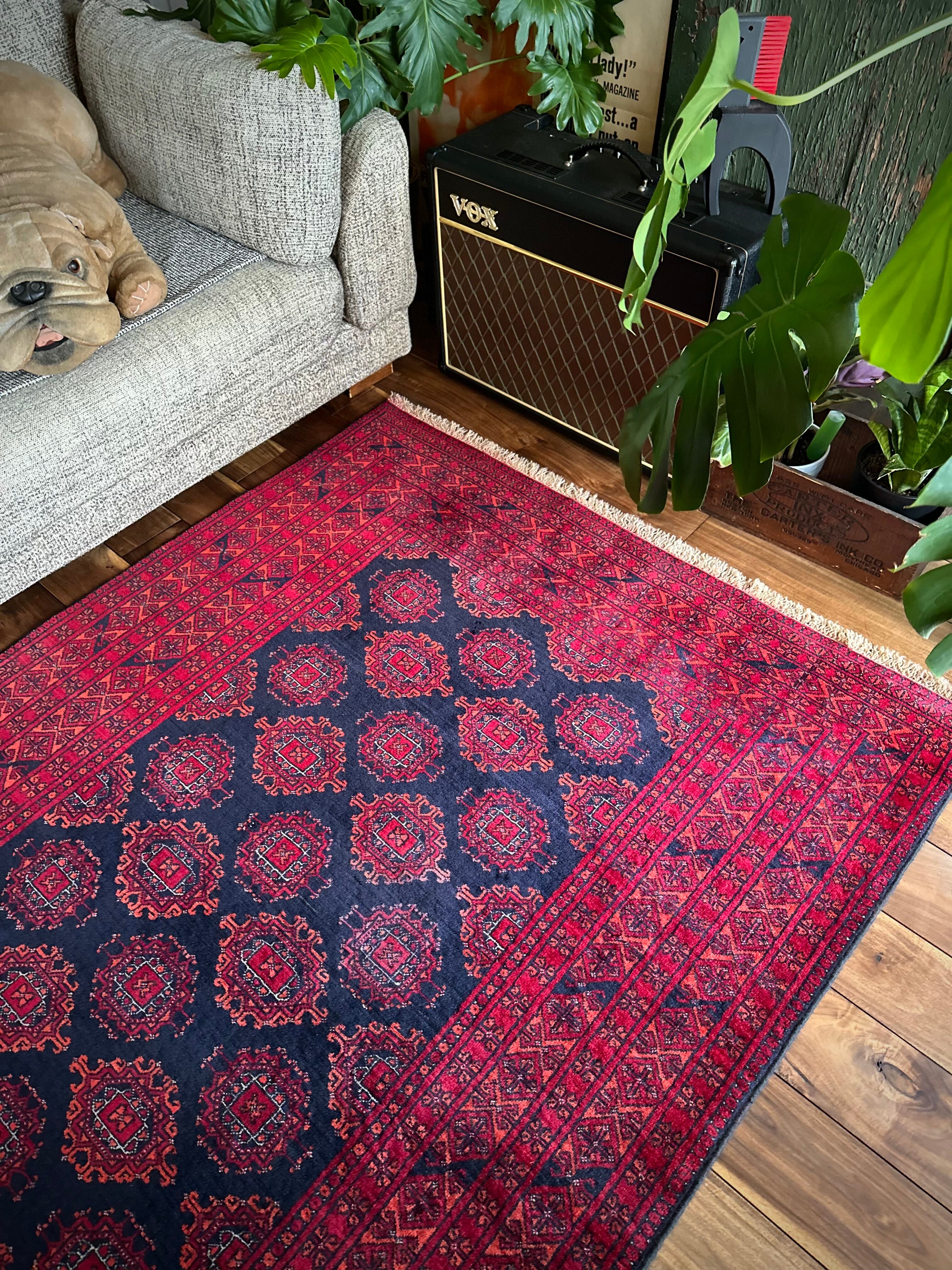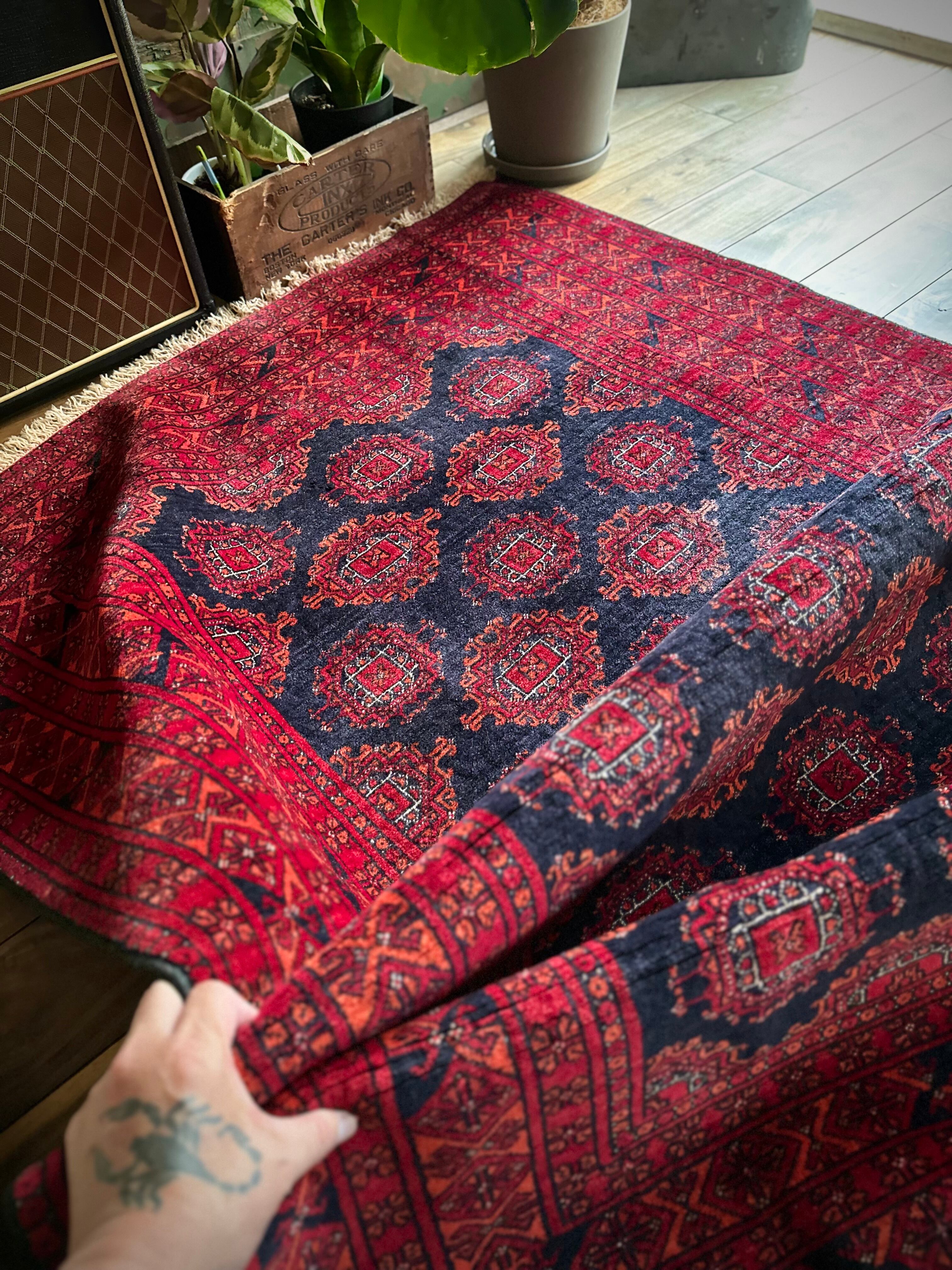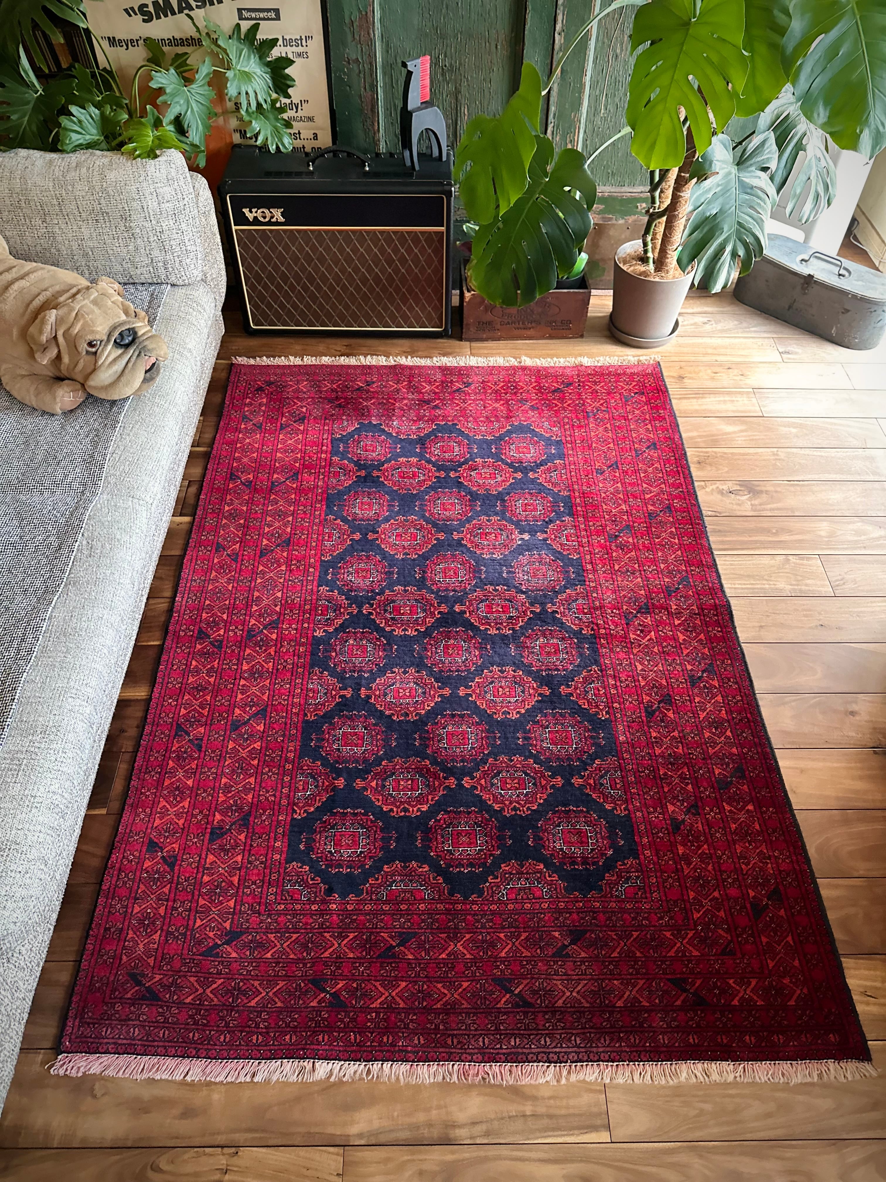 フィールドのネイビーとは対照的に大胆な赤色に巧みなオレンジ使いが目を見張るこちらは、アフガニスタン北部に居住するトルクメン族のトライバルラグで、ミルフィーユ状のボーダーにギュルの連続紋様がかっこいいトルクメンらしい1枚になります。