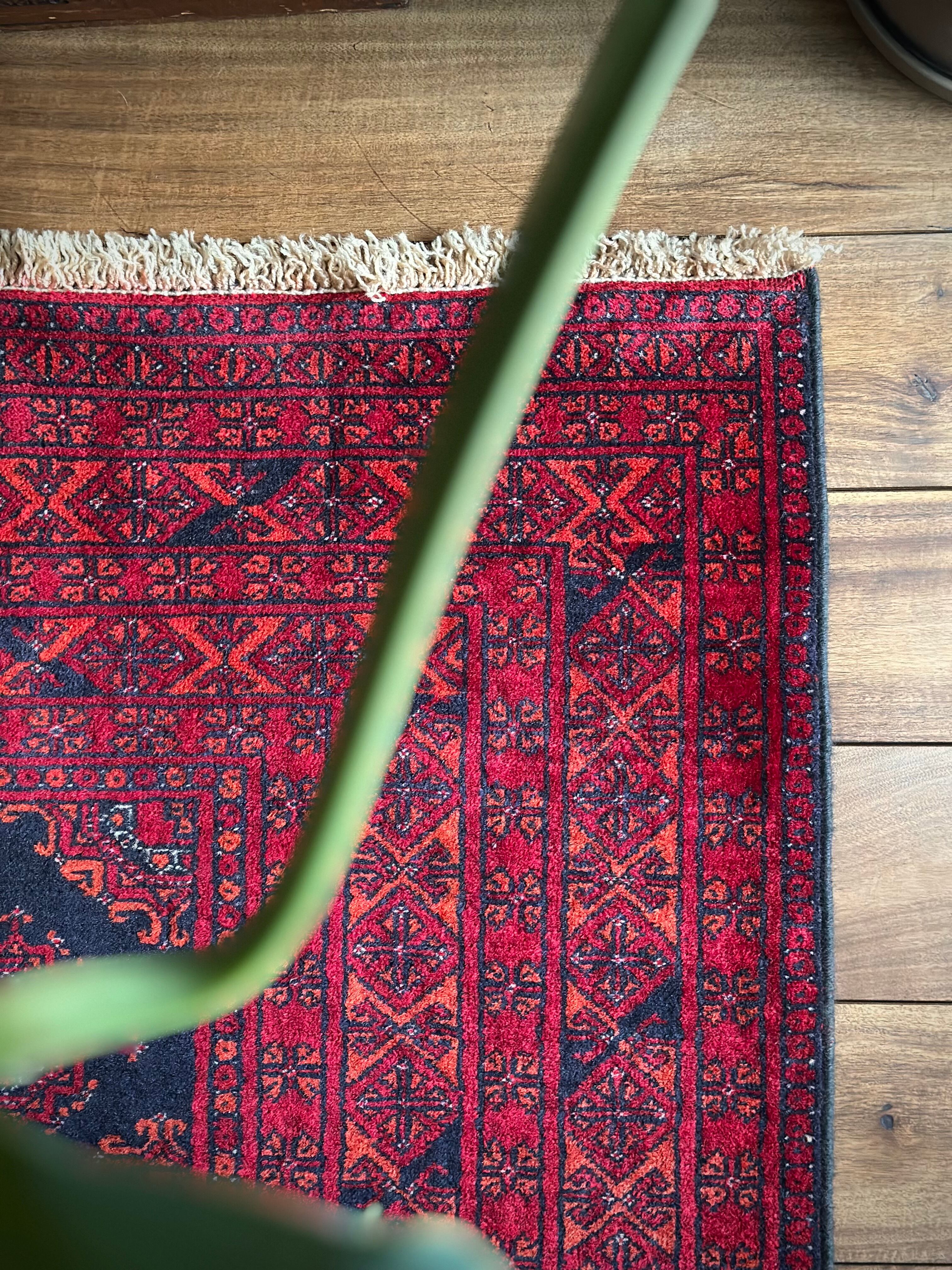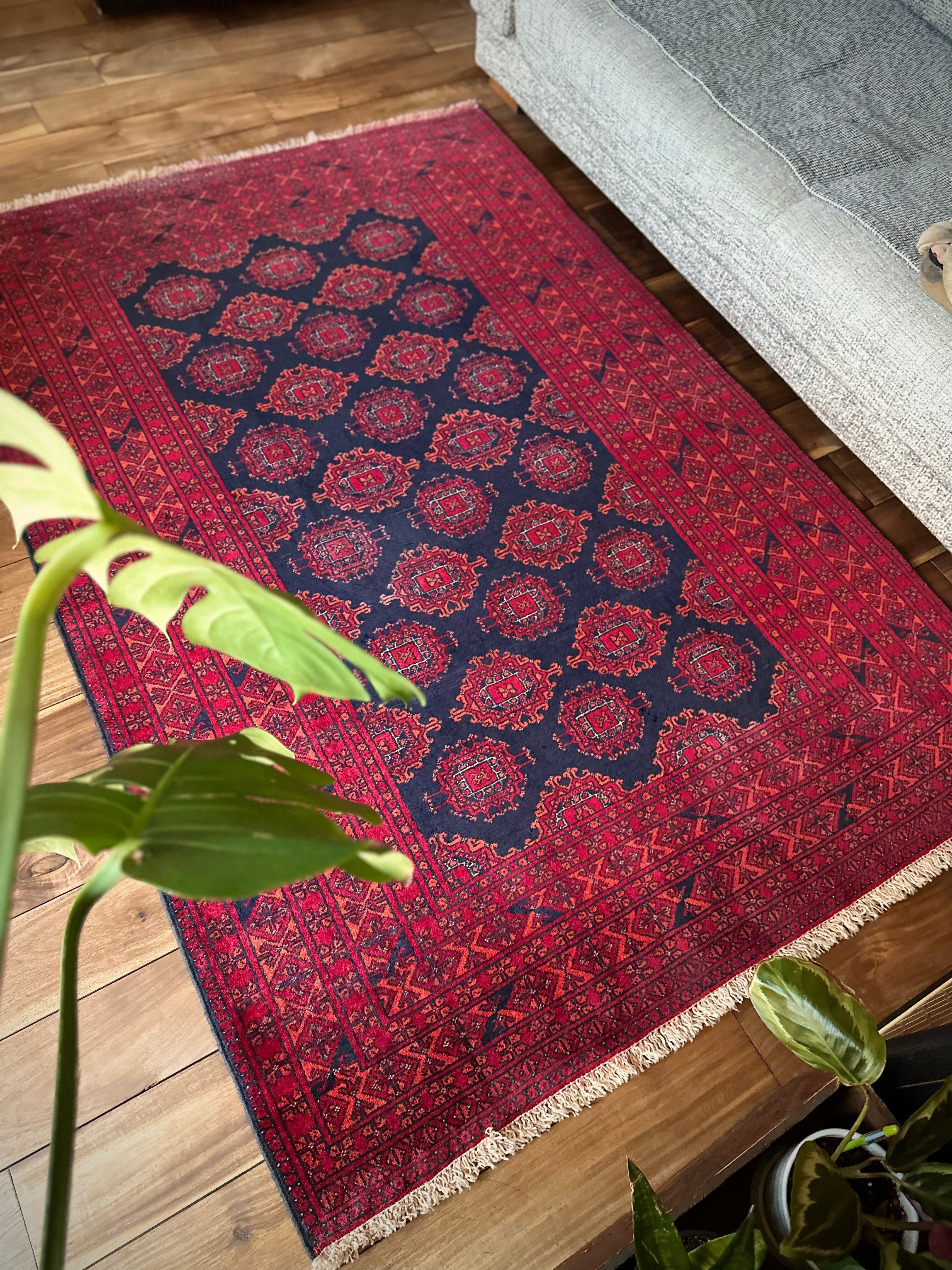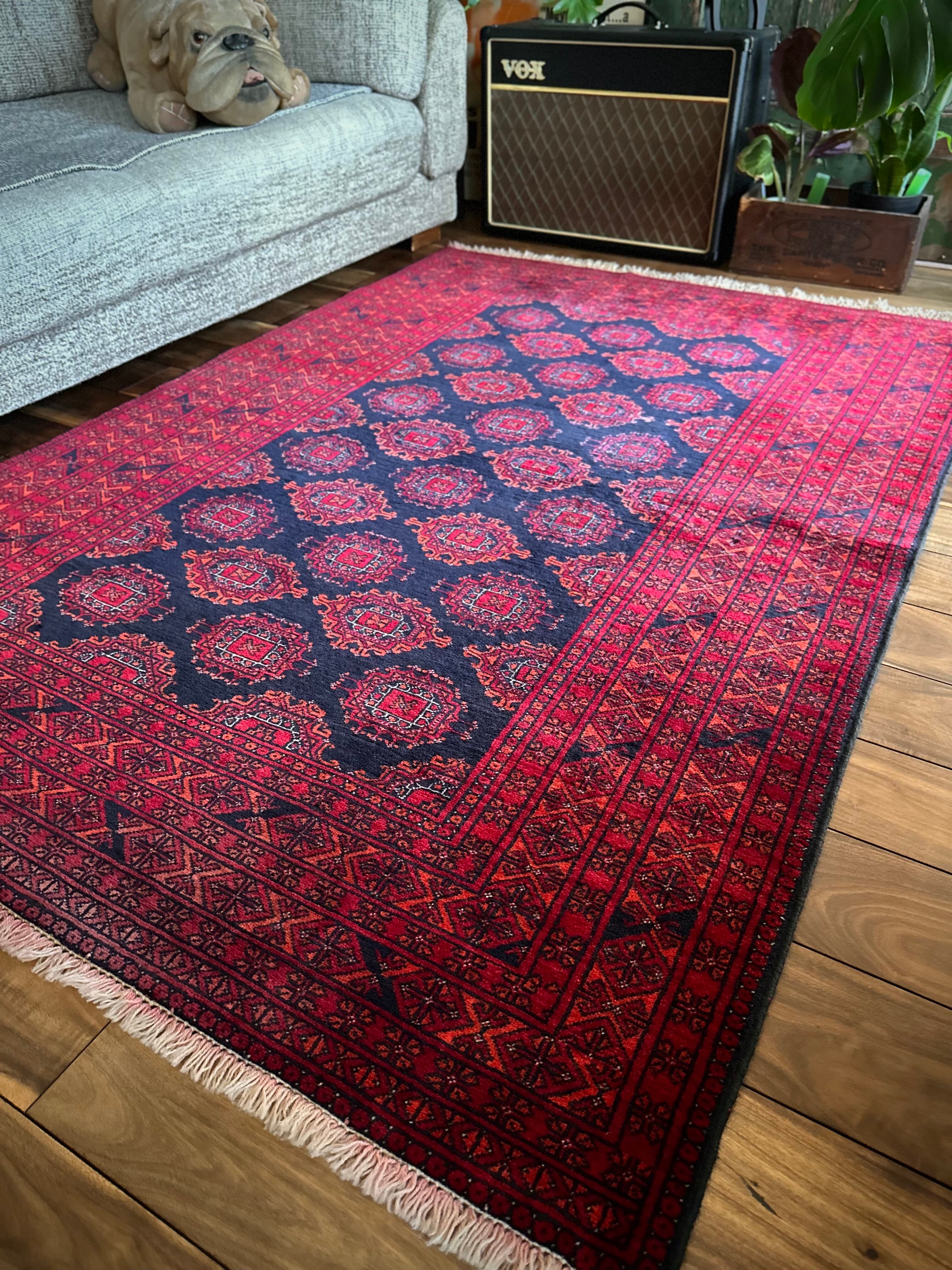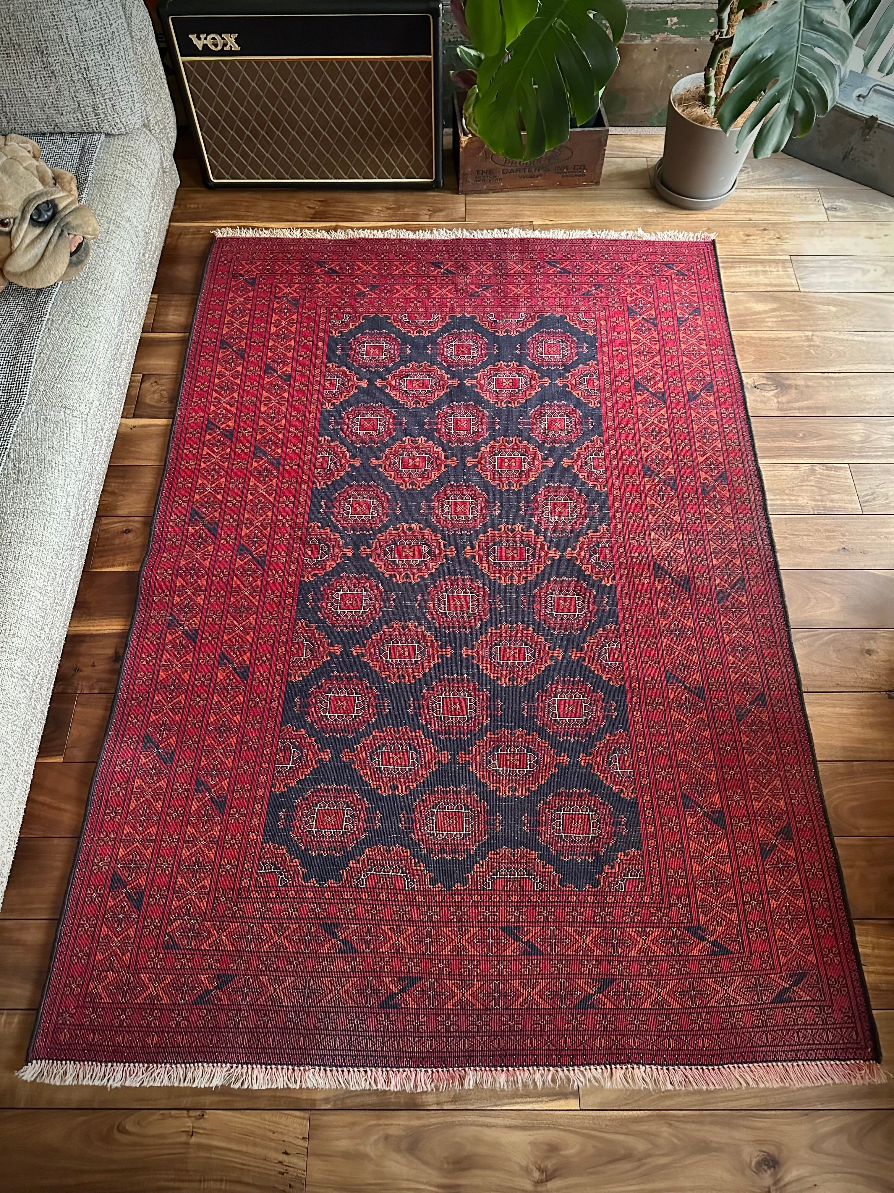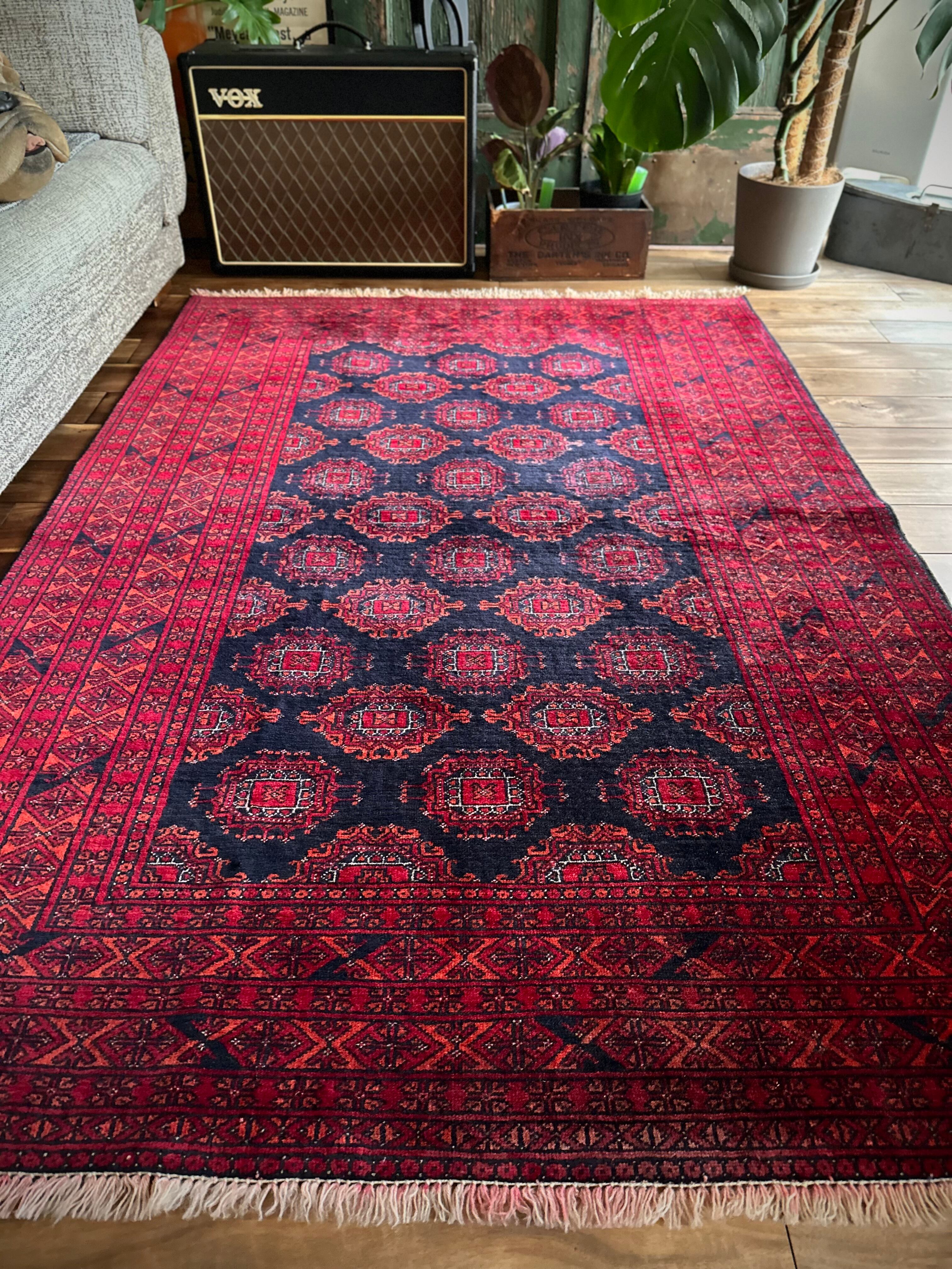 フィールドのネイビーとは対照的に大胆な赤色に巧みなオレンジ使いが目を見張るこちらは、アフガニスタン北部に居住するトルクメン族のトライバルラグで、ミルフィーユ状のボーダーにギュルの連続紋様がかっこいいトルクメンらしい1枚になります。