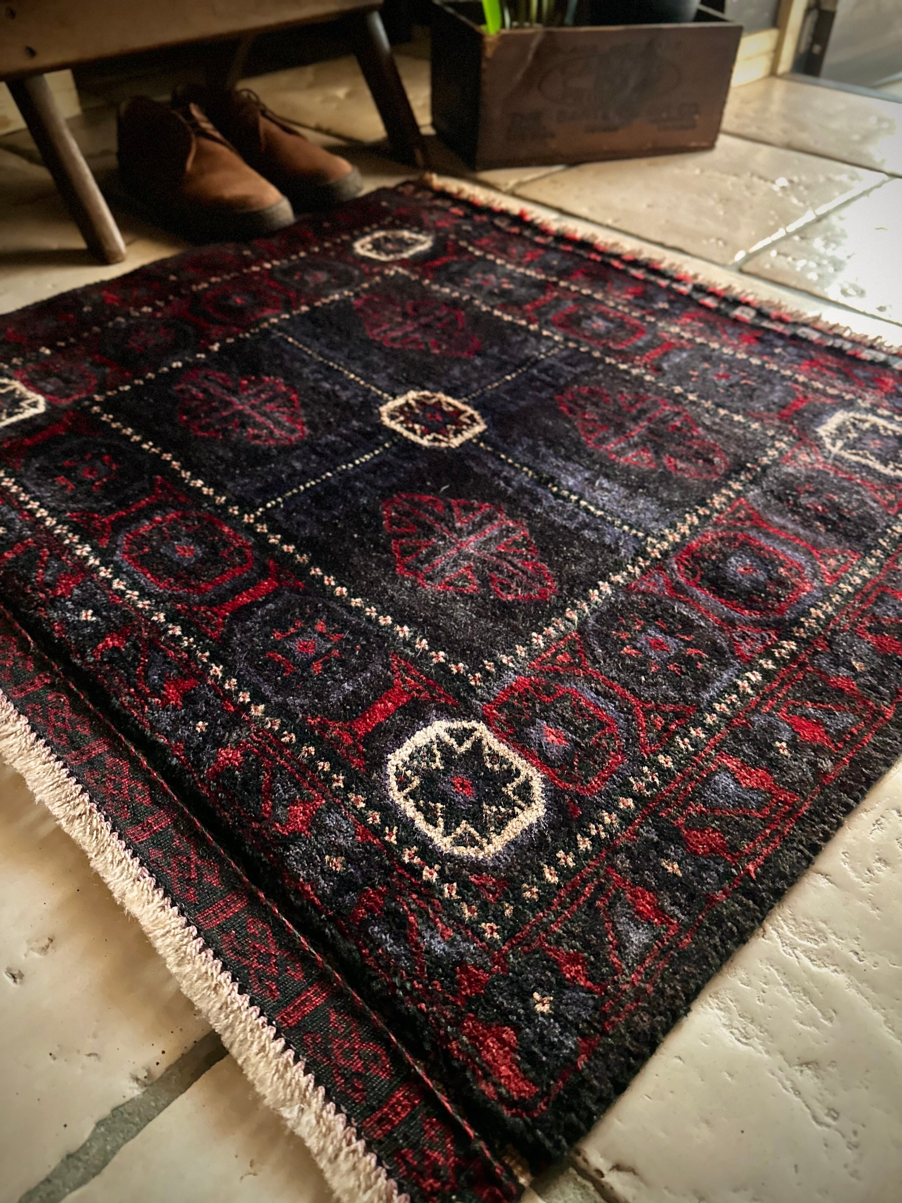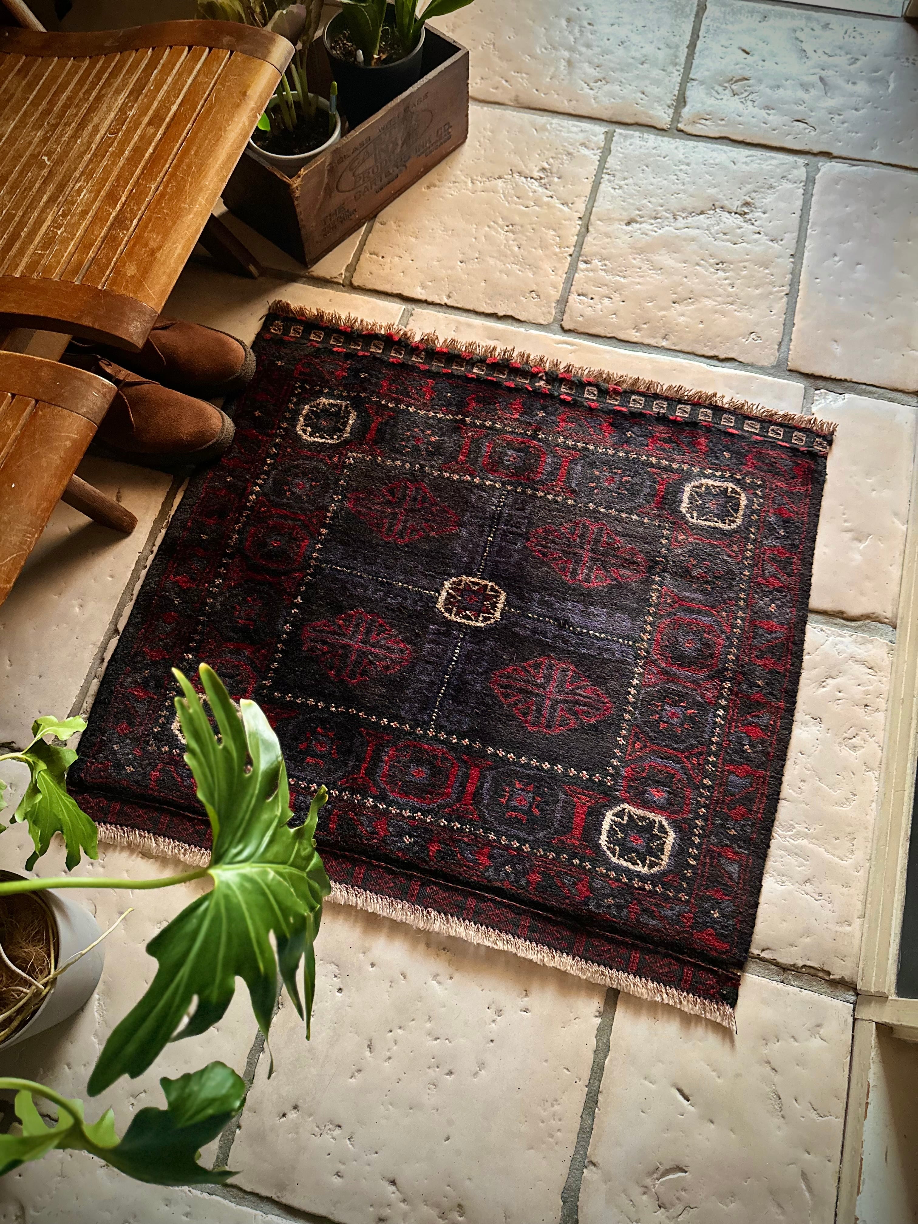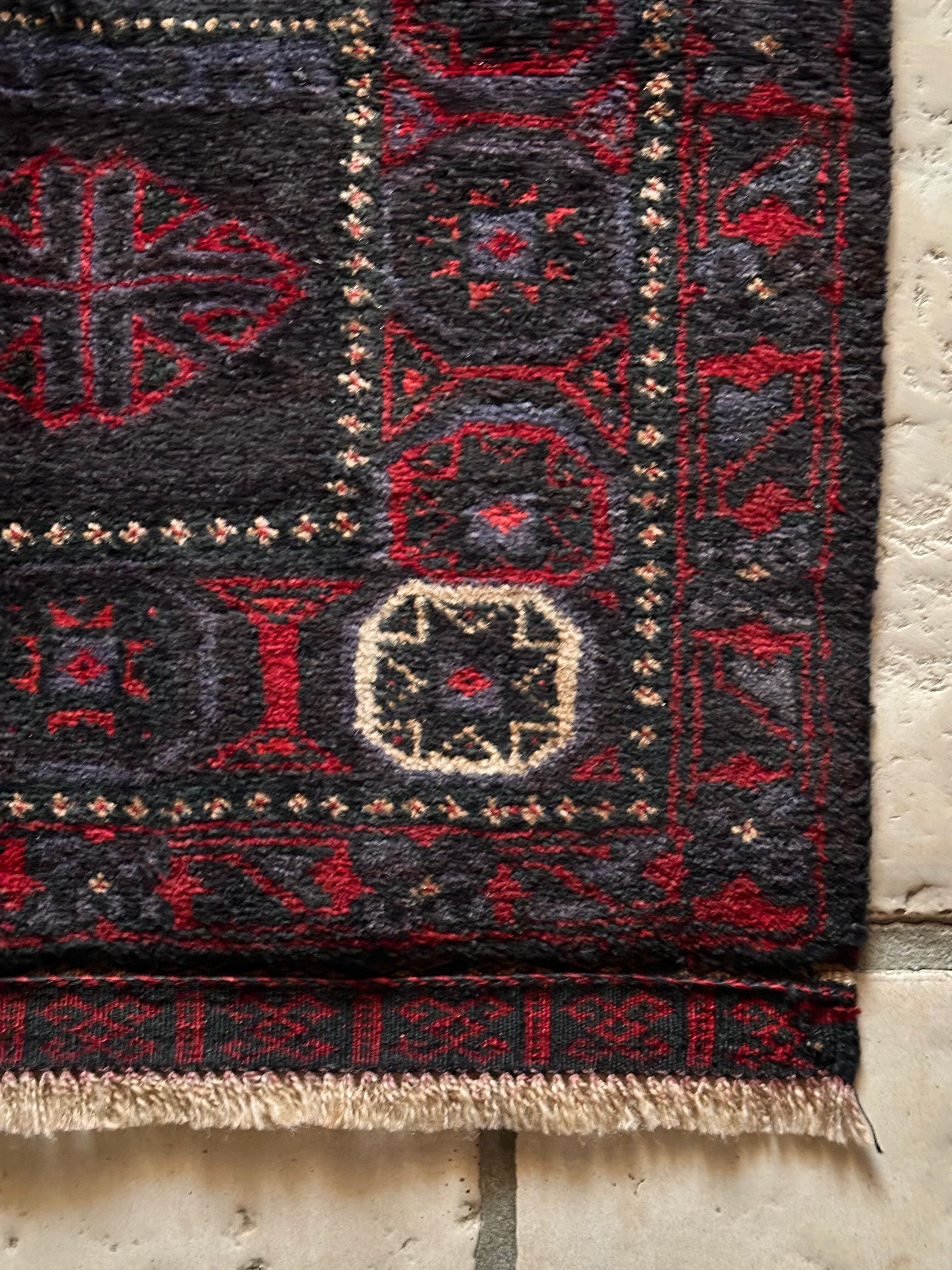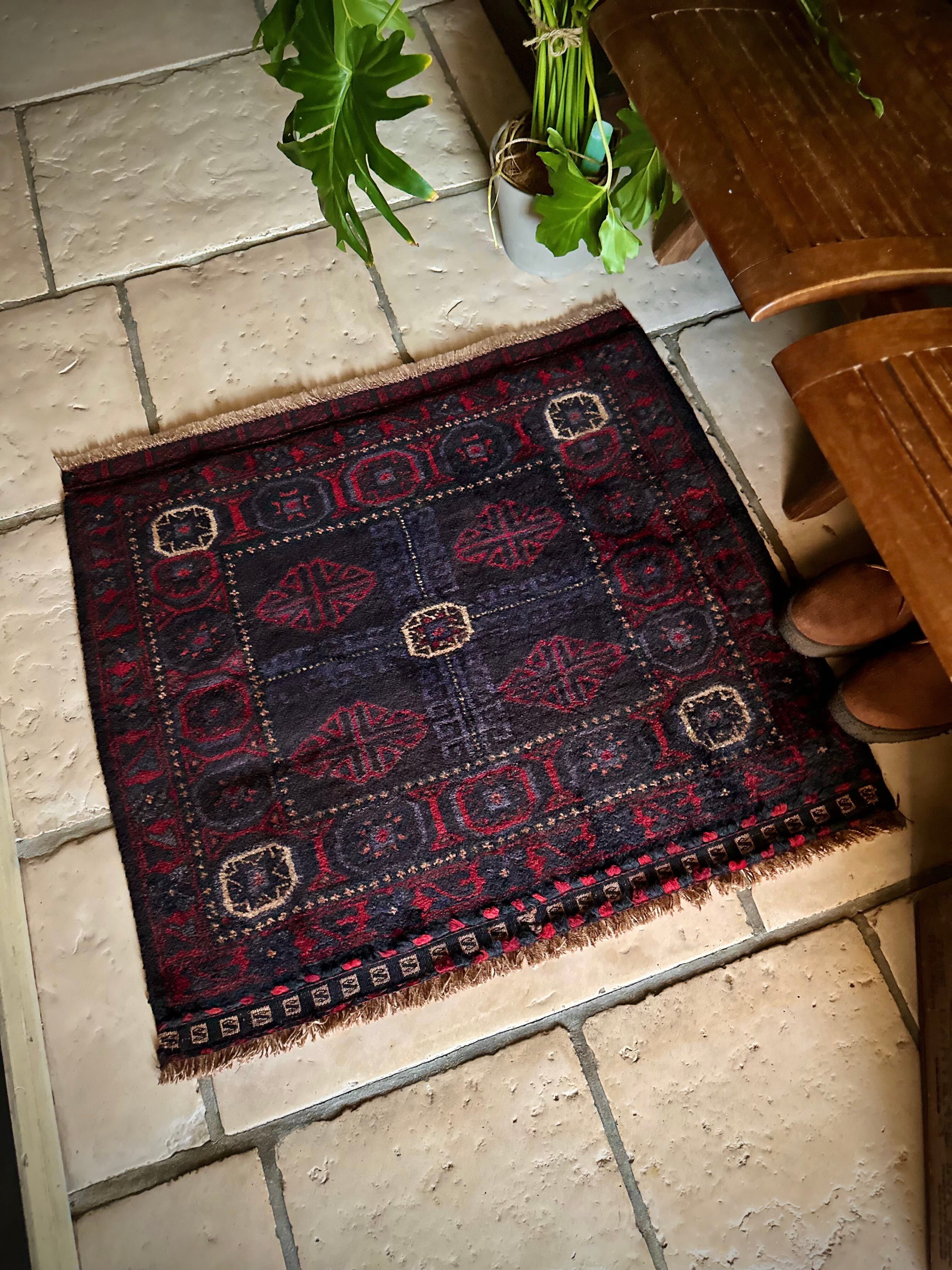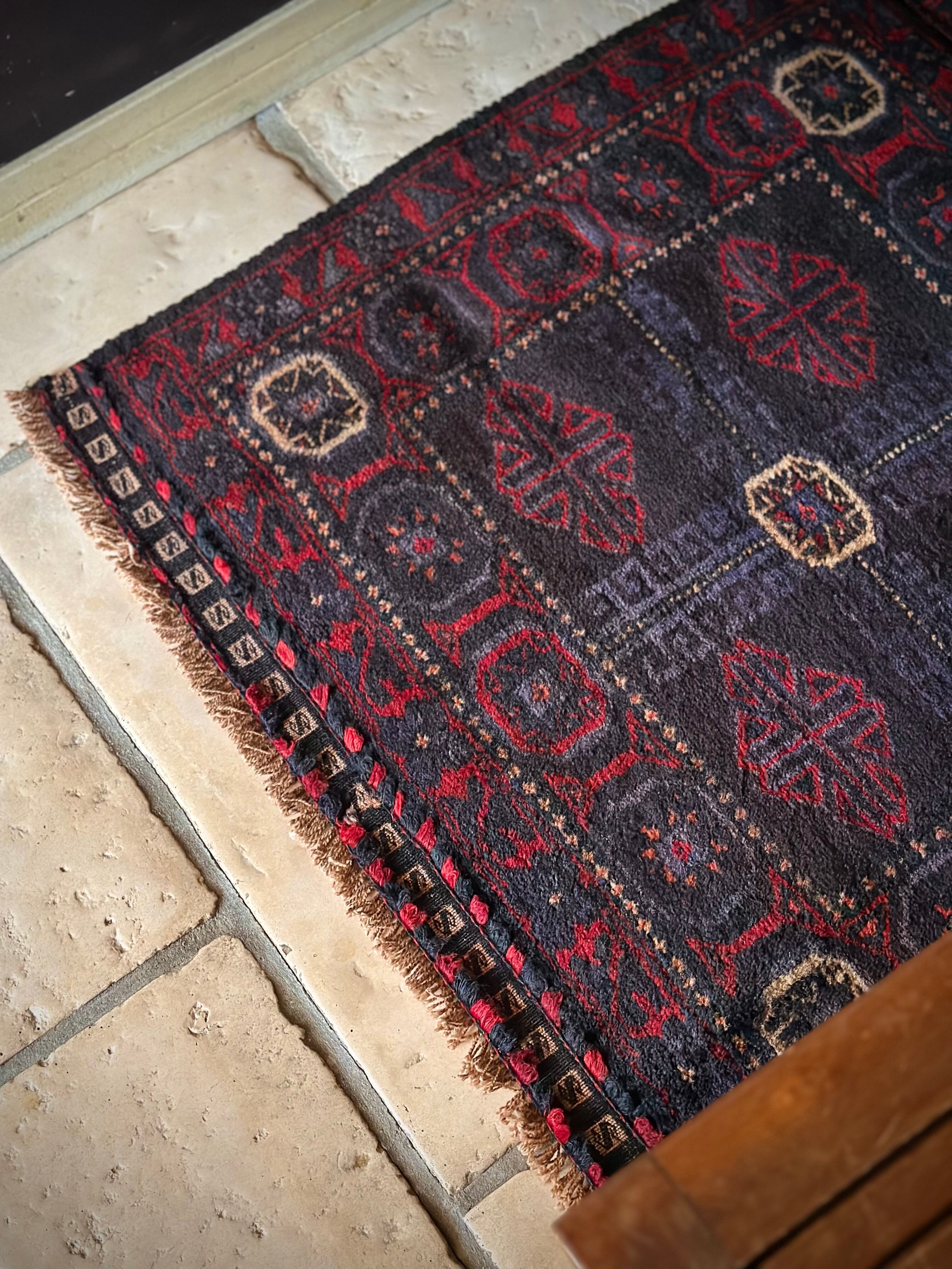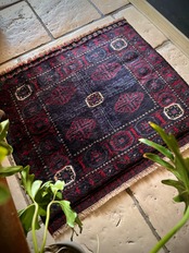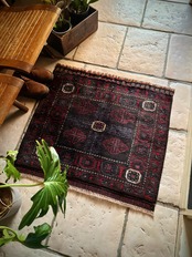 ブラックをベースに赤とブルーグレーのシックな色合いに白で際立たせた八芒星がトライバルらしいこちらは、アフガニスタンはヘラート州に居住するバルーチ族のトライバルラグで、元はラクダなどに担がせるホルジンと呼ばれるサドルバッグの表皮をラグに仕立て直したモノになります。