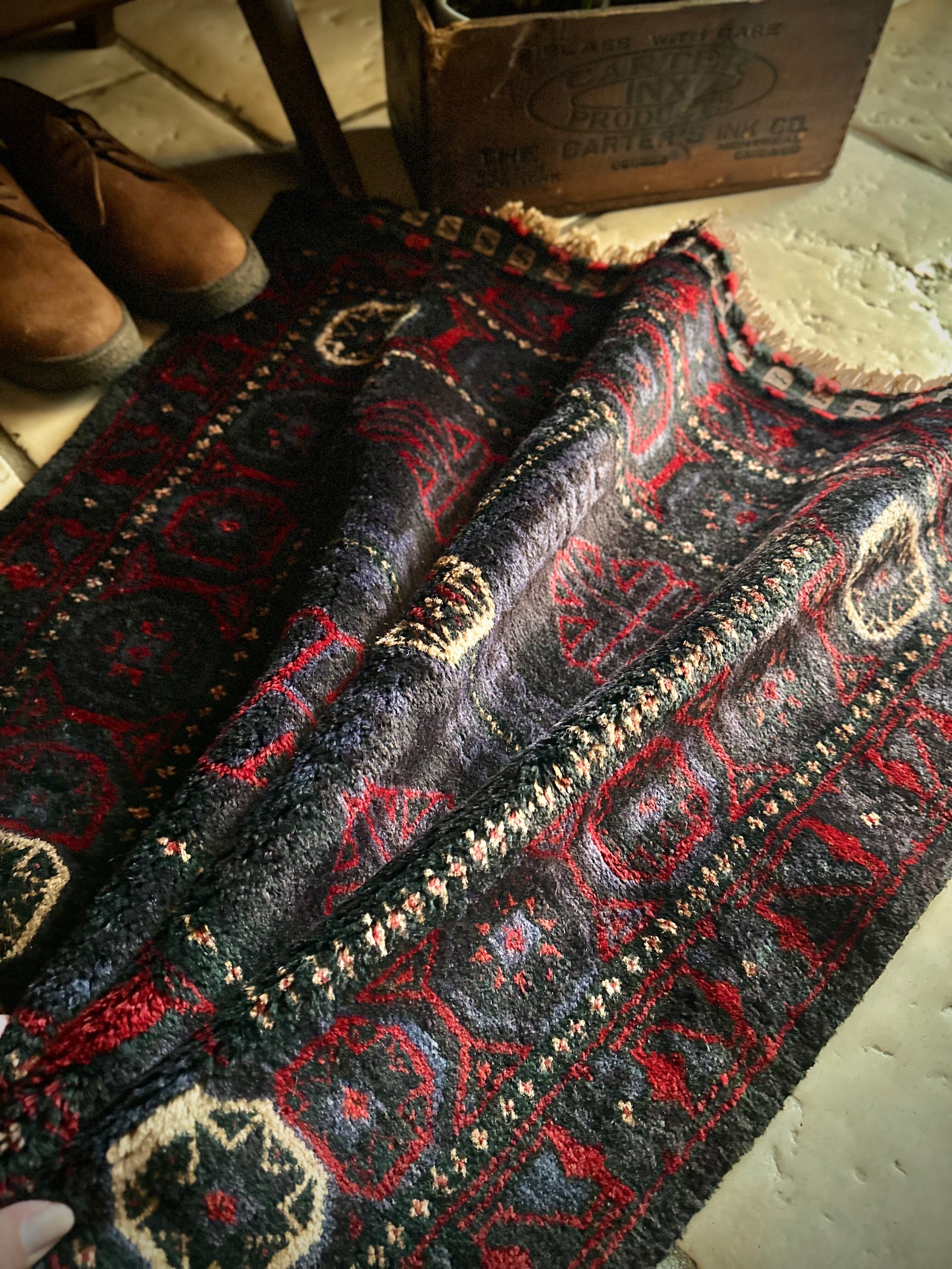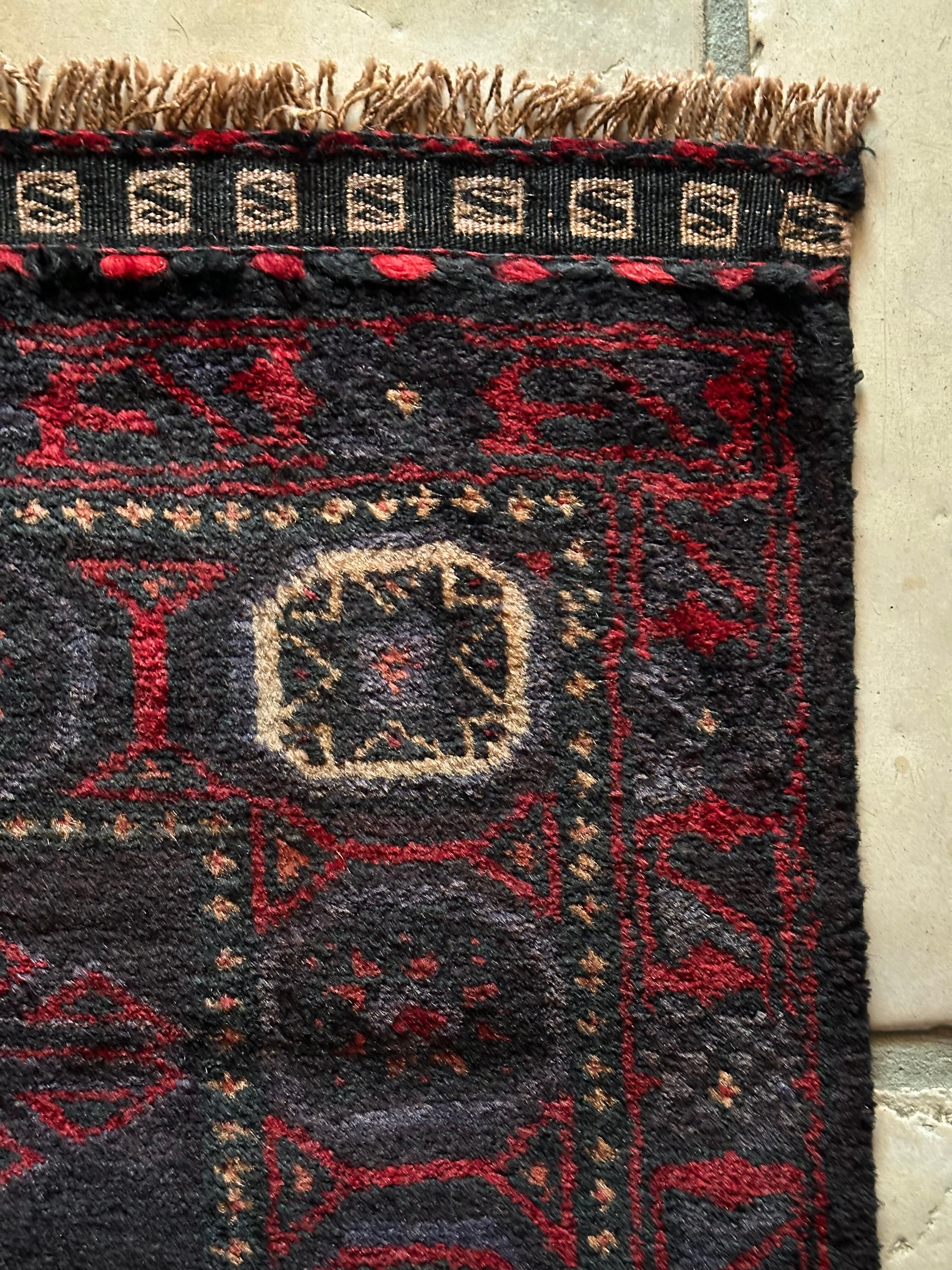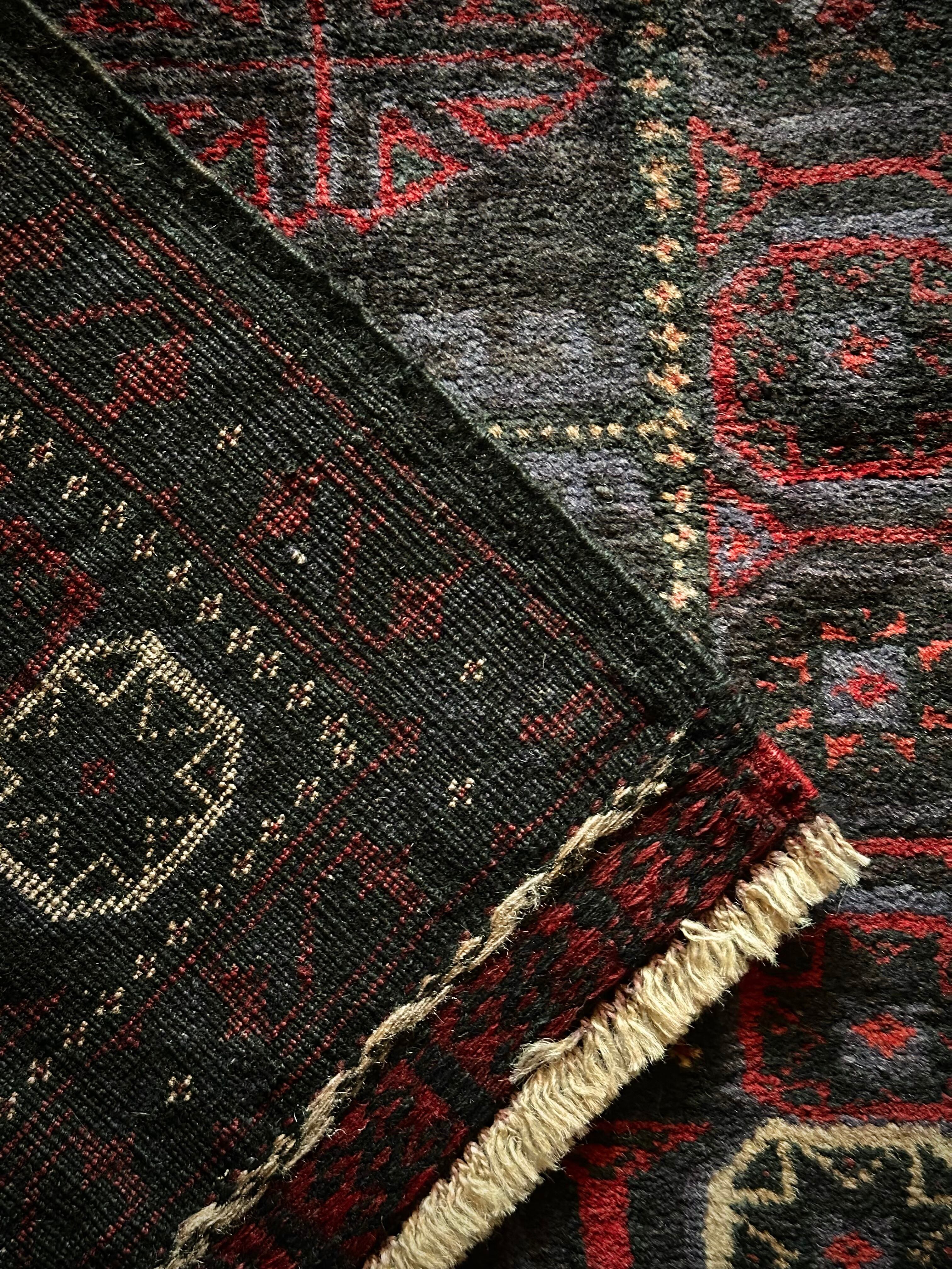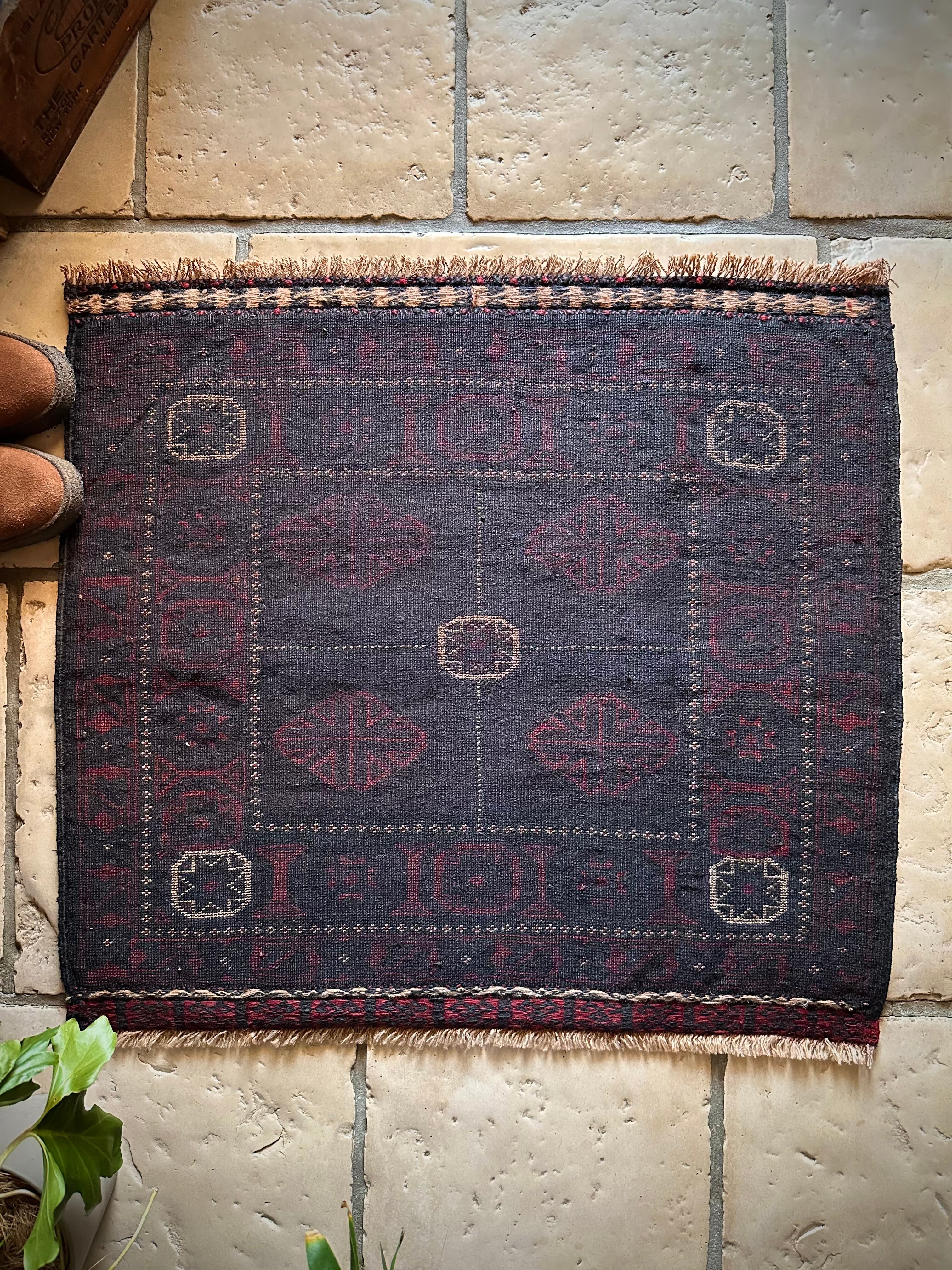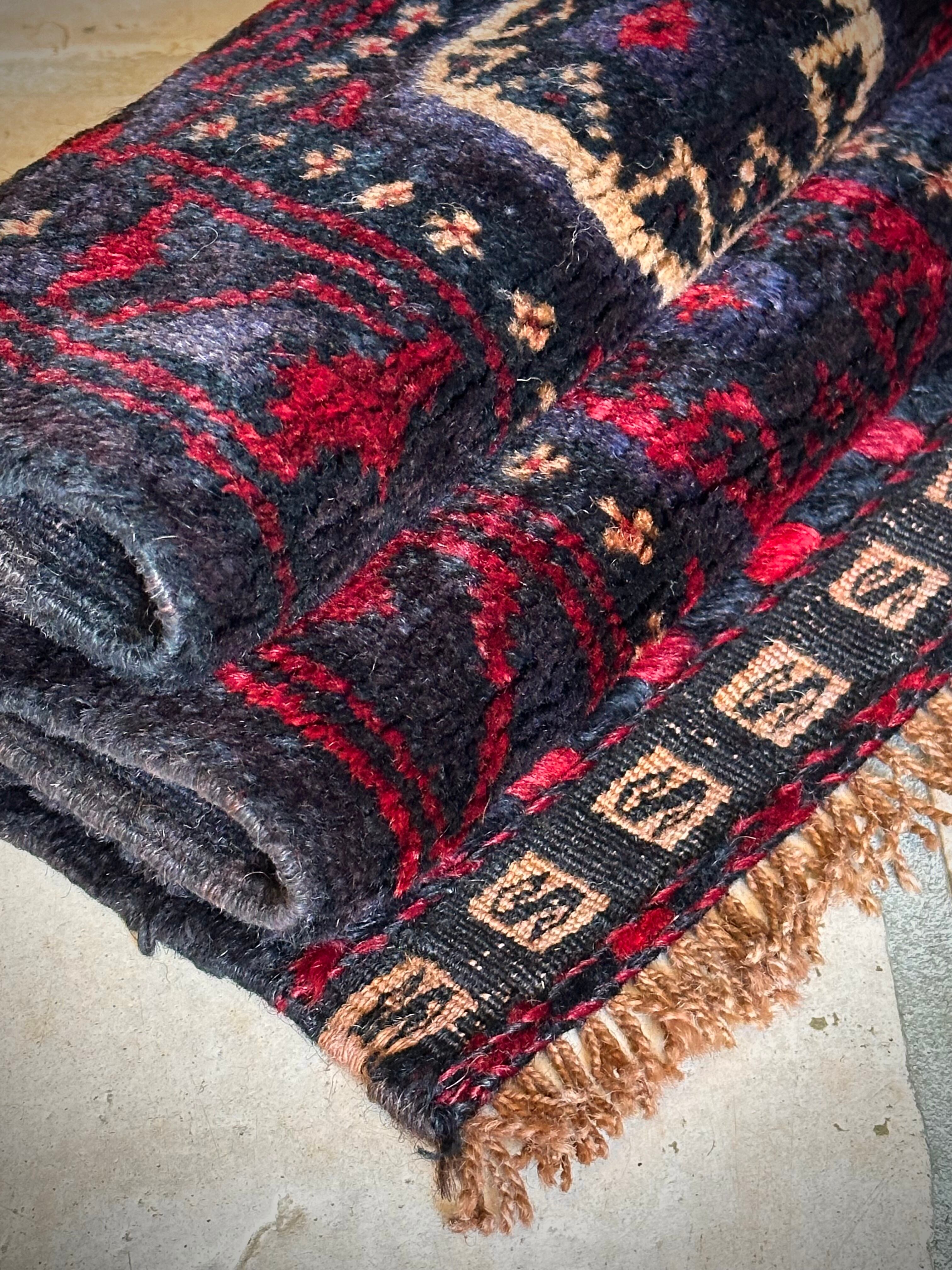ブラックをベースに赤とブルーグレーのシックな色合いに白で際立たせた八芒星がトライバルらしいこちらは、アフガニスタンはヘラート州に居住するバルーチ族のトライバルラグで、元はラクダなどに担がせるホルジンと呼ばれるサドルバッグの表皮をラグに仕立て直したモノになります。