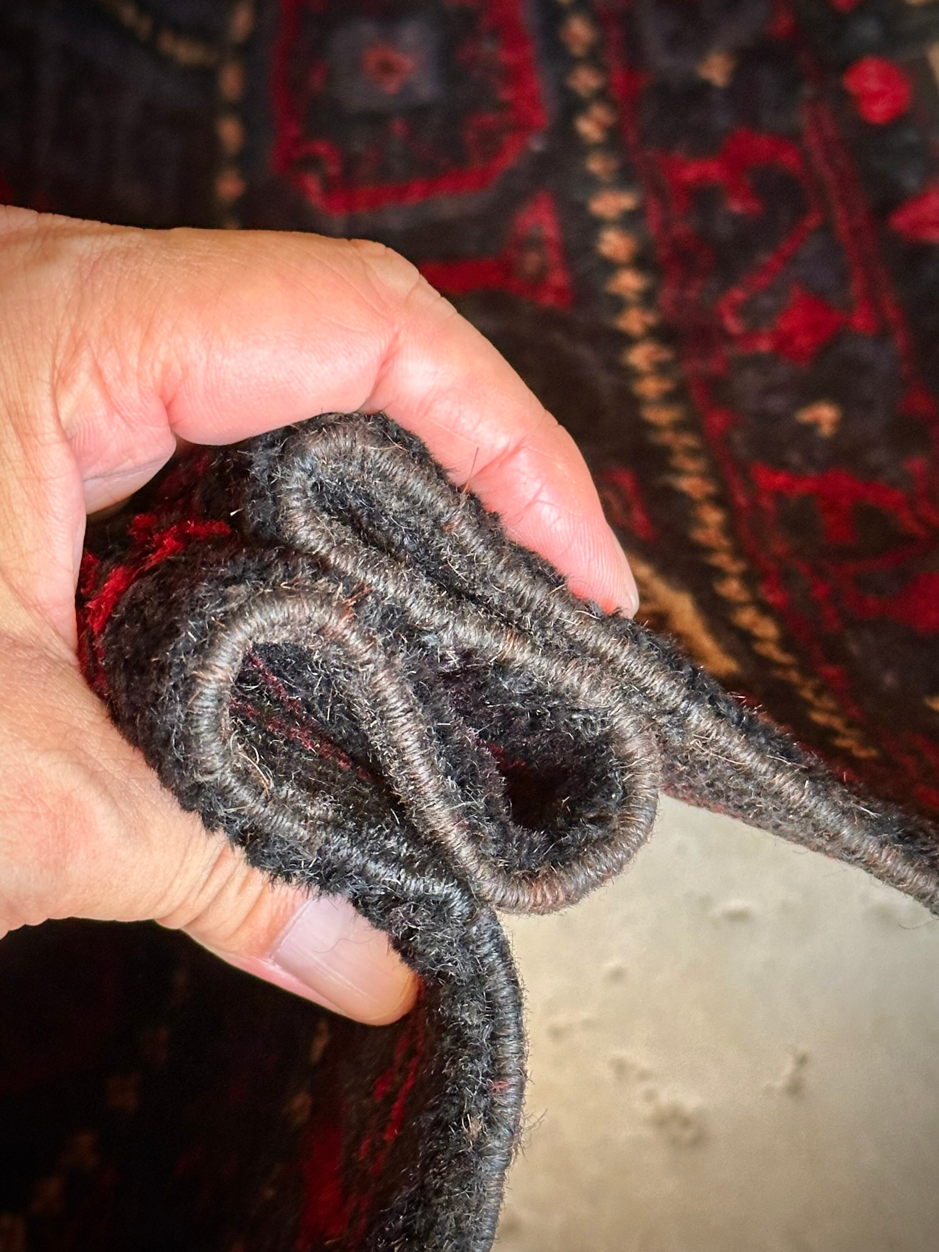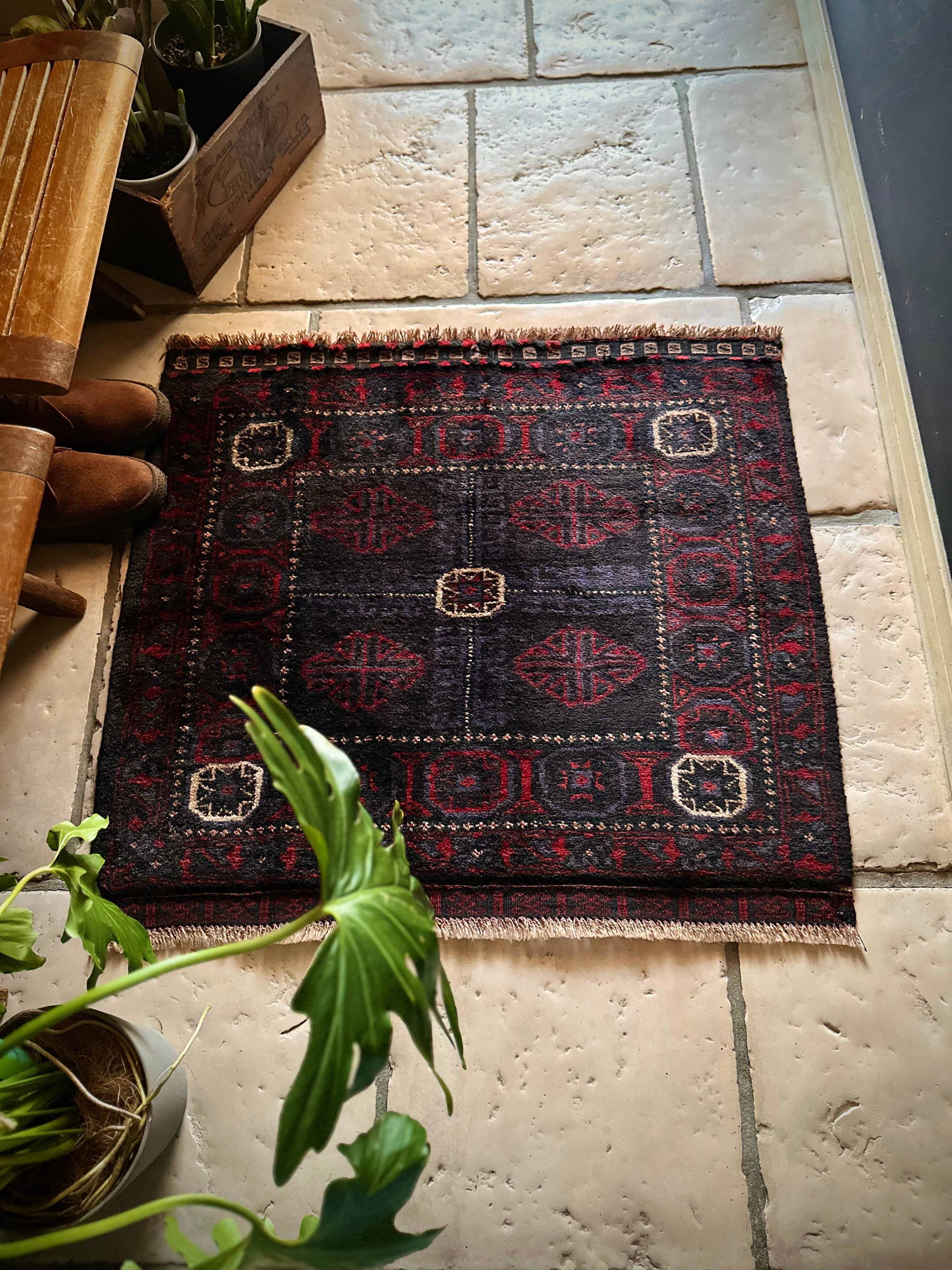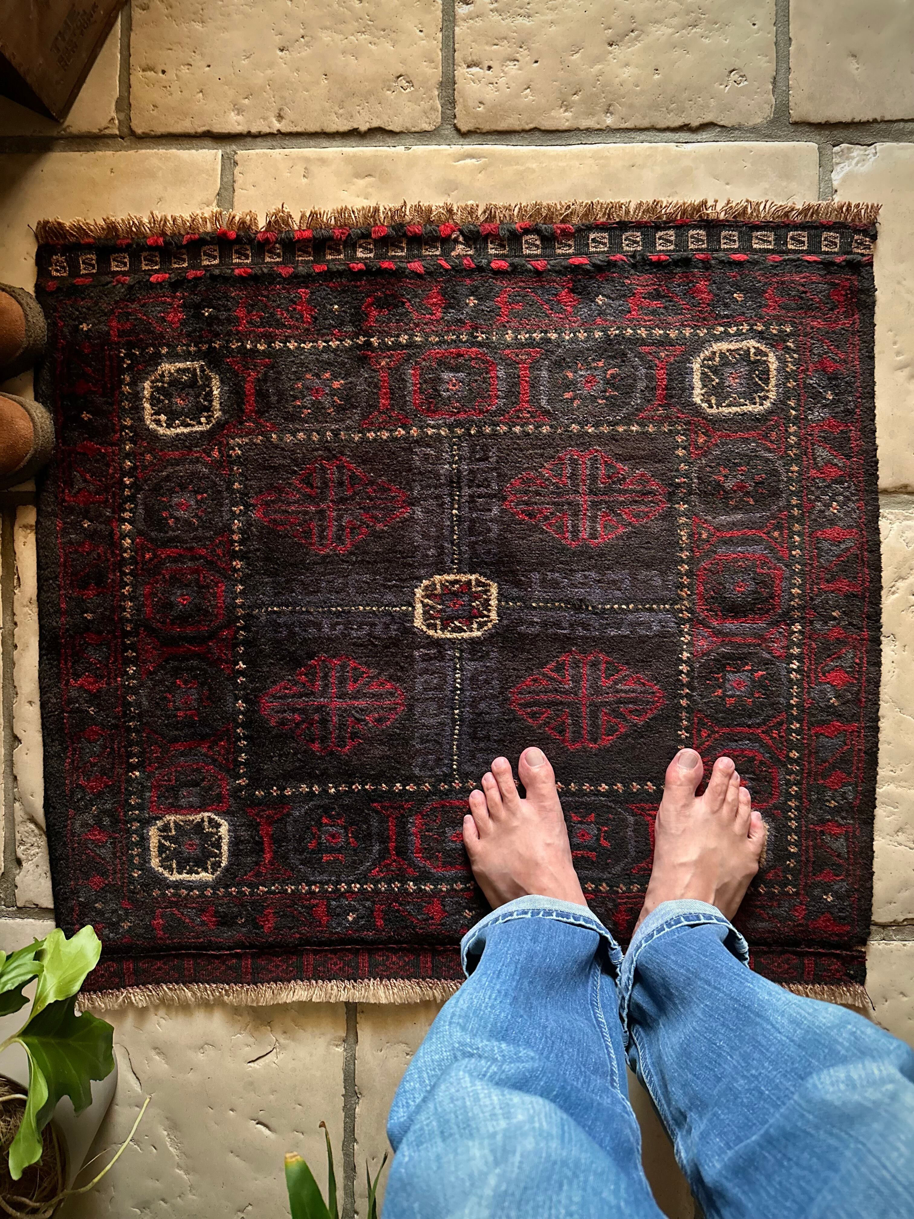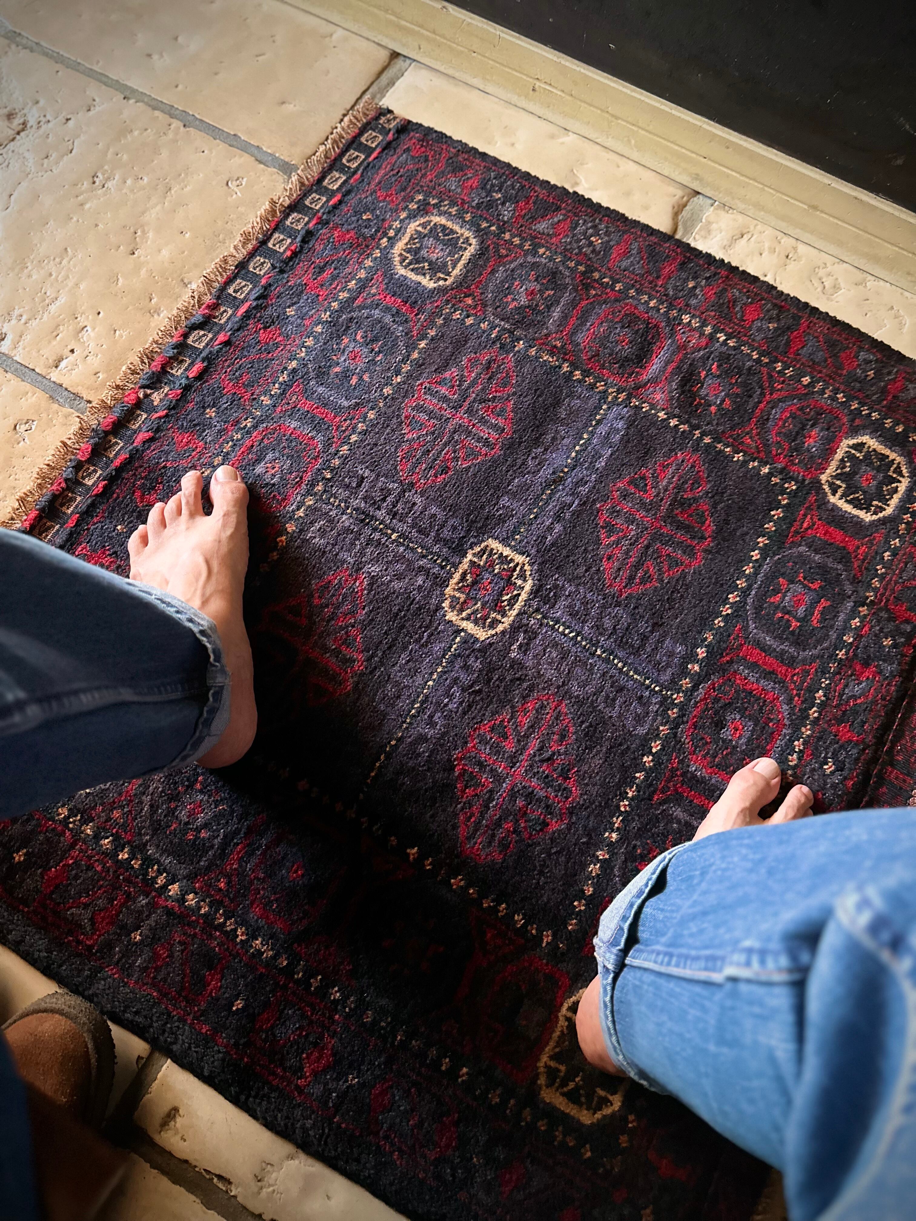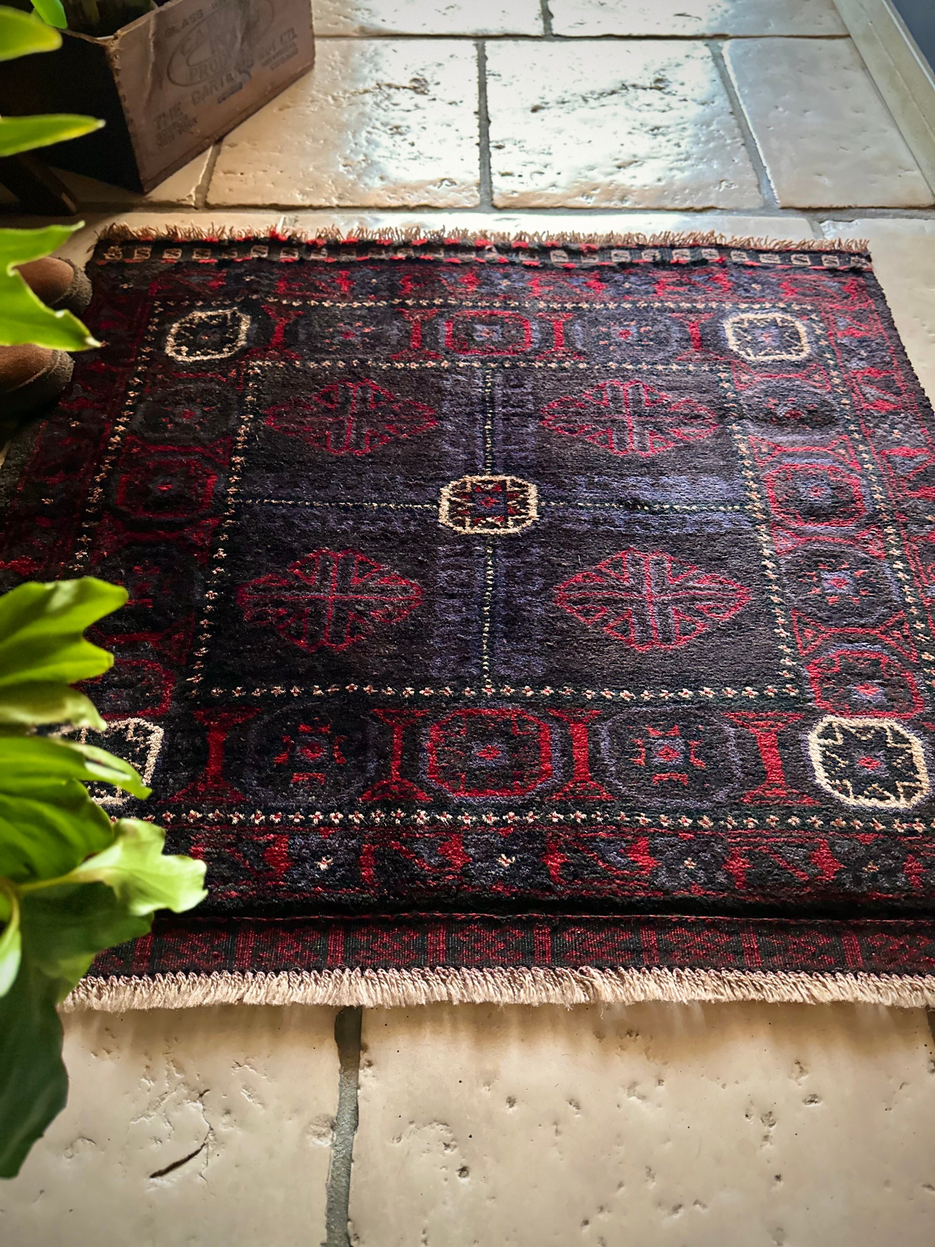 ブラックをベースに赤とブルーグレーのシックな色合いに白で際立たせた八芒星がトライバルらしいこちらは、アフガニスタンはヘラート州に居住するバルーチ族のトライバルラグで、元はラクダなどに担がせるホルジンと呼ばれるサドルバッグの表皮をラグに仕立て直したモノになります。