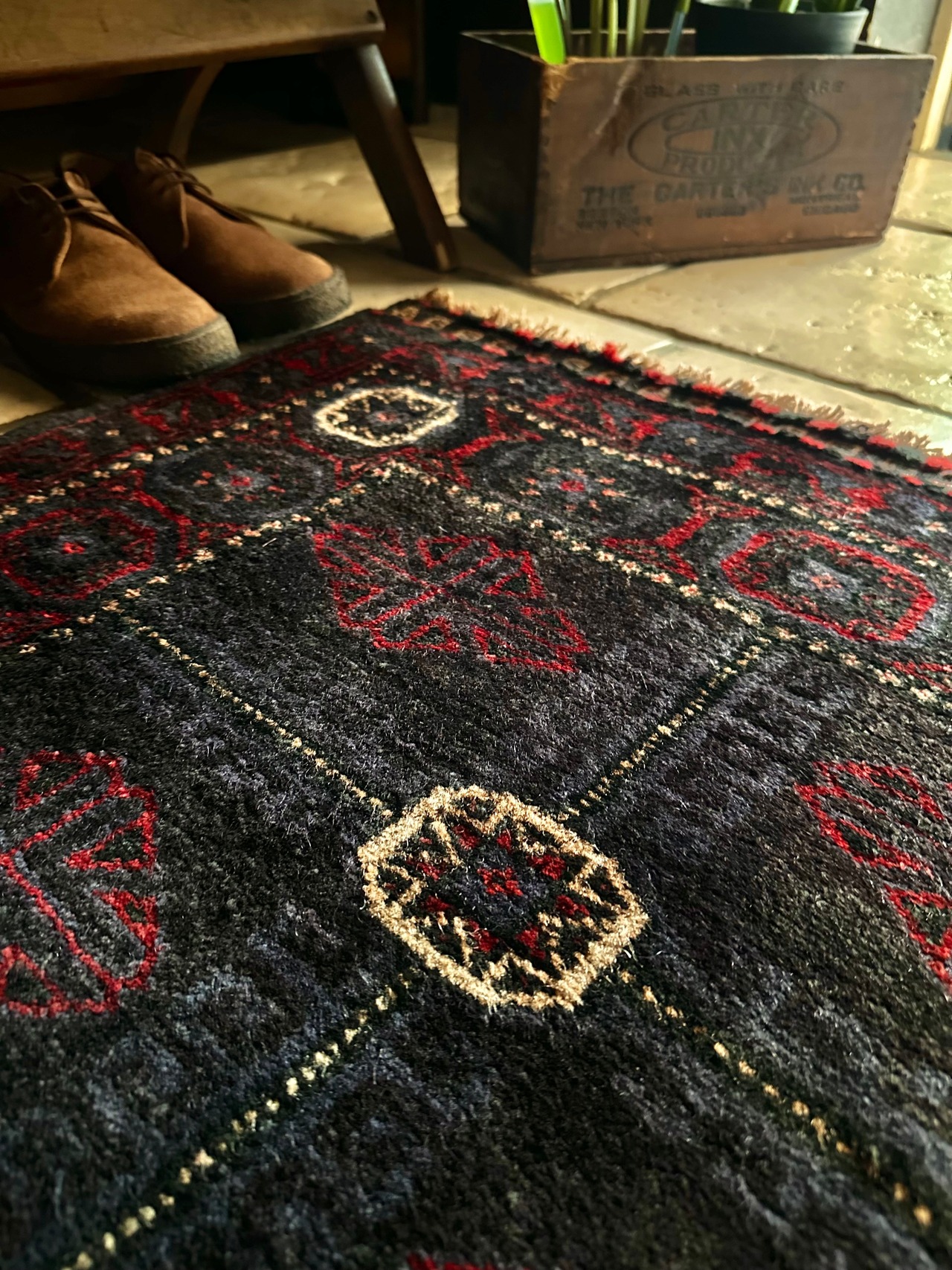最後にラグそのものに関しては羊毛特有の匂いがあり、採寸は中央付近で計測していますが、手織りならではの歪みによる誤差や水洗いクリーニングによる縮み、また草木染めによる経年劣化の色ムラなどがありますが、それもまたヴィンテージラグの魅力かとご理解ください。