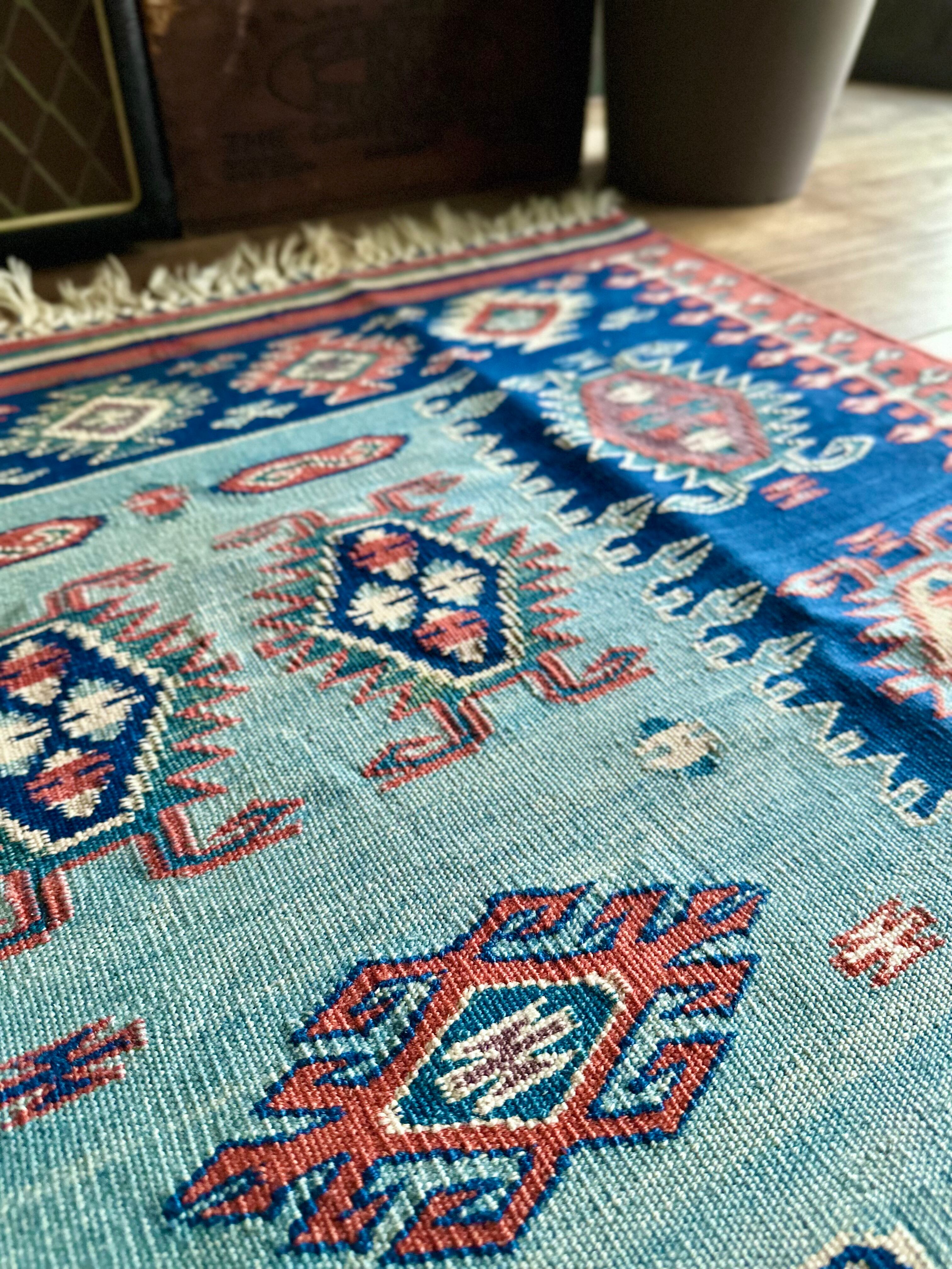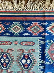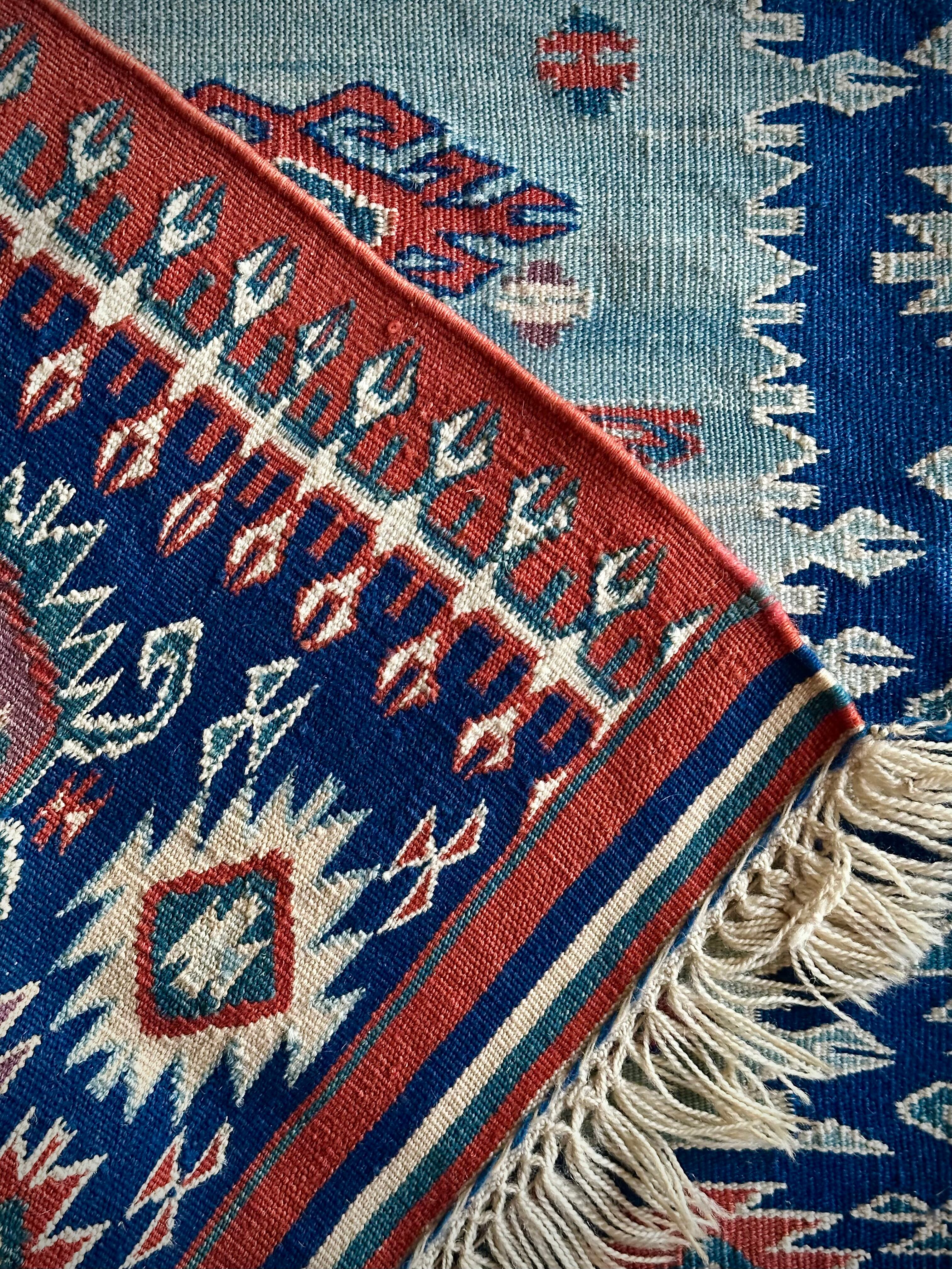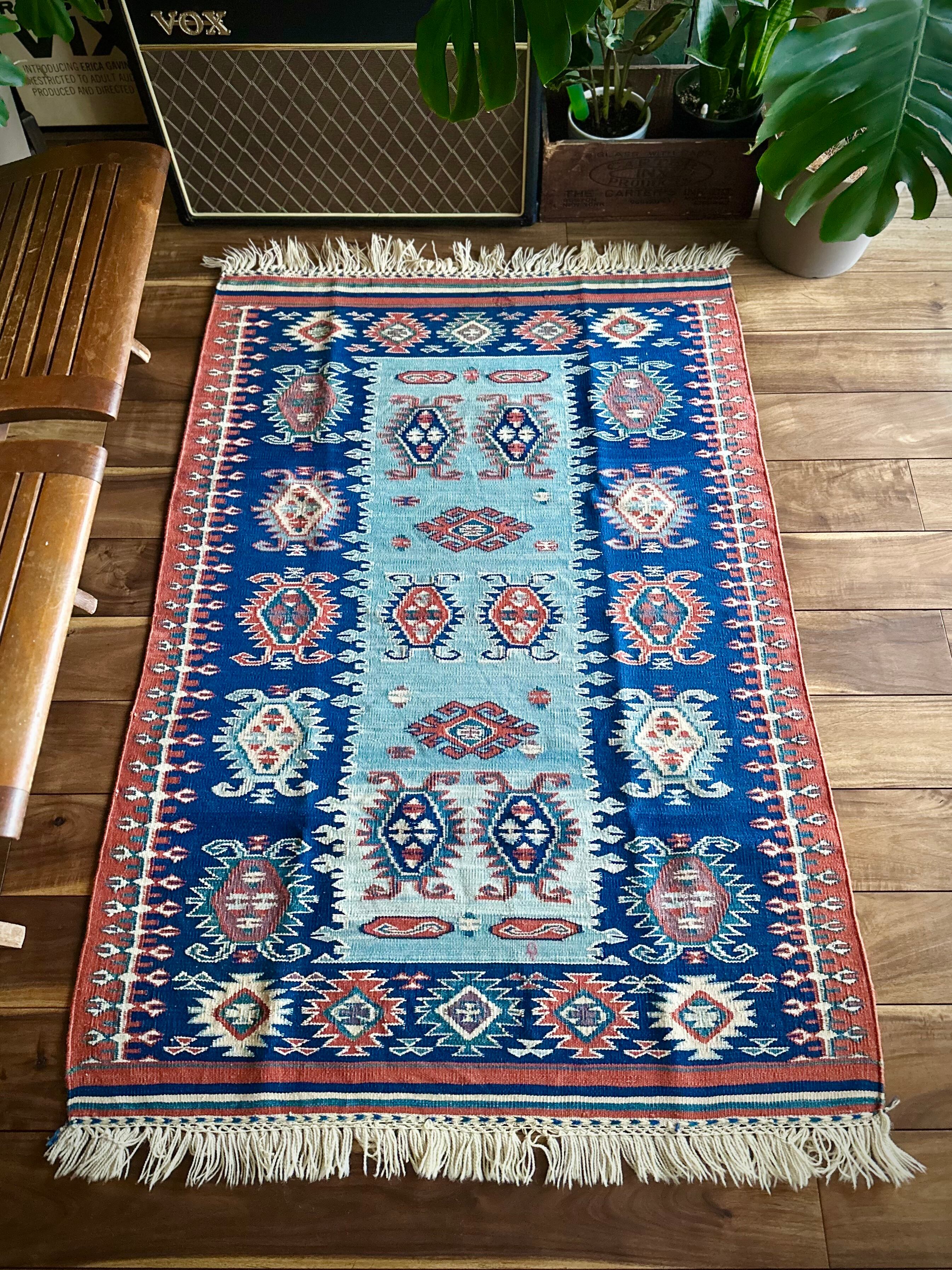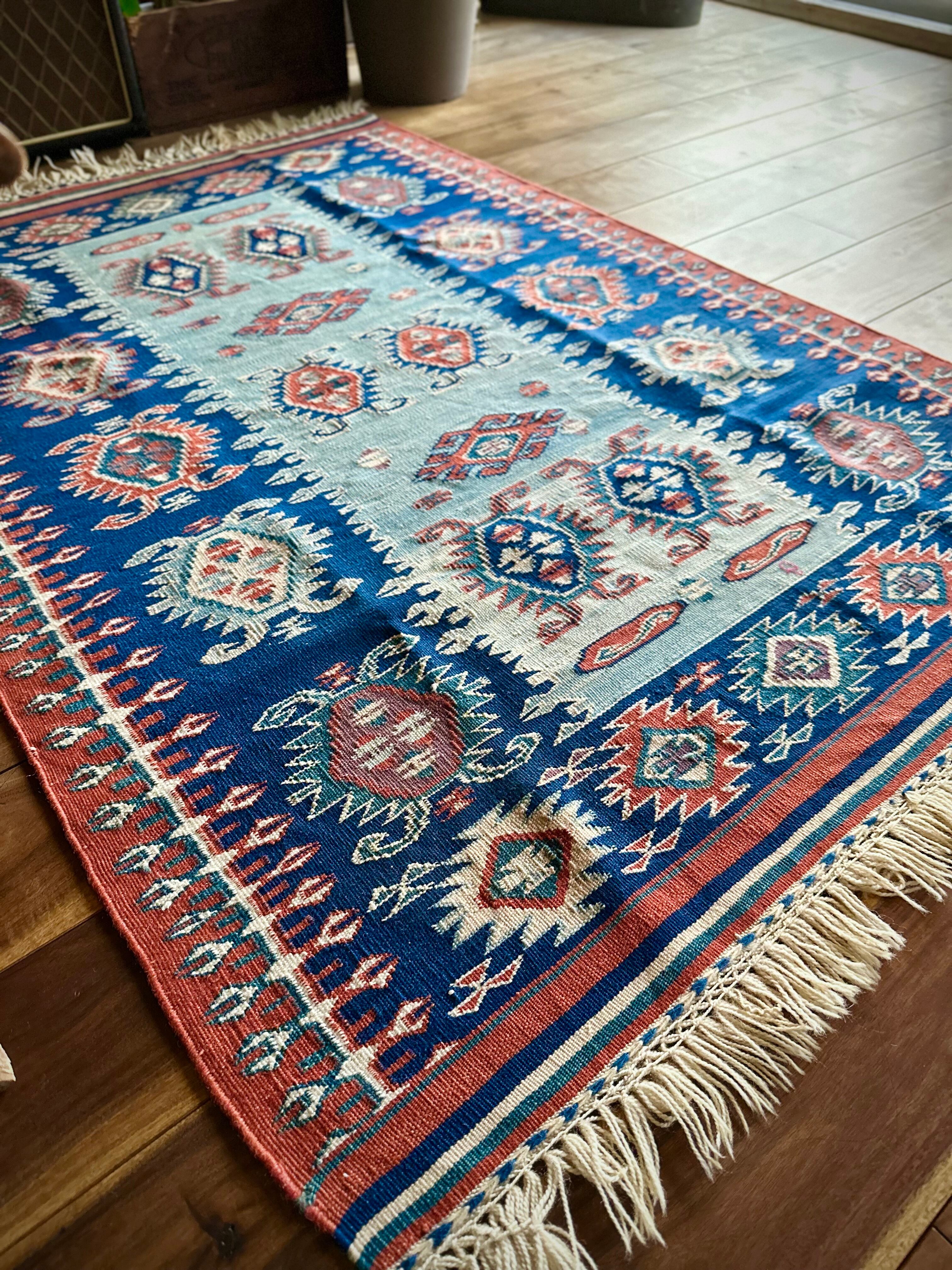 鮮やかなコバルトブルーを際立たせたるベイビーブルーの色彩がカスピ海沿岸のコーカサス地方の大自然を連想させるこちらは、イラン北西部とトルコに隣接するアゼルバイジャンで手織りされたキリムになります。