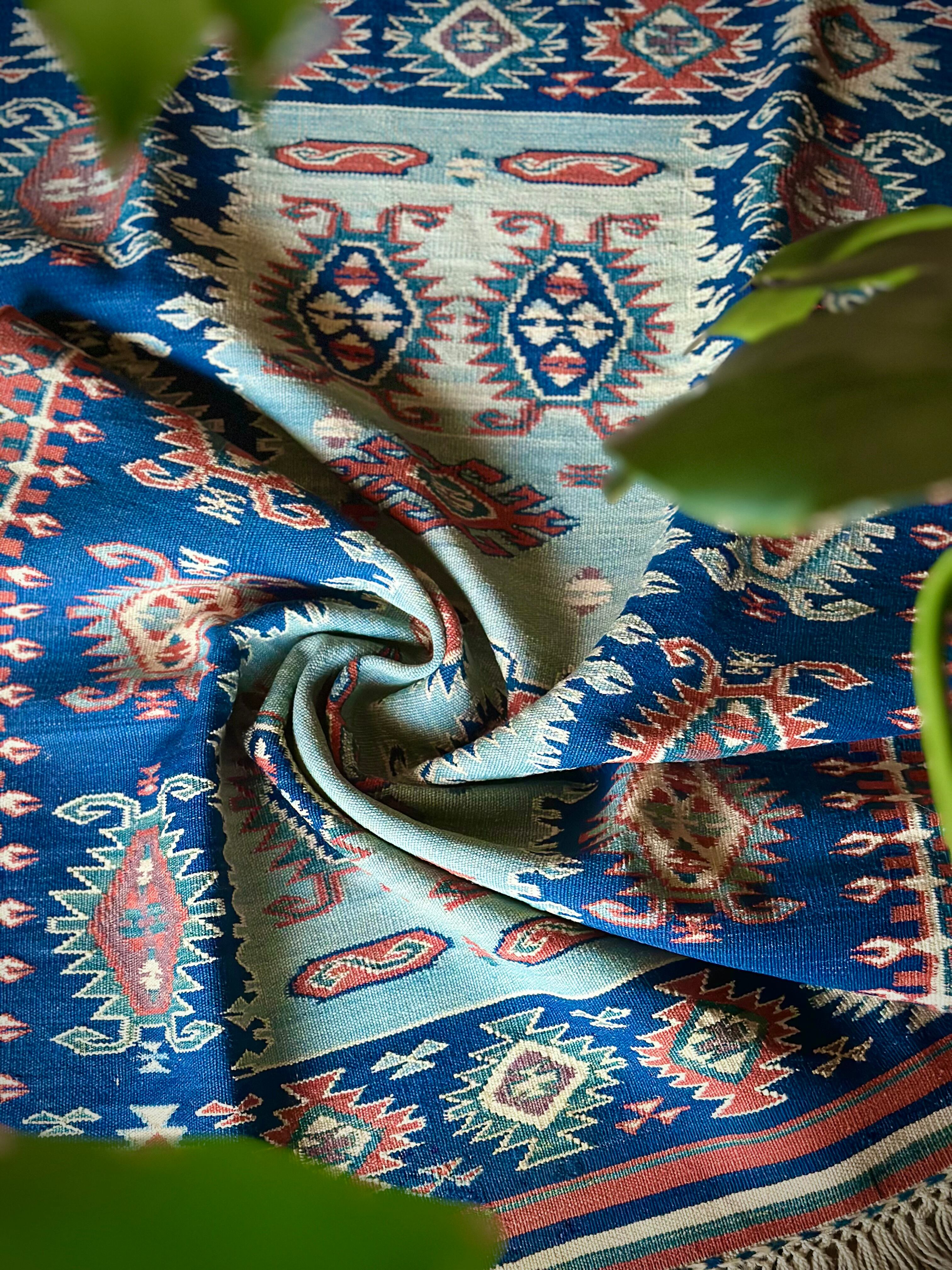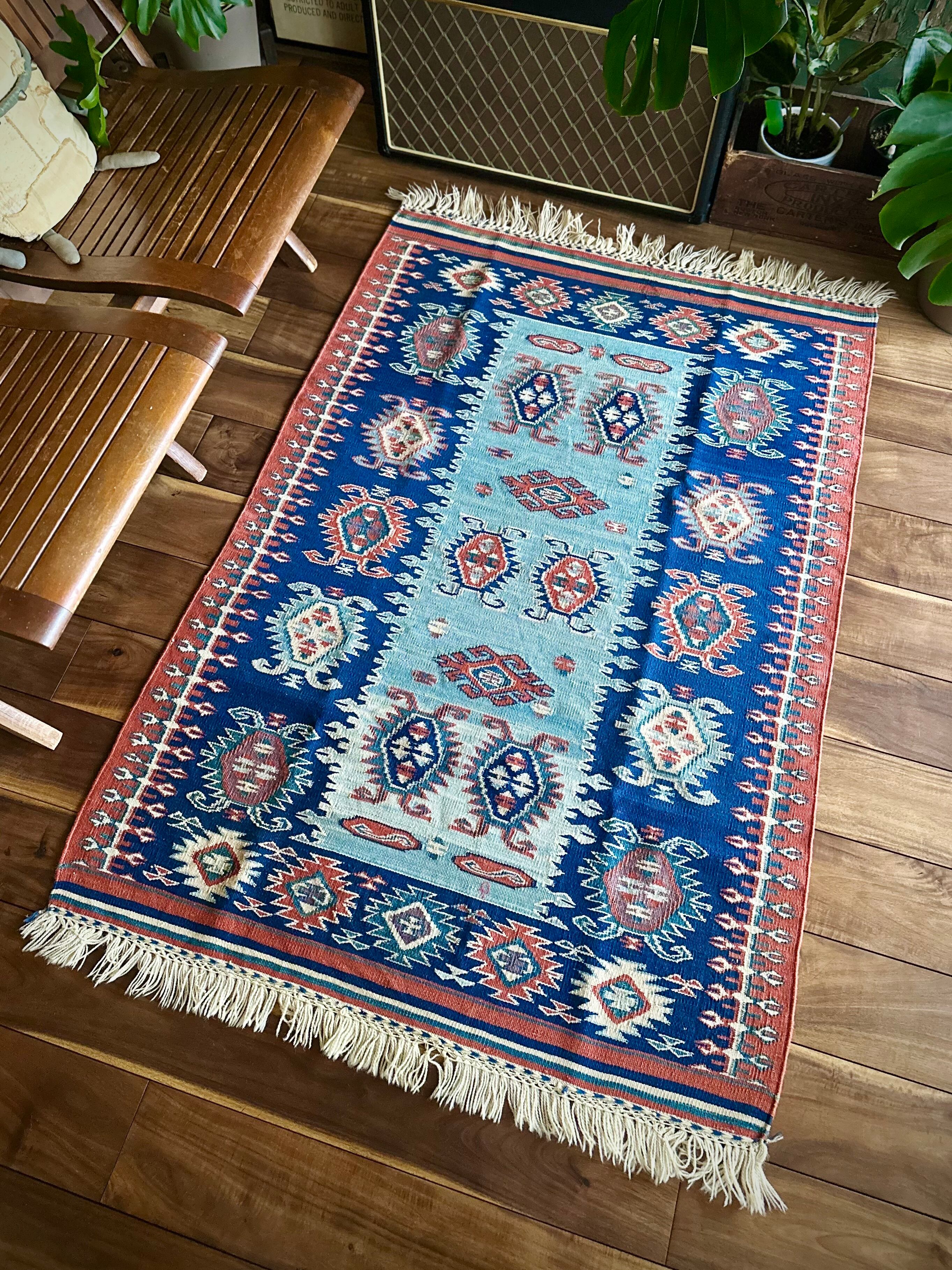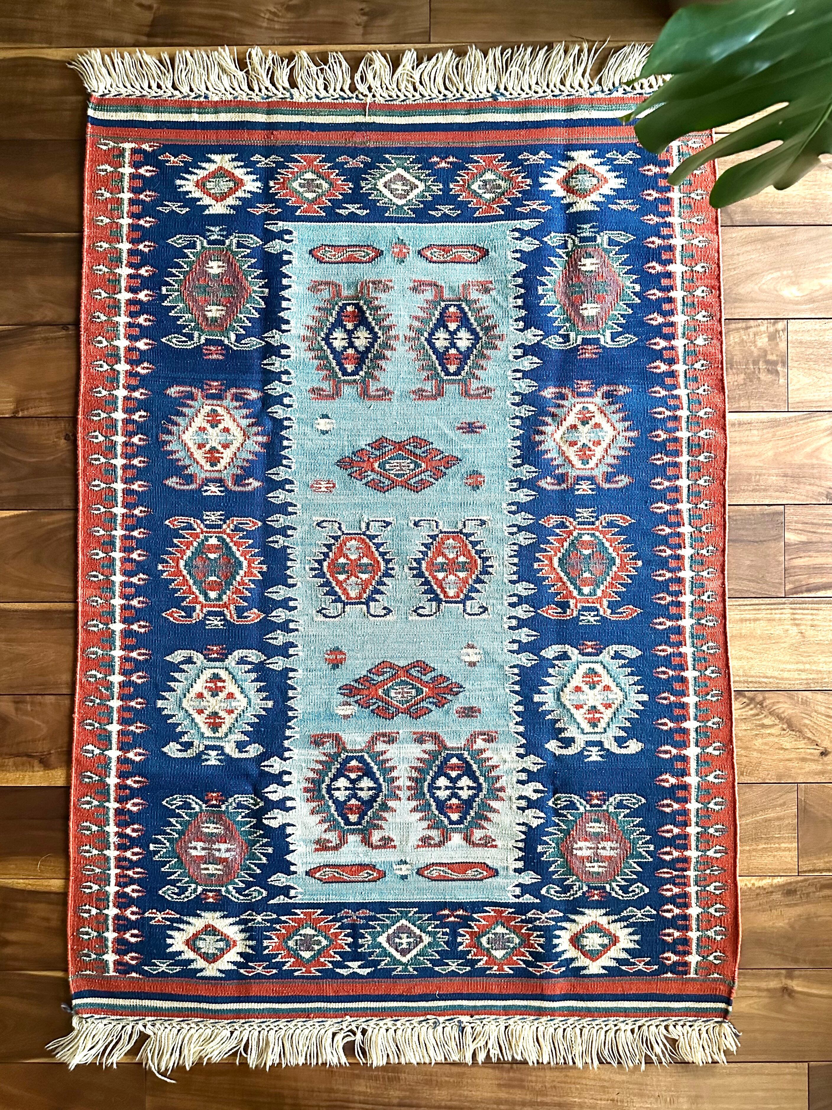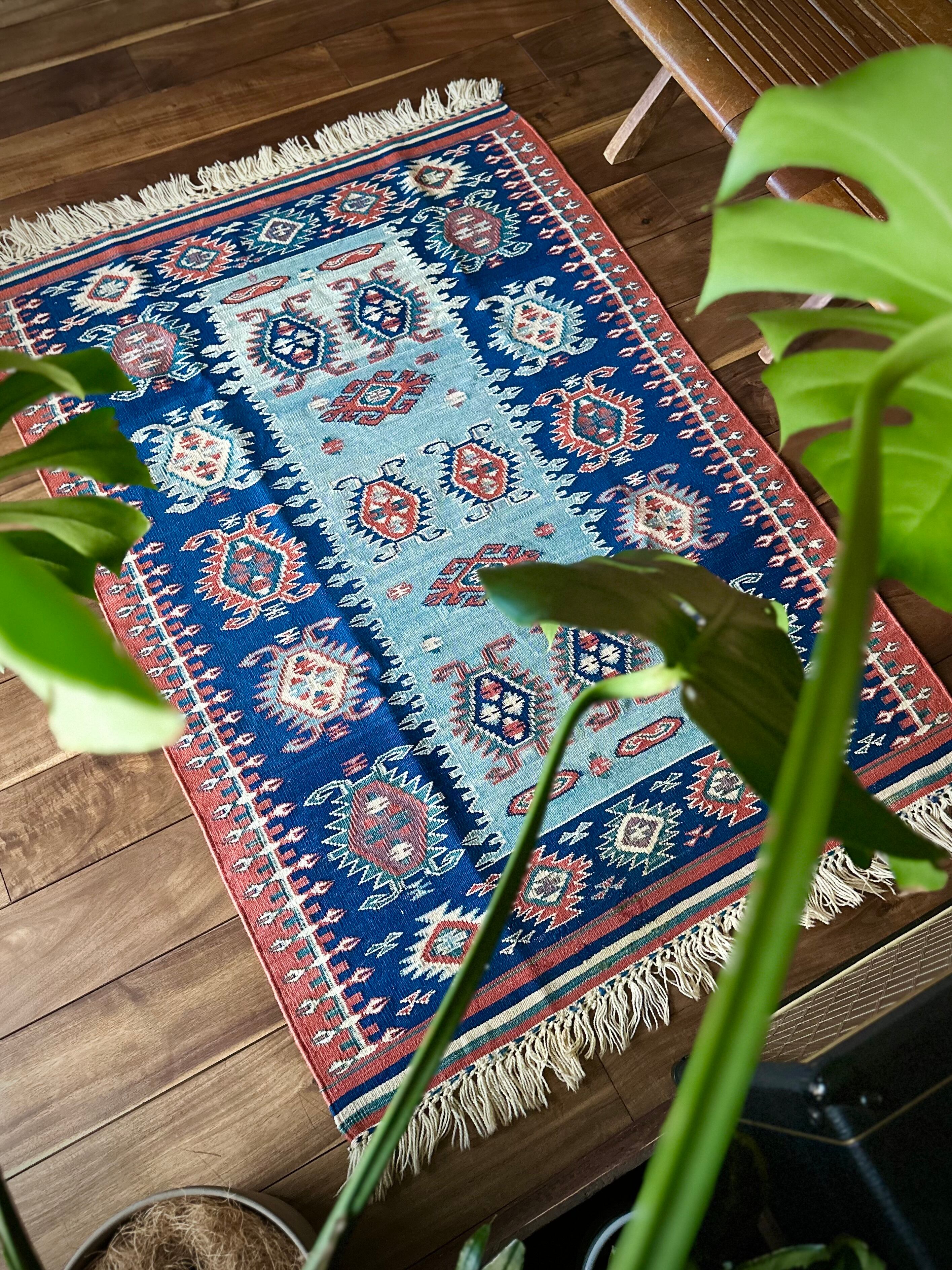 鮮やかなコバルトブルーを際立たせたるベイビーブルーの色彩がカスピ海沿岸のコーカサス地方の大自然を連想させるこちらは、イラン北西部とトルコに隣接するアゼルバイジャンで手織りされたキリムになります。