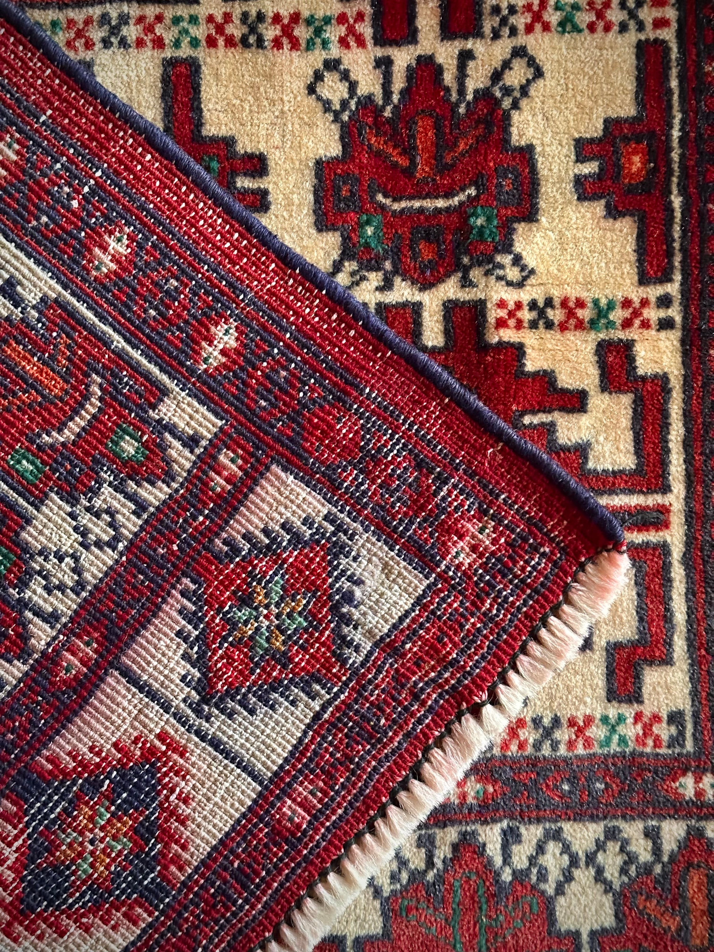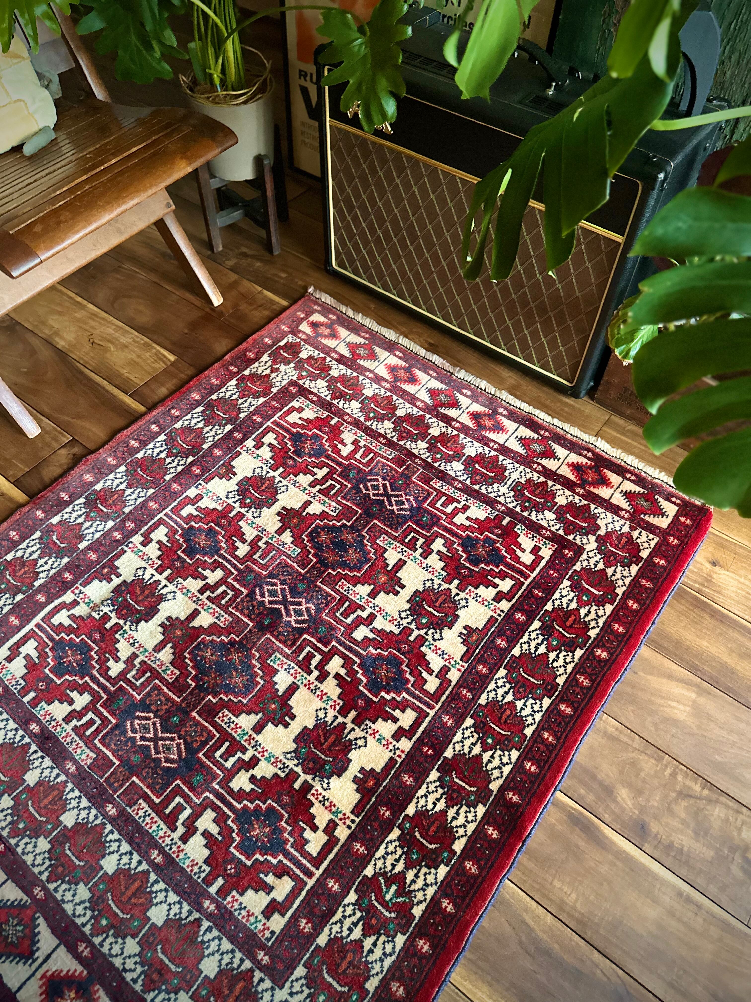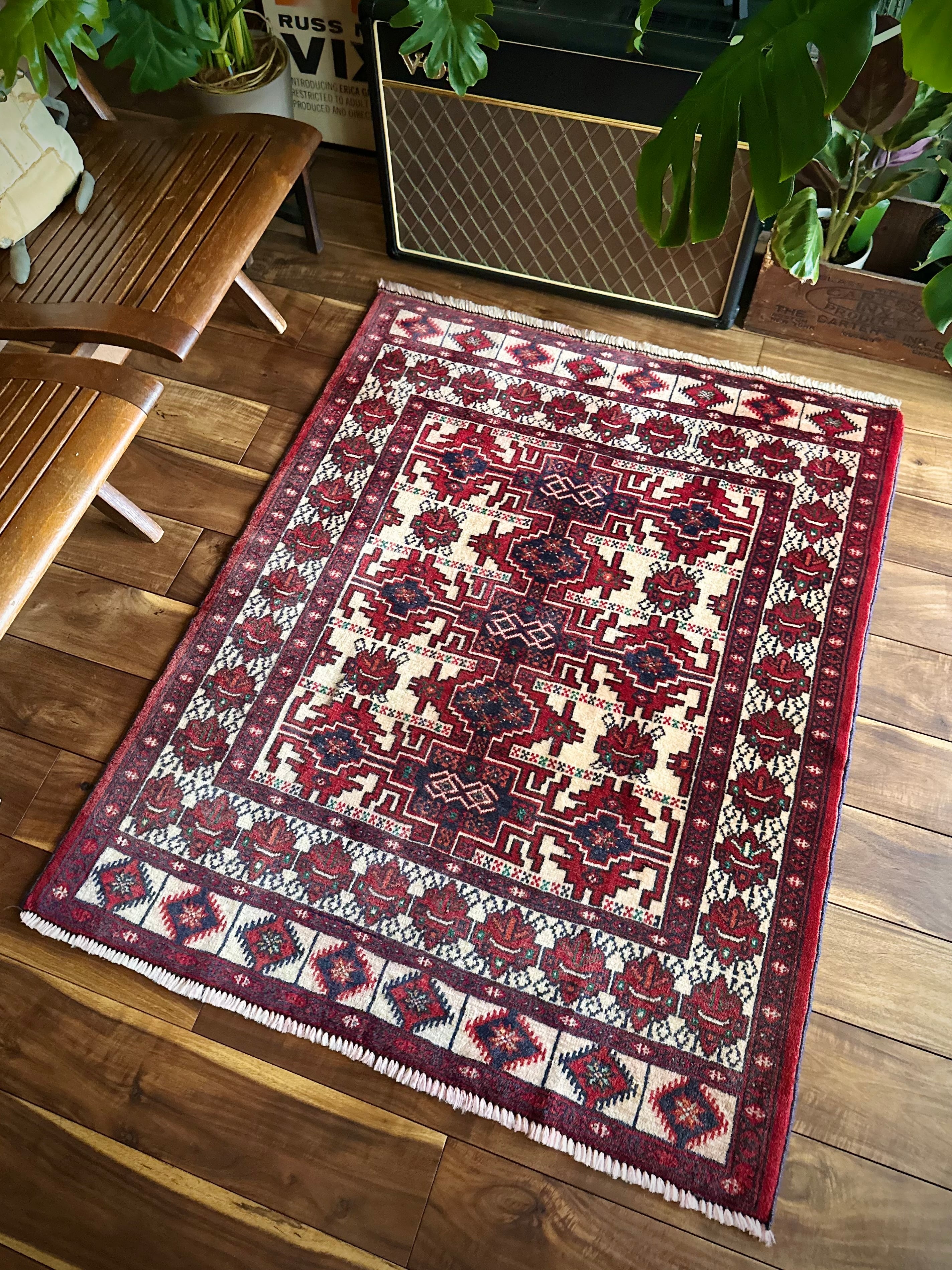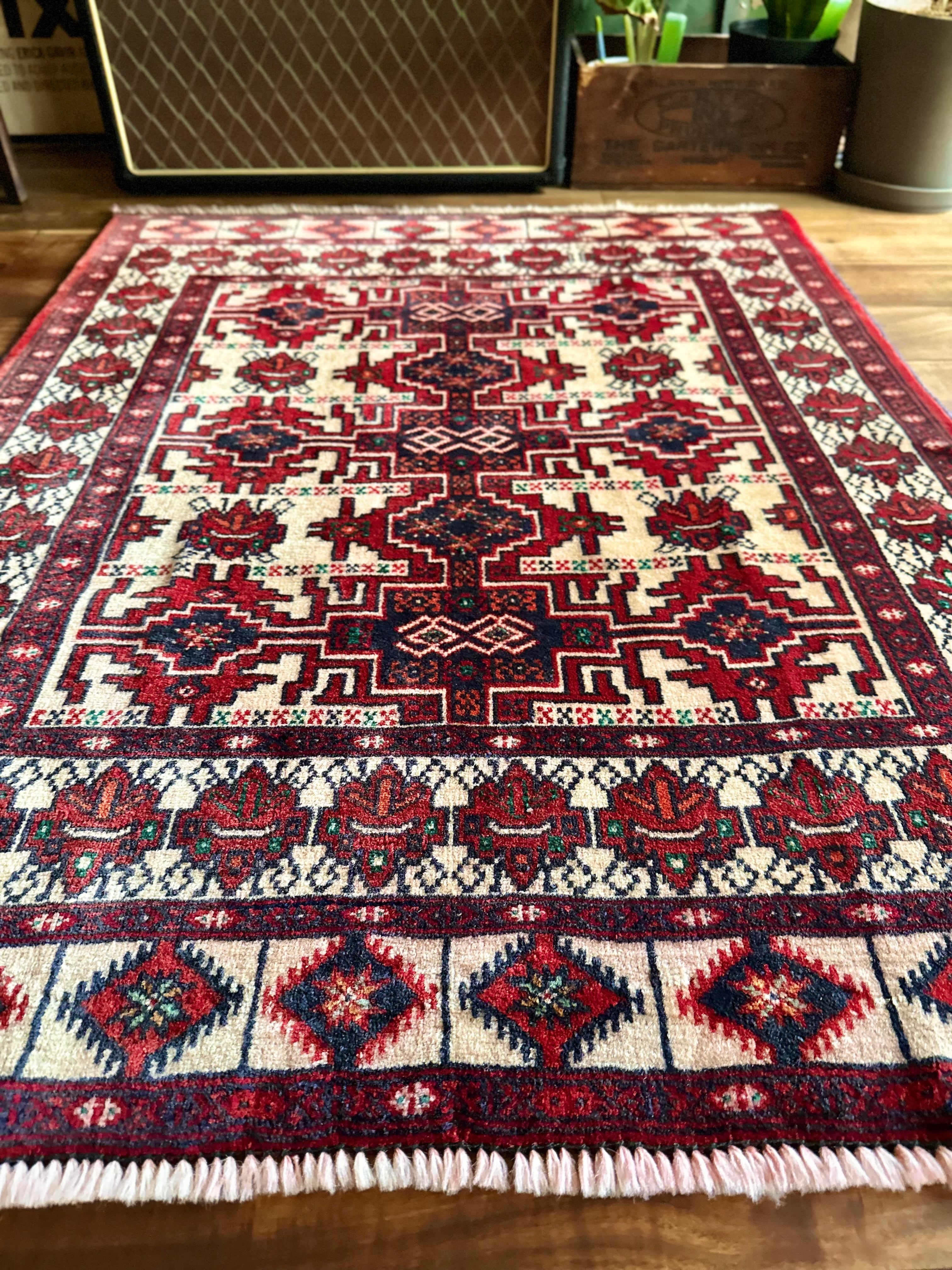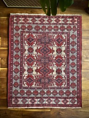 無染色のベージュをベースに風変わりなバーガンディの模様に何かしらの意味が込められたこちらは、イラン北東部に居住するトルクメン族のトライバルラグで、過去にも見た記憶がある絵柄でバランスの良い配置が好ましいです。