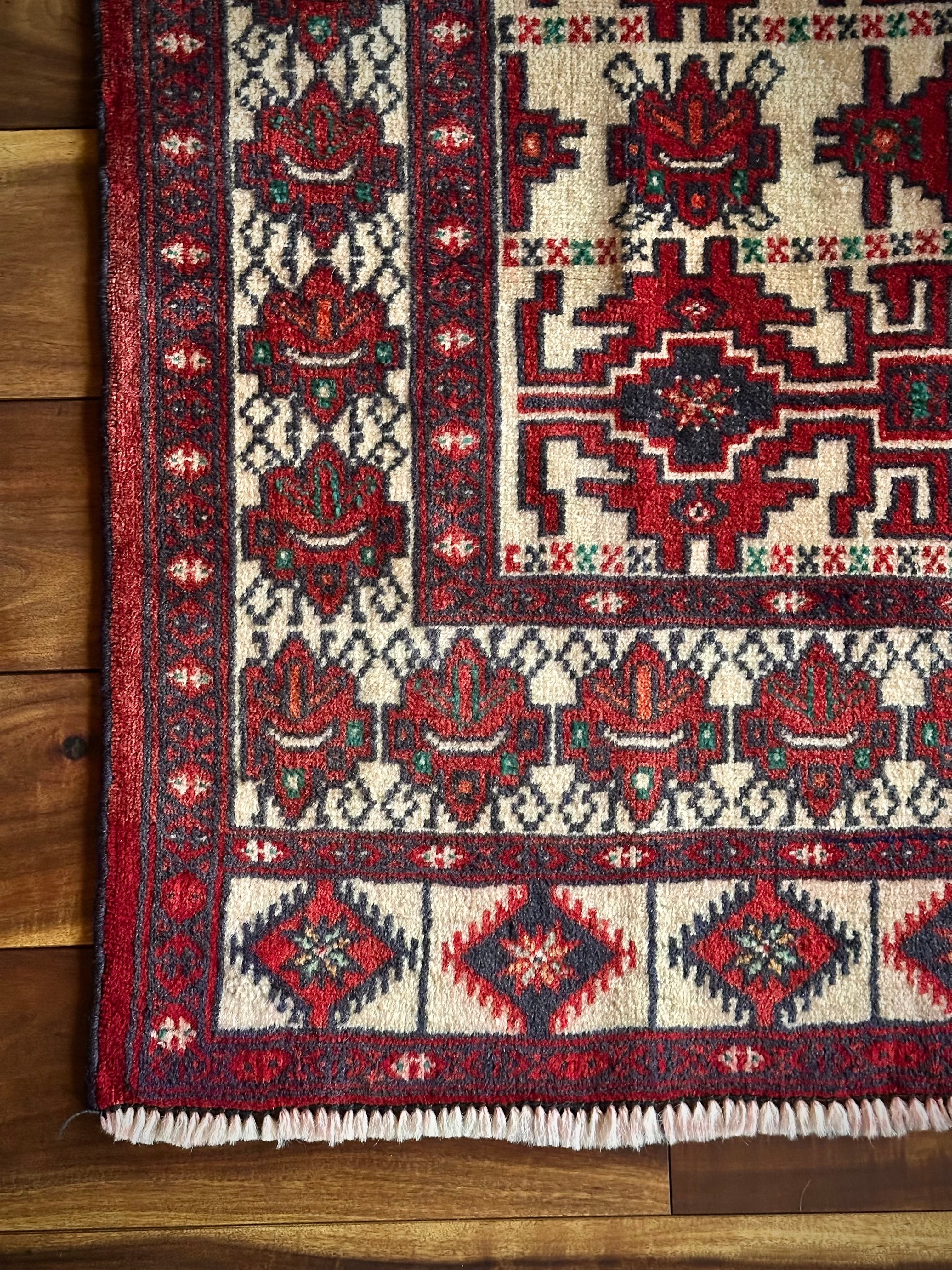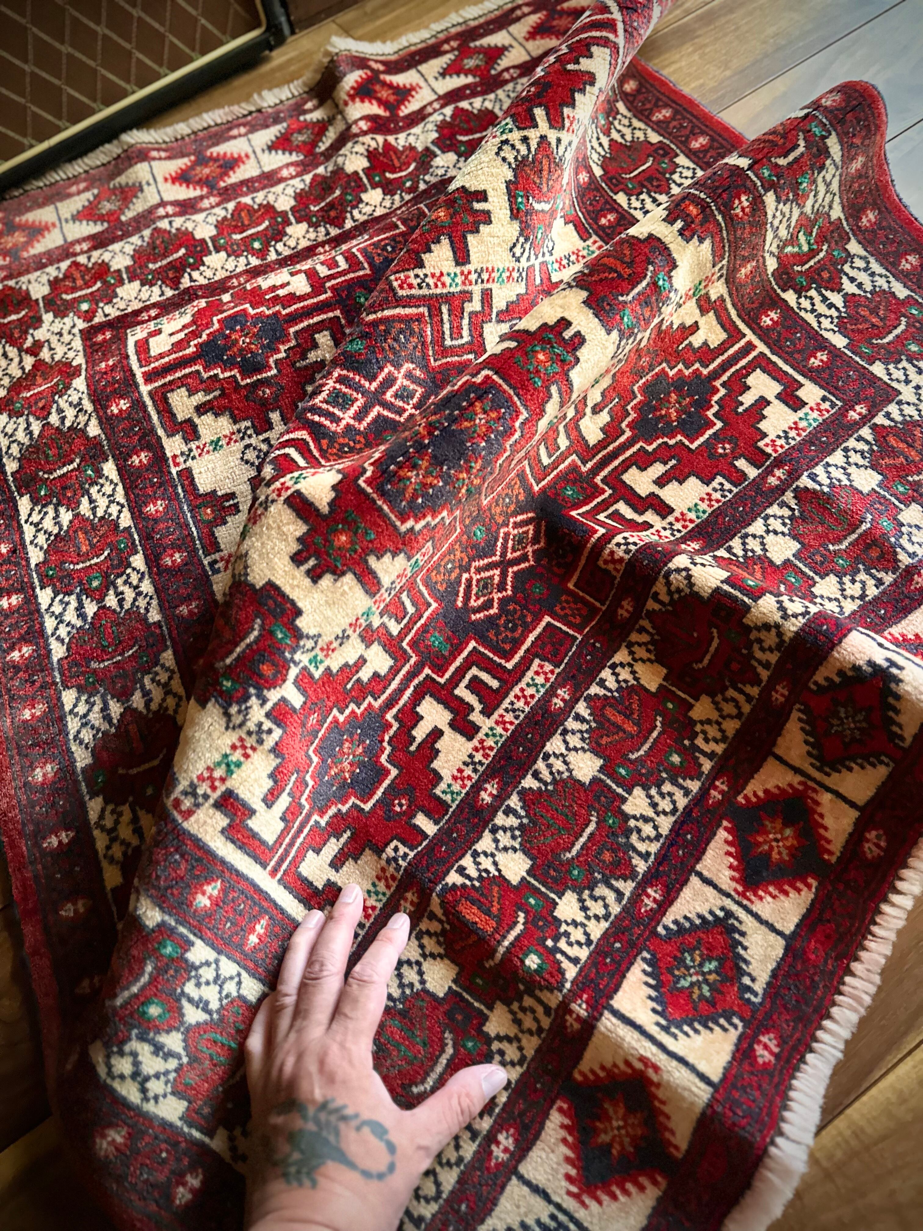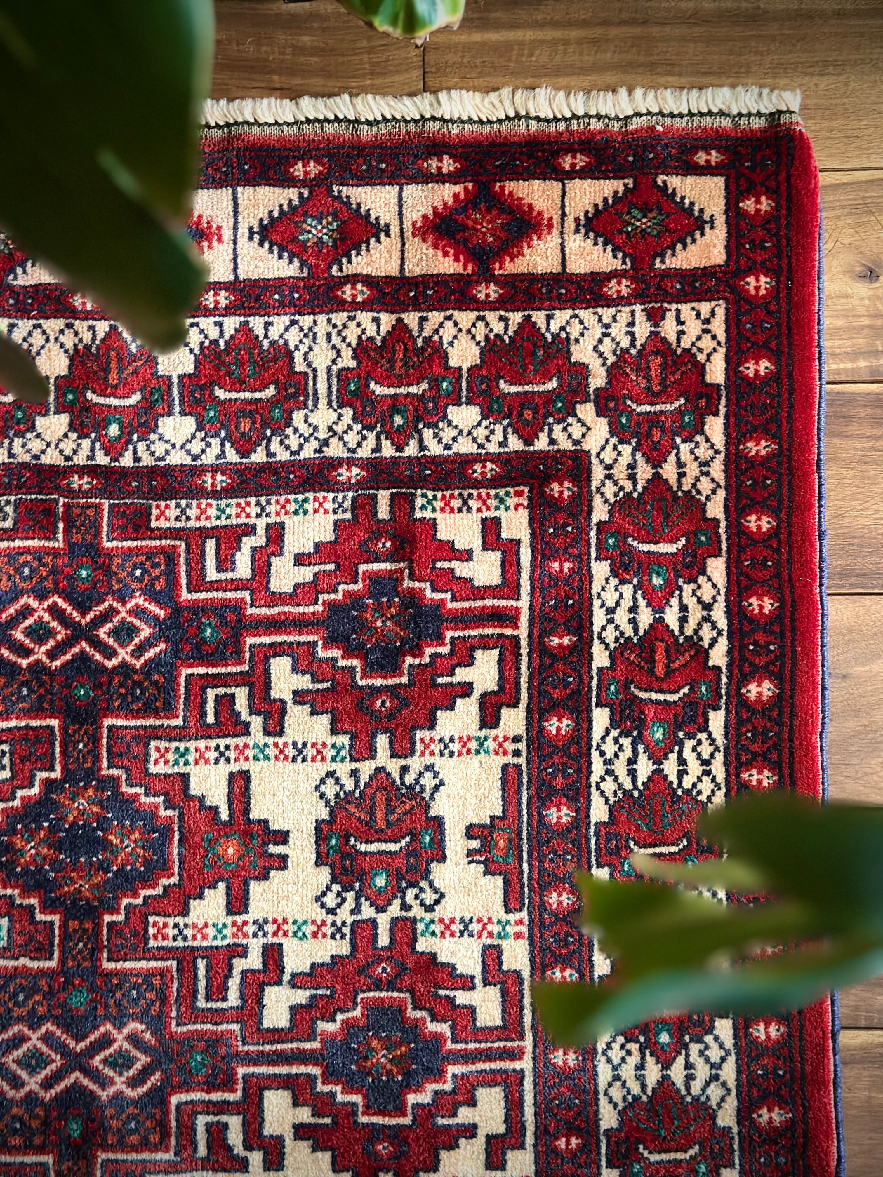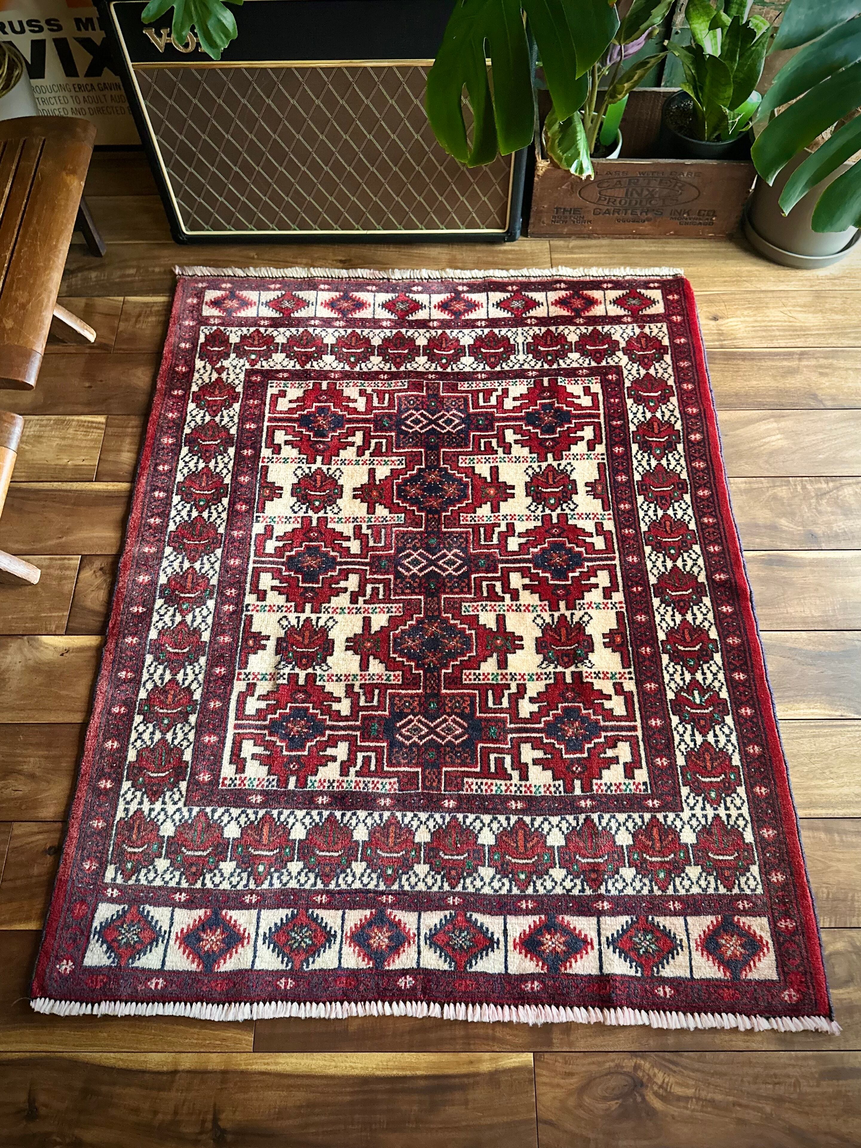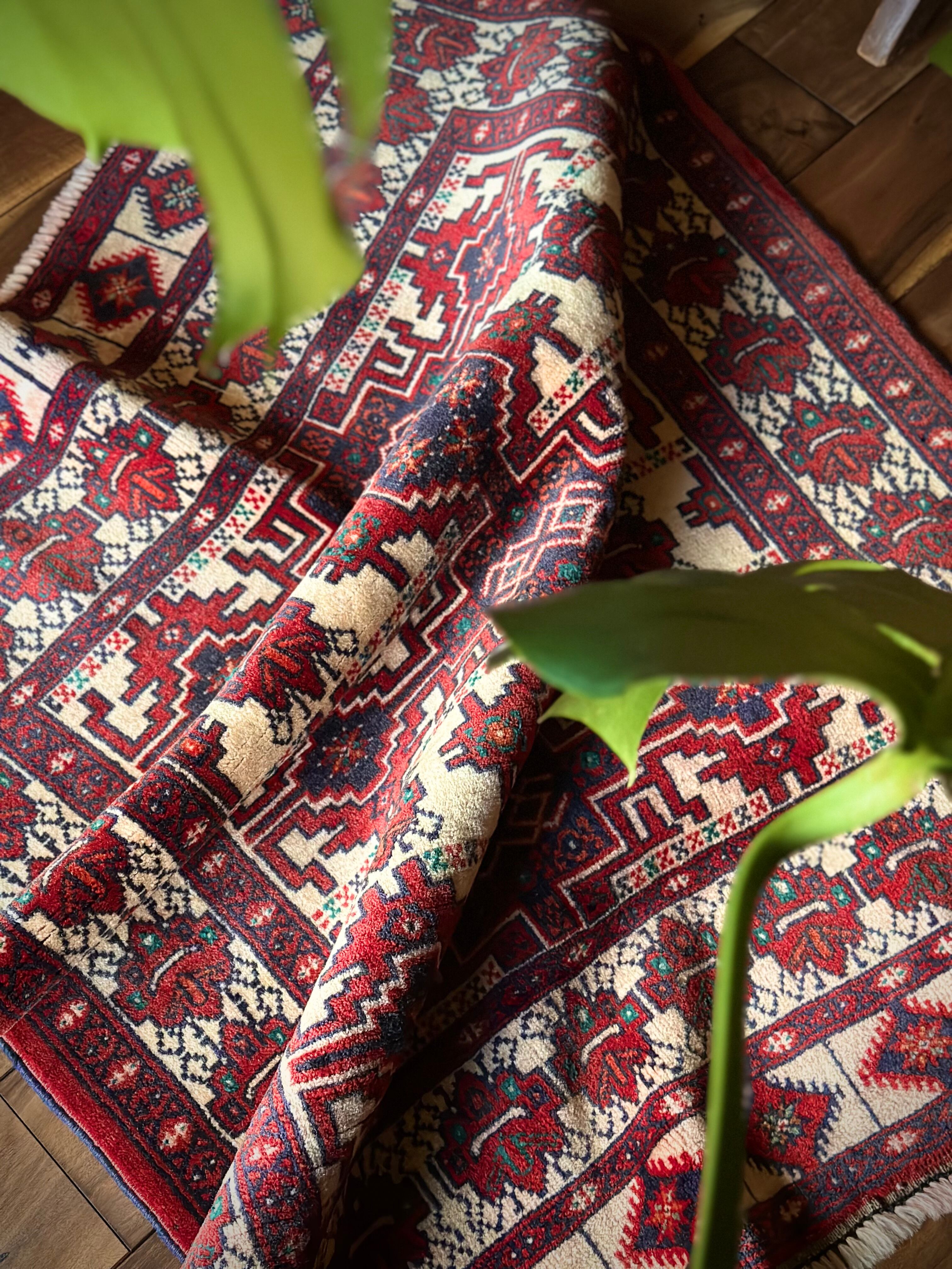 無染色のベージュをベースに風変わりなバーガンディの模様に何かしらの意味が込められたこちらは、イラン北東部に居住するトルクメン族のトライバルラグで、過去にも見た記憶がある絵柄でバランスの良い配置が好ましいです。