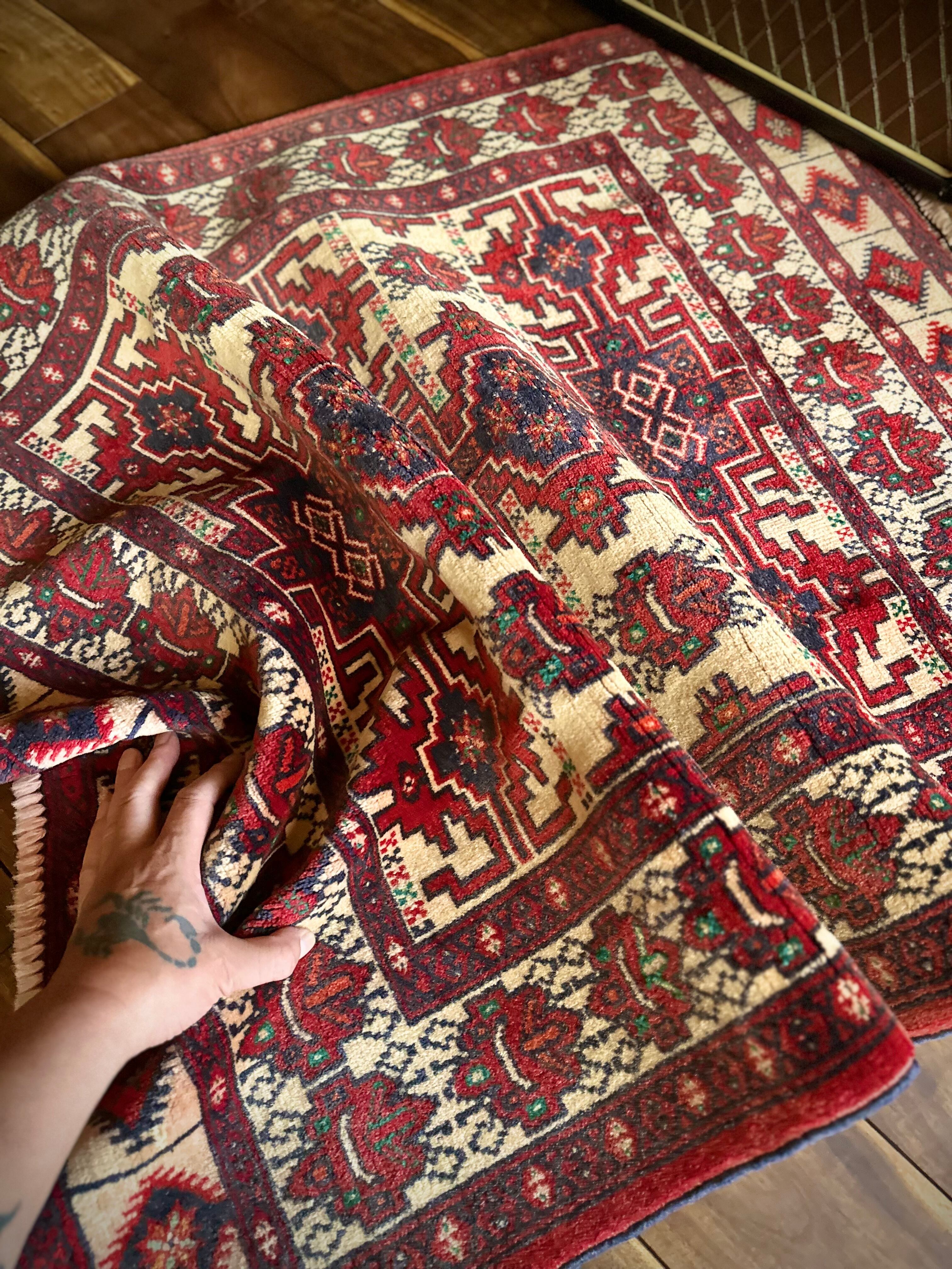 最後にラグそのものに関しては羊毛特有の匂いがあり、採寸は中央付近で計測していますが、手織りならではの歪みによる誤差や水洗いクリーニングによる縮み、また草木染めによる経年劣化の色ムラなどがありますが、それもまたヴィンテージラグの魅力かとご理解ください。