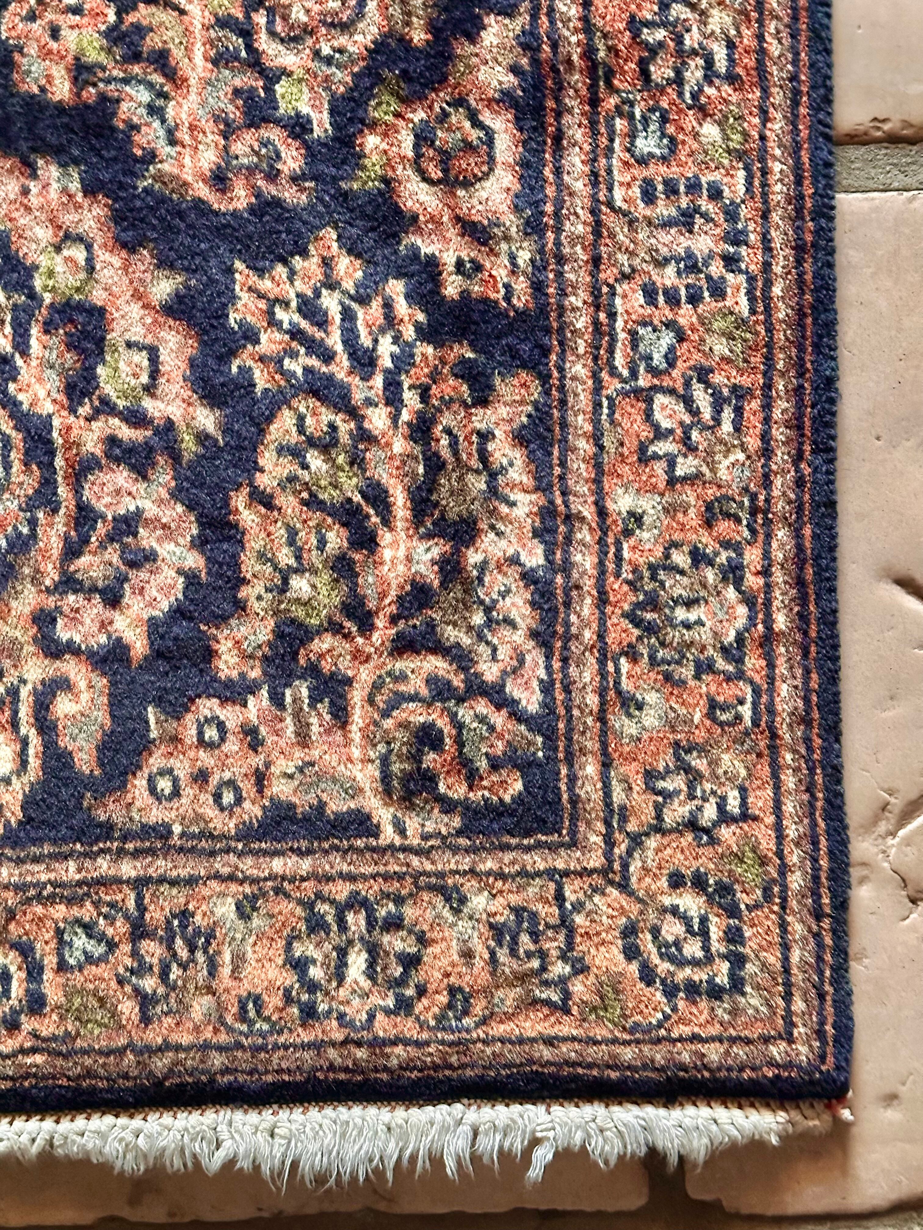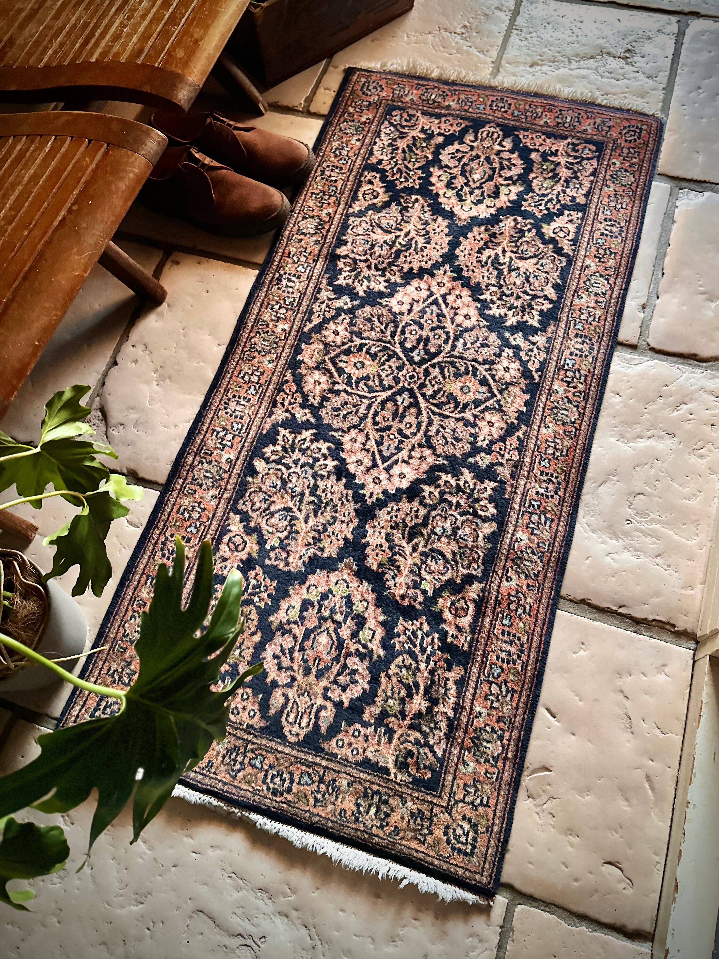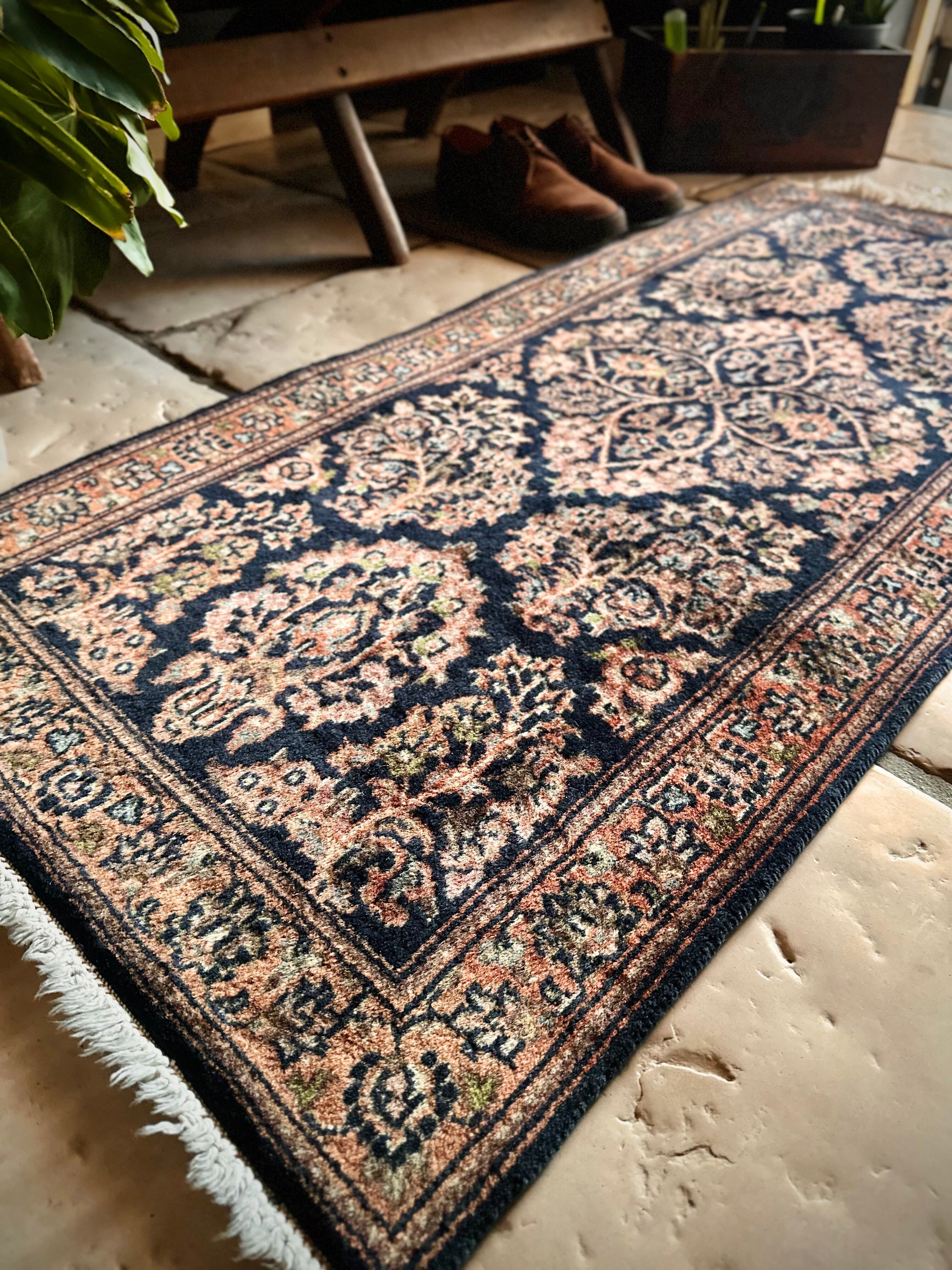 ネイビーのベースにサーモンピンクのパルメット紋様がシックな印象を与えるこちらは、イラン西部のハマダン近郊アラーク周辺の村で手織りされたヴィレッジラグで、ペルシャ絨毯の代表的な一種でもあるサルークと呼ばれる1枚になります。