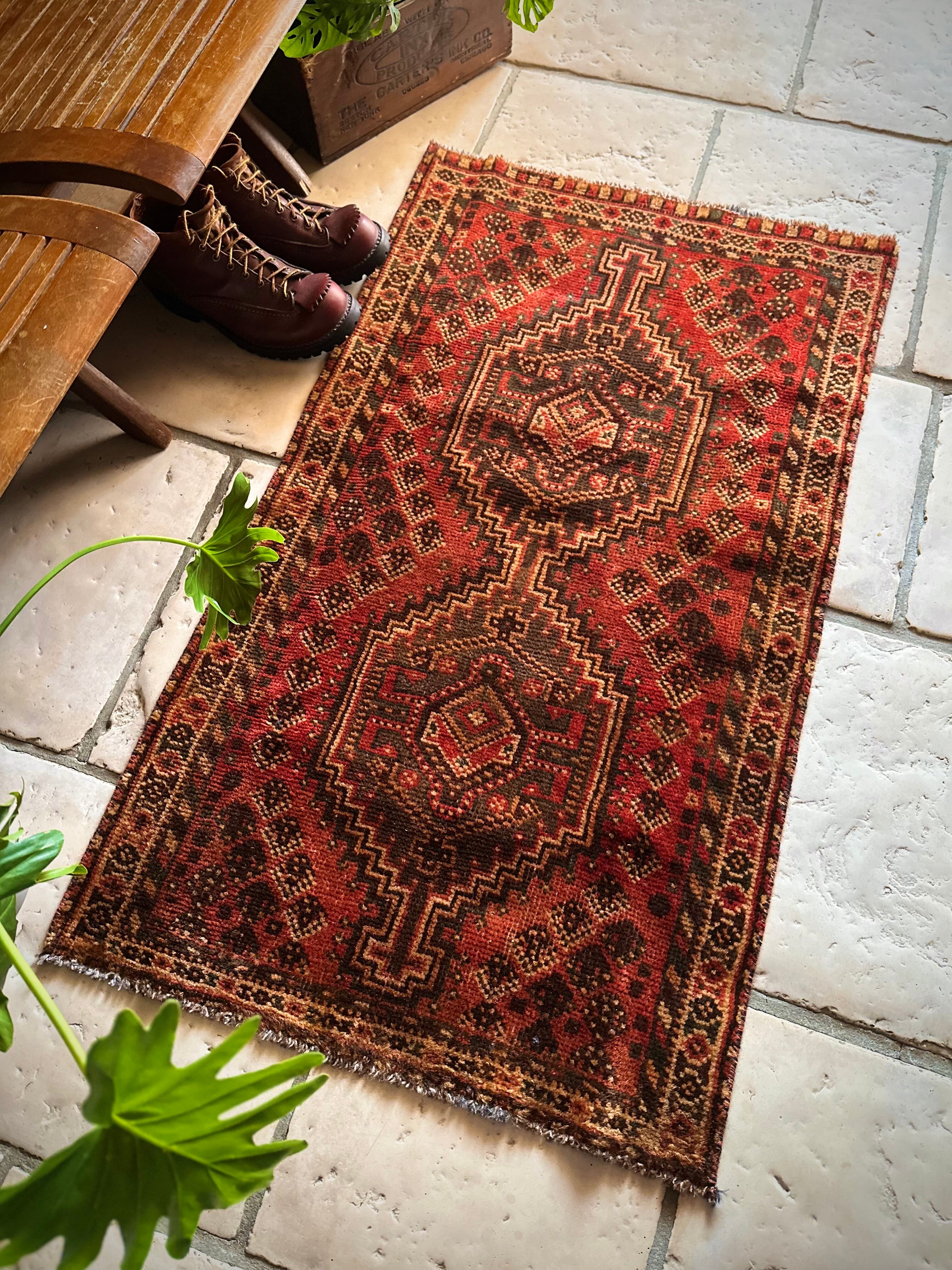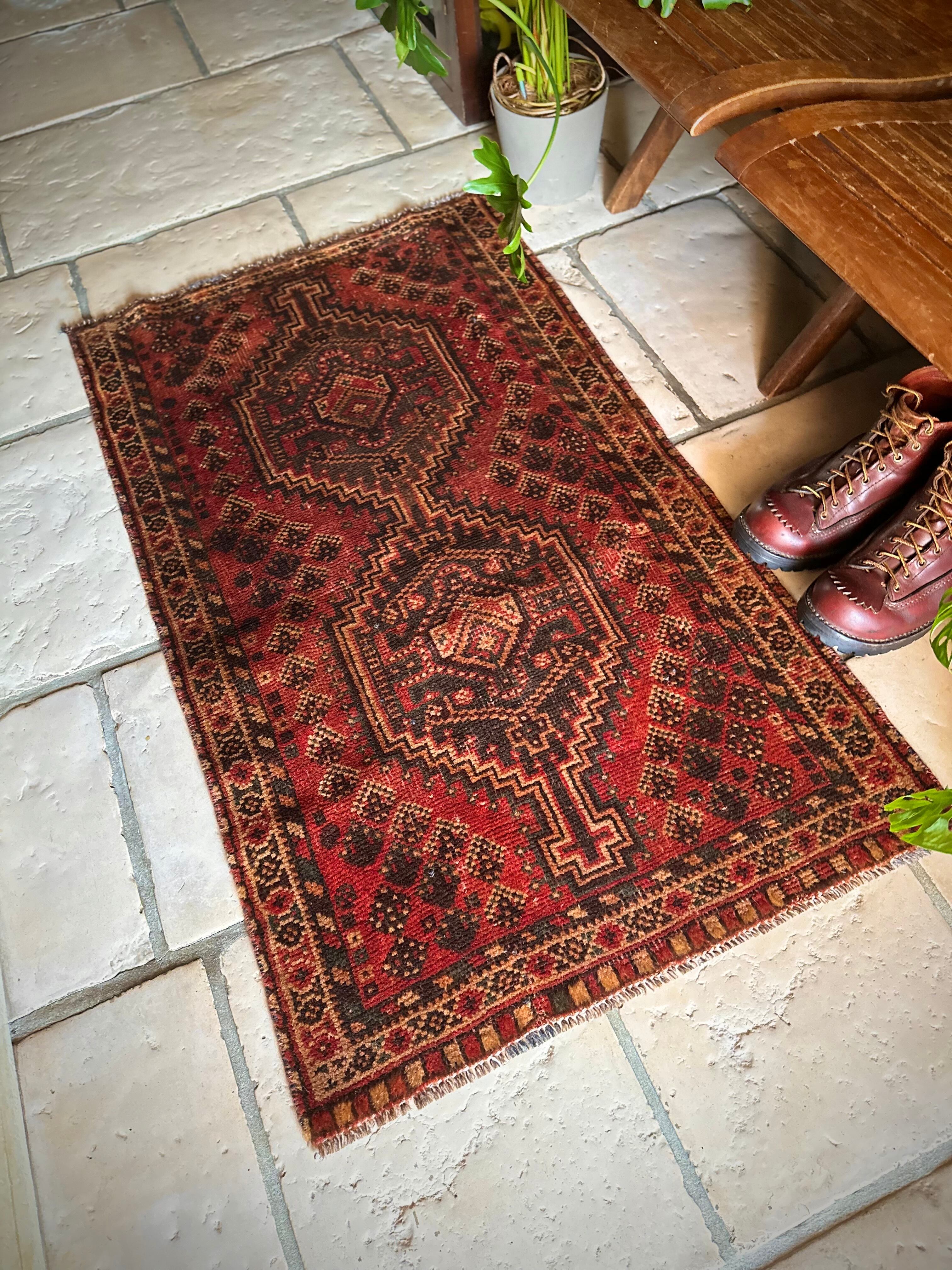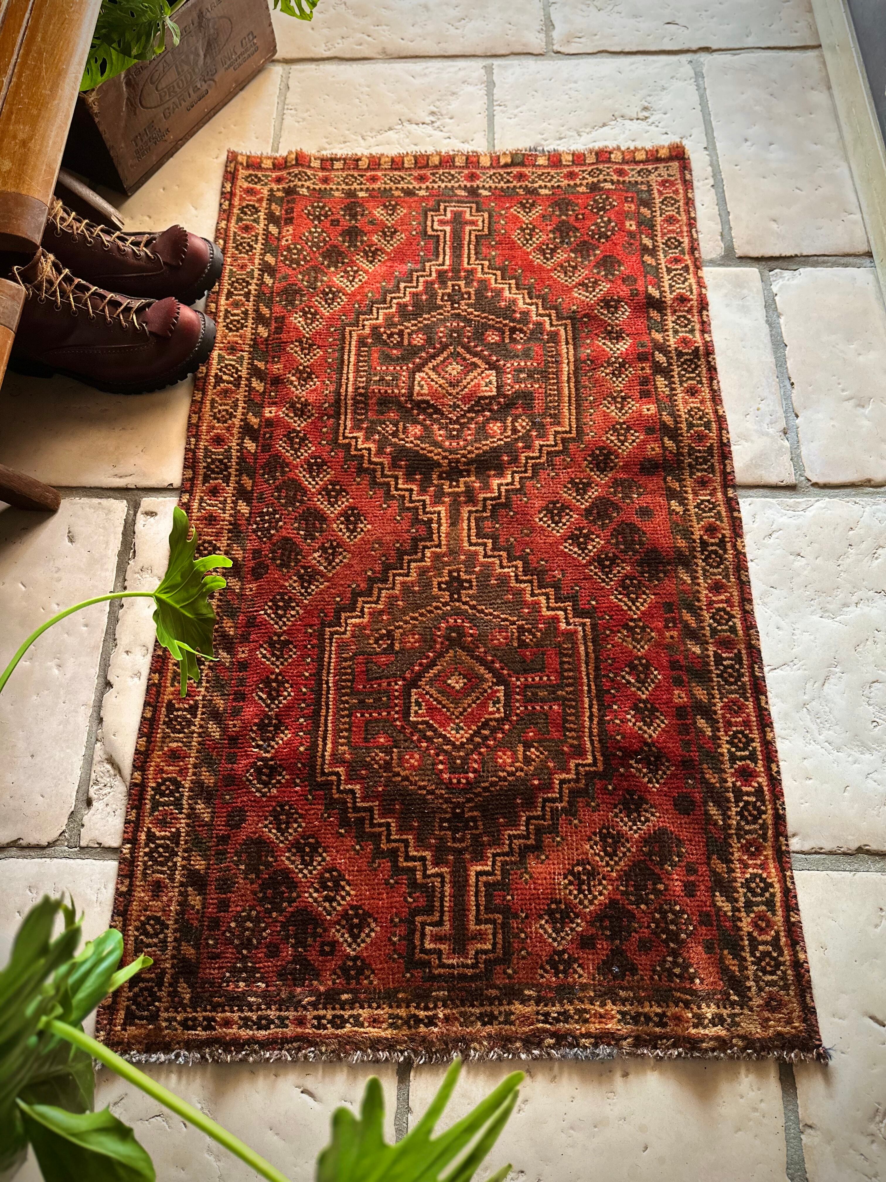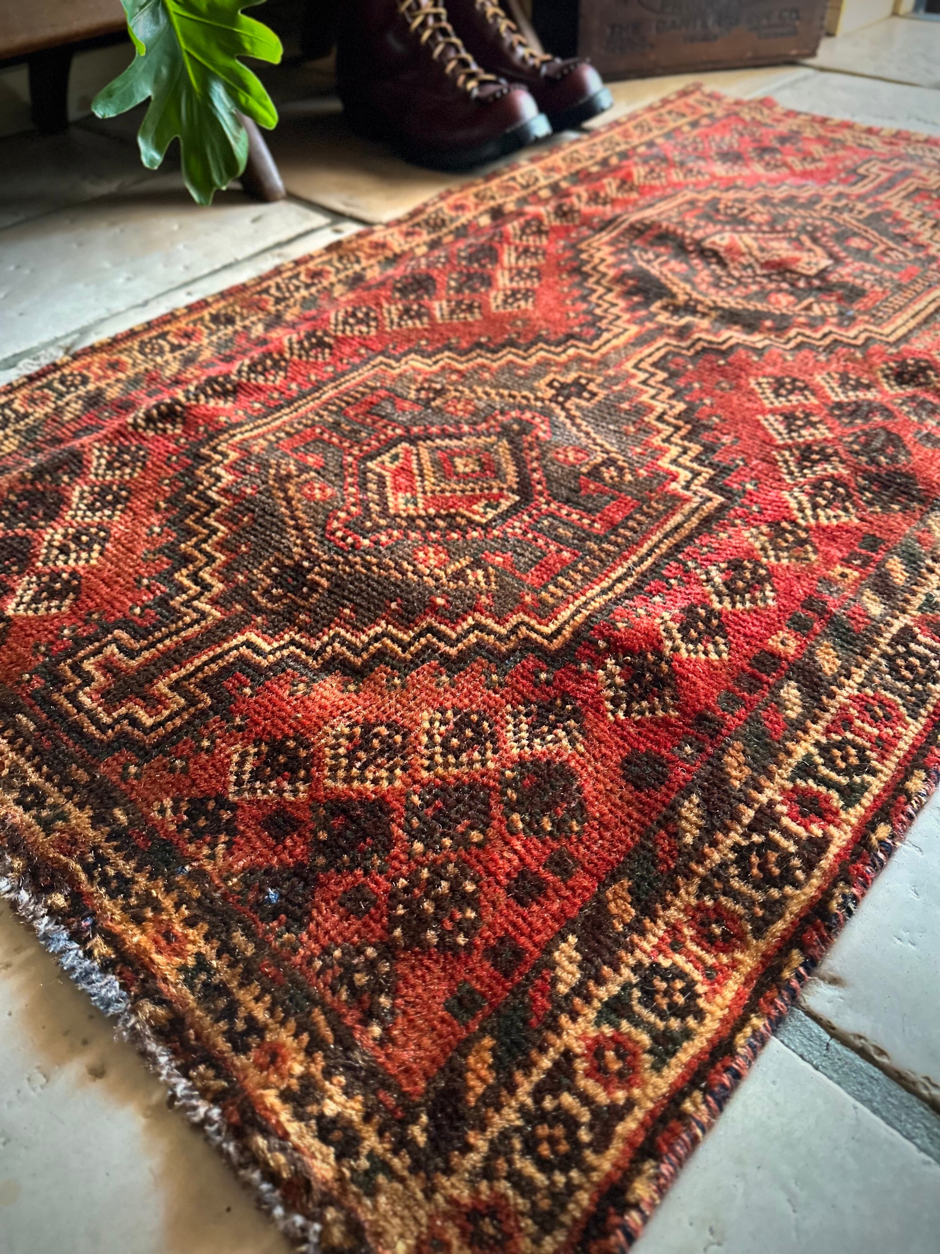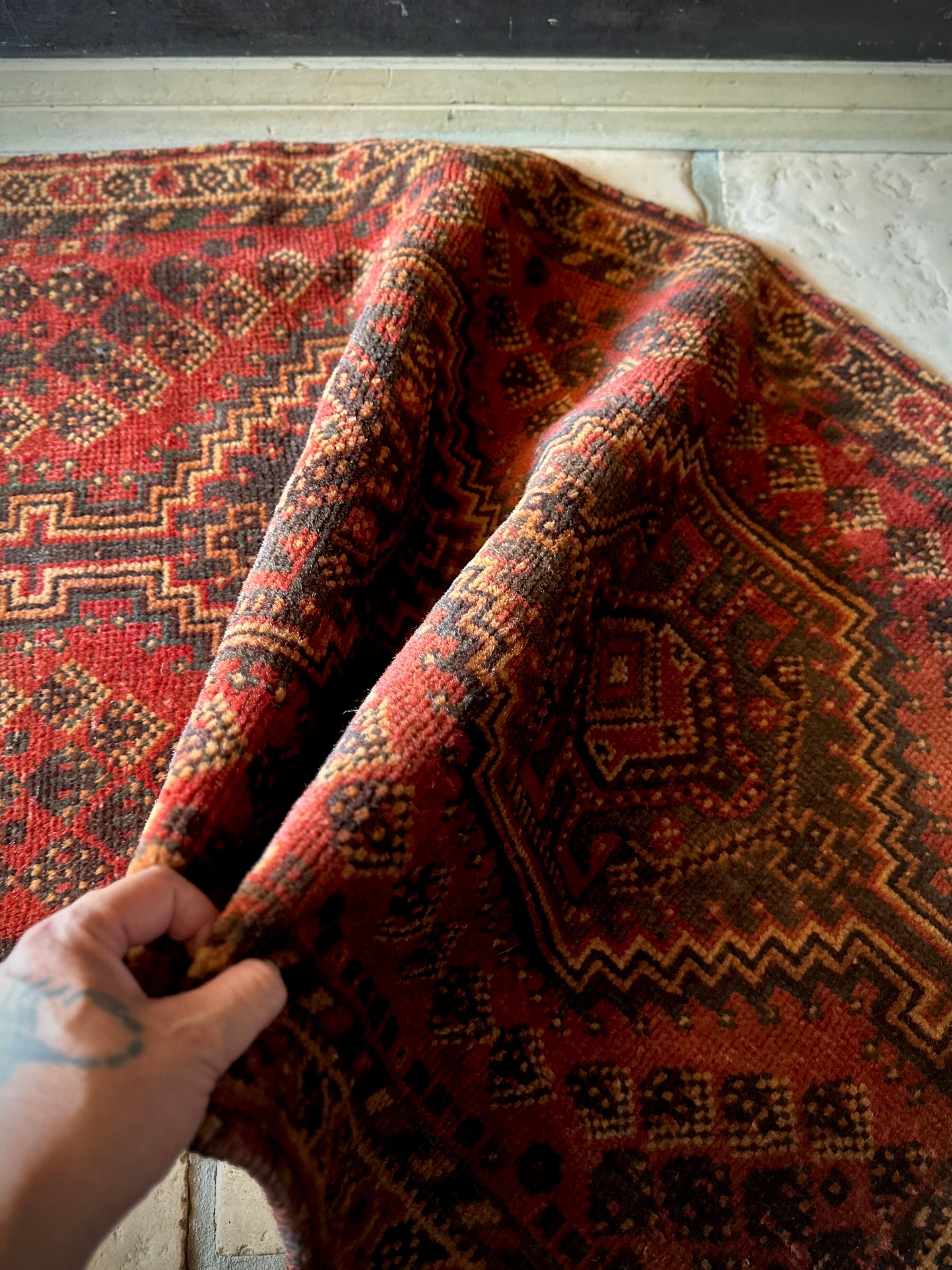 全体的に落ち着いたテラコッタカラーを基調としながら優しげな2連メダリオンが柔らかな印象を与えるこちらは、イラン南部のシラーズ周辺に居住するカシュガイ族のトライバルラグで、経年劣化によるツヤ感のある1枚になります。