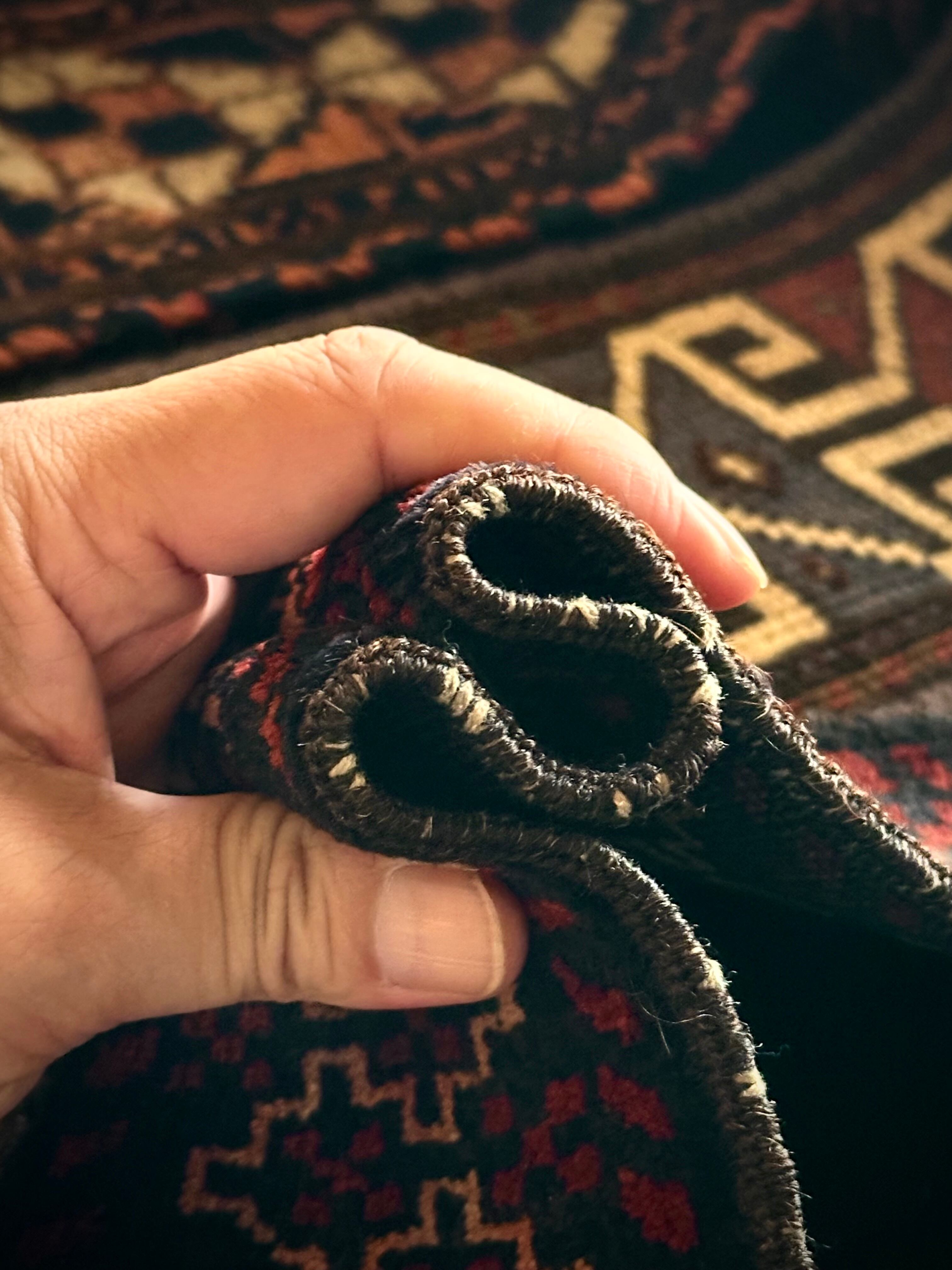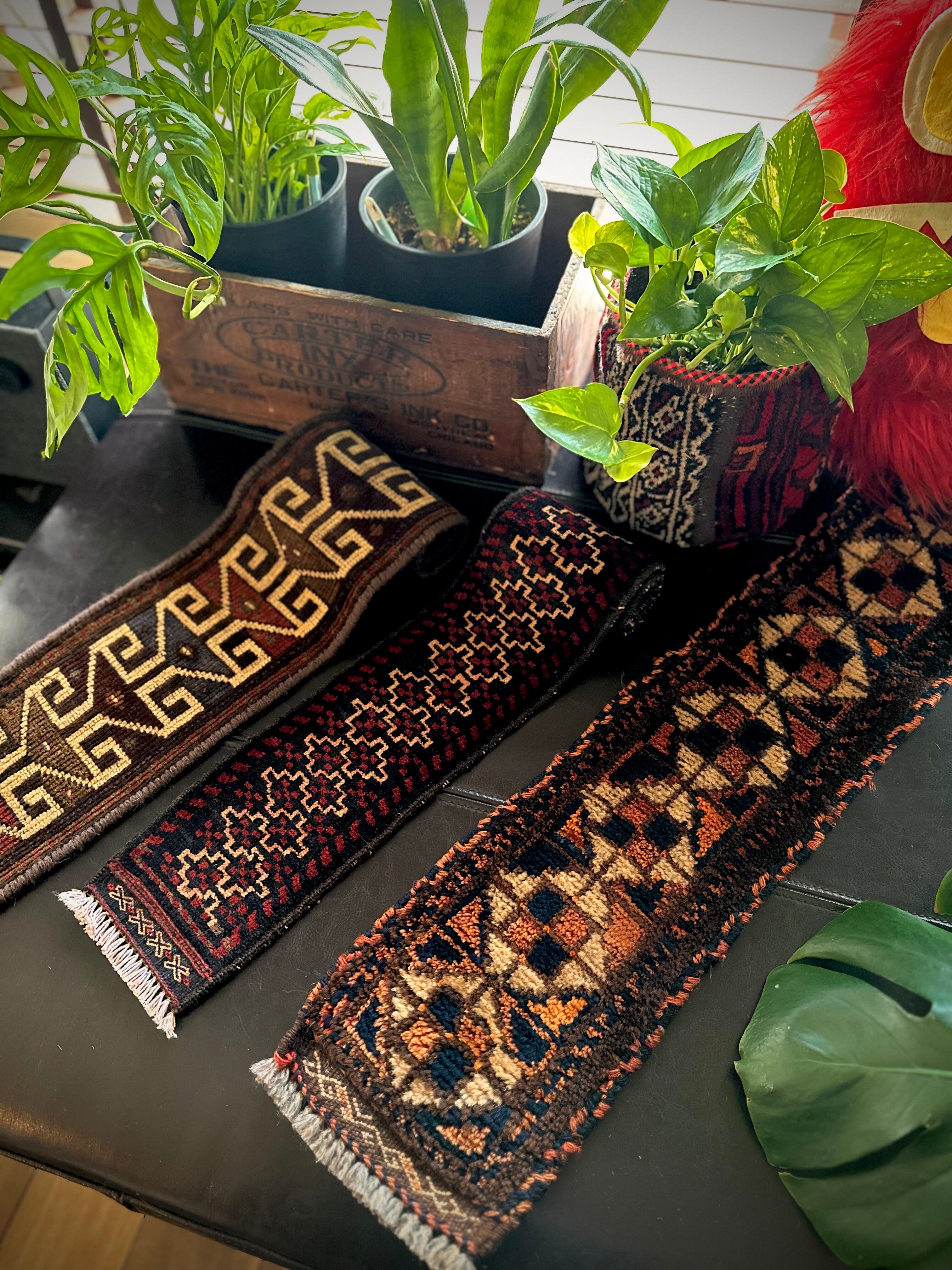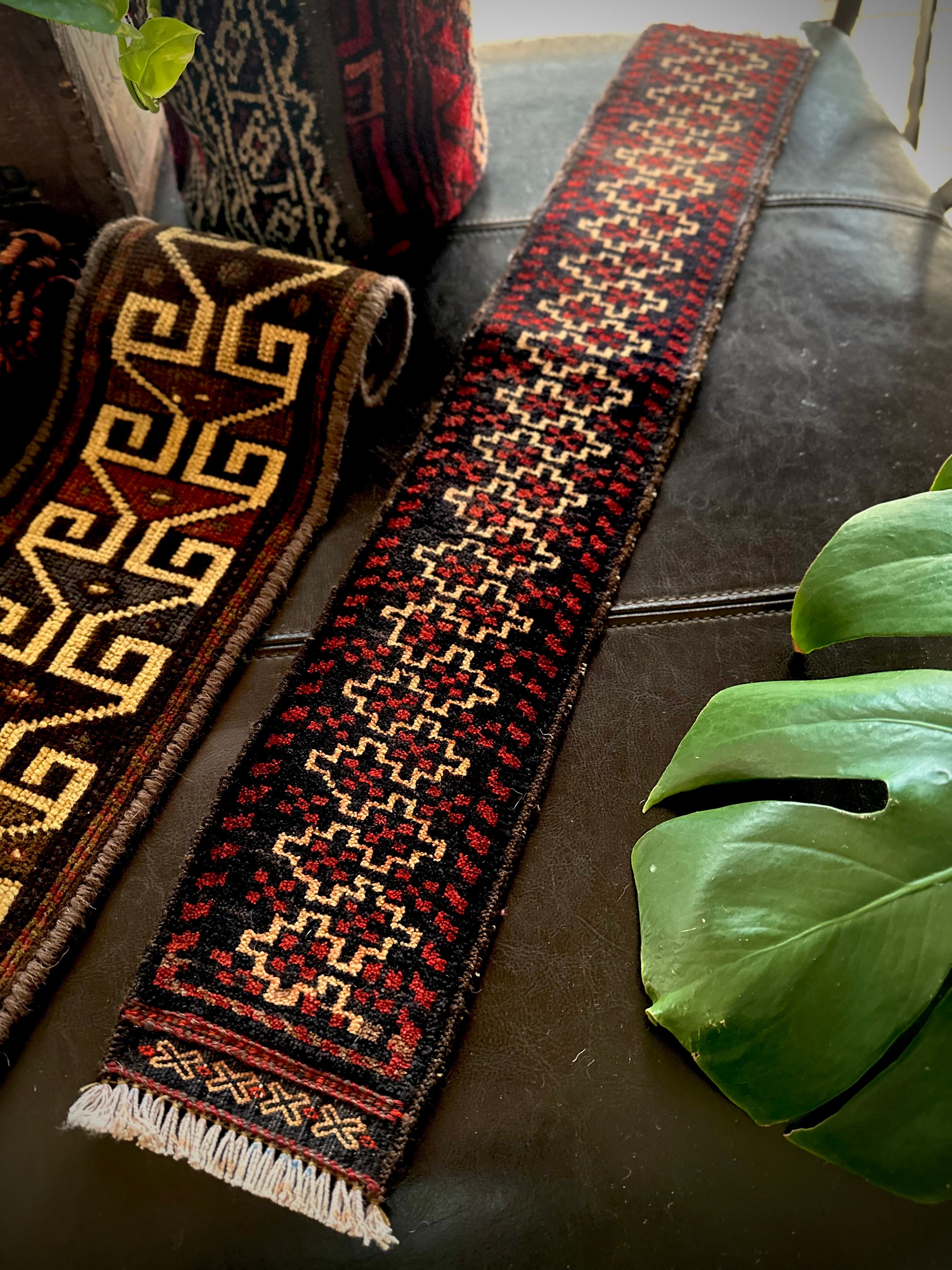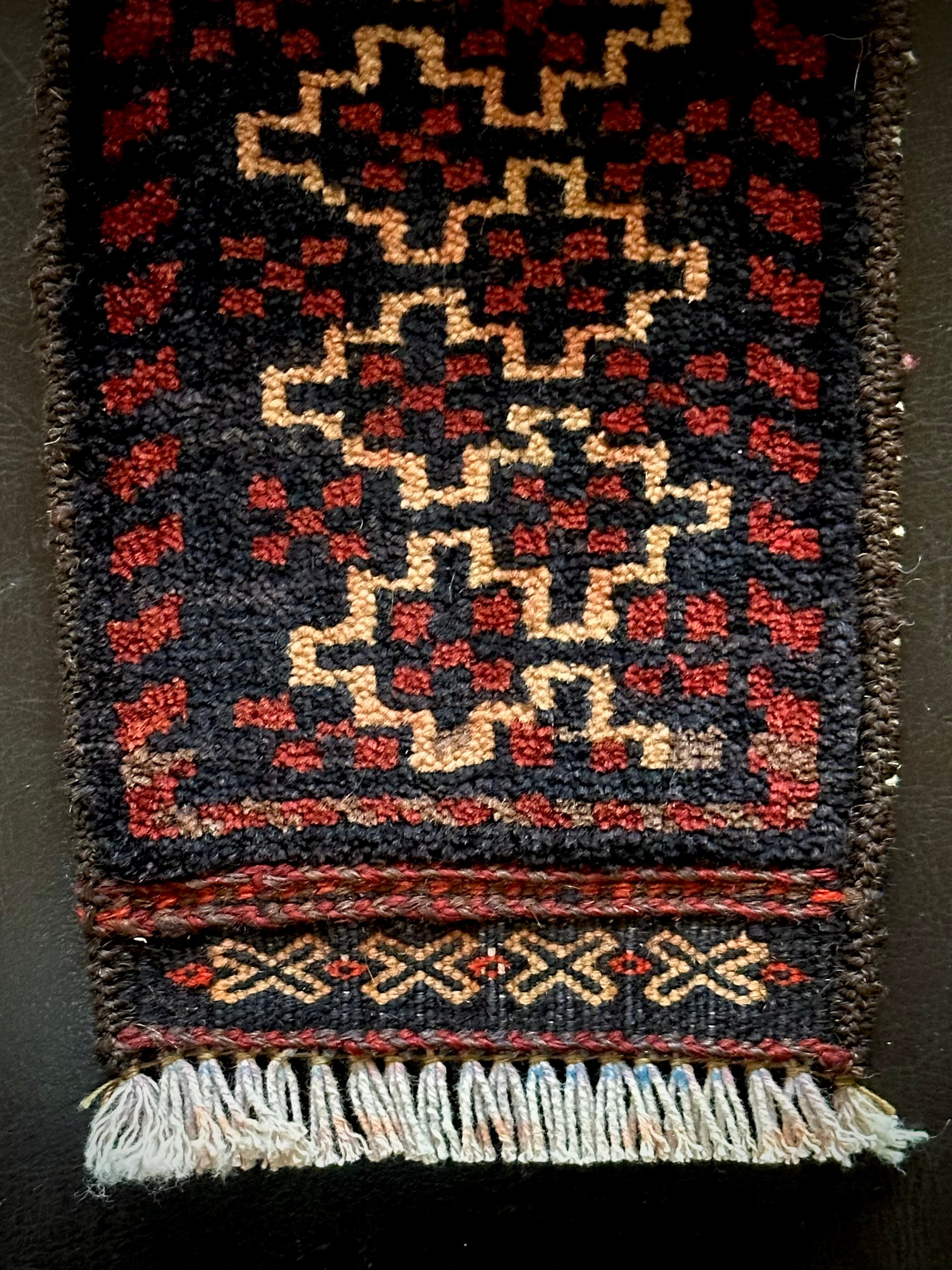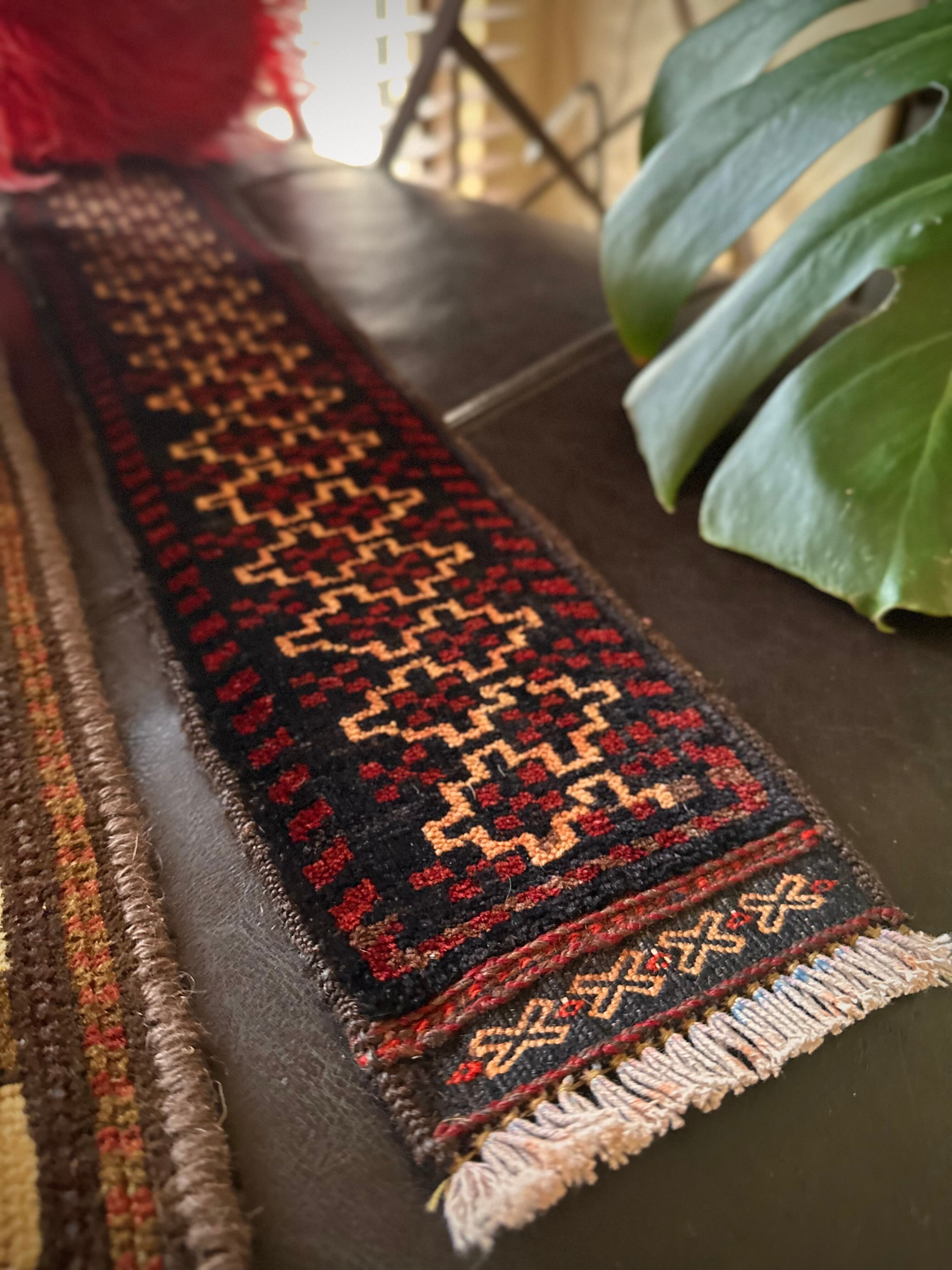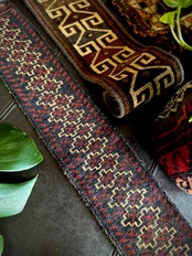 こちらの商品はアフガニスタンのヘラート州に居住するバルーチ族によって、ひとつひとつ手織りされたアニマル・トラッピングスと呼ばれる動物用の首飾りで、元はタッセルやビーズなどが付いていたのを取り除いてミニラグに仕立て直したモノになります。